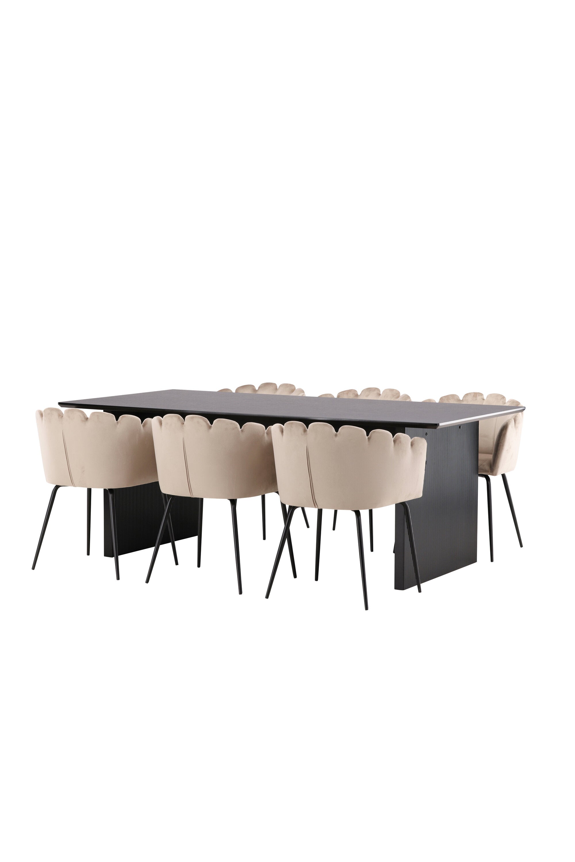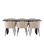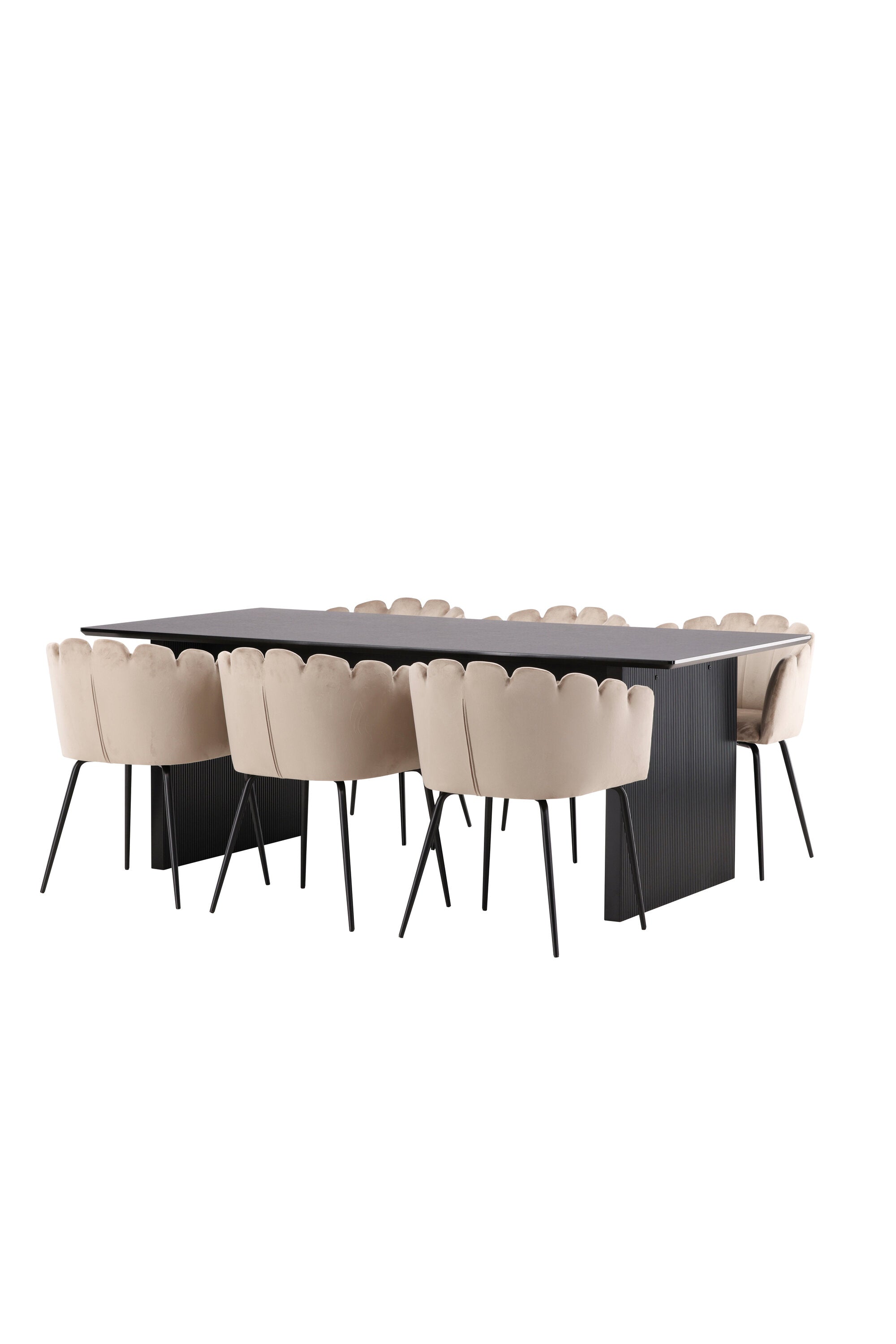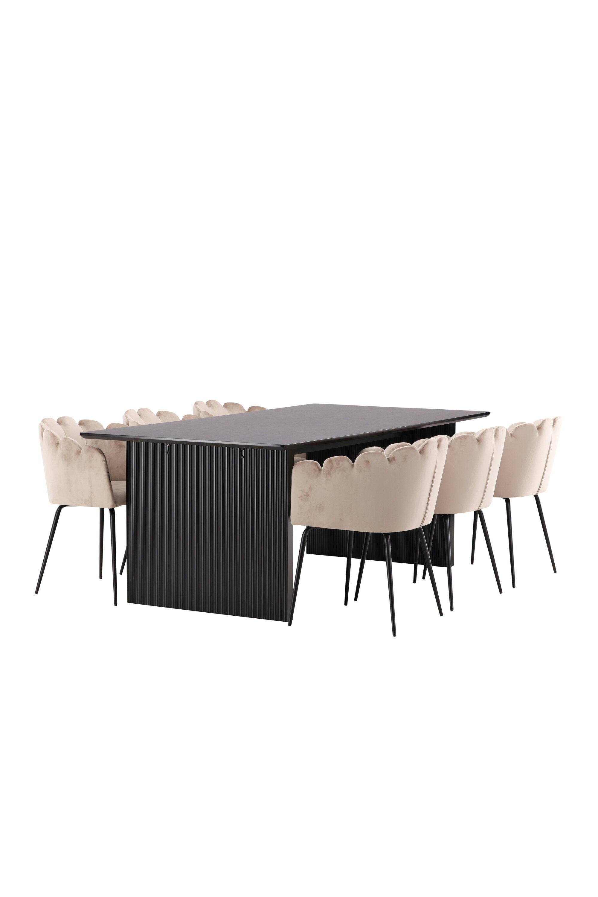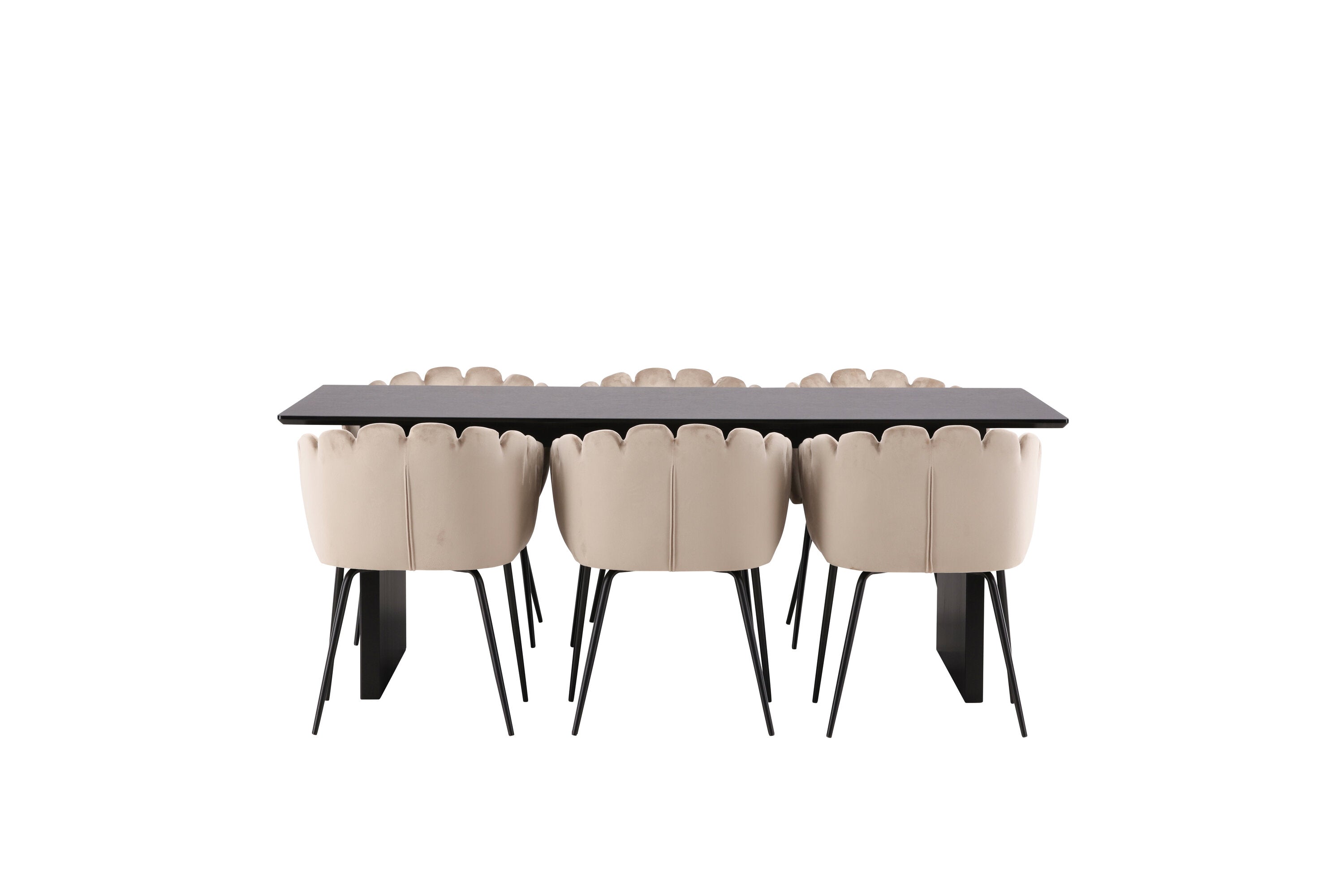 Zařiďte srdce svého domova půvabně a lákavě! Náš obdélníkový jídelní stůl ze série Vail má rovné severské tvary a je vyroben z odolné MDF v ušpiněné černé barvě. Deska stolu je tenká a balancuje na dvou pevných dřevěných deskách, které tvoří podvozek – stejně úhledné a odolné. Zde společně s jídelními židlemi ze série Limhamn v luxusní béžové barvě. Židle je moderním favoritem mnoha domácností se svým lákavým designem, ozdobným opěradlem ve tvaru mušle s ozdobným prošíváním a kulatým sedákem z vkusné béžové sametové látky. Nohy jsou z kovu s černou práškovou barvou. Pohodlně se usaďte a užívejte si!