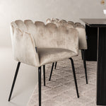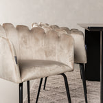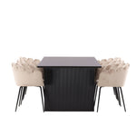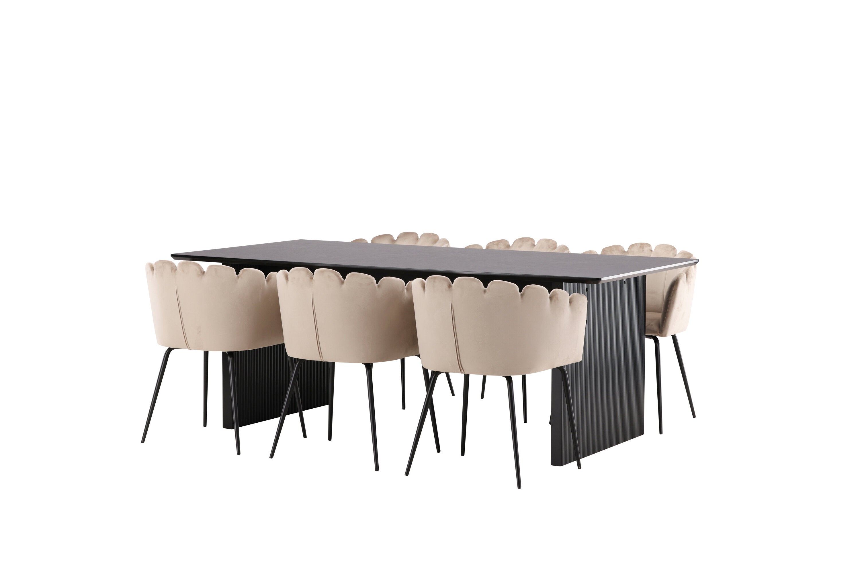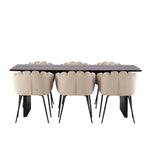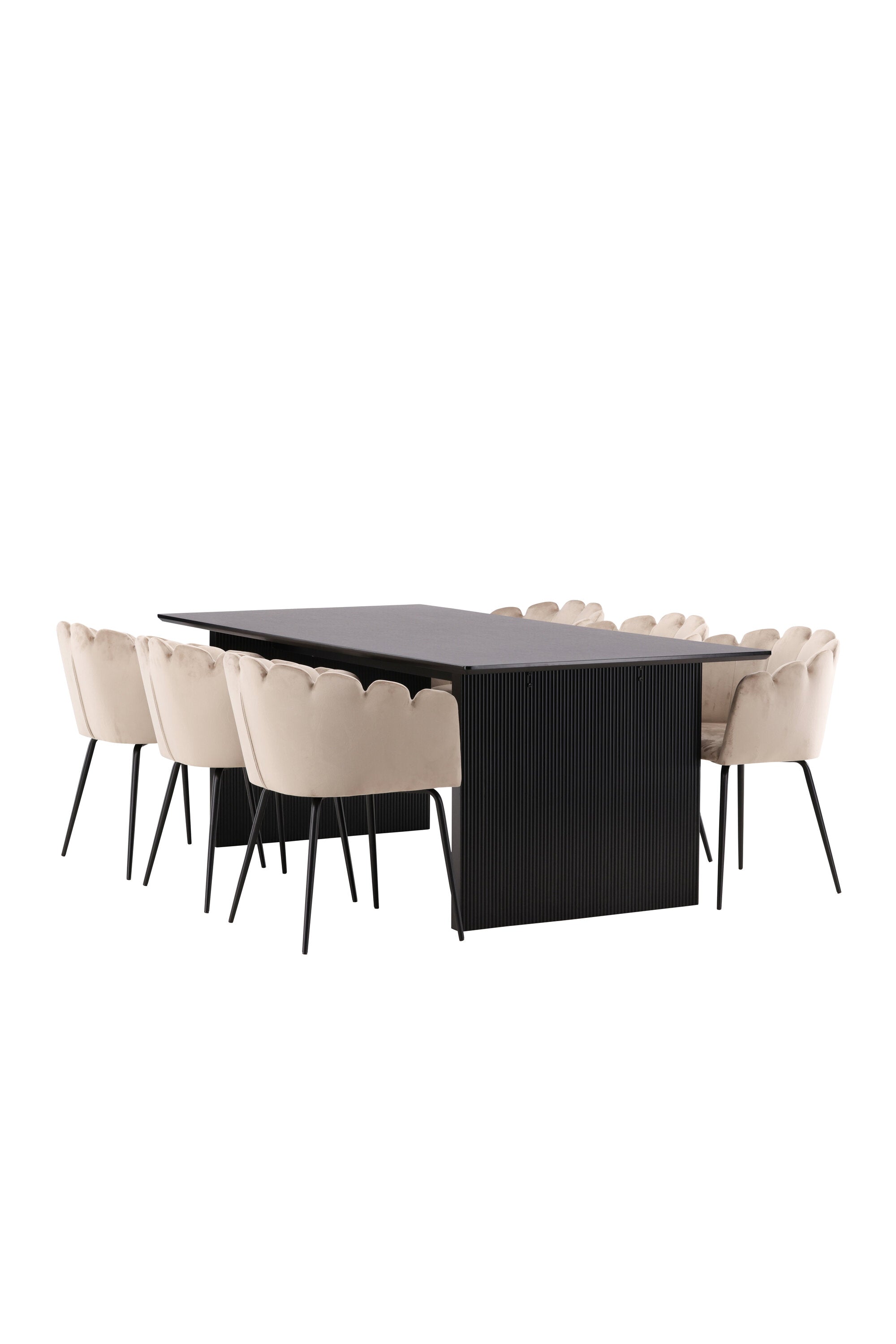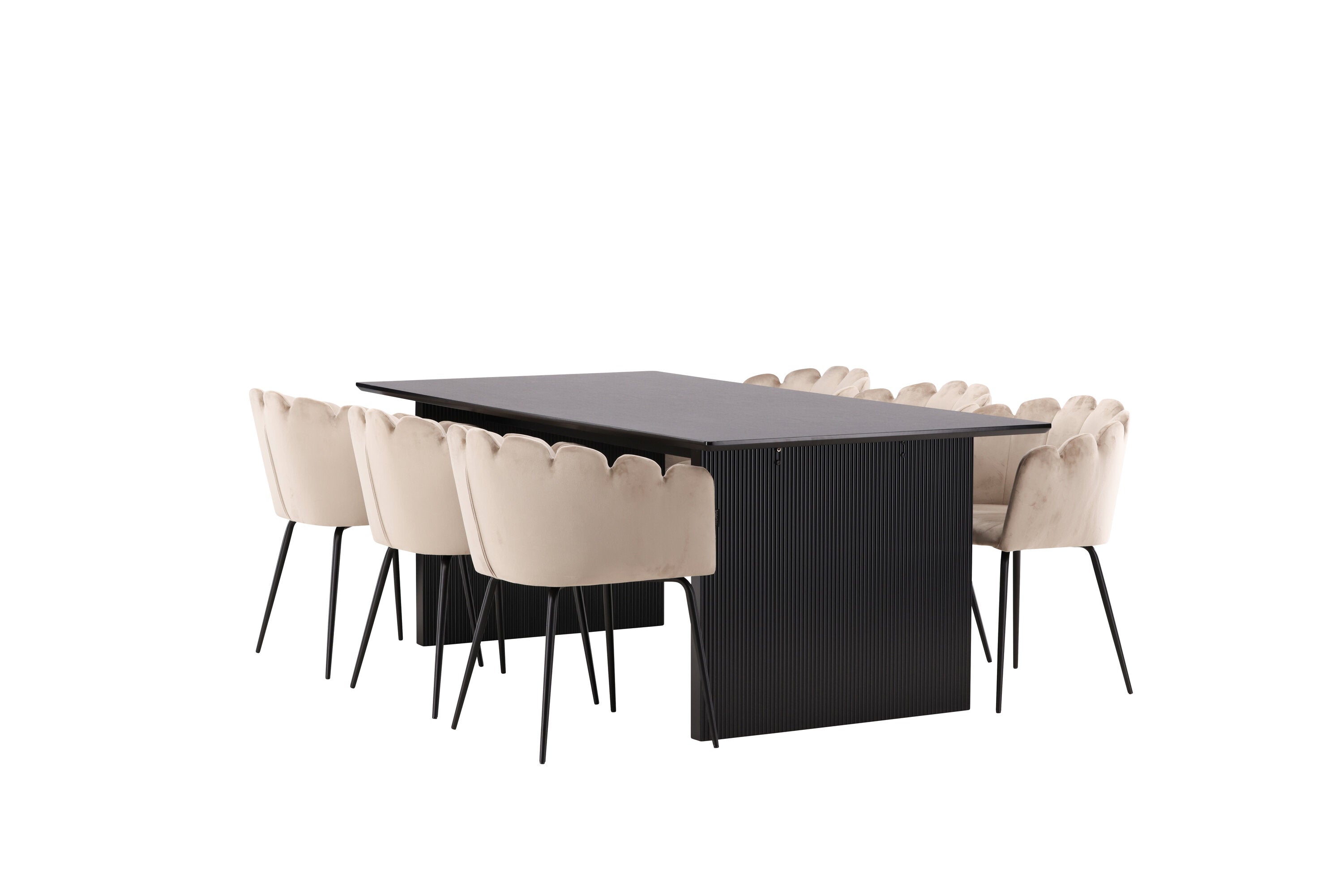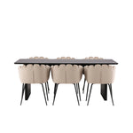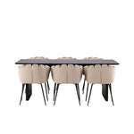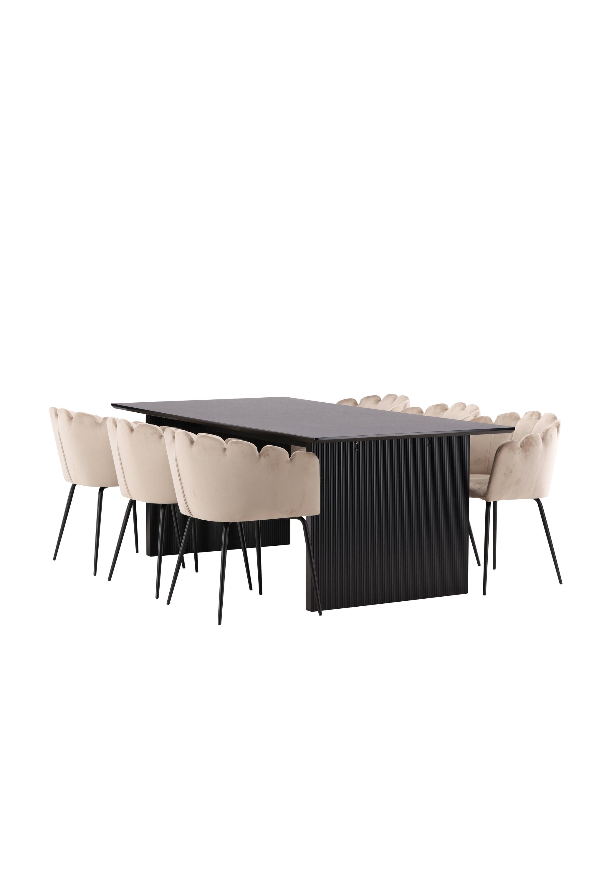 Zařiďte srdce svého domova půvabně a lákavě! Náš obdélníkový jídelní stůl ze série Vail má rovné severské tvary a je vyroben z odolné MDF v ušpiněné černé barvě. Deska stolu je tenká a balancuje na dvou pevných dřevěných deskách, které tvoří podvozek – stejně úhledné a odolné. Zde společně s jídelními židlemi ze série Limhamn v luxusní béžové barvě. Židle je moderním favoritem mnoha domácností se svým lákavým designem, ozdobným opěradlem ve tvaru mušle s ozdobným prošíváním a kulatým sedákem z vkusné béžové sametové látky. Nohy jsou z kovu s černou práškovou barvou. Pohodlně se usaďte a užívejte si!