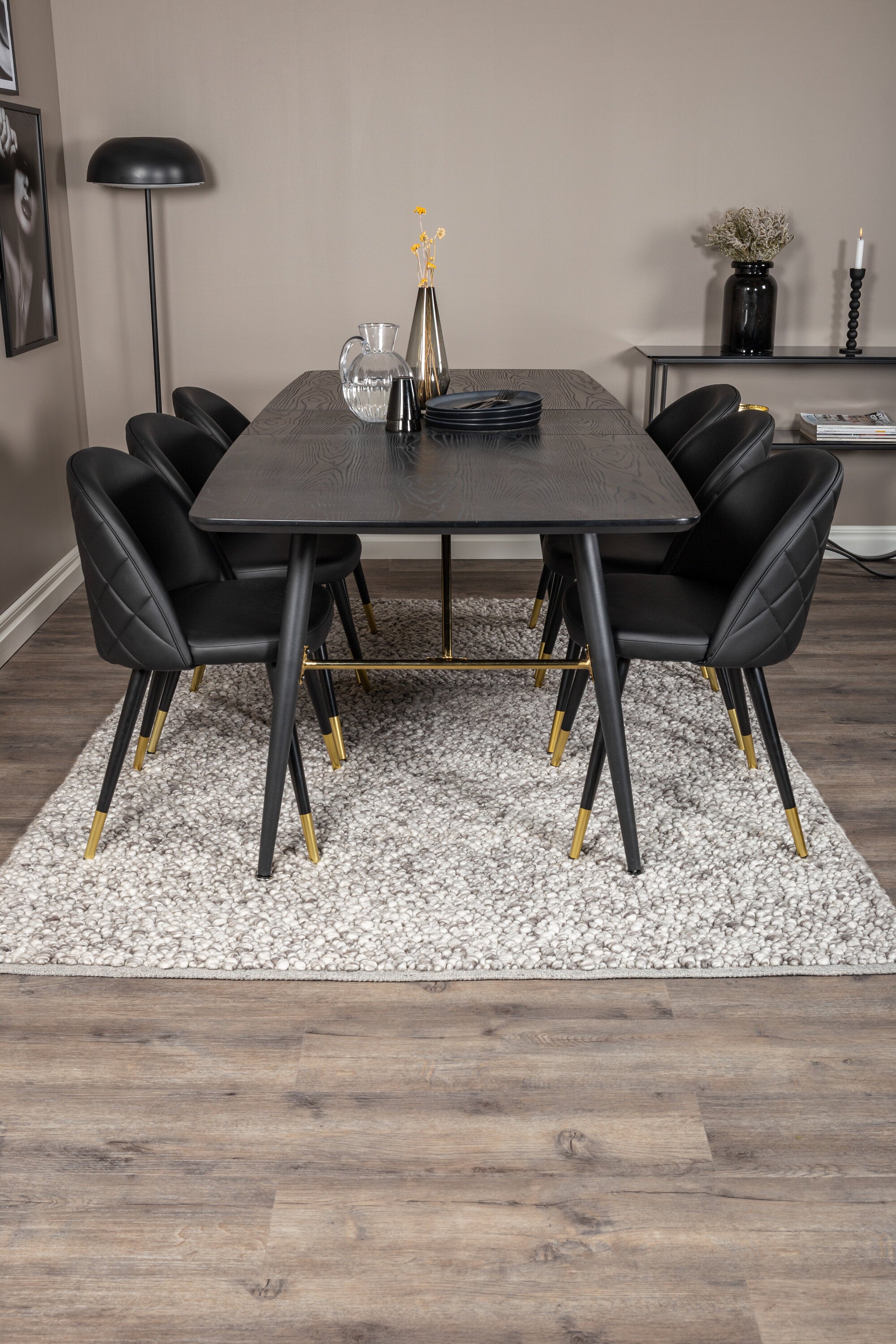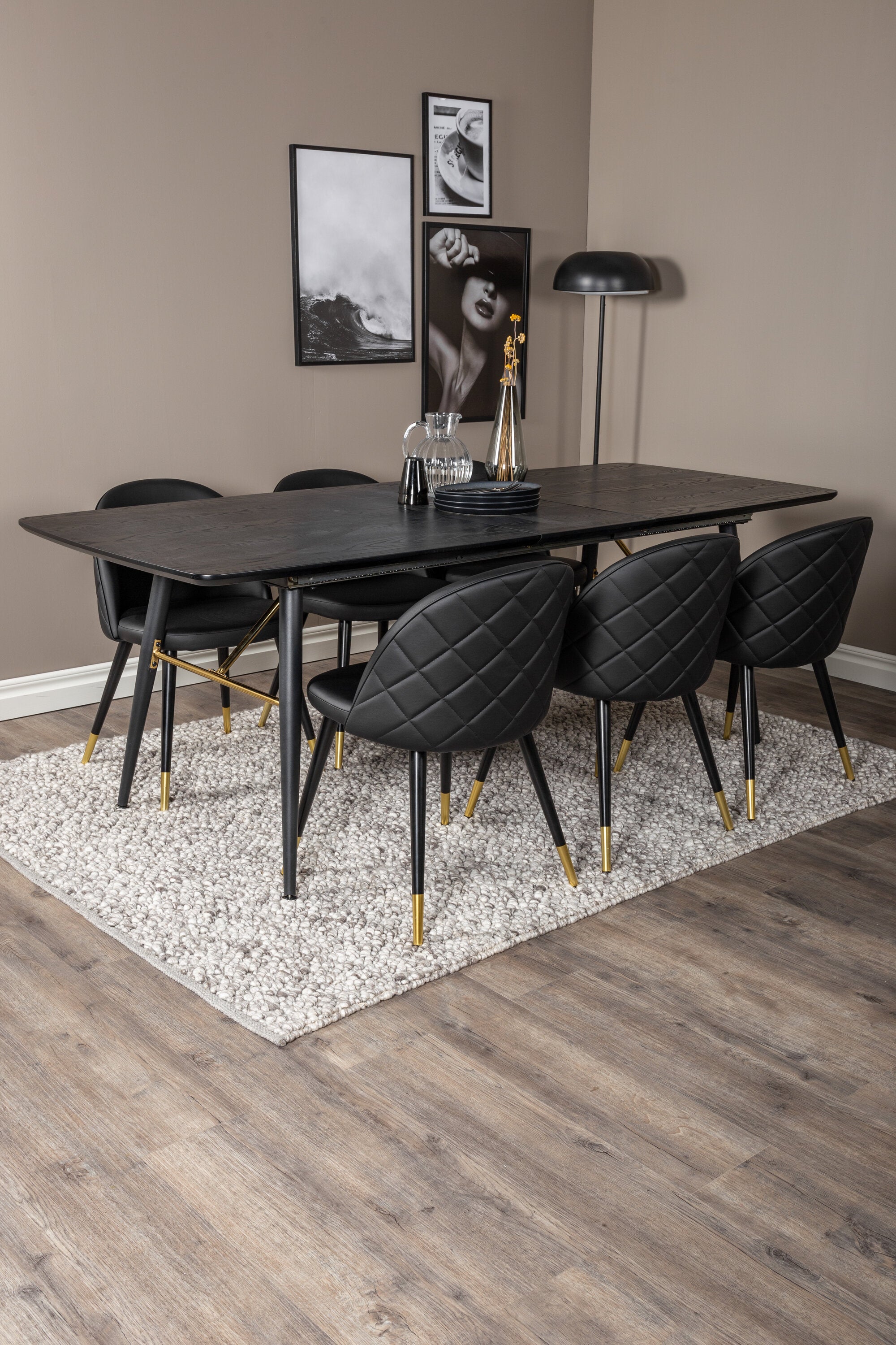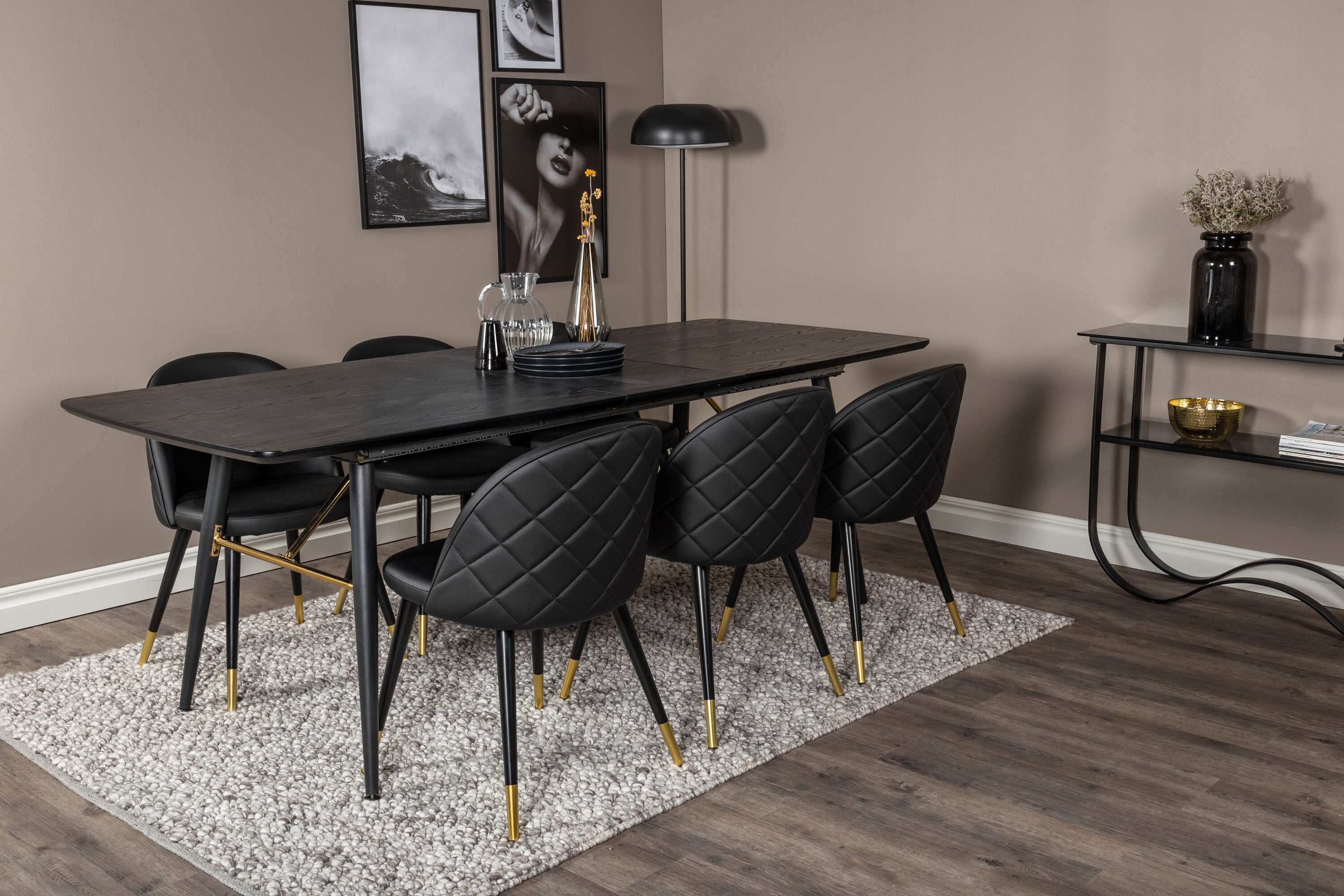 Náš moderní rozkládací jídelní stůl Gold spolu s pohodlnými jídelními židlemi ze série Velvet. Zde získáte skupinu potravin, která přímo vštěpuje luxus a eleganci. Oblečte svou skupinu jídel nahoru nebo dolů jinou výzdobou všude kolem, která se hodí pro každodenní život i na párty!