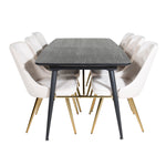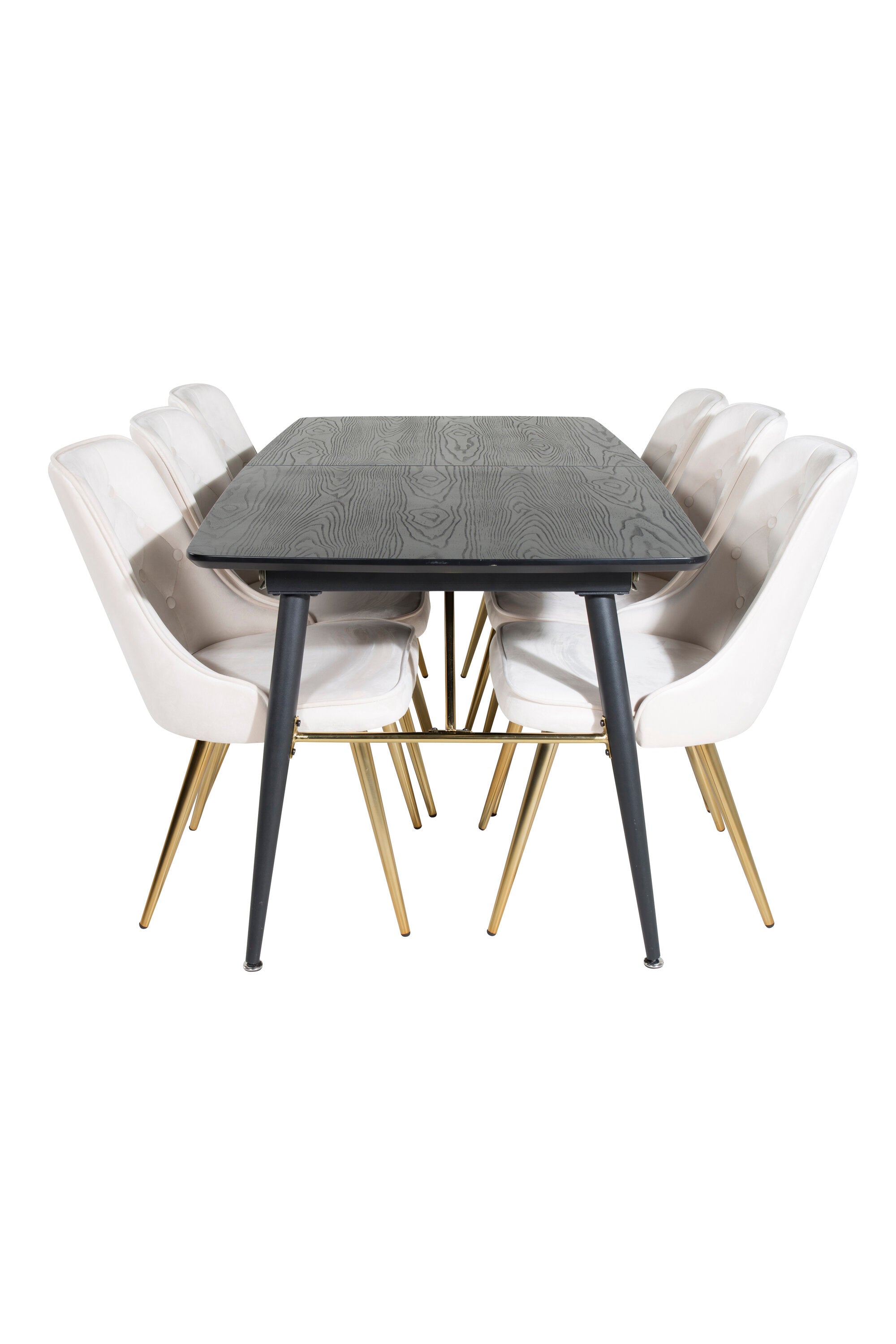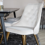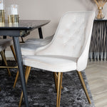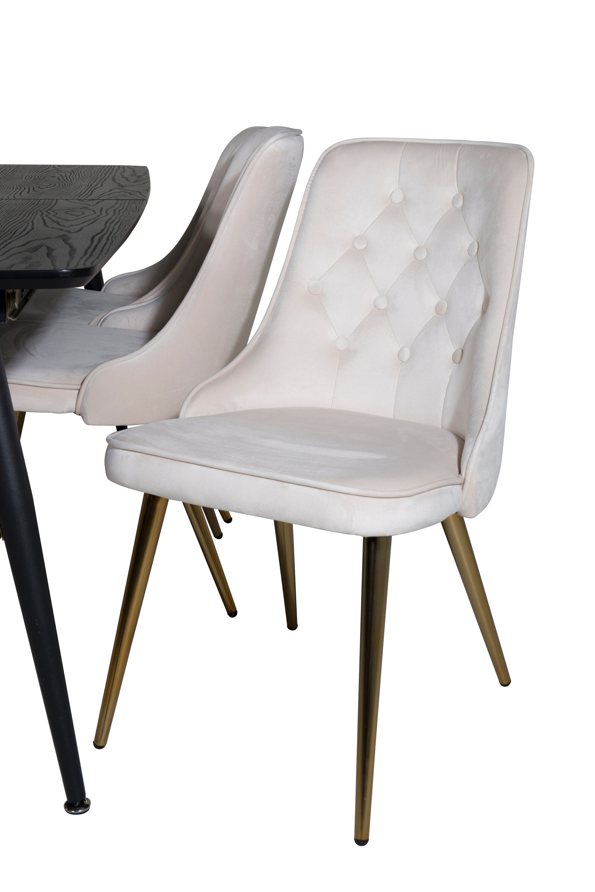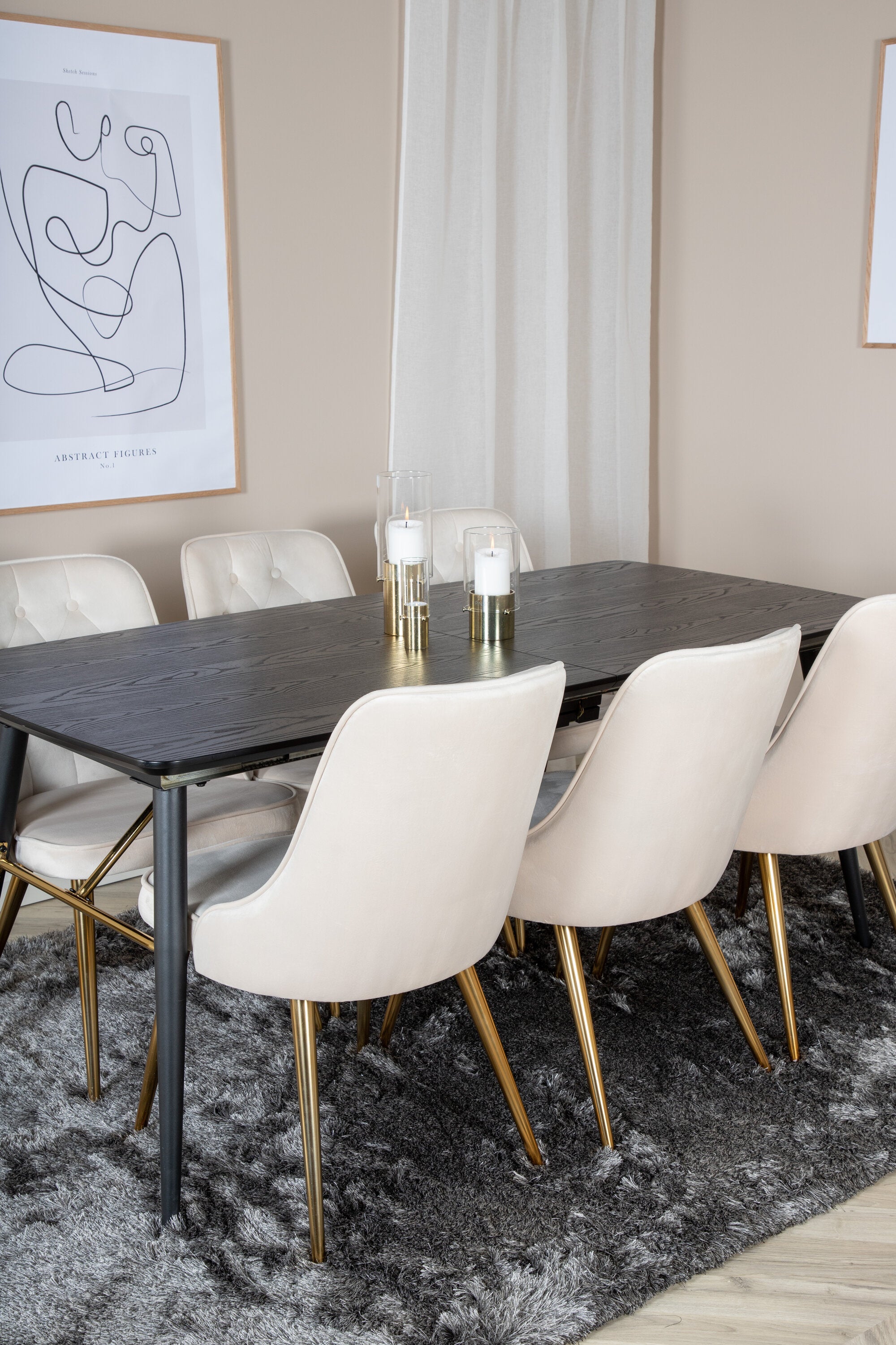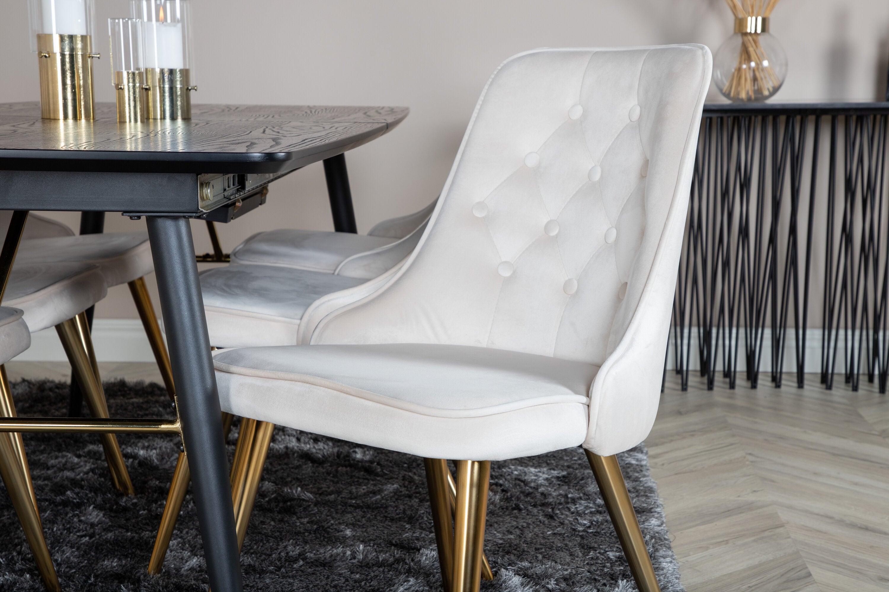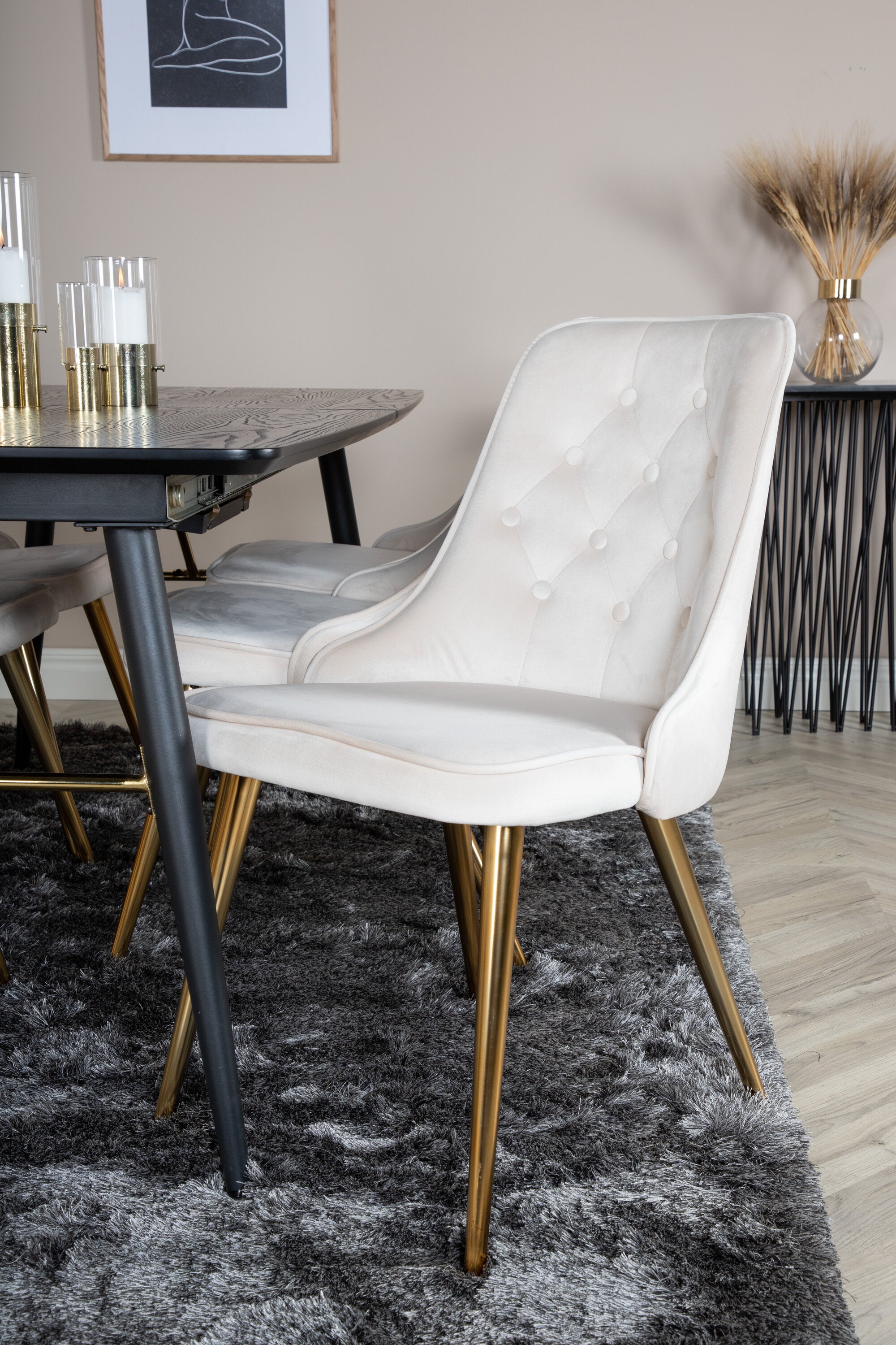 Nákup předem sestavené skupiny potravin je jak trendově bezpečný, tak praktický! Zde kombinujeme náš rozkládací jídelní stůl Gold s našimi béžovými jídelními židlemi Velvet. Nechte srdce domova charakterizovat vaši novou, poutavou skupinu potravin.