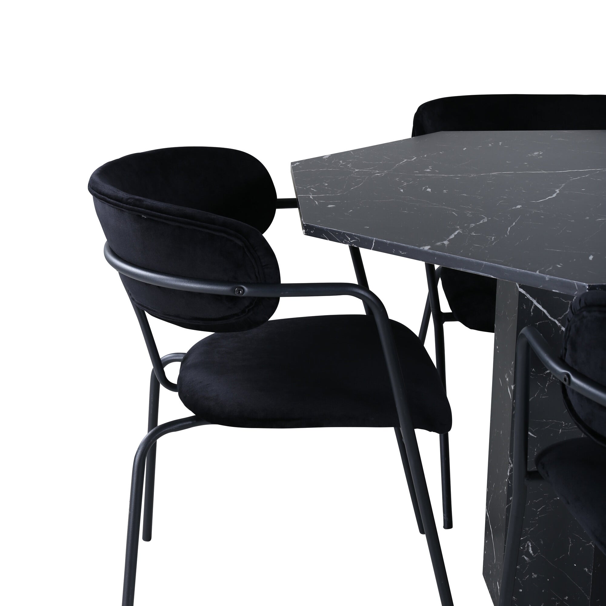 Jídelní stůl Estelle 140*90 – bílý mramor / černé nohy – sametová jídelní židle – černá / černá 4