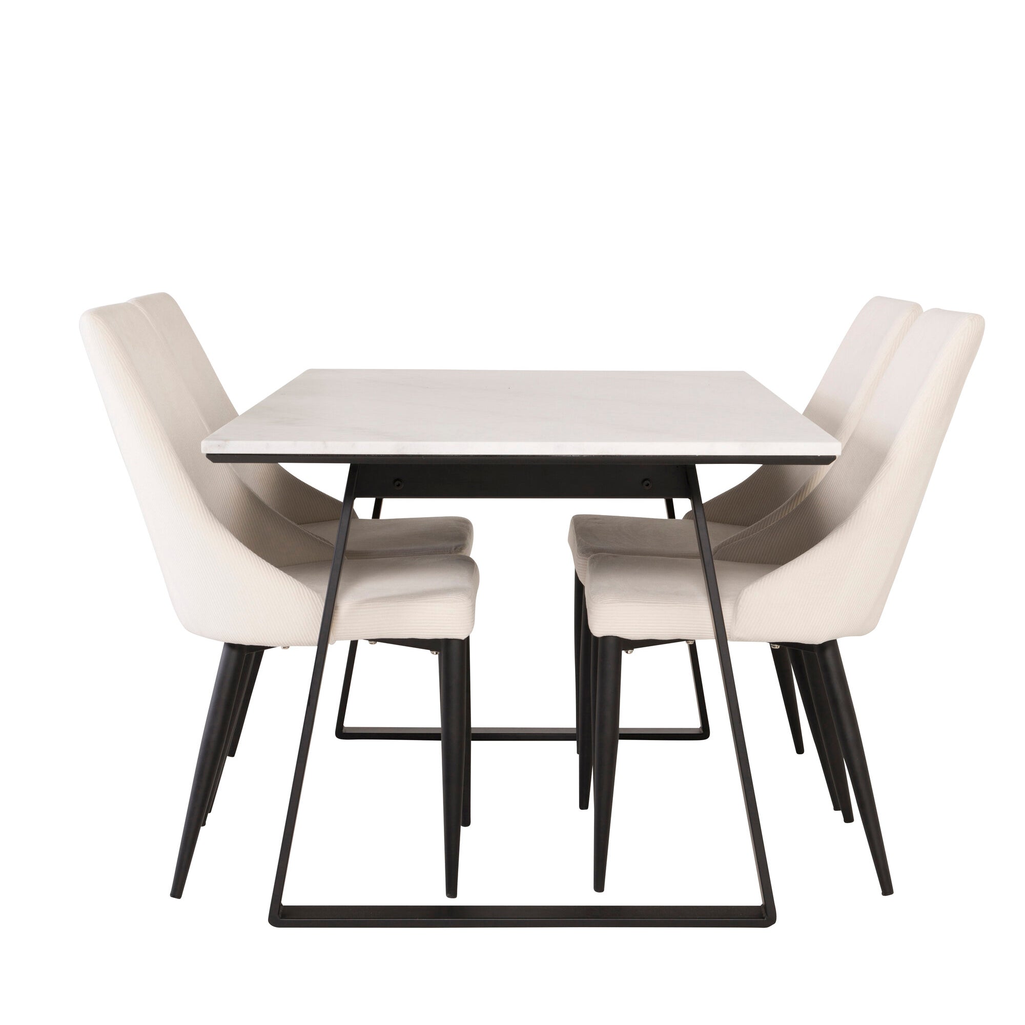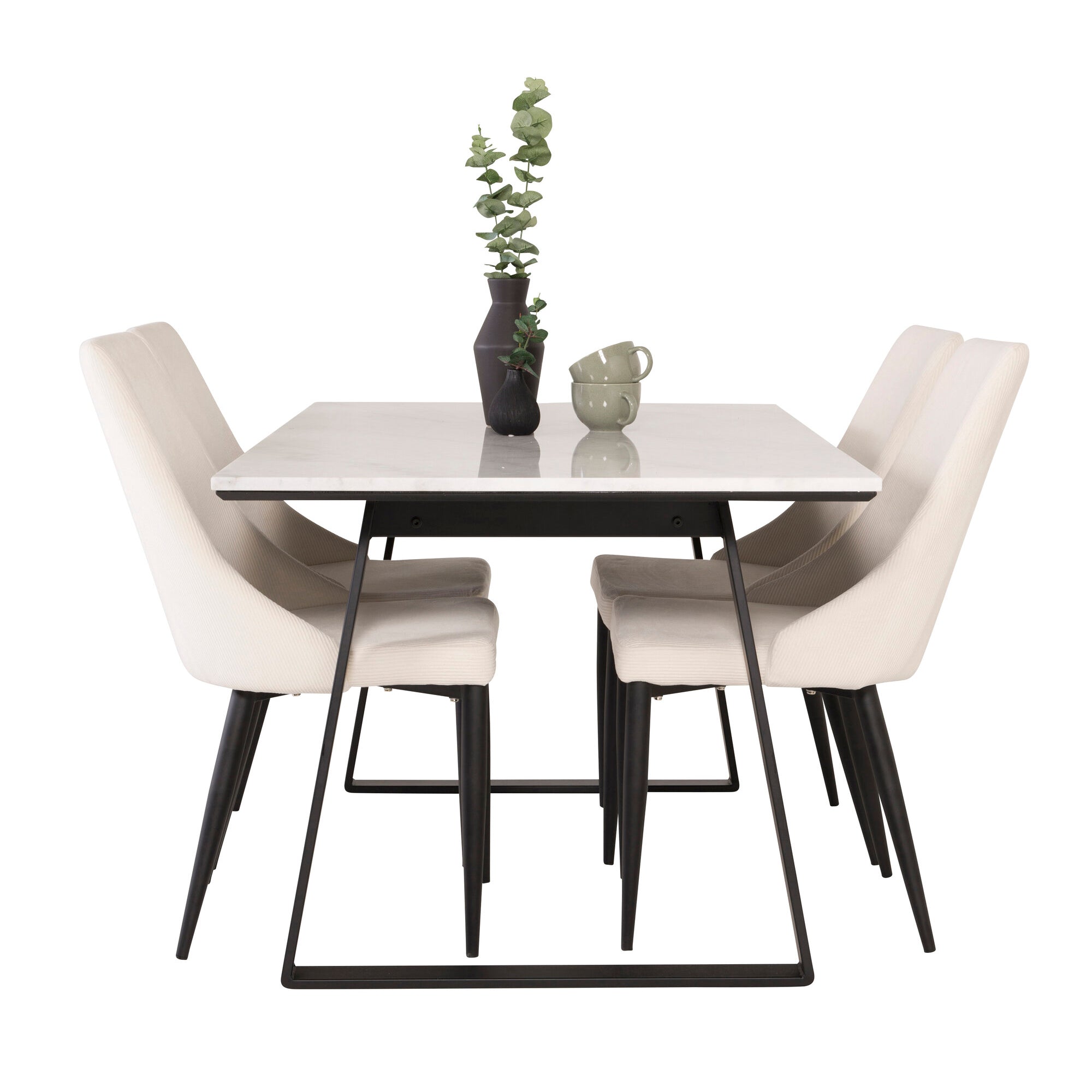 Jídelní stůl Estelle 140*90 – bílý mramor / černé nohy + jídelní židle Leone – černé nohy / béžový manšestr _4