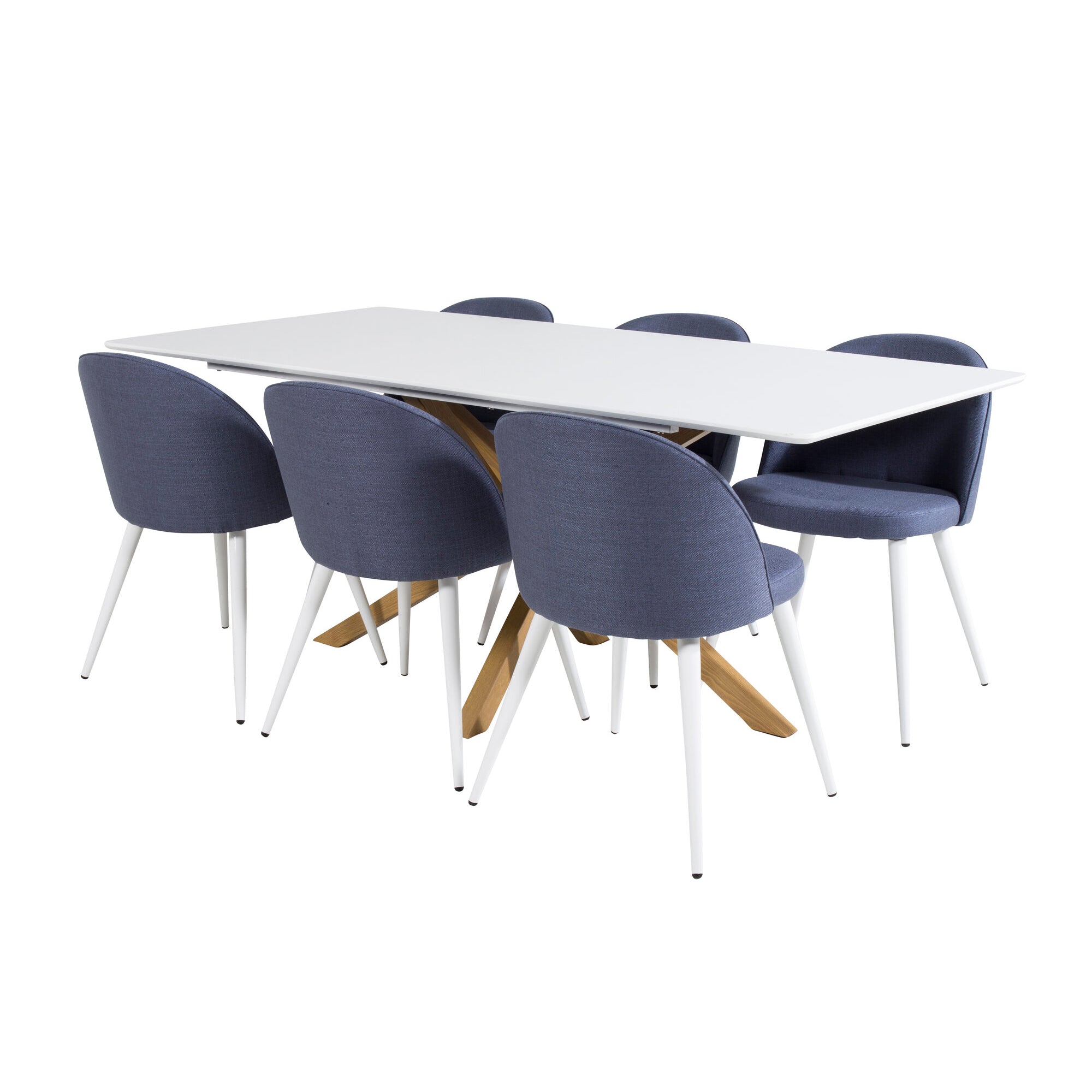 Piazza Matbord - Ek-look / Vit - 180*90*75 +Velvetová jídelní židle - Bílé nohy - Modrá látka _6
