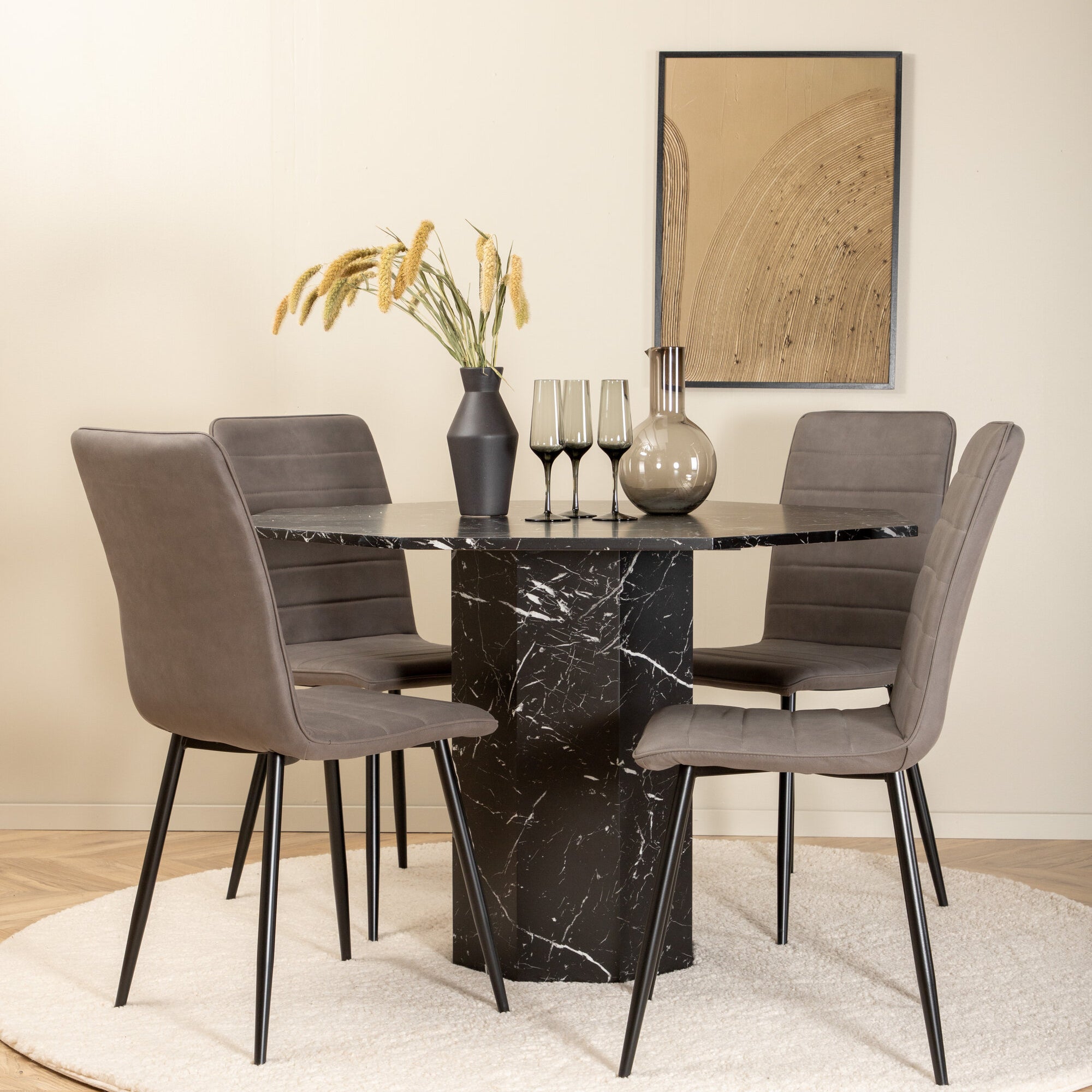 Kamenný kulatý jídelní stůl - černá / mocca dýha + židle Kenth - černá / černá PU _4