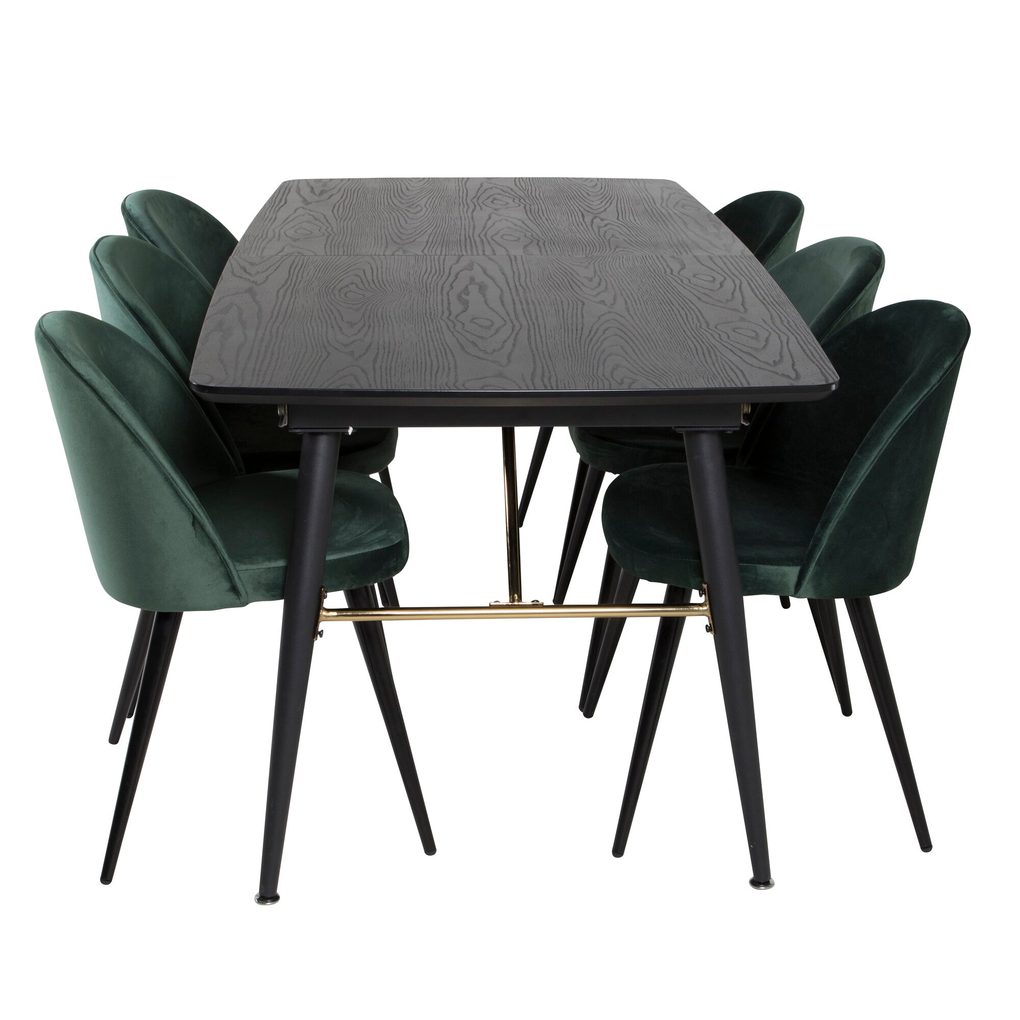 Zlatý rozkládací stůl - 180/220*85*H76 Černá dýha - Černé nohy - Mosazné detaily+Sametová jídelní židle - Zelená / Černá_6