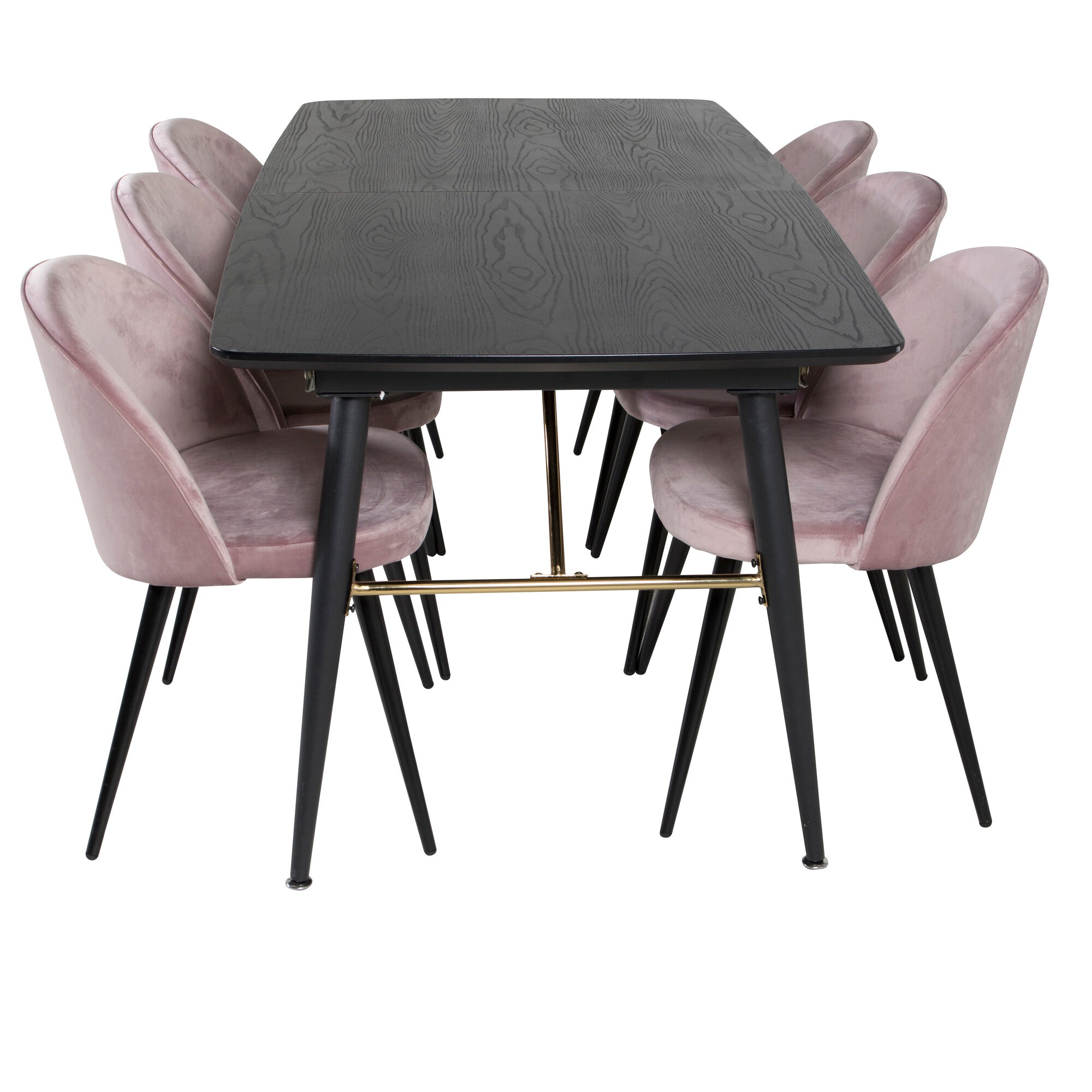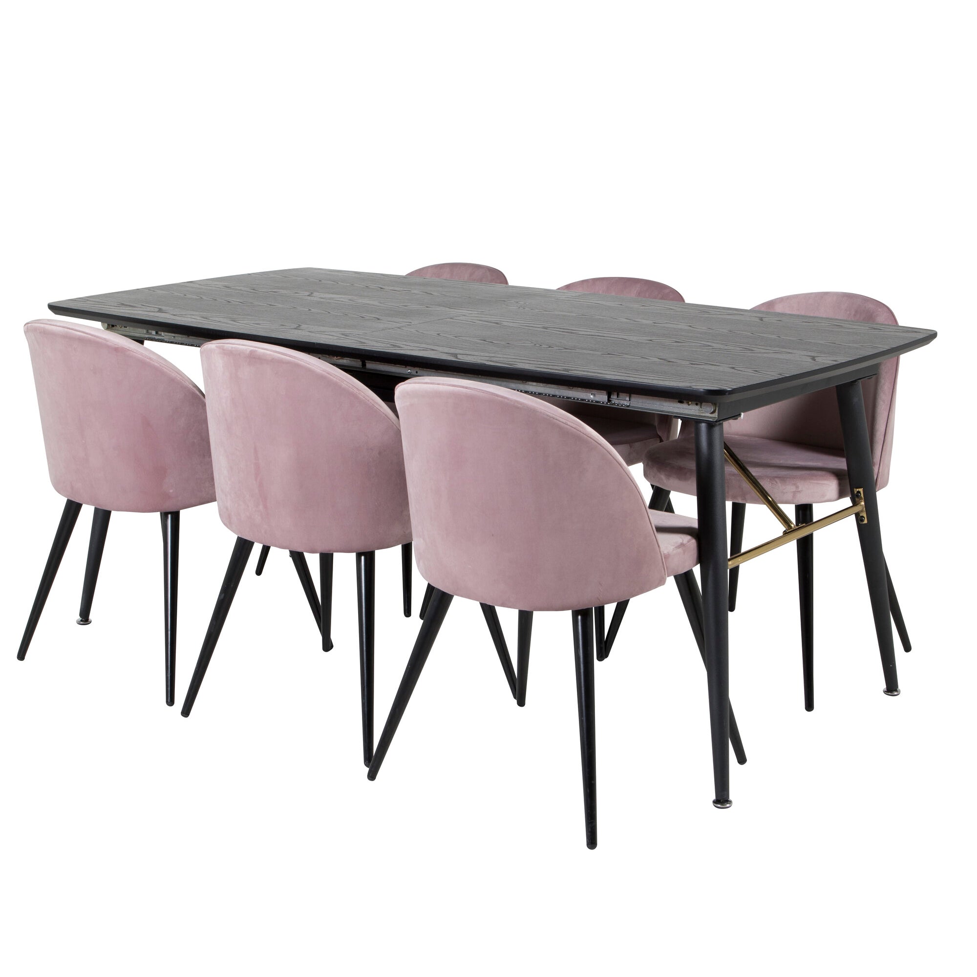 Zlatý rozkládací stůl - 180/220*85*H76 Černá dýha - Černé nohy - Mosazné detaily+Sametová jídelní židle - Růžová / Černá_6