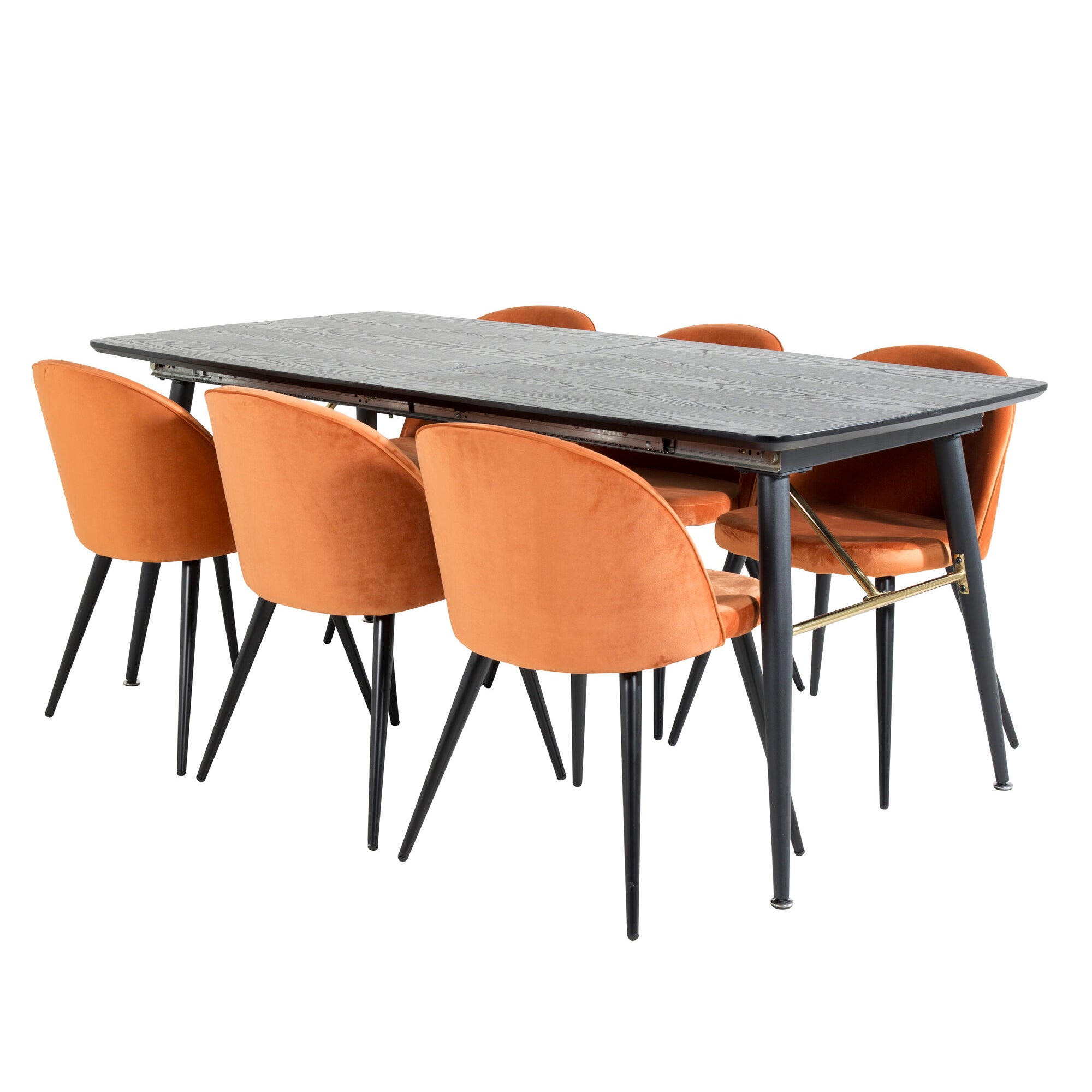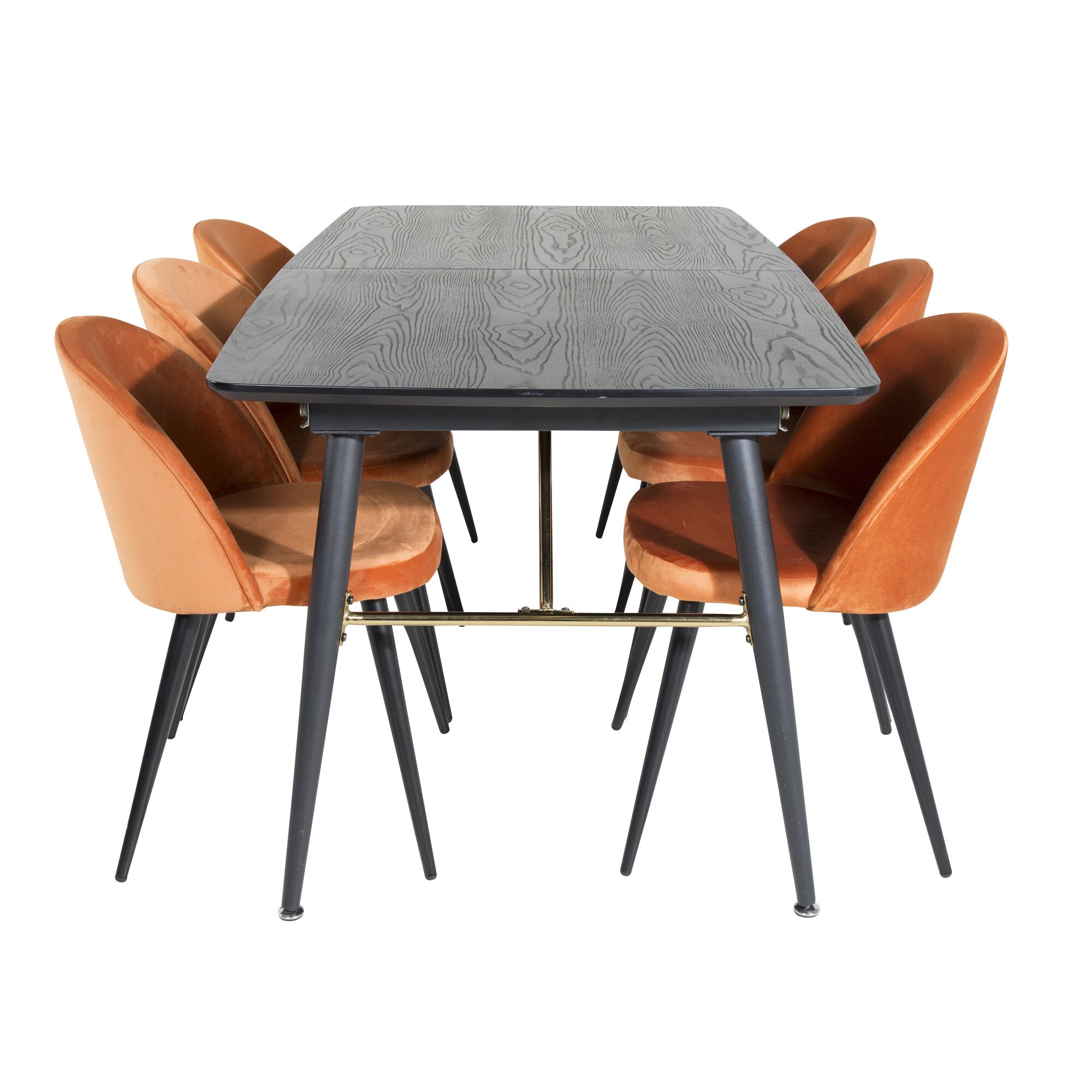 Zlatý rozkládací stůl - 180/220*85*H76 Černá dýha - Černé nohy - Mosazné detaily+Sametová jídelní židle - Oranžová / Černá_6