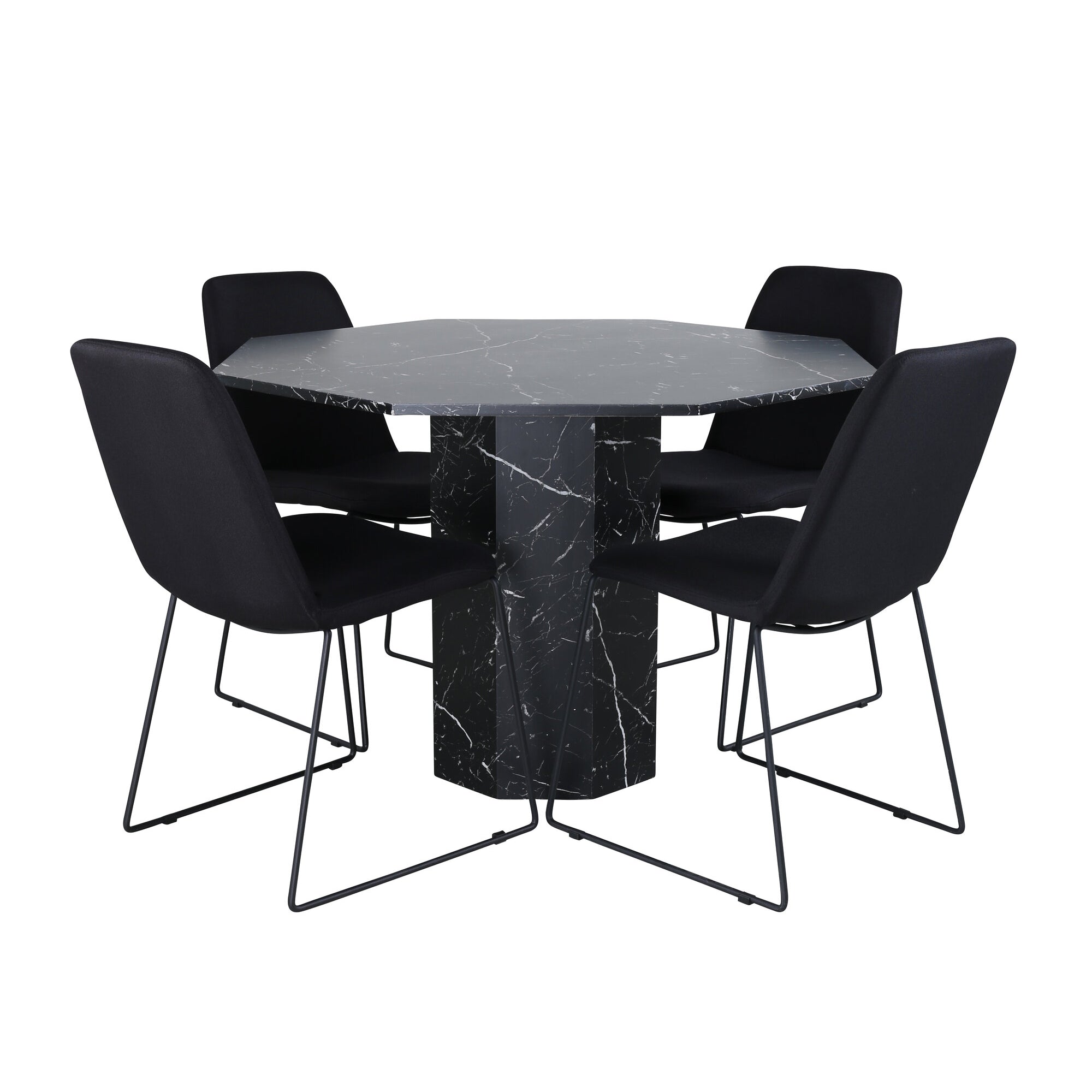 Kulatý jídelní stůl Marbs, černé černé sklo, jídelní židle mramor+muce, černé nohy, černá látka_4