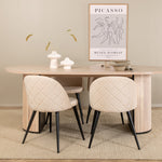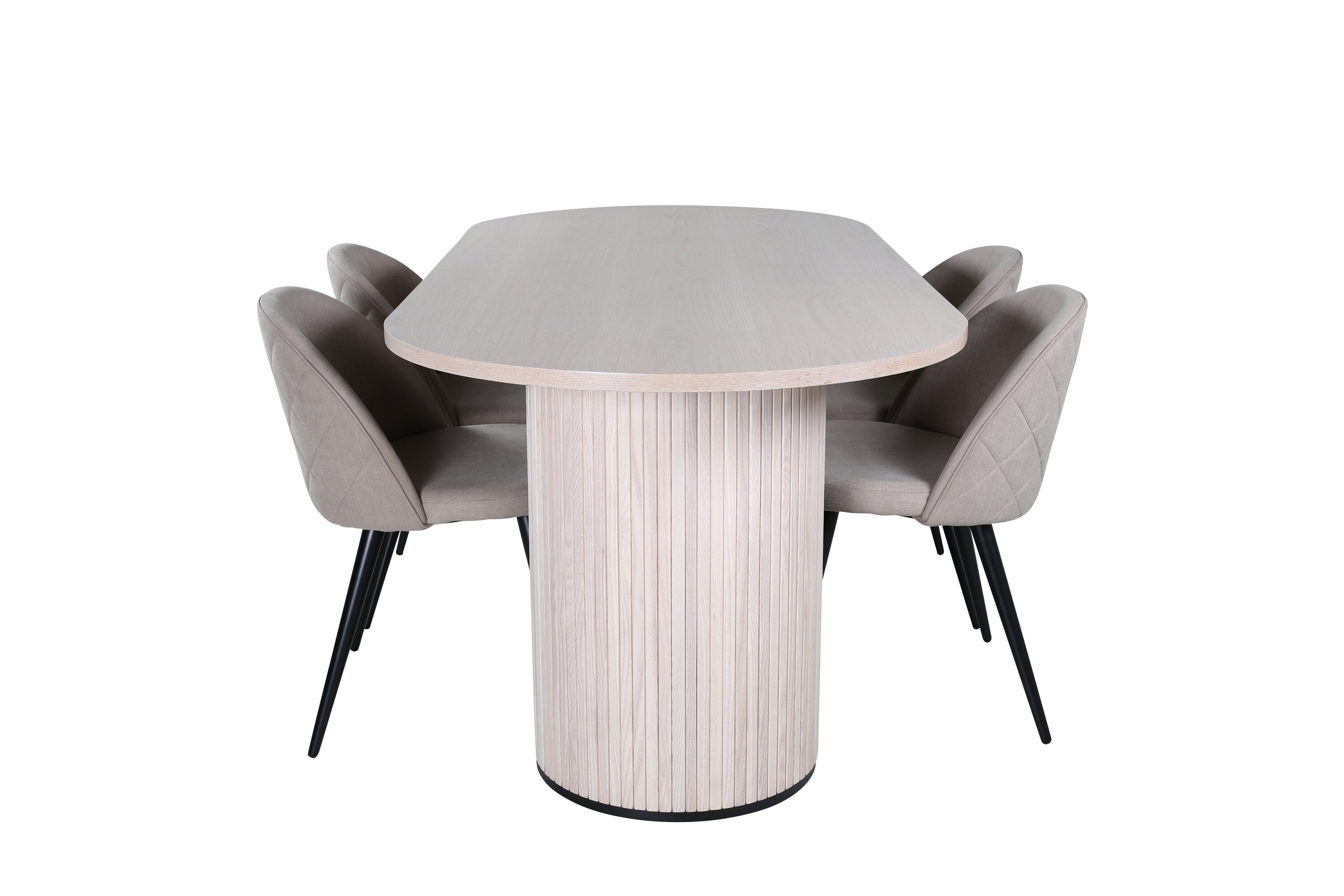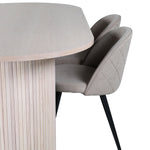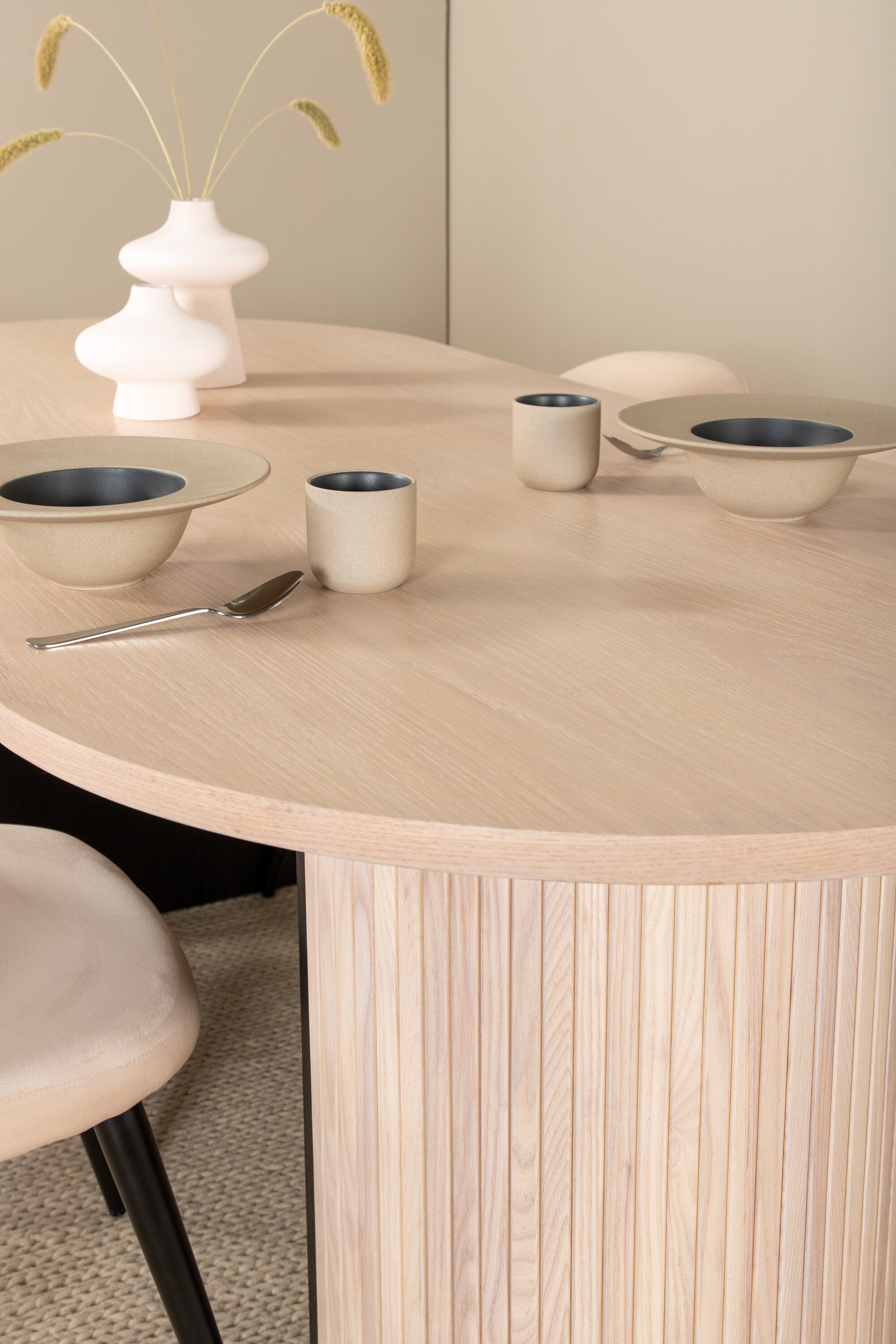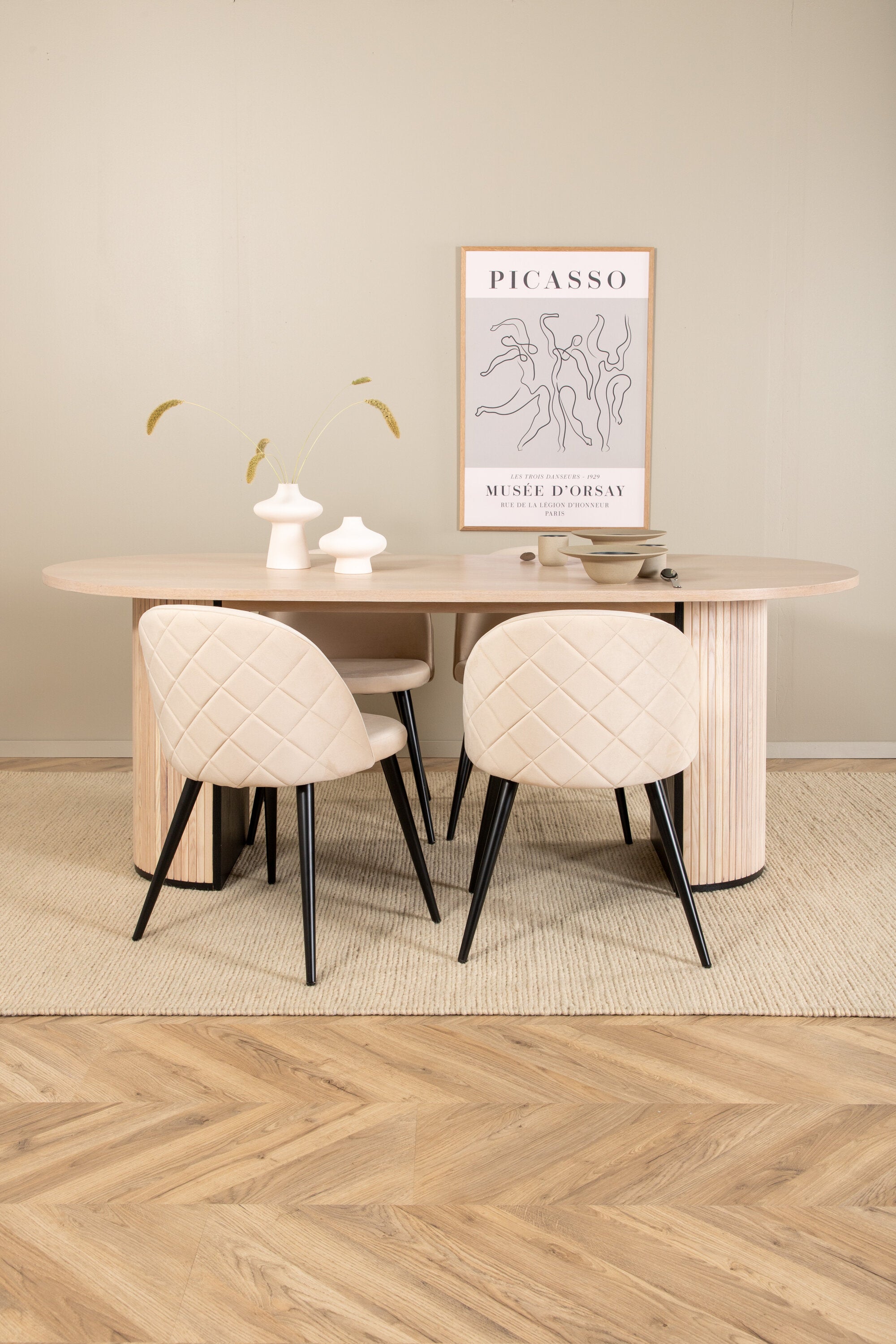 Moderní skupina potravin, která přitahuje oči! Oválný jídelní stůl Bianca v omítnuté bílé barvě má ​​lahodný design se stolní deskou z kostěné bílé MDF s dýhou a robustním rámem ze dřeva a MDF v žebrovaném provedení, který působí stabilním dojmem. Rozměry stolu: Délka: 200 cm, Šířka: 90 cm, Výška: 75 cm. Zde v dokonalé kombinaci se 4 našimi oblíbenými jídelními židlemi Velvet. Židle se zaměřují na styl a pohodlí s pohodlným sedákem z béžového polyesterového prádla a rozšířenými nohami židle ze železa. Rozměry židle: Výška: 76,5 cm, výška sedáku: 46,5 cm, šířka: 50 cm, hloubka: 57 cm. Ať se čas u jídelního stolu stane jedním z vrcholů dneška!
