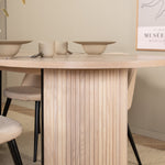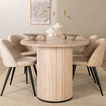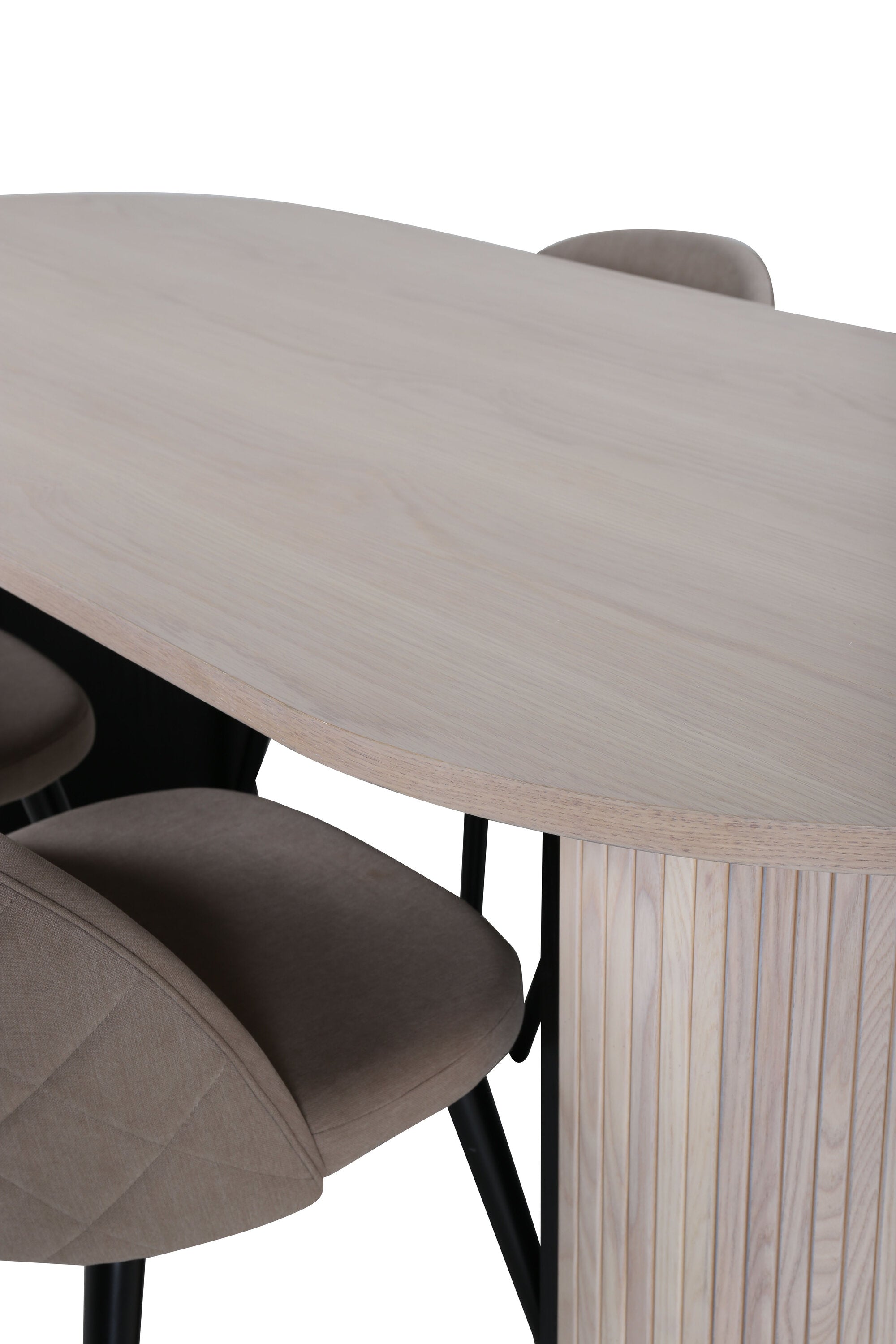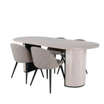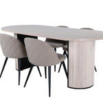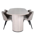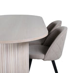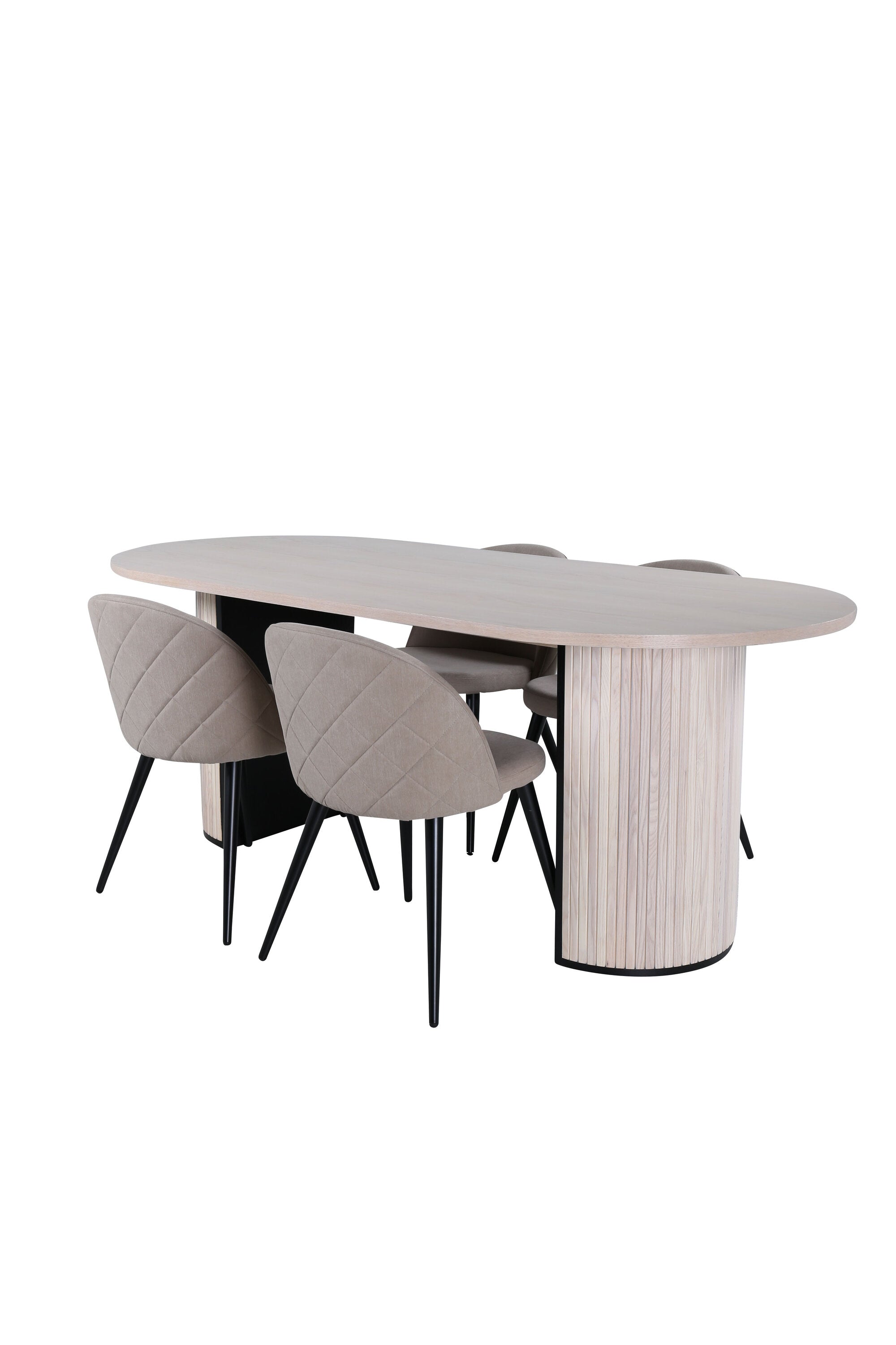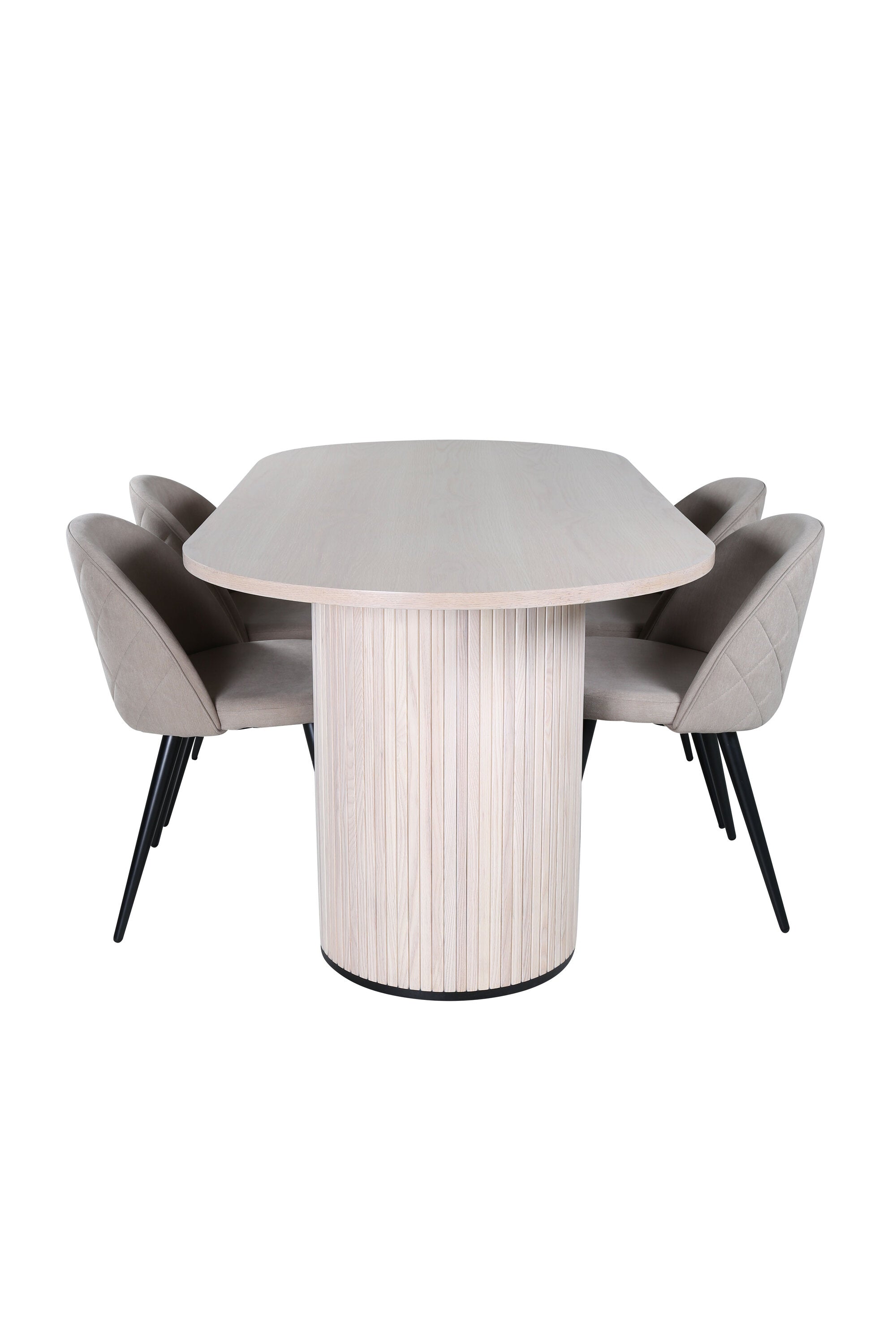 Moderní skupina potravin, která přitahuje oči! Oválný jídelní stůl Bianca v omítnuté bílé barvě má ​​lahodný design se stolní deskou z kostěné bílé MDF s dýhou a robustním rámem ze dřeva a MDF v žebrovaném provedení, který působí stabilním dojmem. Rozměry stolu: Délka: 200 cm, Šířka: 90 cm, Výška: 75 cm. Zde v dokonalé kombinaci se 4 našimi oblíbenými jídelními židlemi Velvet. Židle se zaměřují na styl a pohodlí s pohodlným sedákem z béžového polyesterového prádla a rozšířenými nohami židle ze železa. Rozměry židle: Výška: 76,5 cm, výška sedáku: 46,5 cm, šířka: 50 cm, hloubka: 57 cm. Ať se čas u jídelního stolu stane jedním z vrcholů dneška!