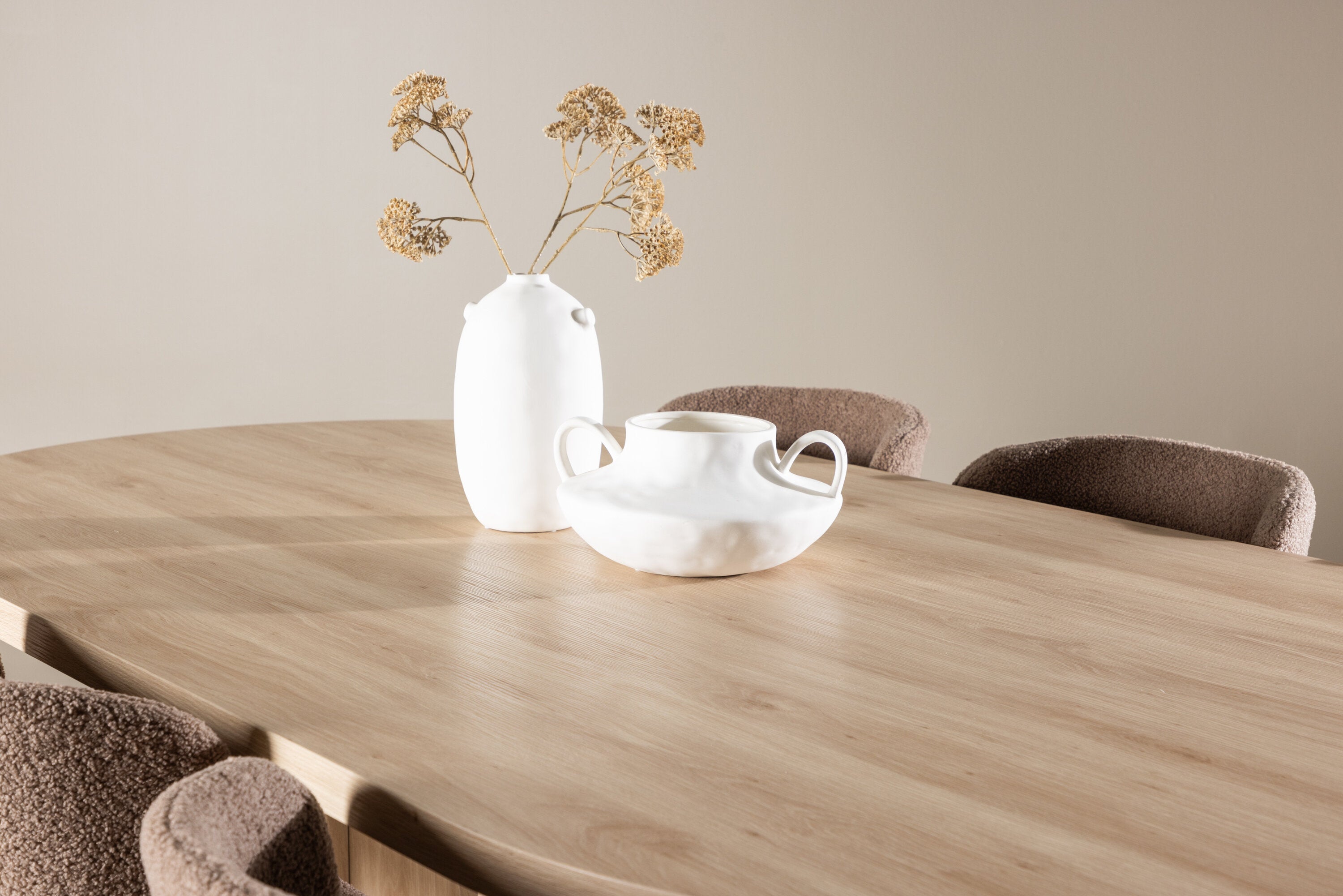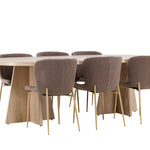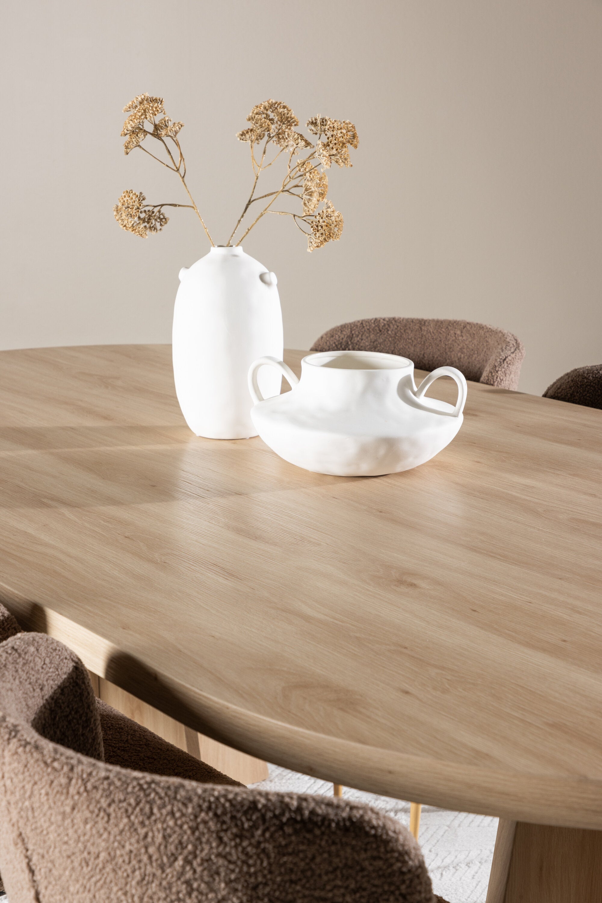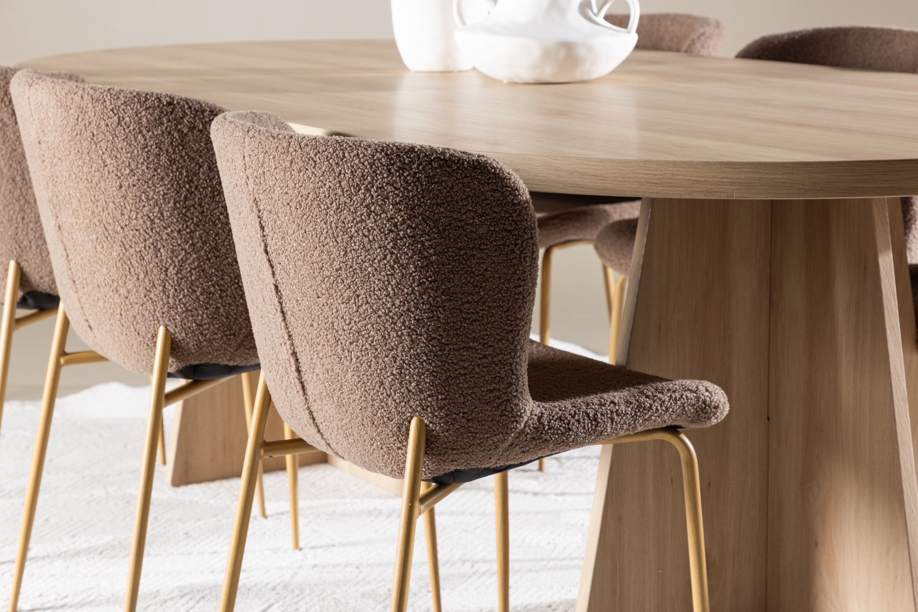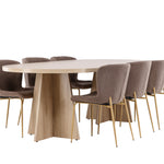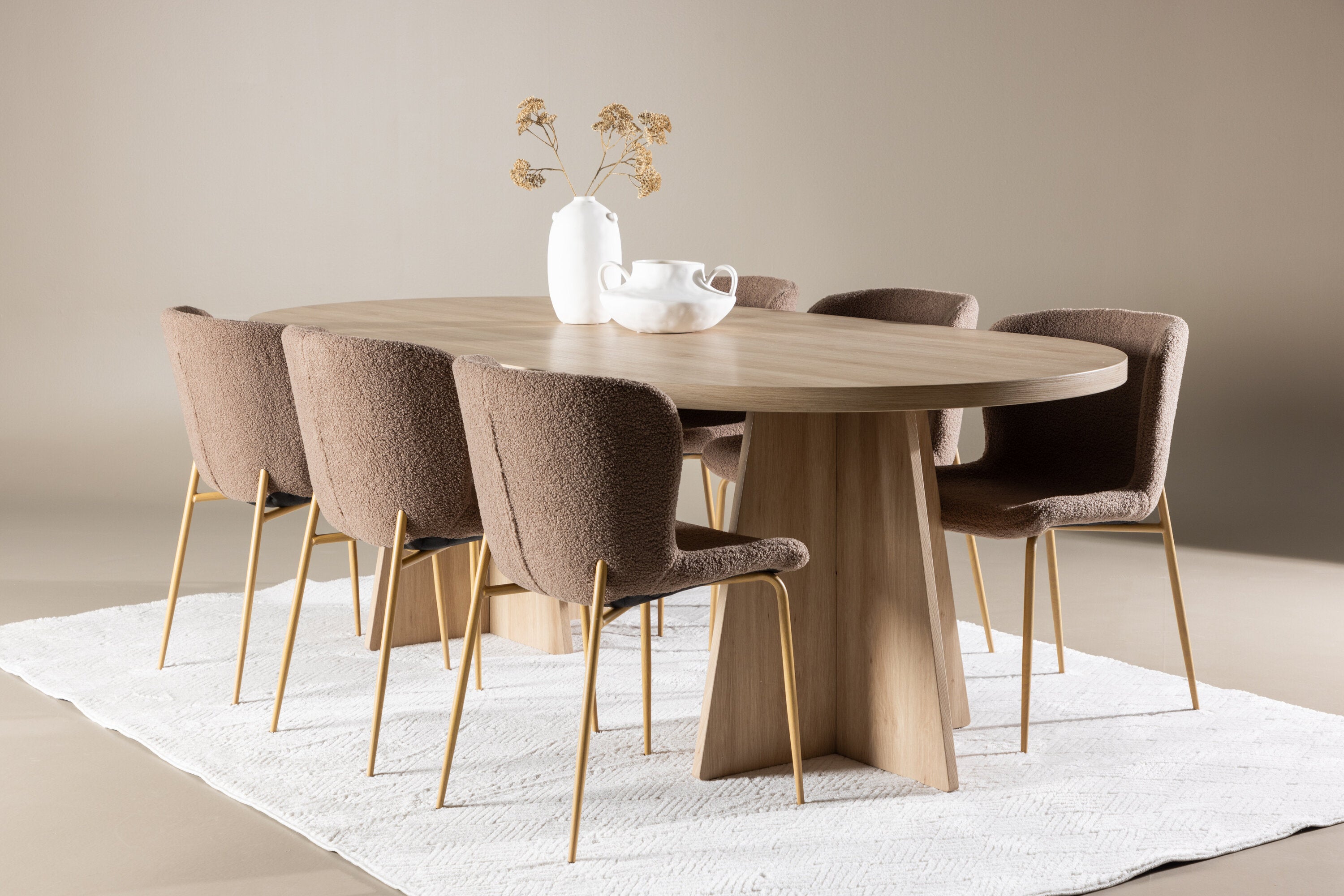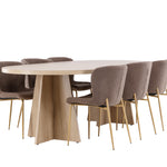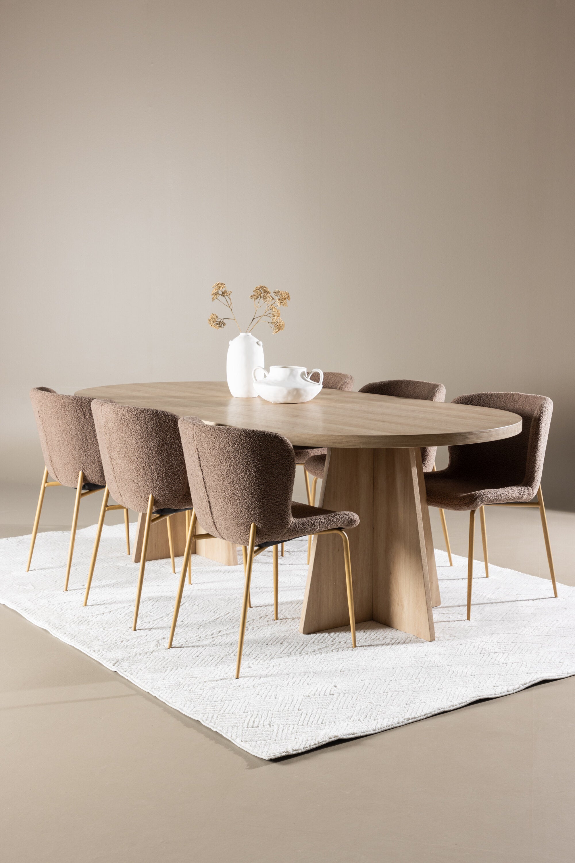 Vytvořte si stylový a příjemný jídelní kout s naší exkluzivní jídelní sadou, která kombinuje trendy design a vysokou funkčnost. Objevte jídelní židli Modesto – trendy a poutavý kus nábytku, který do vaší jídelny vnese hřejivou atmosféru. Sedák židle je čalouněný příjemným plyšovým materiálem v elegantní hnědé barvě, nohy jsou ocelové a mají krásnou mocca barvu. Se svou zemitou estetikou a trendy designem je jídelní židle Modesto dokonalým doplňkem vašeho interiéru. Poutavá kombinace materiálů a barev dodá vaší jídelně moderní a stylový výraz. Dodejte svému domovu nádech elegance a vytvořte u svého jídelního stolu příjemnou atmosféru s jídelní židlí Modesto. Pohodlné a stylové místo, kde si můžete vychutnat dobré jídlo a vytvořit nezapomenutelné chvíle s rodinou a přáteli. Objevte krásu a funkčnost jídelního stolu Bootcut - perfektní volba pro vytvoření nezapomenutelných okamžiků s přáteli a rodinou. S působivými rozměry 230x115 cm nabízí tento stůl dostatek prostoru pro společenské večeře a dlouhé rozhovory. Jídelní stůl Bootcut je dodáván v nádherné bílé barvě, která dodá vašemu pokoji zemitý nádech. Jeho skandinávský design a čisté linie přispívají ke stylové a moderní atmosféře vašeho domova. Vytvořte příjemnou atmosféru a nechte jídelní stůl Bootcut být středem vašich společenských setkání. Ať už se jedná o rodinnou večeři nebo slavnostní příležitosti, tento působivý stůl udělá z každé příležitosti nezapomenutelnou. Dodejte svému domovu nádech jednoduché elegance a pospolitosti s jídelním stolem Bootcut – perfektním místem pro setkání vašich blízkých a vytvoření trvalých společných vzpomínek.