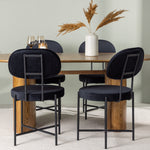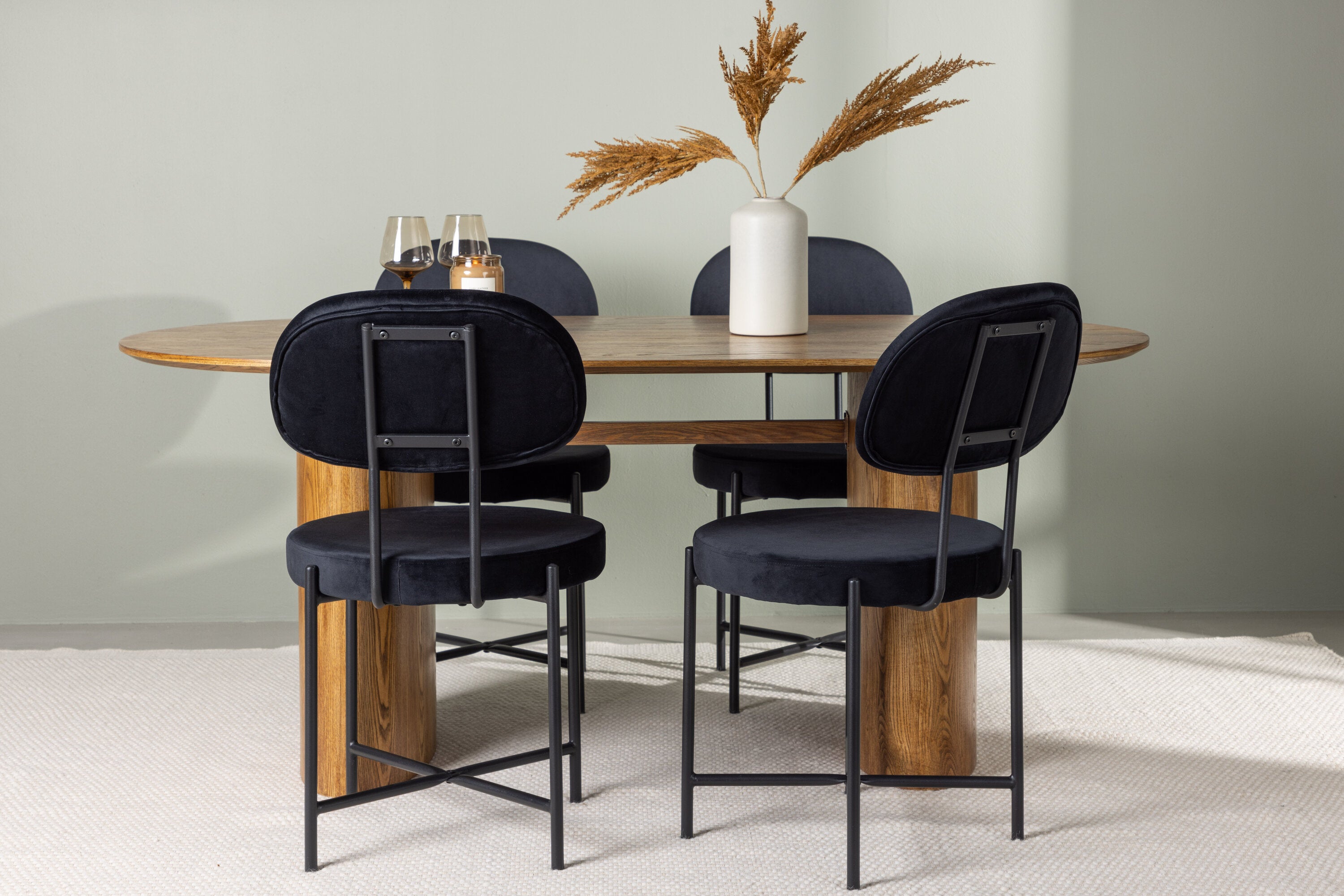 Společně s našimi černými jídelními židlemi Stella tvoří tato jídelní souprava dokonalou harmonii. Křeslo fantastickým způsobem spojuje pohodlí a styl. Trendy skandinávský design kombinuje kulatý sedák a opěradlo z luxusní černé sametové látky s minimalistickými nohami židle z elegantní černé oceli. Tato kombinace materiálů a tvaru poskytuje výjimečné pohodlí a sofistikovaný nádech vašeho jídla.