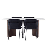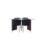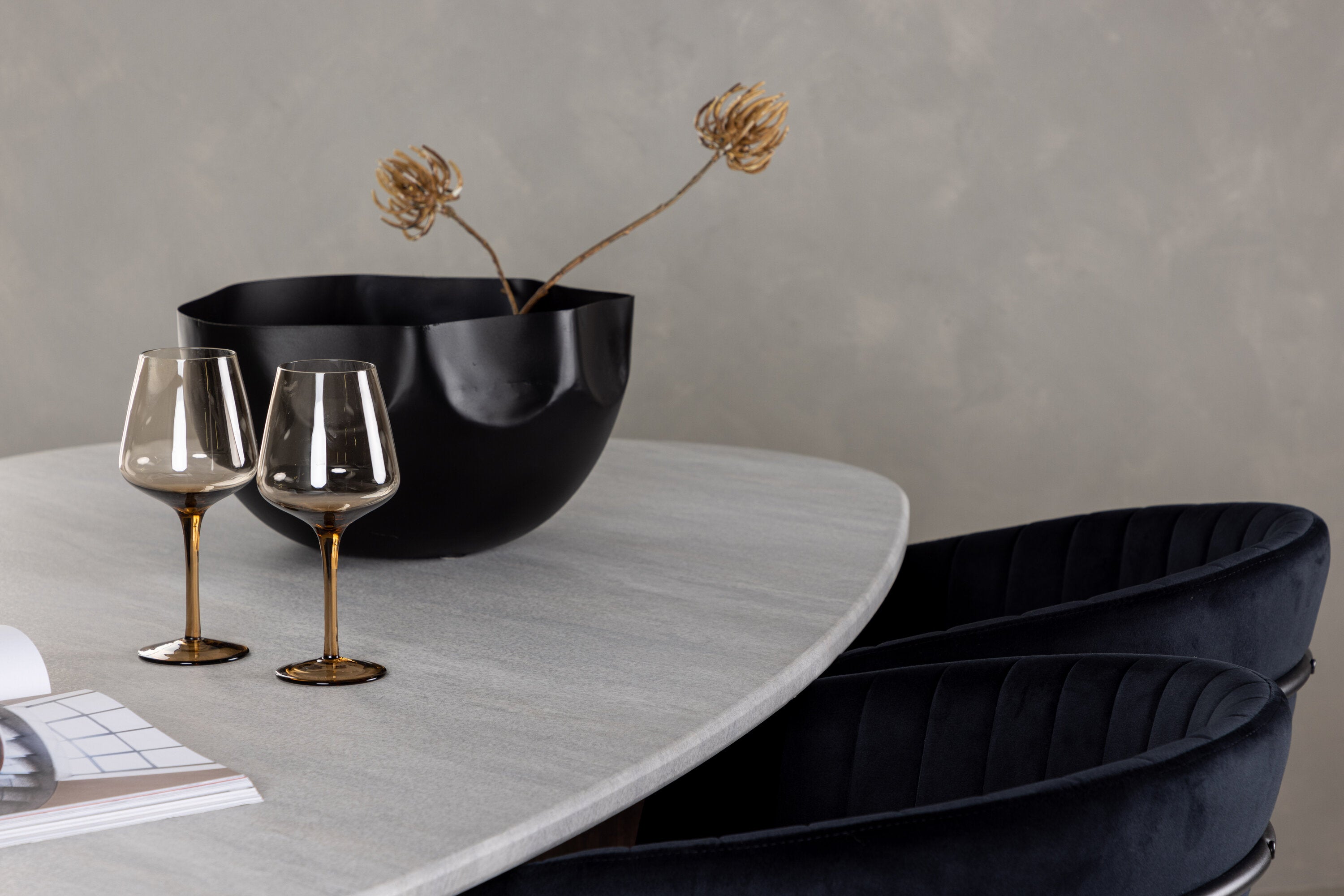 Pro doplnění jídelní sestavy jsme ji spárovali s černými židlemi ze série Selma. Opěradlo je jemně zaoblené pro optimální pohodlí a sedák je čalouněn luxusním sametem s ozdobnými švy, které dodávají extra nádech elegance. Nohy židle jsou tenké a vyrobené z černé oceli a poskytují moderní a stylový kontrast k měkkému sametovému čalounění. Už to nebude pohodlnější než tohle! Dodejte svému domovu dotek luxusu a elegance s touto jídelní skupinou a pozvěte přátele a rodinu na útulná jídla v budoucnu!