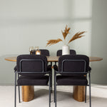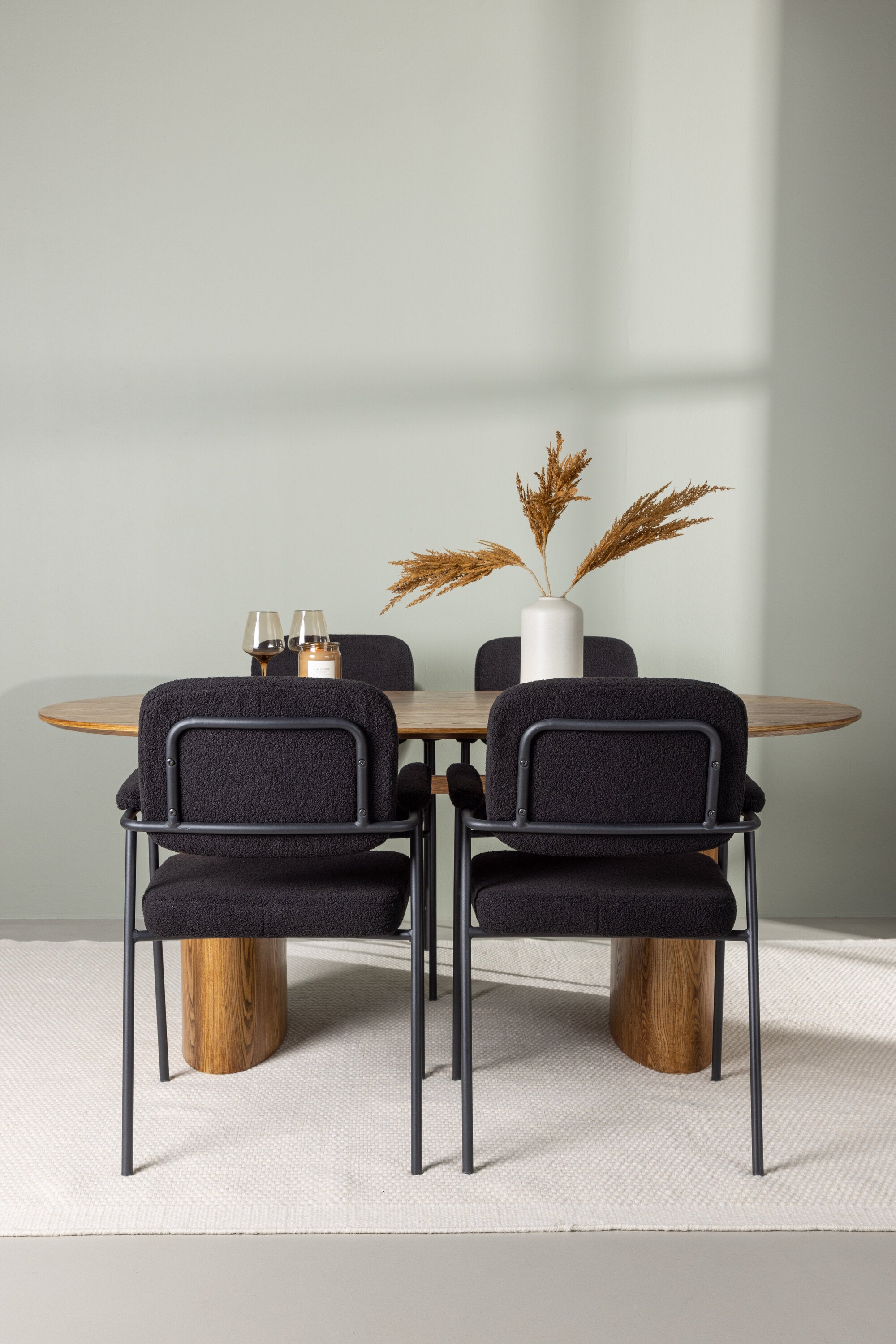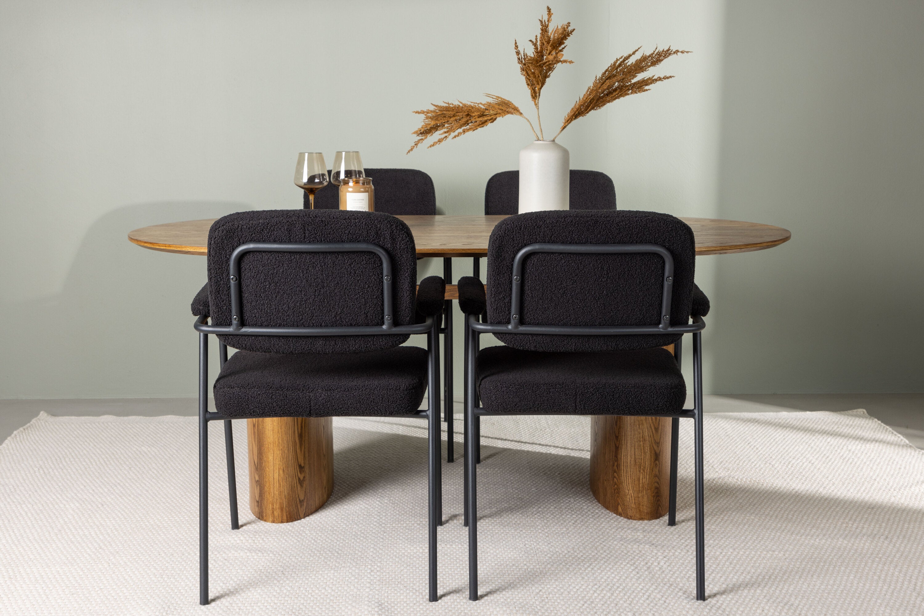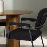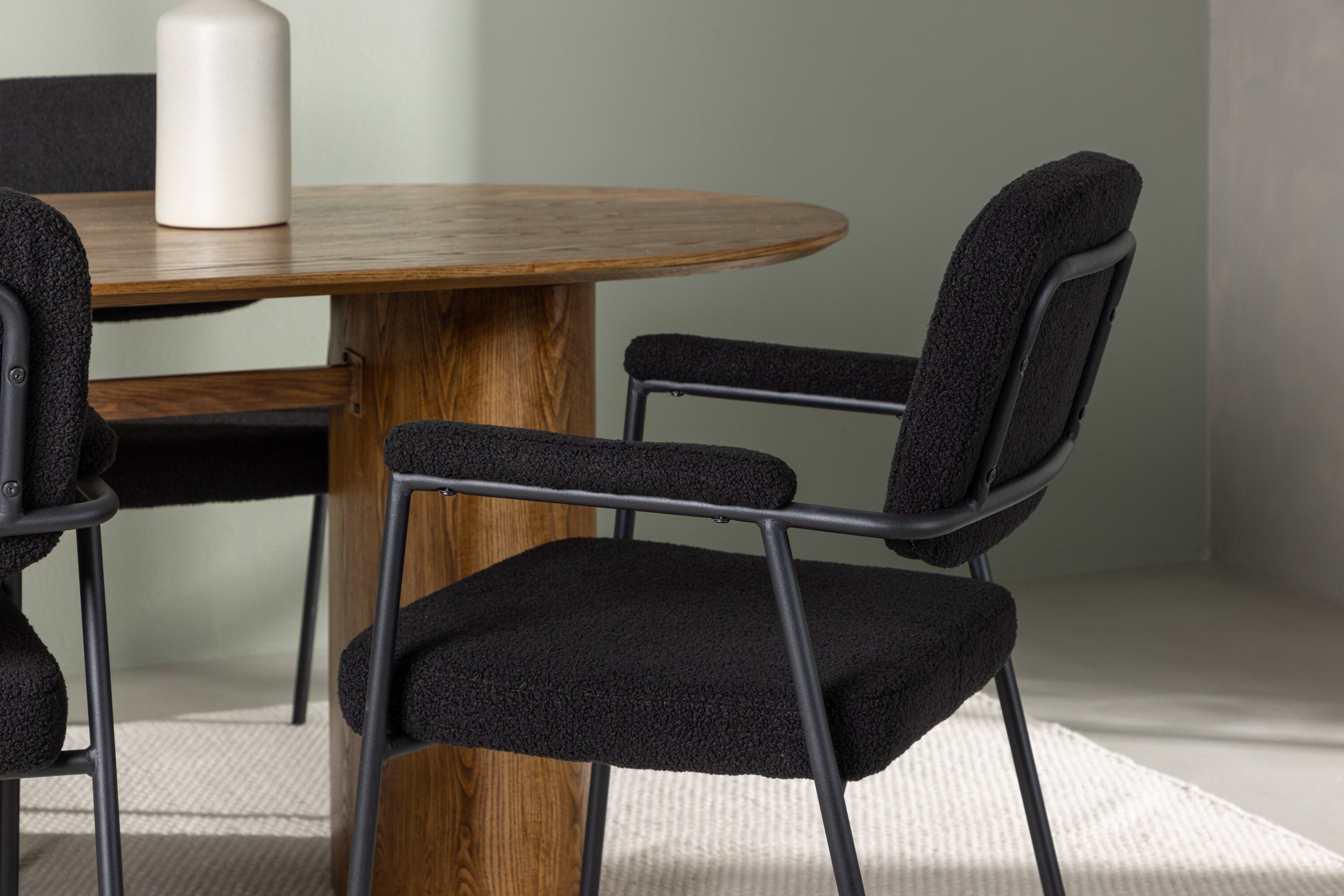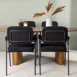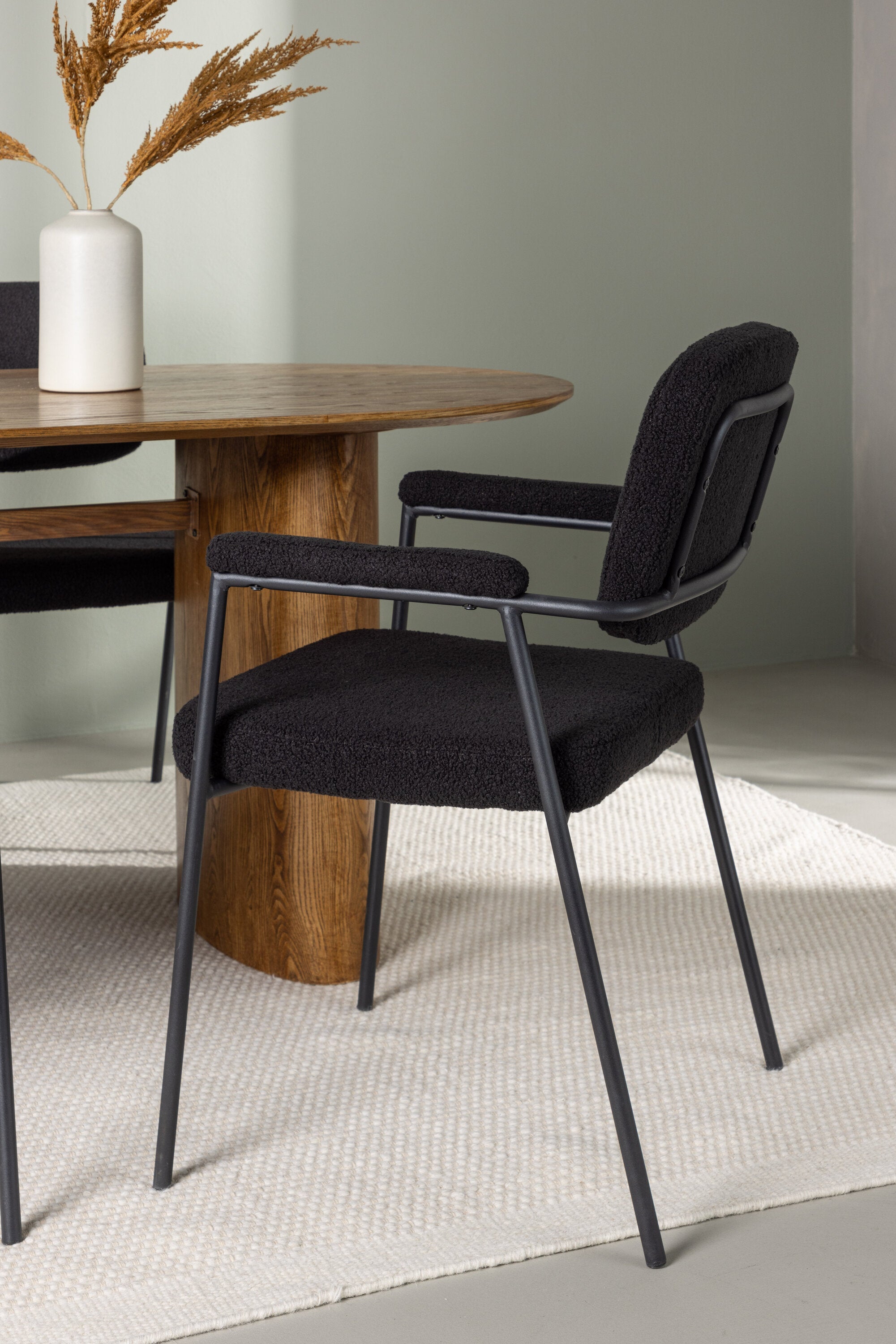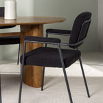 Doplňte tento fantastický jídelní stůl našimi černými jídelními židlemi ze série Yesterday. Černá bouclé tkanina židle dodává sofistikovaný nádech a je na pokožce úžasně měkká. S tenkými nohami židle a integrovanými černými kovovými područkami získáte nejen stylovou a moderní židli, ale také extra pohodlí.
