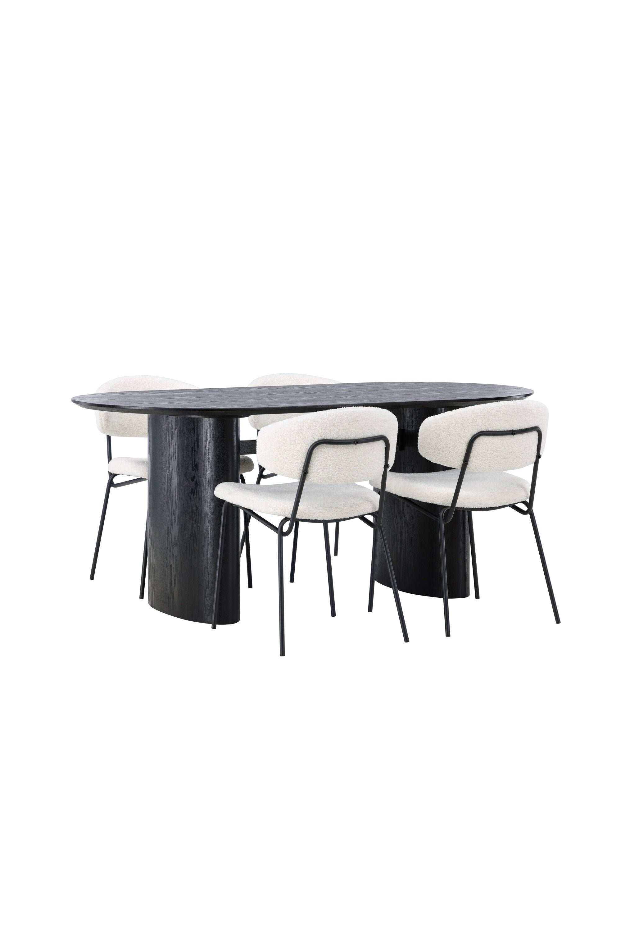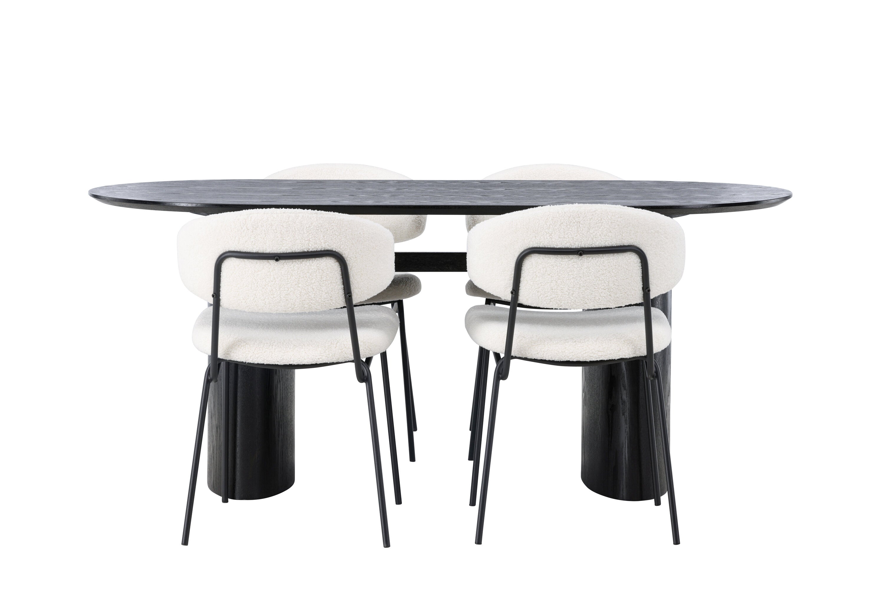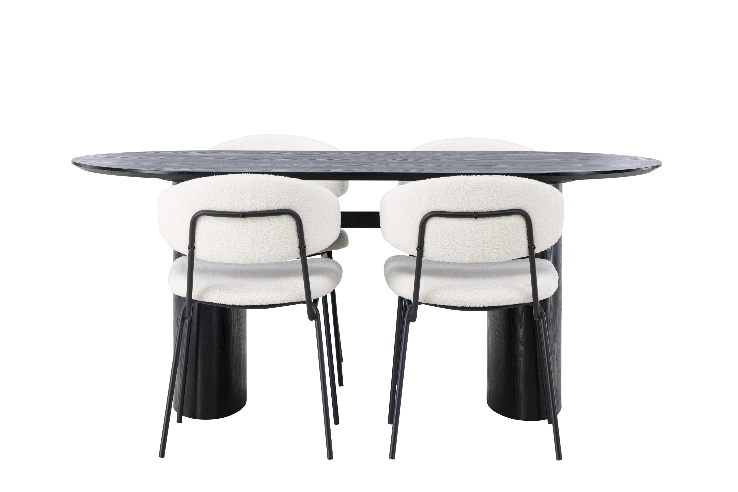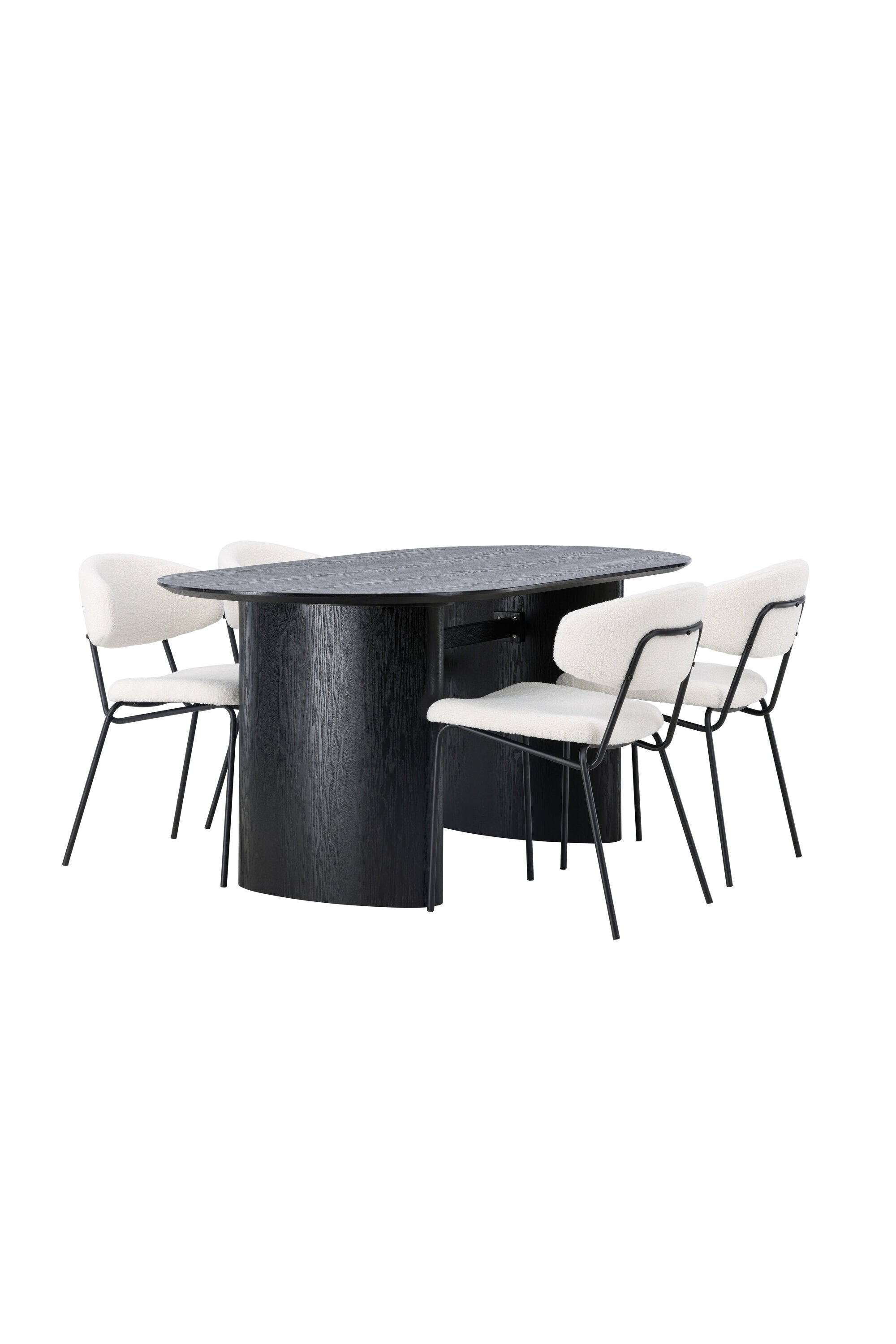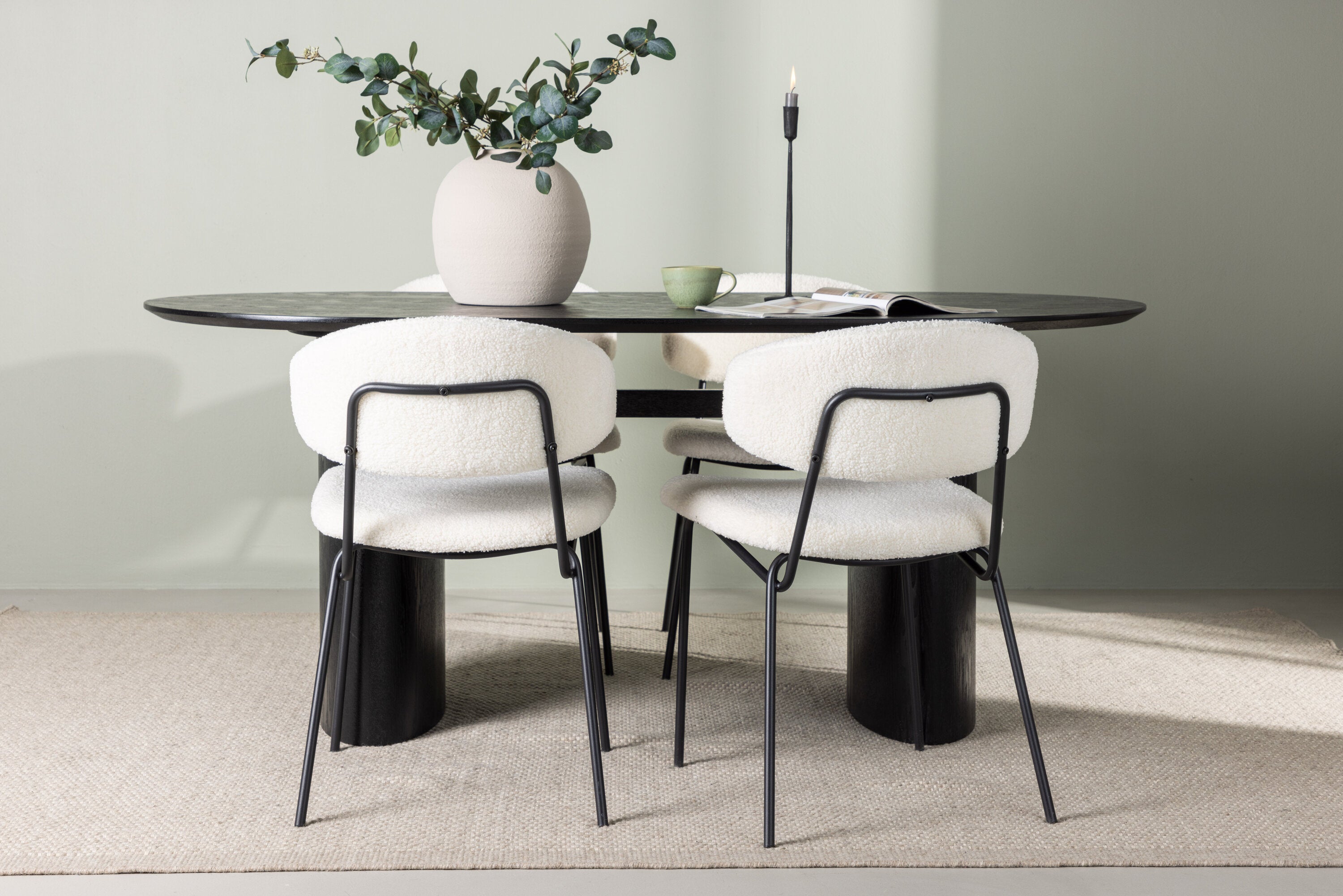 Vyzdobte obývací pokoj v moderních podobách! Oválný jídelní stůl Isolde v černé barvě má ​​moderní design s oválnou deskou stolu z MDF a robustním rámem, který působí stabilním dojmem. Živý materiál dává vkusný pohyb poutače. Zde ve stylové kombinaci s našimi bílými jídelními židlemi ze série Chico. Židle je vyrobena z bílého boucle látky s čalouněným sedákem a opěradlem pro větší pohodlí. Nohy jsou úzké z černé oceli, což dodává židli vzdušný pocit. Vytvořte příjemnou atmosféru! Rozměry stolu: 180x75cm.