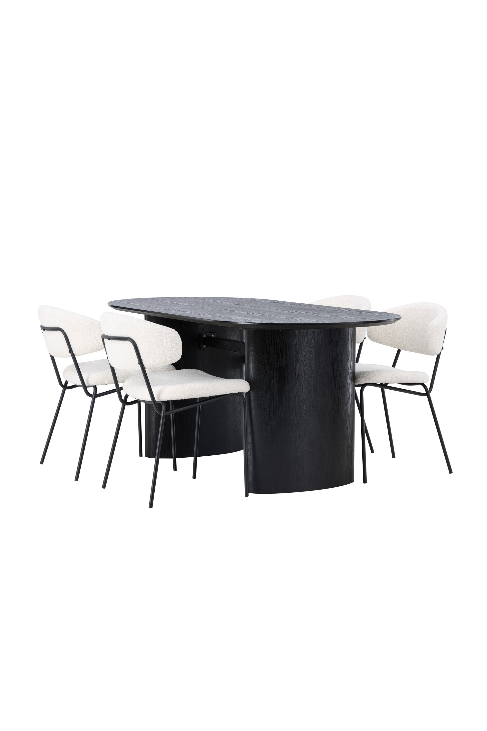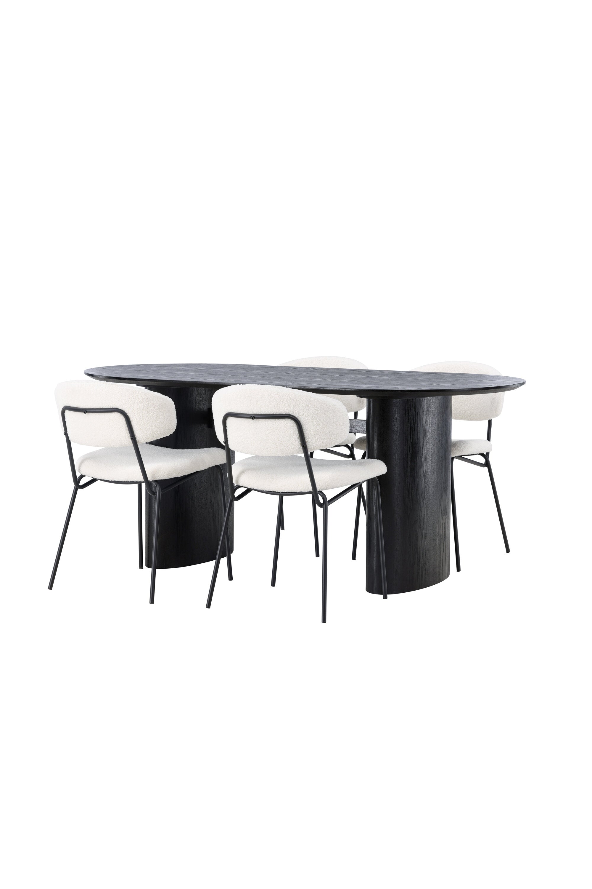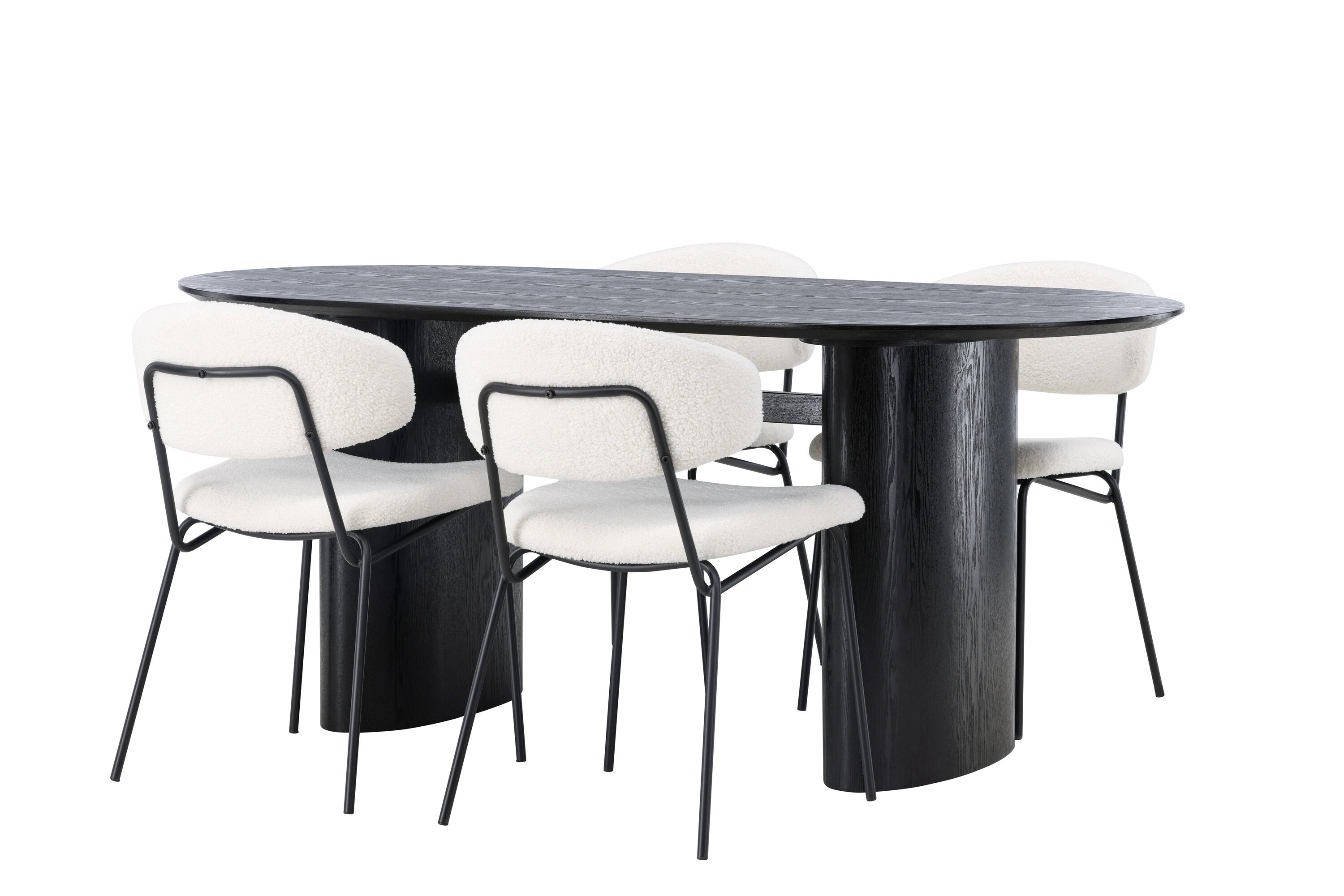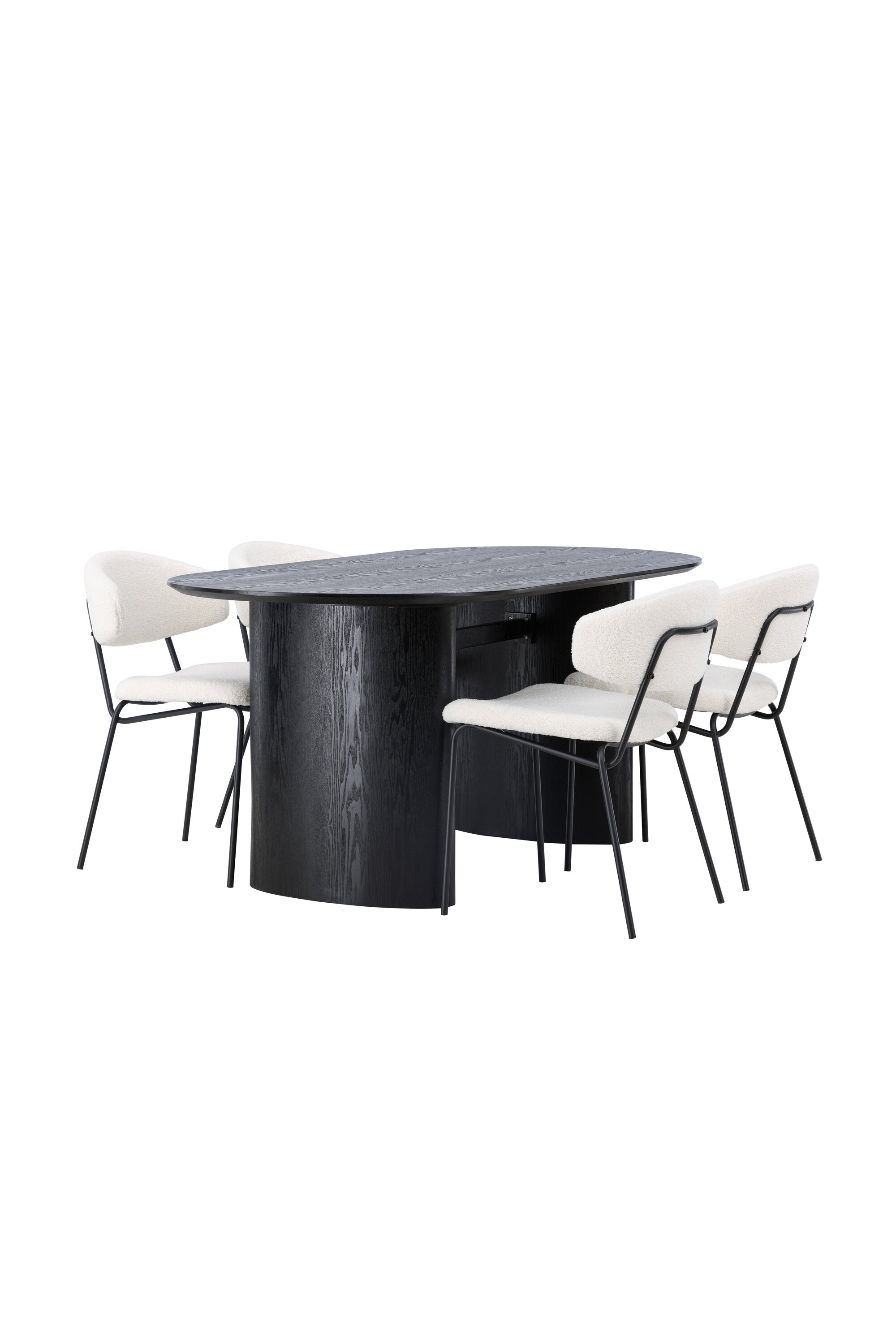 Vyzdobte obývací pokoj v moderních podobách! Oválný jídelní stůl Isolde v černé barvě má ​​moderní design s oválnou deskou stolu z MDF a robustním rámem, který působí stabilním dojmem. Živý materiál dává vkusný pohyb poutače. Zde ve stylové kombinaci s našimi bílými jídelními židlemi ze série Chico. Židle je vyrobena z bílého boucle látky s čalouněným sedákem a opěradlem pro větší pohodlí. Nohy jsou úzké z černé oceli, což dodává židli vzdušný pocit. Vytvořte příjemnou atmosféru! Rozměry stolu: 180x75cm.