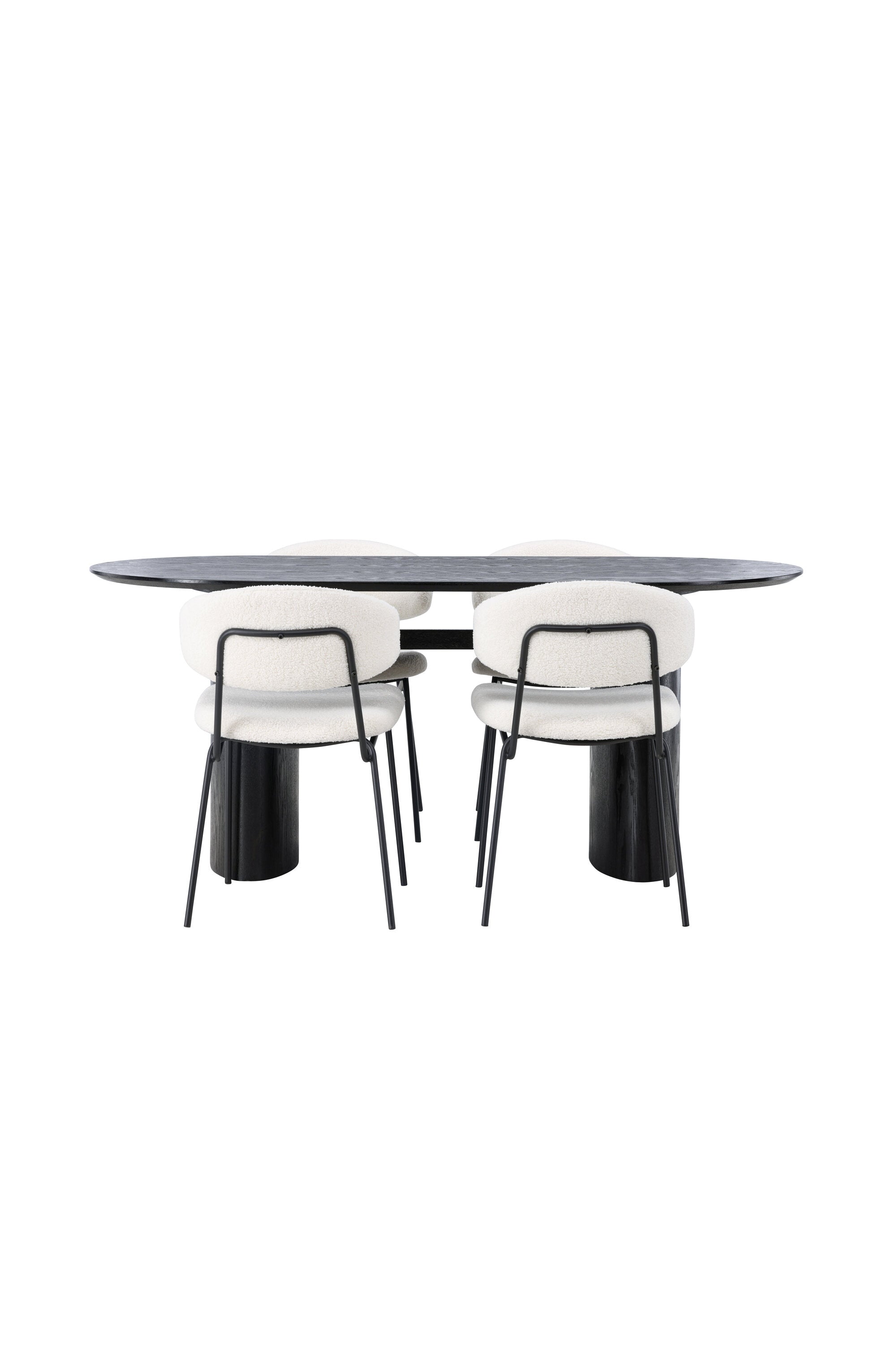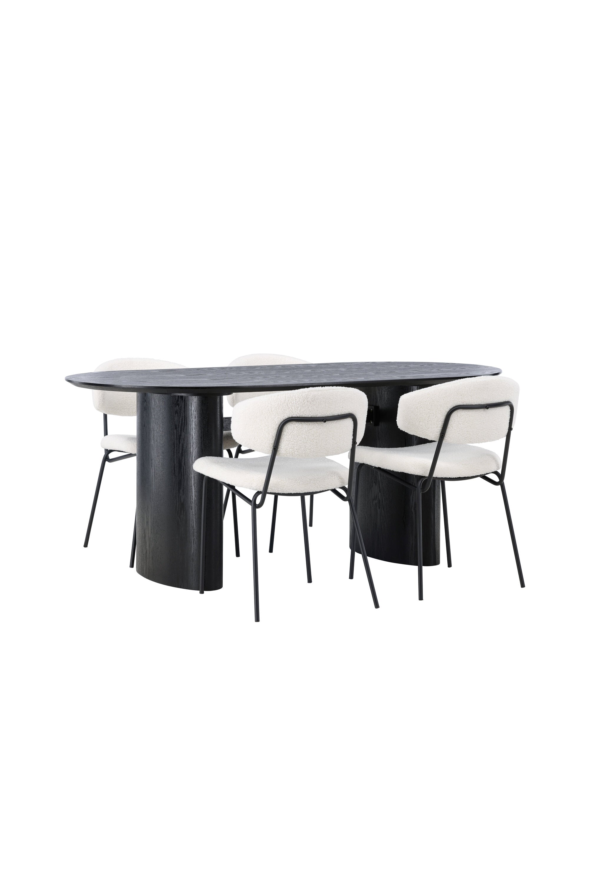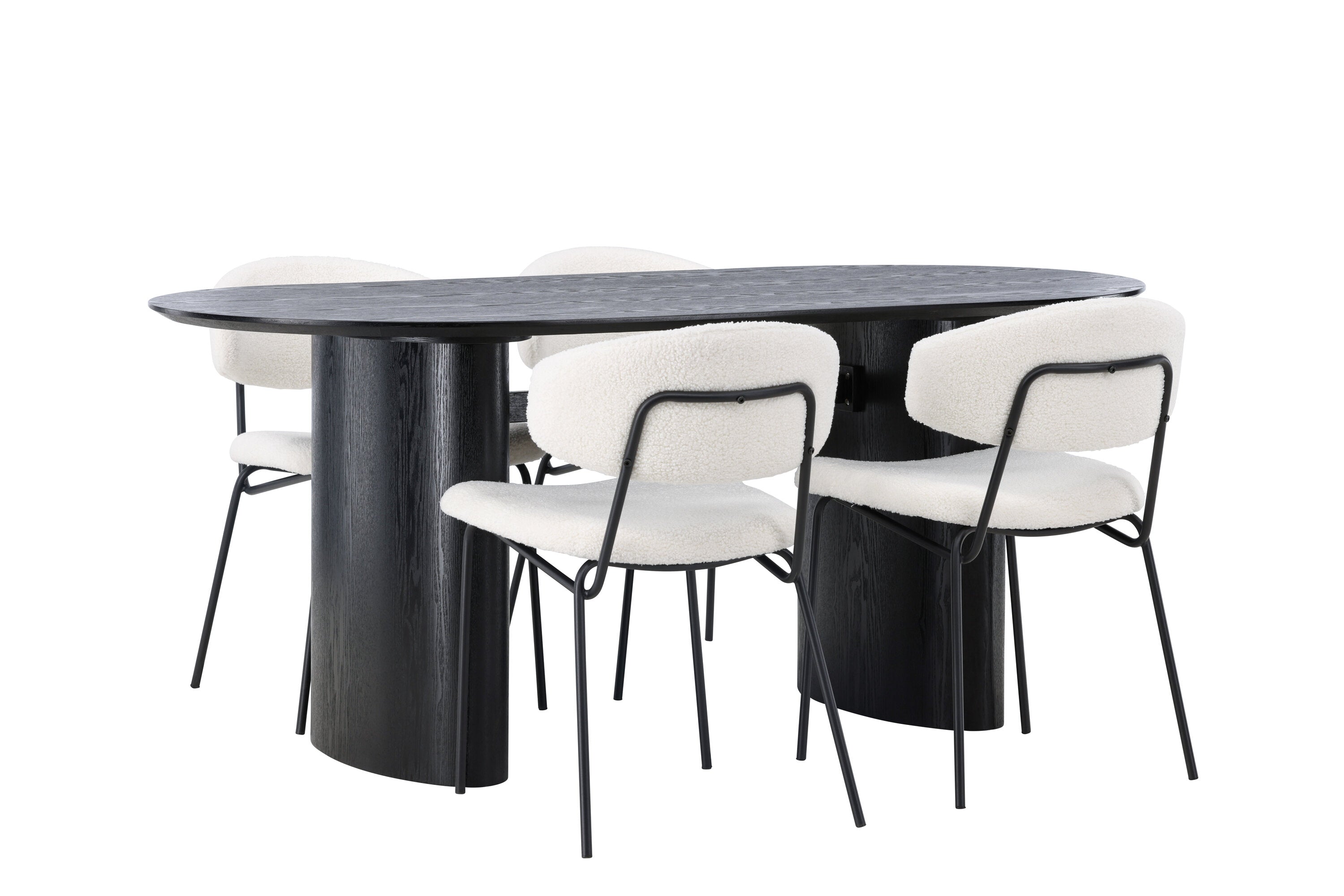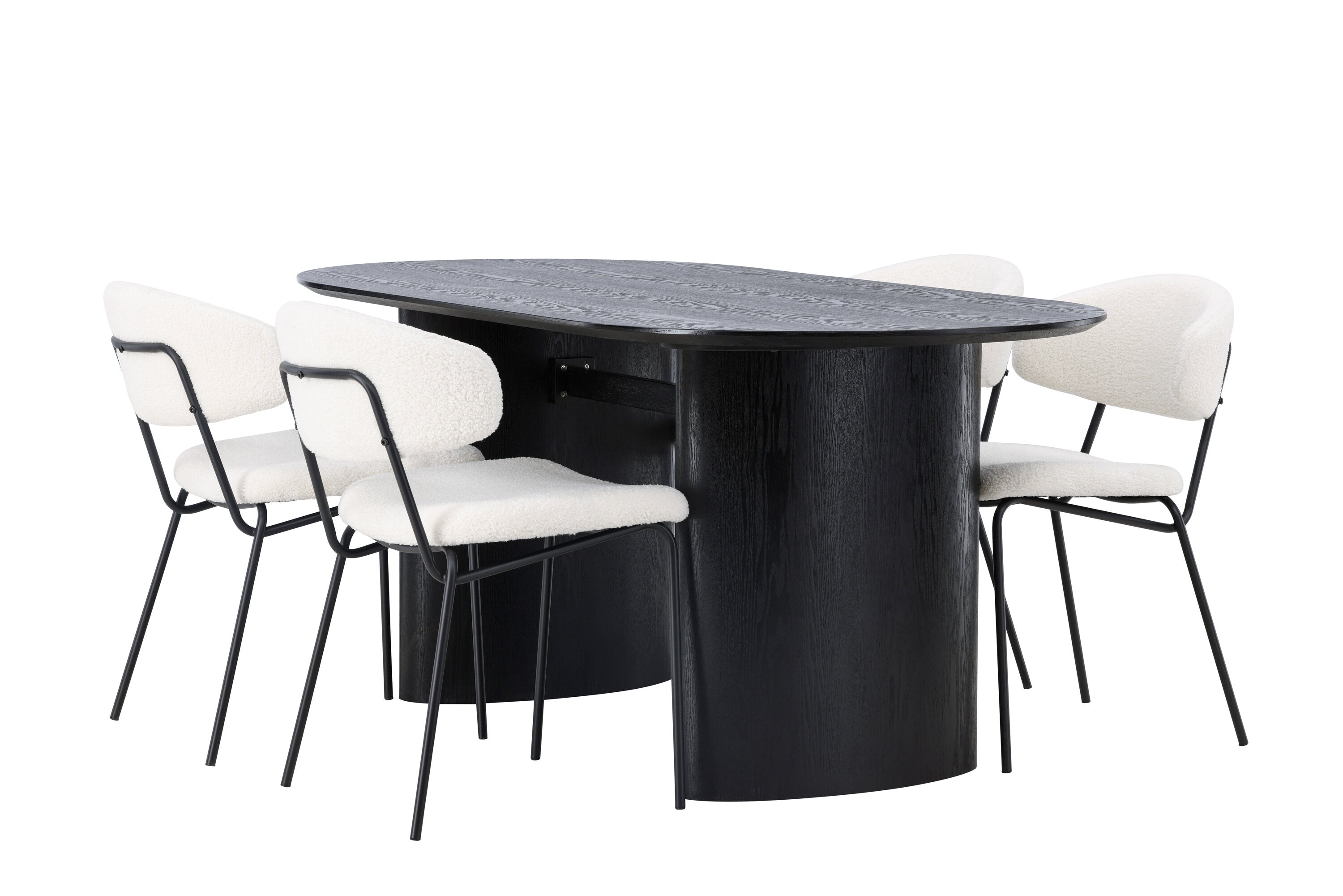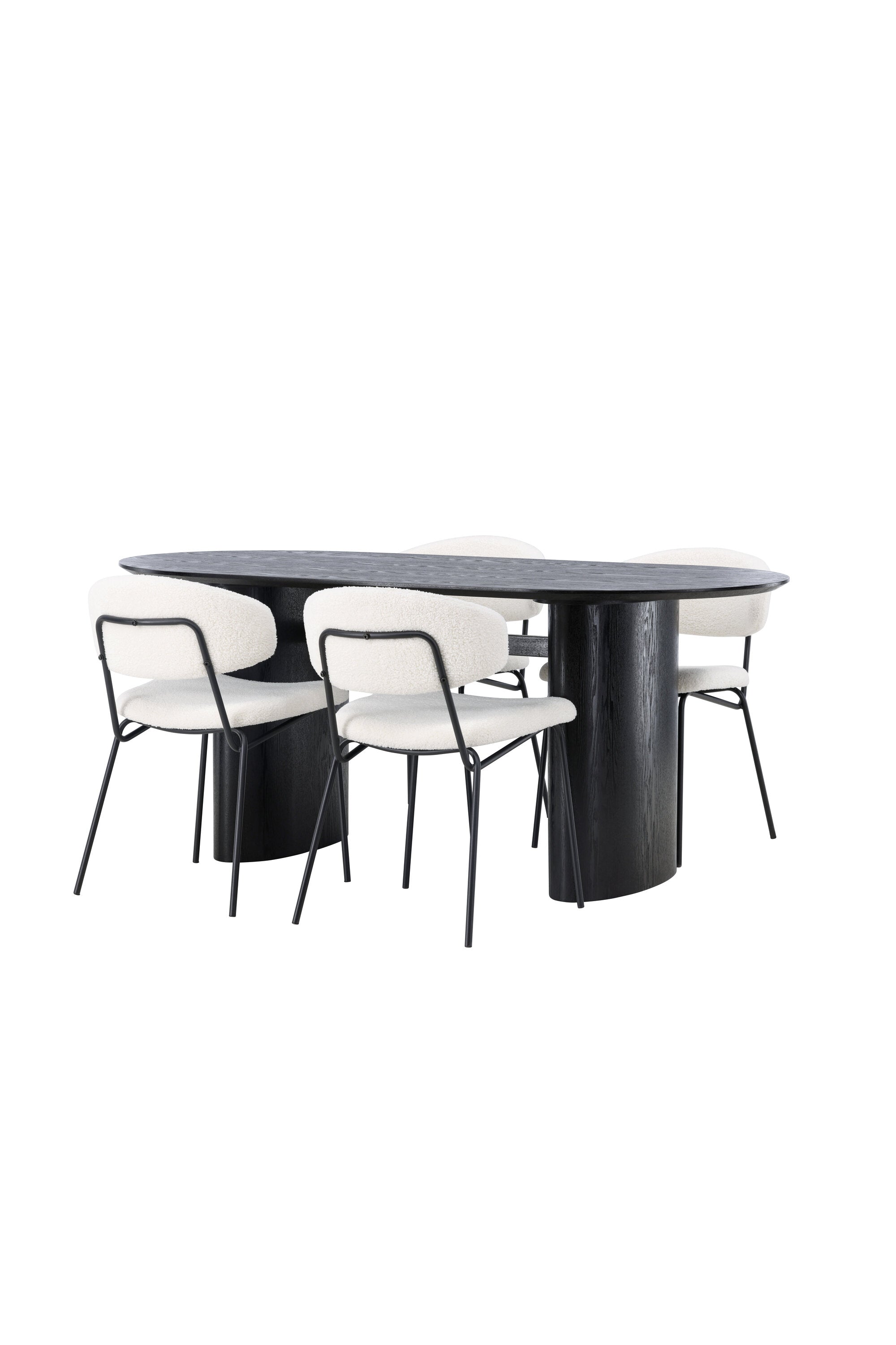 Vyzdobte obývací pokoj v moderních podobách! Oválný jídelní stůl Isolde v černé barvě má ​​moderní design s oválnou deskou stolu z MDF a robustním rámem, který působí stabilním dojmem. Živý materiál dává vkusný pohyb poutače. Zde ve stylové kombinaci s našimi bílými jídelními židlemi ze série Chico. Židle je vyrobena z bílého boucle látky s čalouněným sedákem a opěradlem pro větší pohodlí. Nohy jsou úzké z černé oceli, což dodává židli vzdušný pocit. Vytvořte příjemnou atmosféru! Rozměry stolu: 180x75cm.