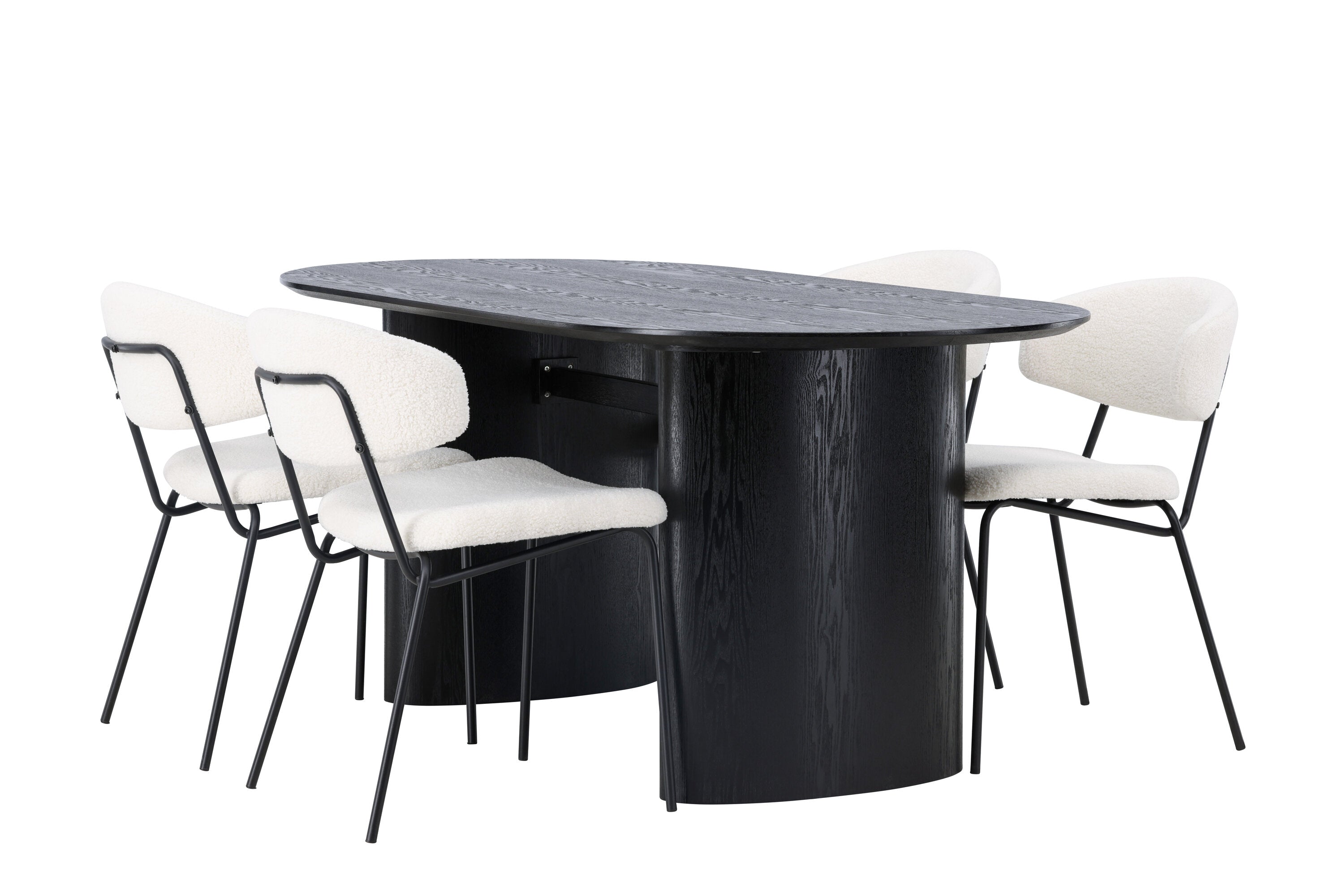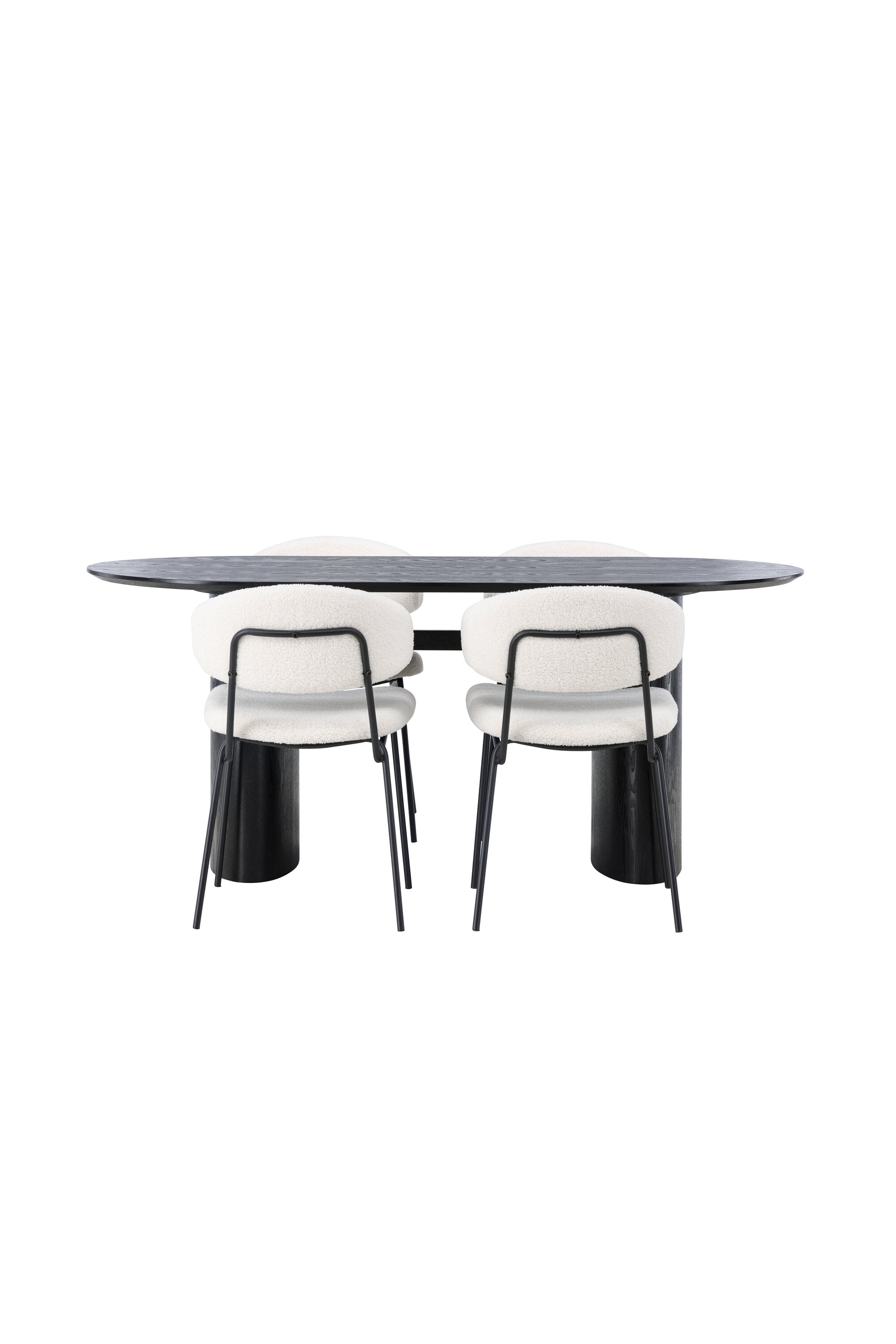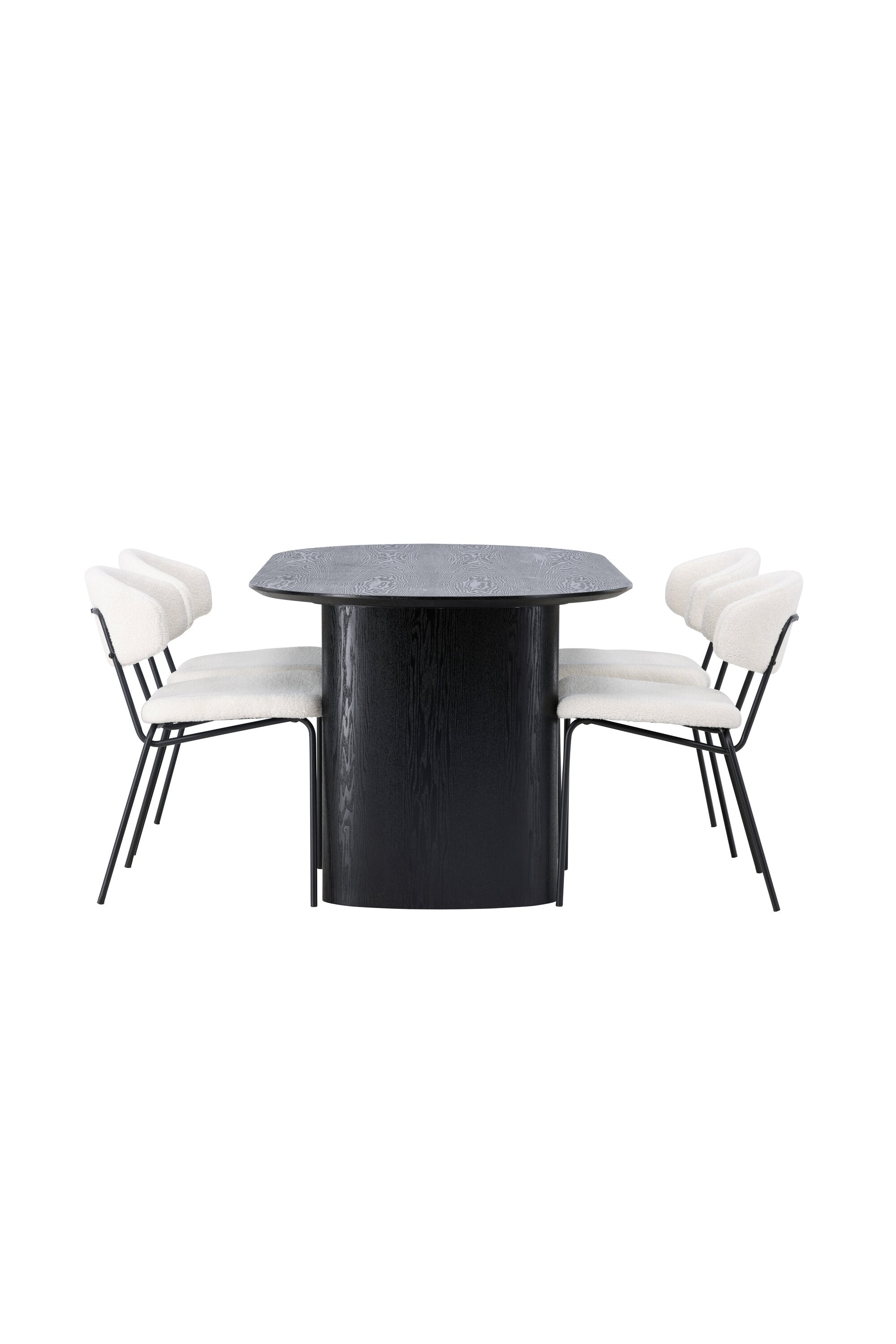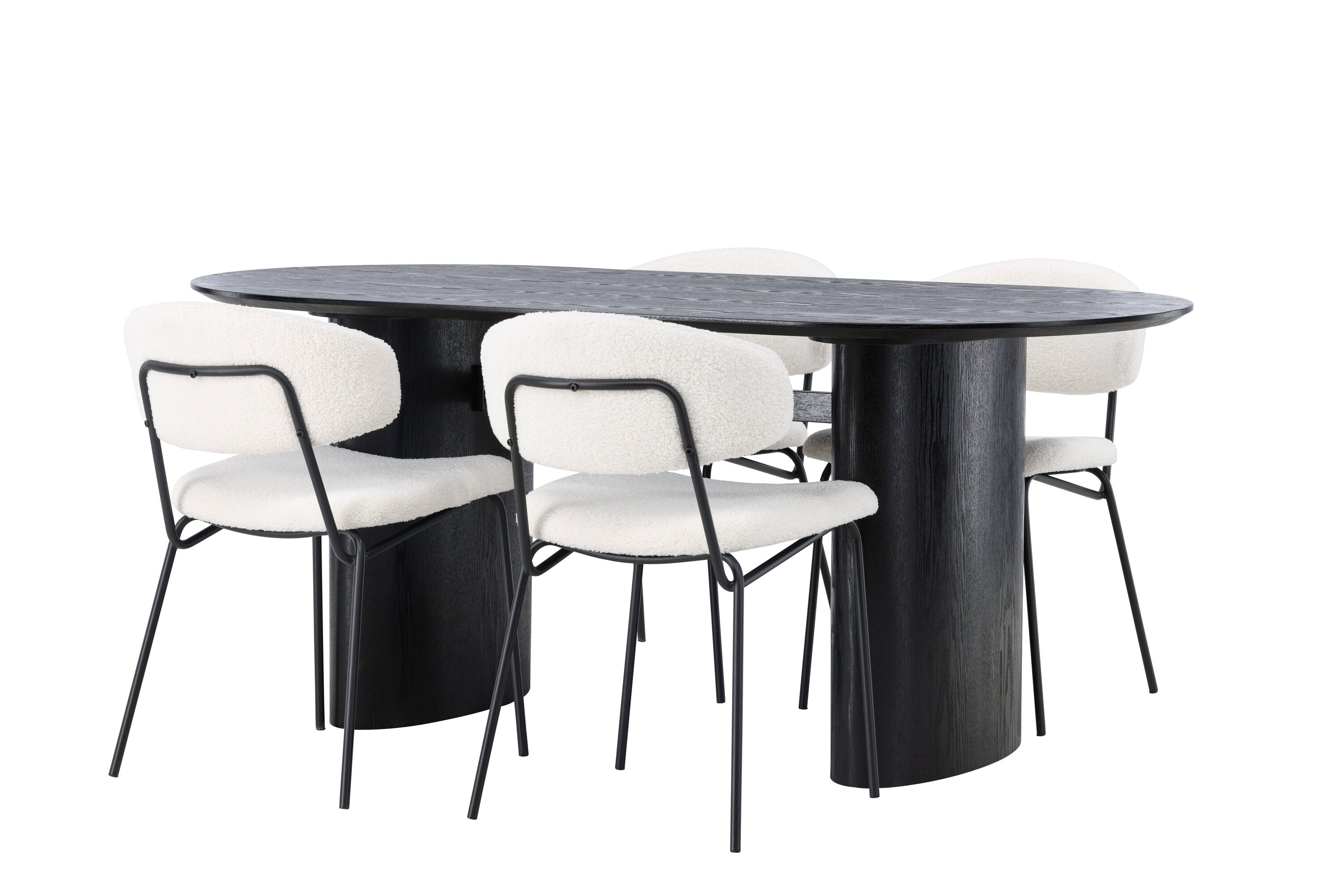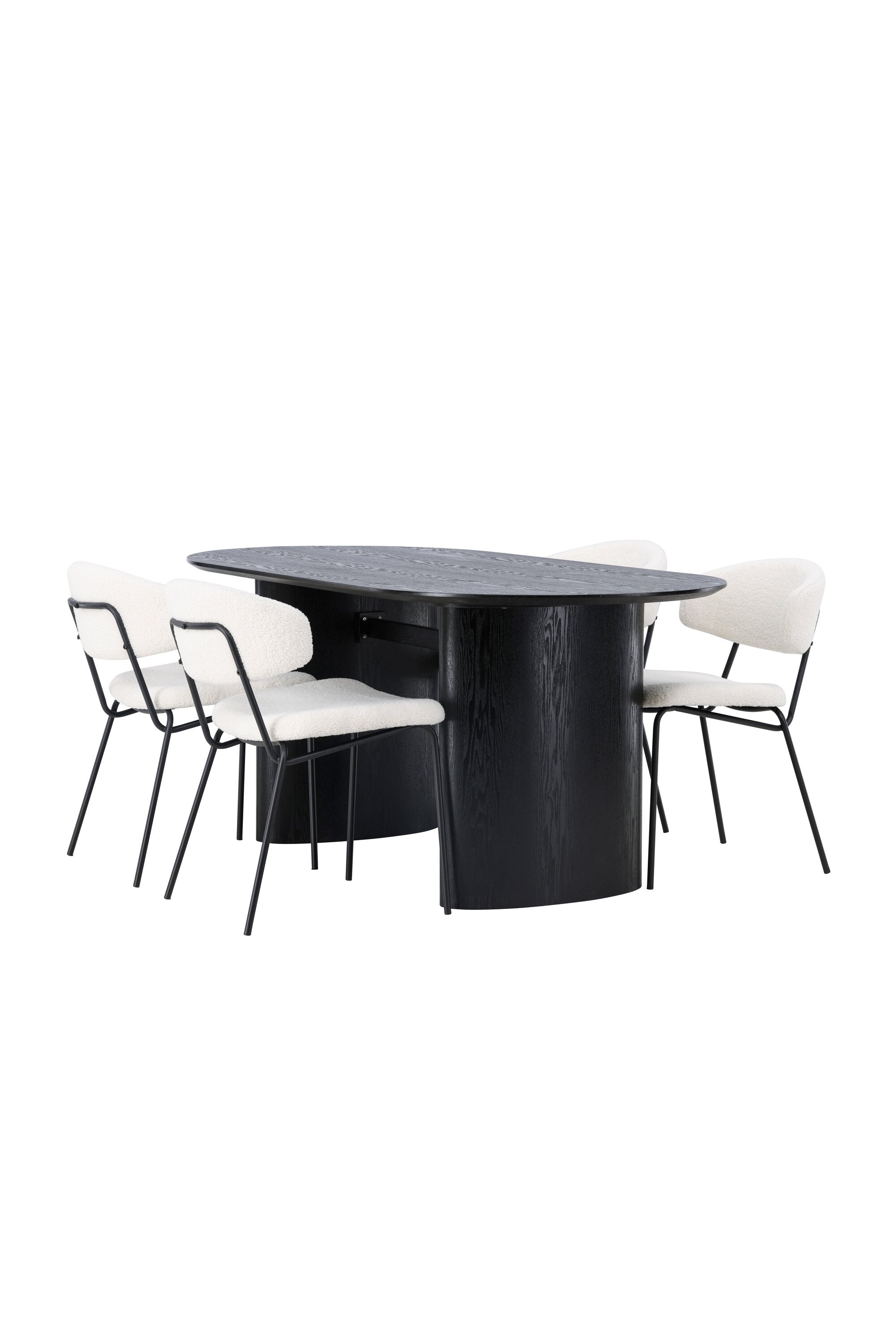 Vyzdobte obývací pokoj v moderních podobách! Oválný jídelní stůl Isolde v černé barvě má ​​moderní design s oválnou deskou stolu z MDF a robustním rámem, který působí stabilním dojmem. Živý materiál dává vkusný pohyb poutače. Zde ve stylové kombinaci s našimi bílými jídelními židlemi ze série Chico. Židle je vyrobena z bílého boucle látky s čalouněným sedákem a opěradlem pro větší pohodlí. Nohy jsou úzké z černé oceli, což dodává židli vzdušný pocit. Vytvořte příjemnou atmosféru! Rozměry stolu: 180x75cm.
