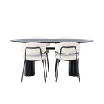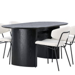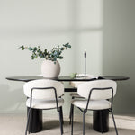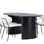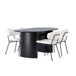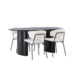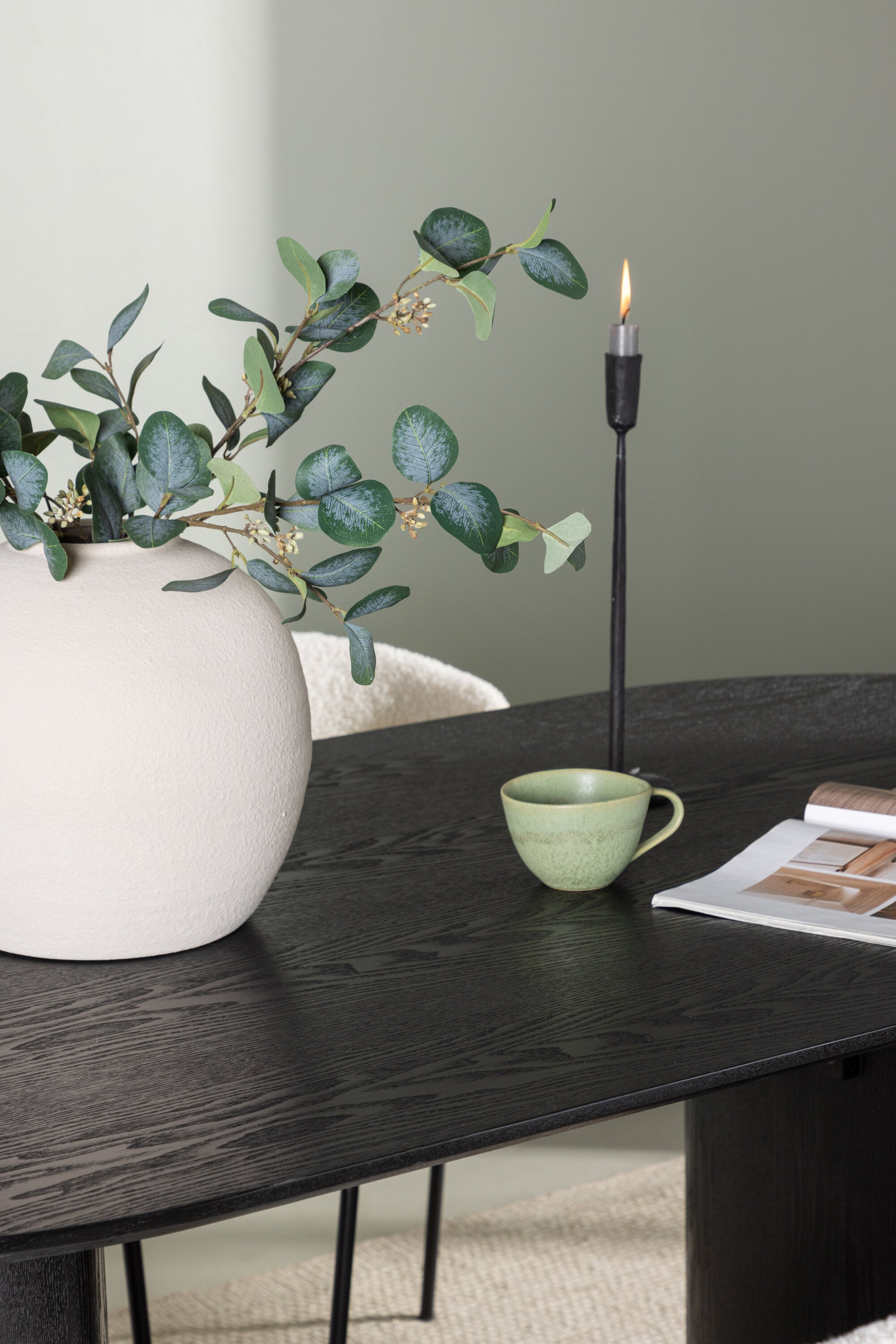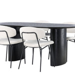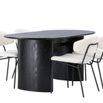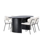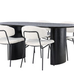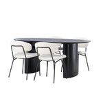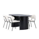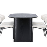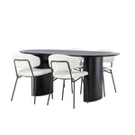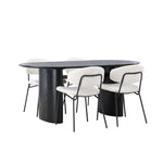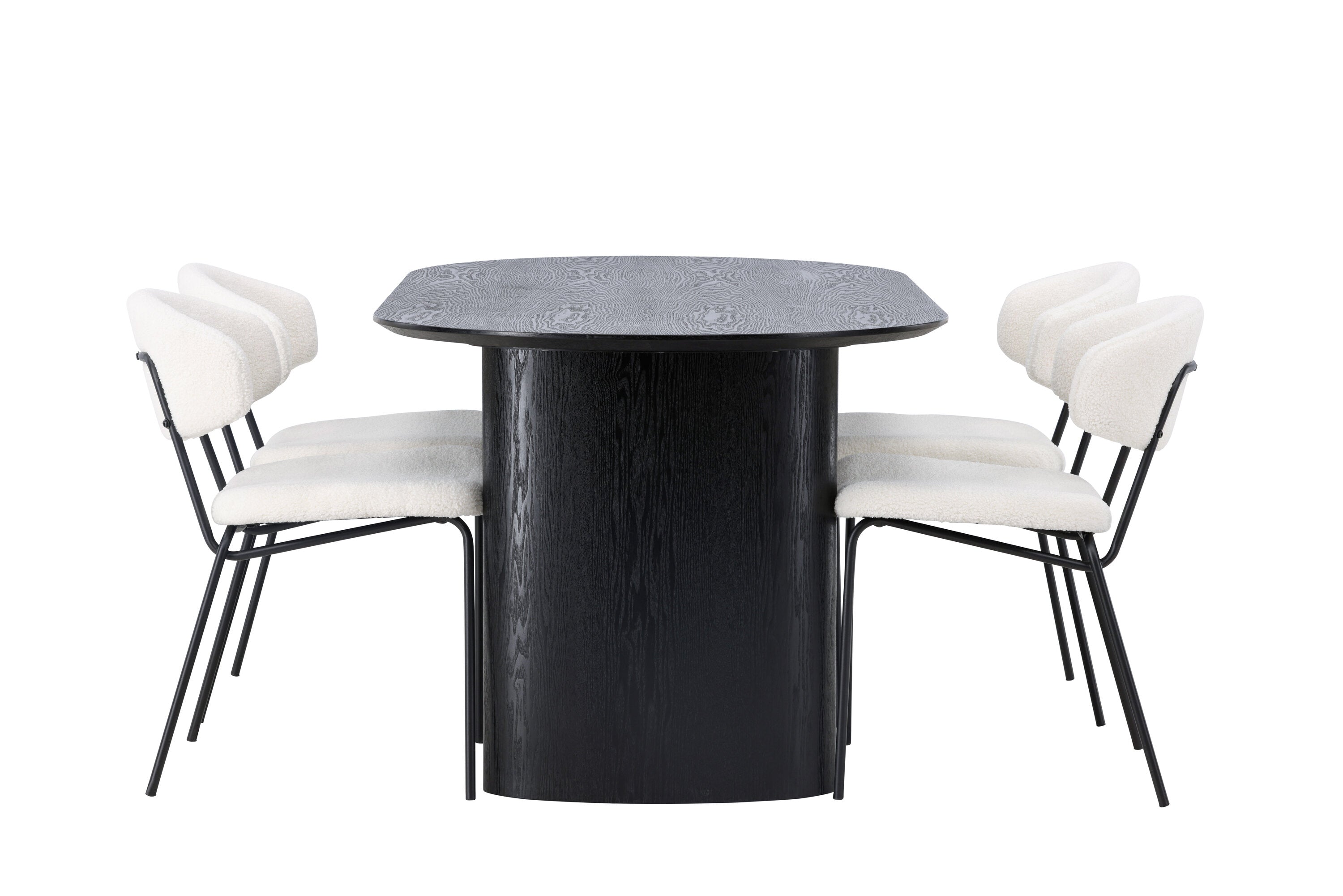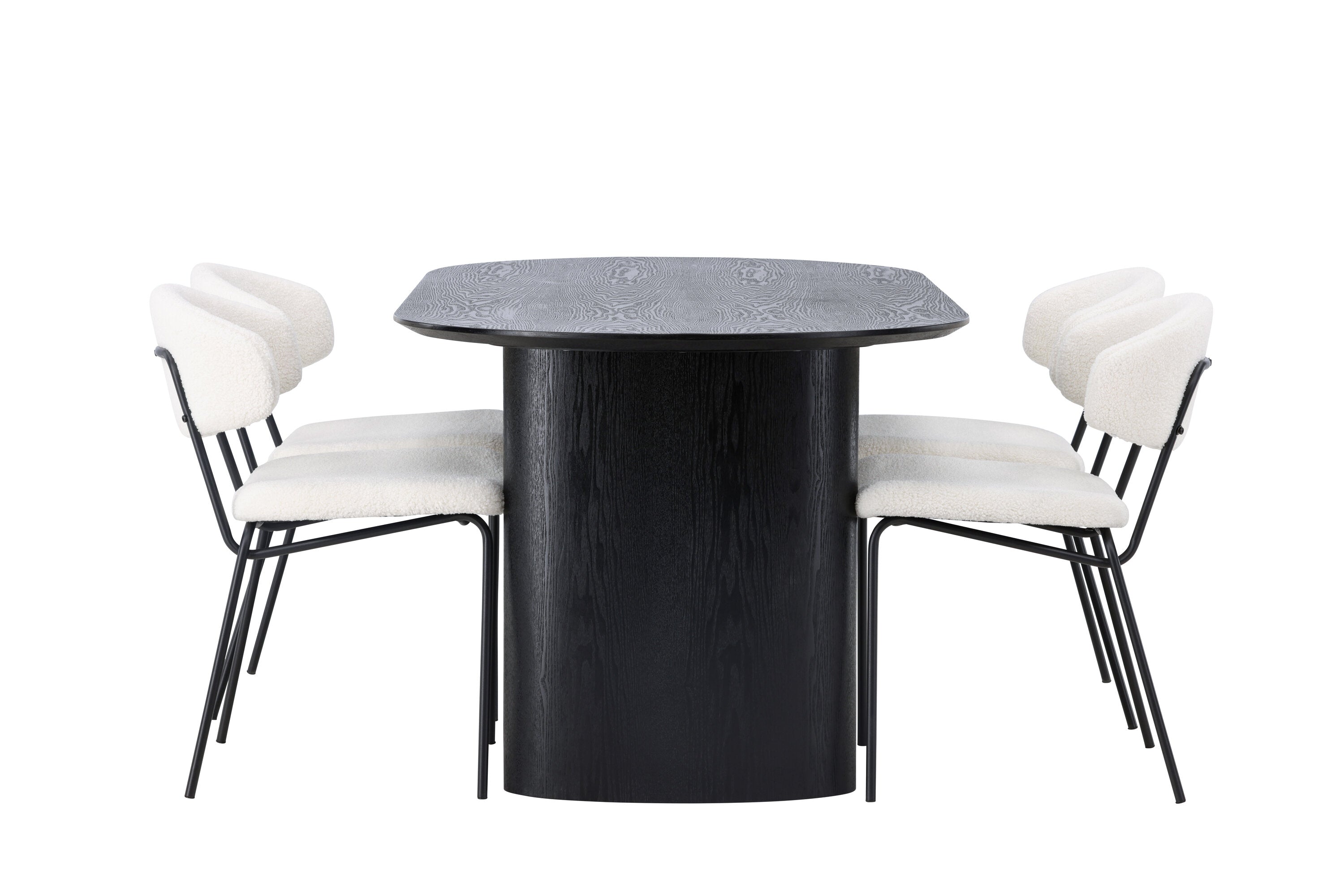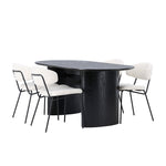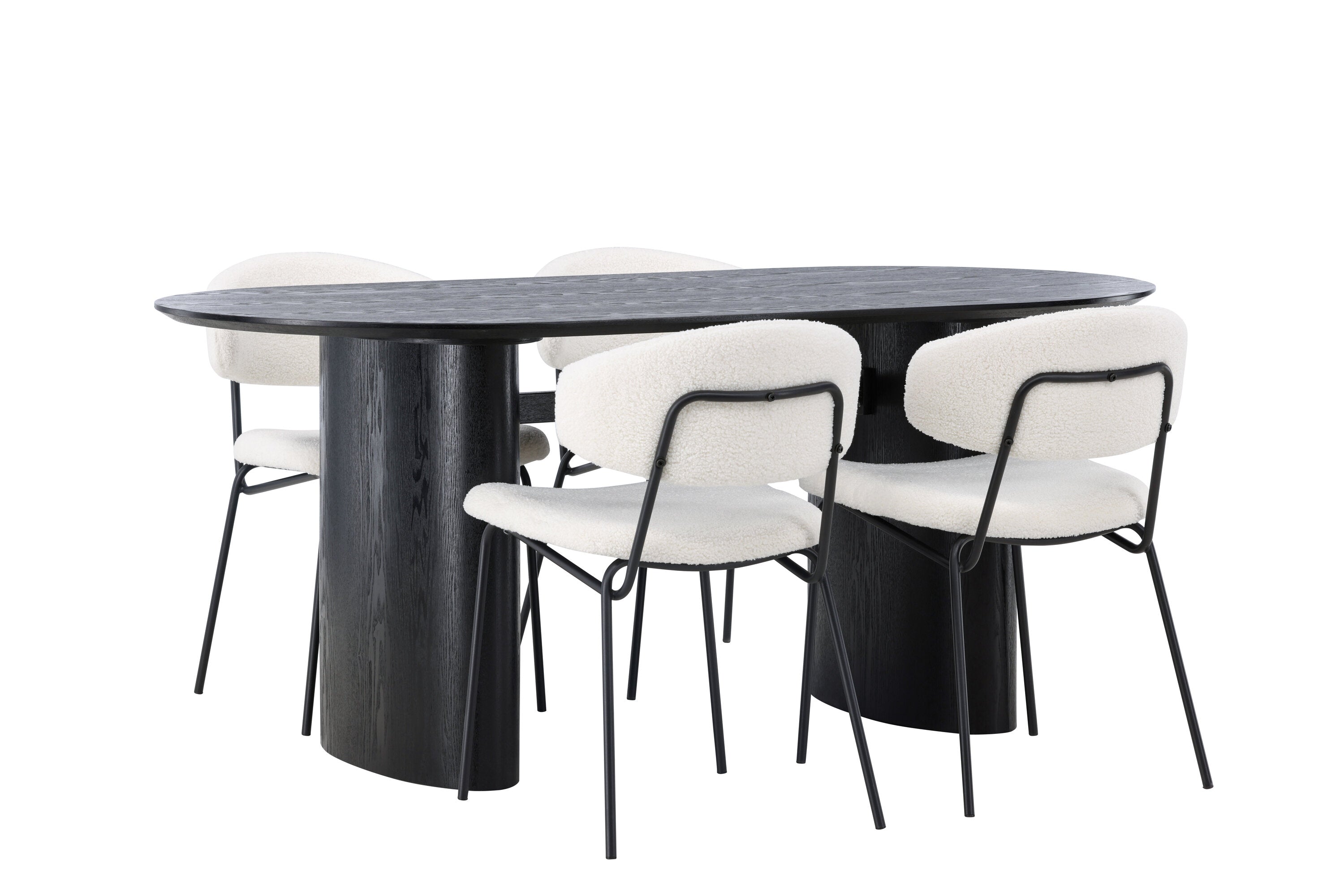 Vyzdobte obývací pokoj v moderních podobách! Oválný jídelní stůl Isolde v černé barvě má ​​moderní design s oválnou deskou stolu z MDF a robustním rámem, který působí stabilním dojmem. Živý materiál dává vkusný pohyb poutače. Zde ve stylové kombinaci s našimi bílými jídelními židlemi ze série Chico. Židle je vyrobena z bílého boucle látky s čalouněným sedákem a opěradlem pro větší pohodlí. Nohy jsou úzké z černé oceli, což dodává židli vzdušný pocit. Vytvořte příjemnou atmosféru! Rozměry stolu: 180x75cm.