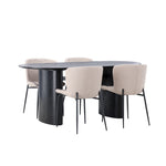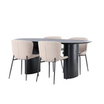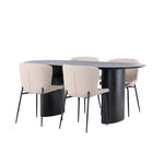 Pohodlně se usaďte a zařiďte moderně! Oválný jídelní stůl Isolde v černé barvě má ​​moderní design s oválnou deskou stolu z MDF a robustním rámem, který působí stabilním dojmem. Živý materiál dává poutače krásný pohyb. Zde společně s módními jídelními židlemi ze série Modesto. Židle je celočalouněná béžovou huňatou látkou se stylovými úzkými nohami v černém kovu. Mírně zaoblená záda a čalouněný sedák poskytují extra pohodlí a rozšiřují příjemné jídlo kolem jídelního stolu. Rozměry stolu: 180x75cm.