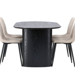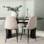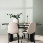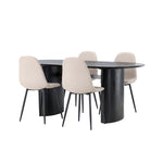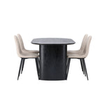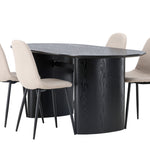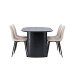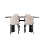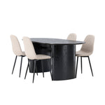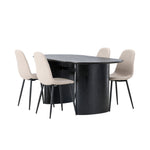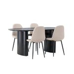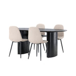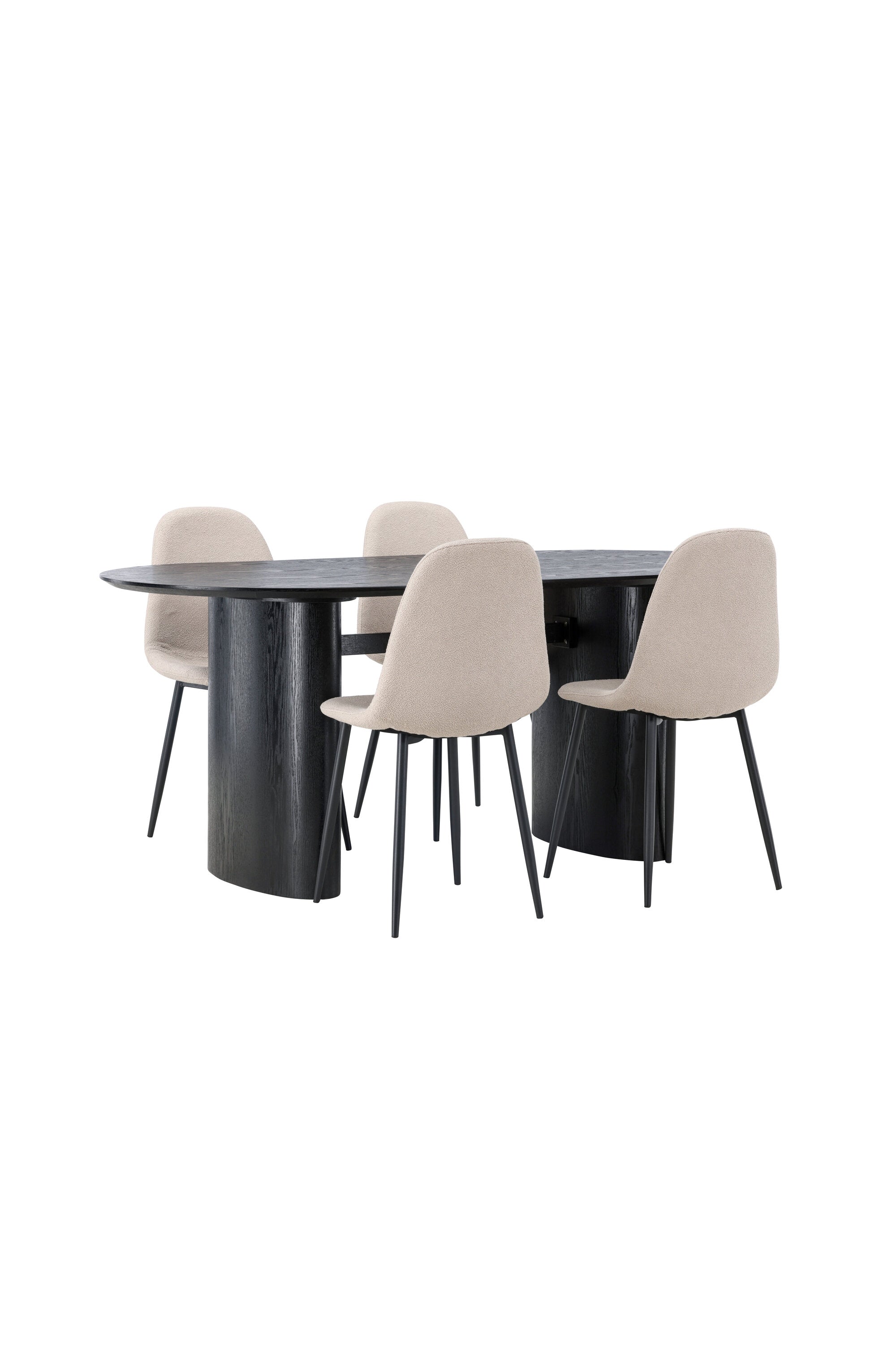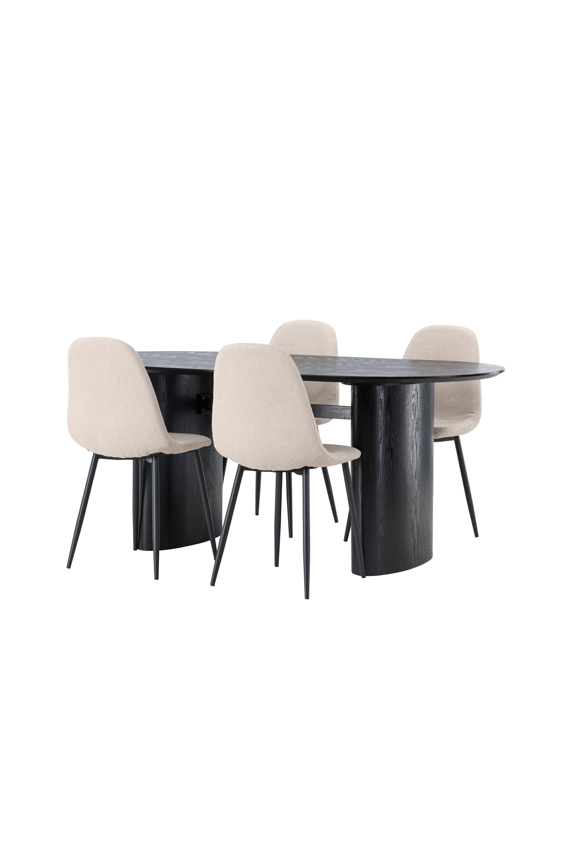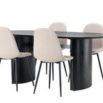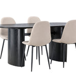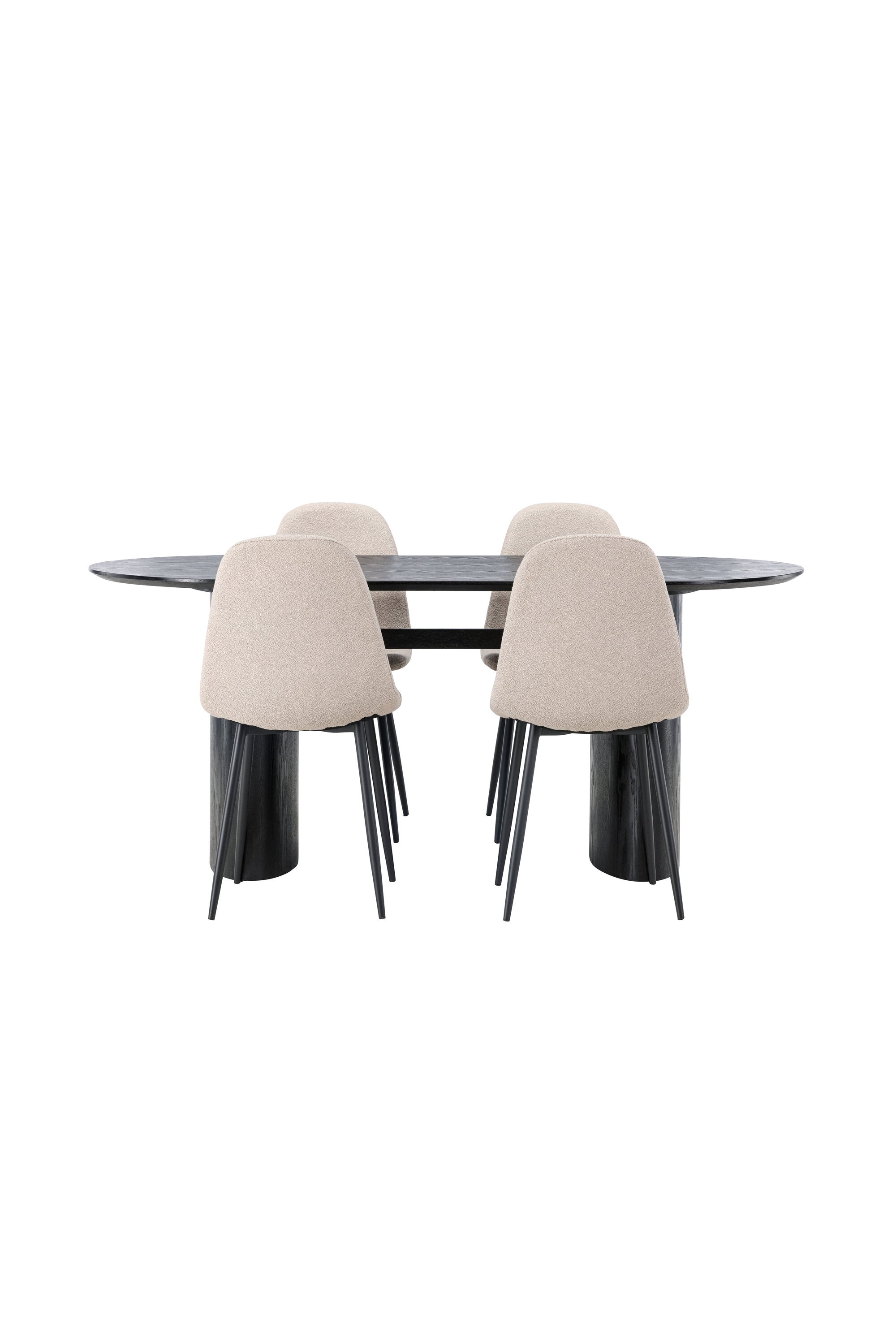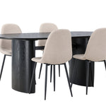 Trendová jídelní sestava s odolnými materiály! Oválný jídelní stůl Isolde v černé barvě má ​​moderní design s oválnou deskou stolu z MDF a robustním rámem, který působí stabilním dojmem. Živý materiál dává poutače krásný pohyb. Zde v moderní kombinaci s béžovými jídelními židlemi ze série Polar. Židle má celočalouněný design, nohy z kovu s černým práškovým nástřikem a zaoblené opěradlo a sedák z béžové boucle látky s měkkým polstrováním. Zde můžete pohodlně sedět po dlouhou dobu! Rozměry stolu: 180x75cm.