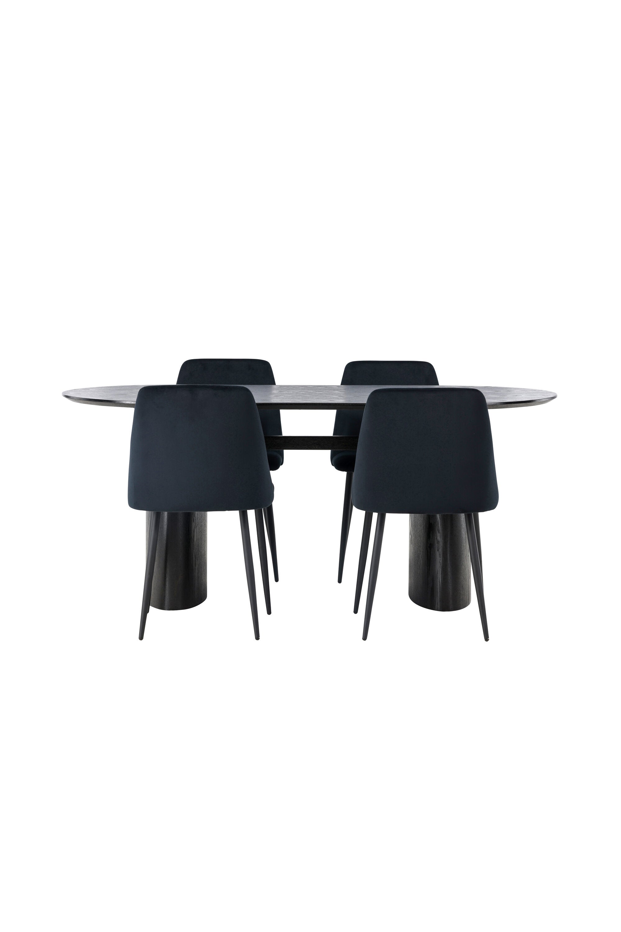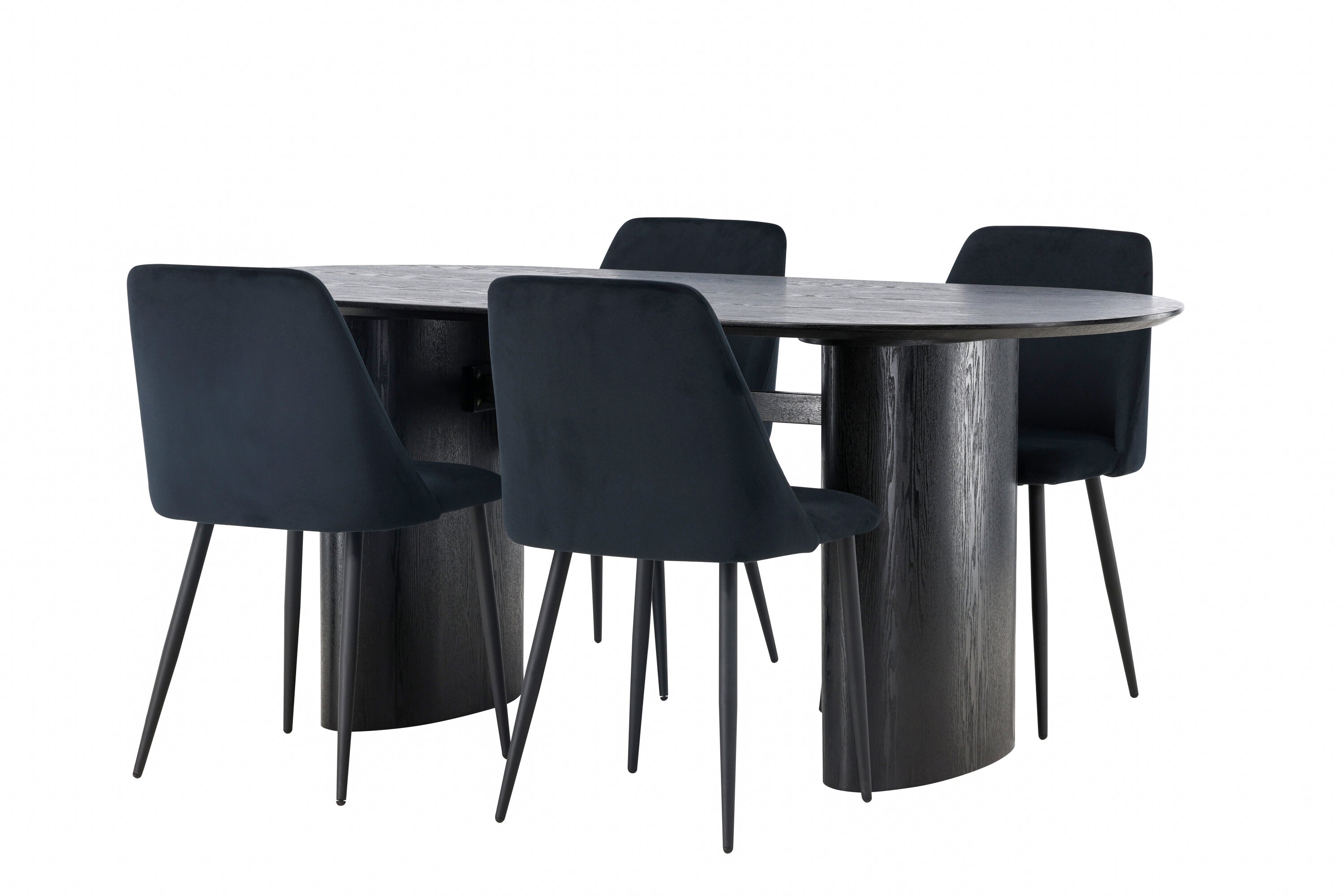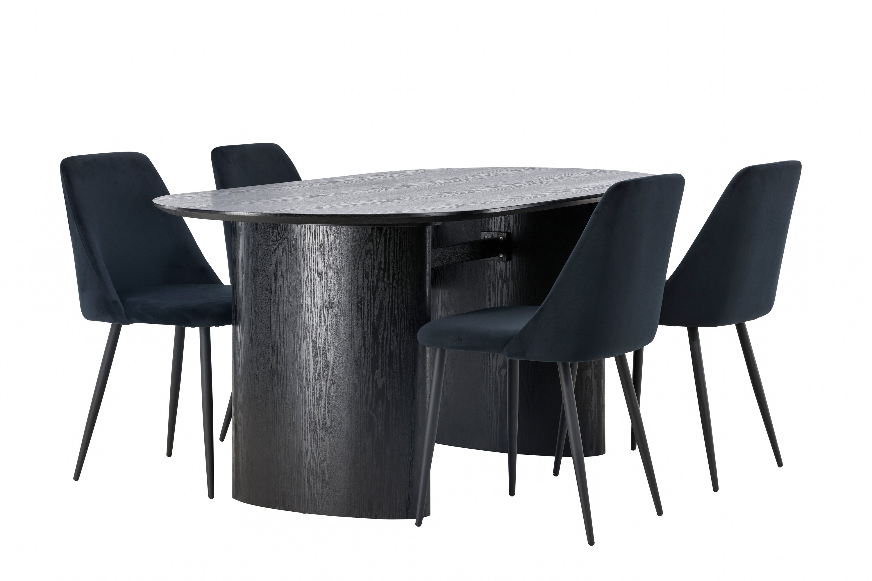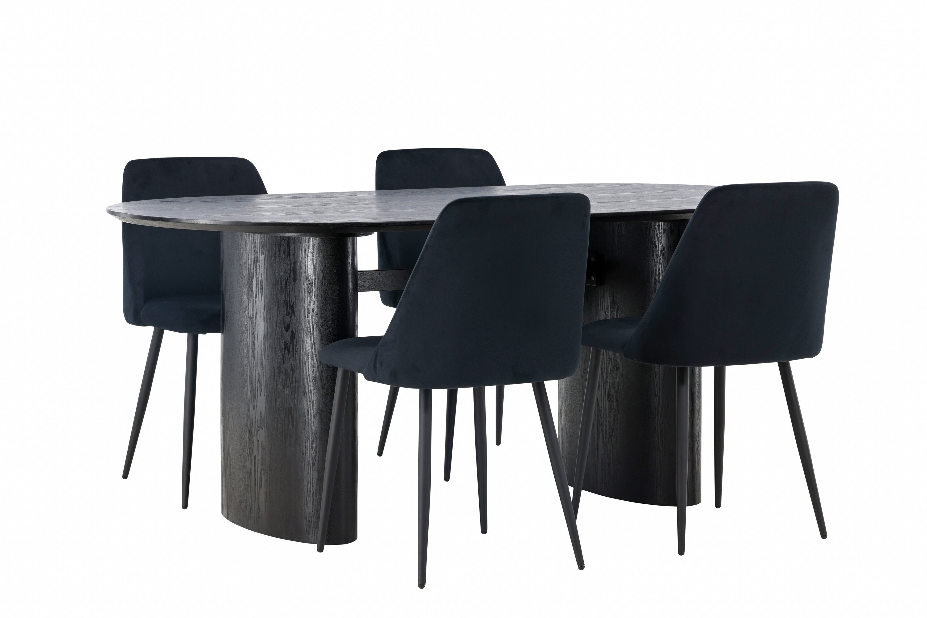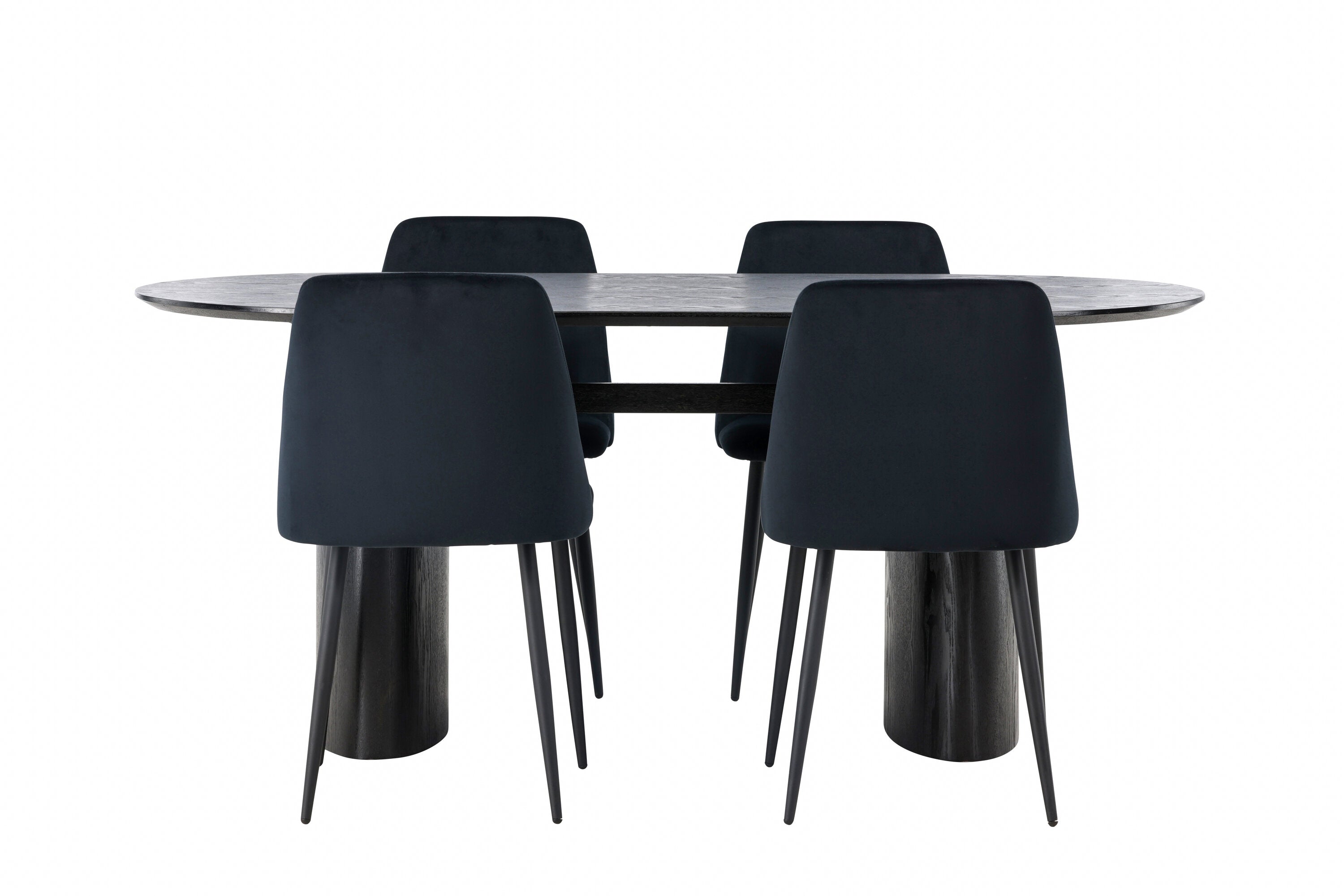 Vyzdobte obývací pokoj luxusně a pohodlně! Oválný jídelní stůl Isolde v černé barvě má ​​moderní design s oválnou deskou stolu z MDF a robustním rámem, který působí stabilním dojmem. Živý materiál dává poutače krásný pohyb. Zde v dokonalé kombinaci s černými jídelními židlemi ze série Night. Židle má celočalouněný sedák v černé sametové látce a nohy v odpovídající černé barvě. Jednoduše, neuvěřitelná kombinace! Rozměry stolu: 180x75cm.