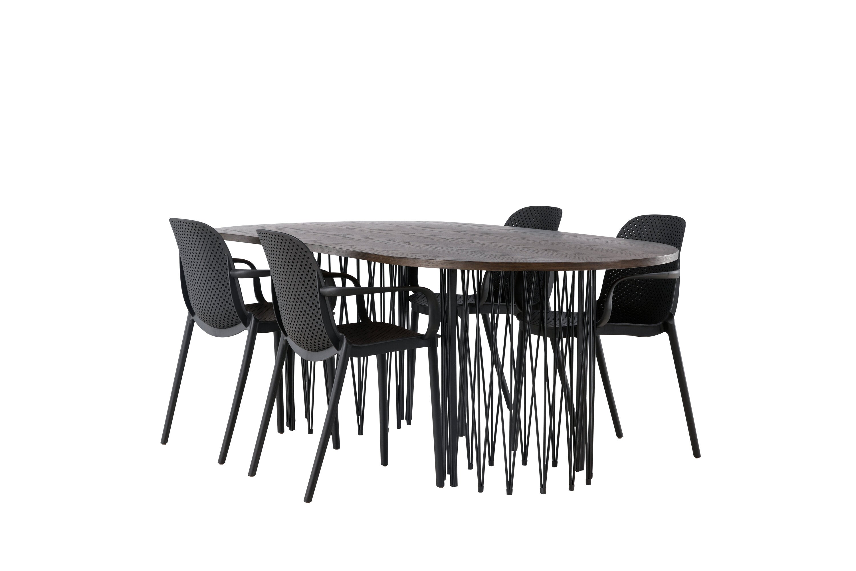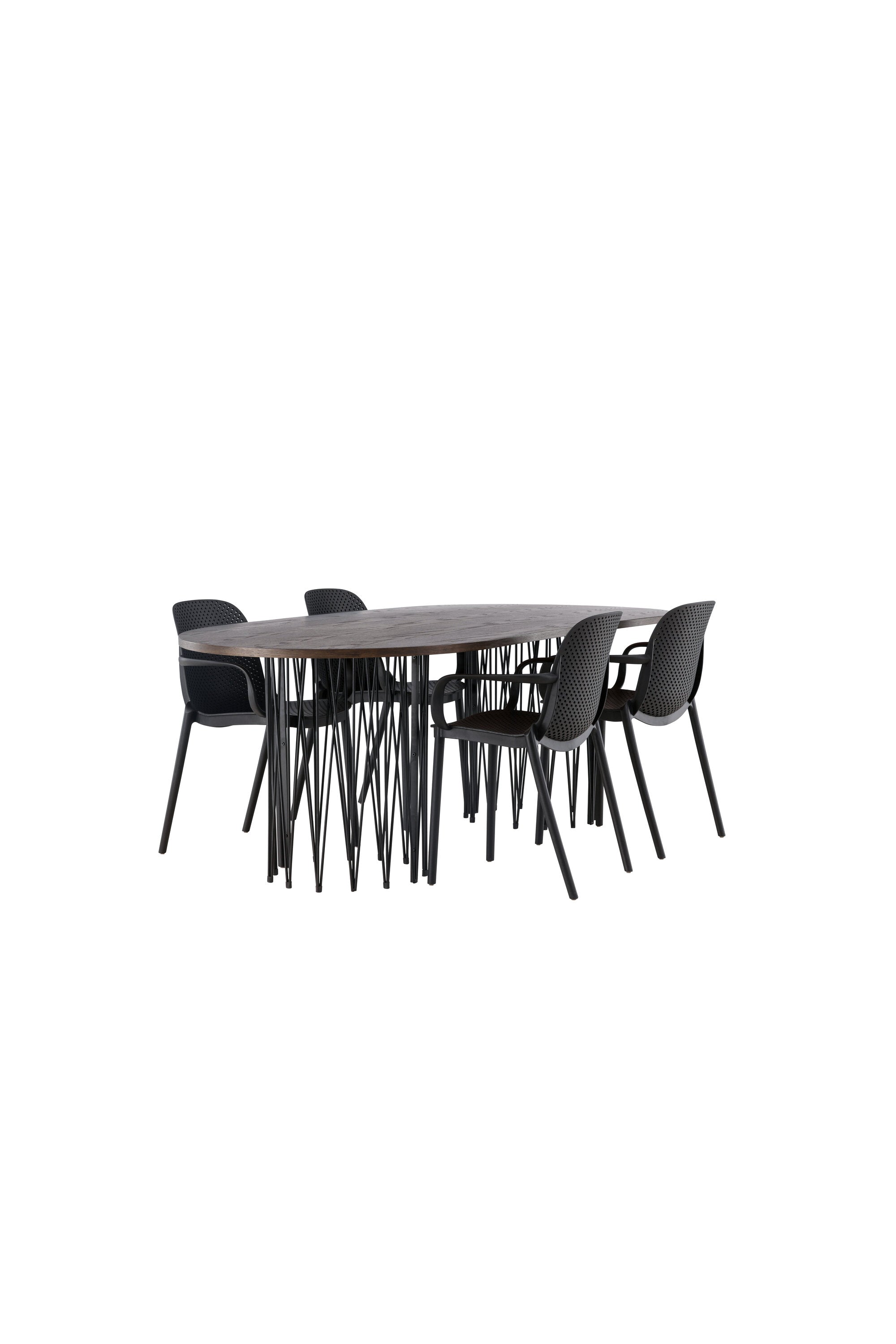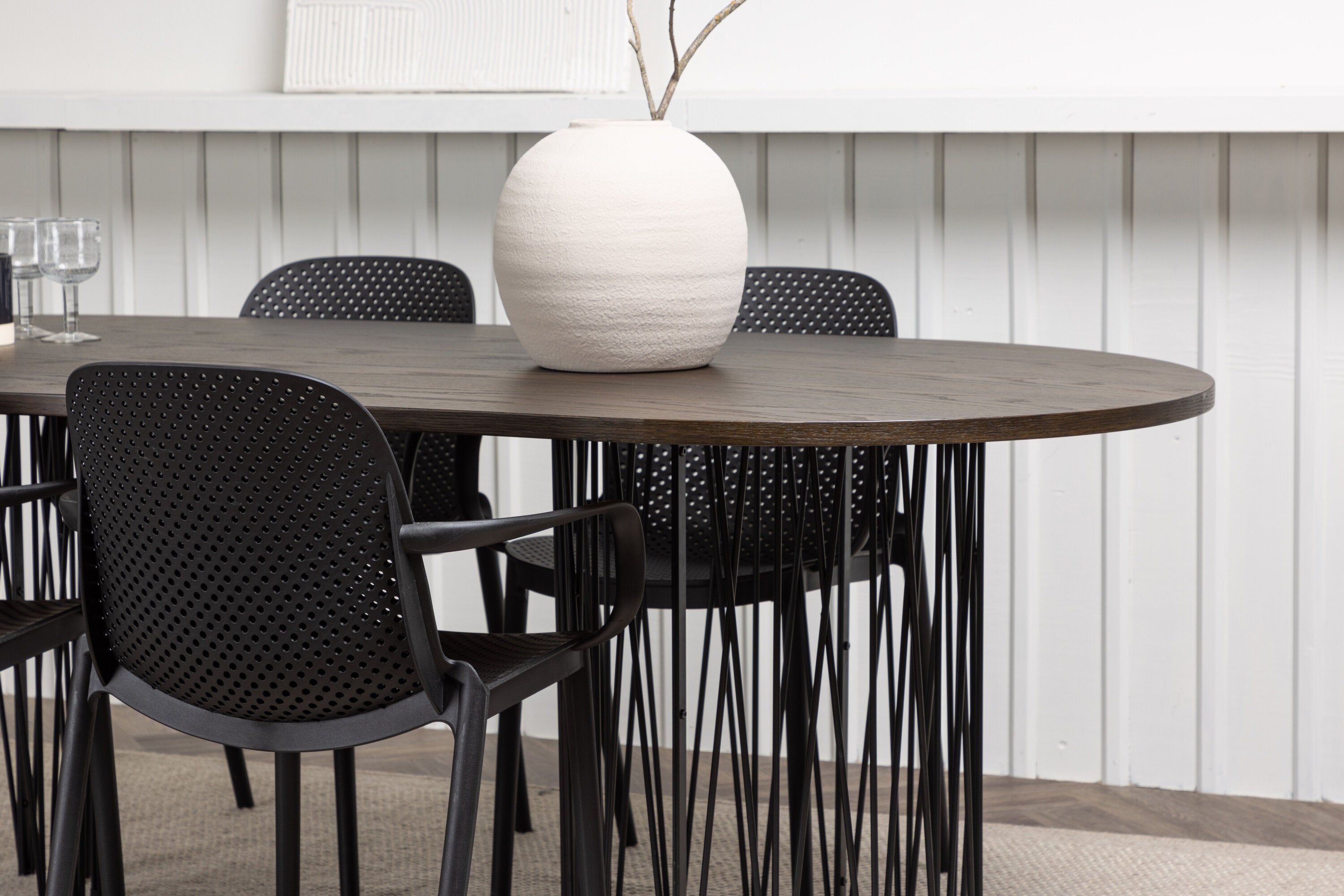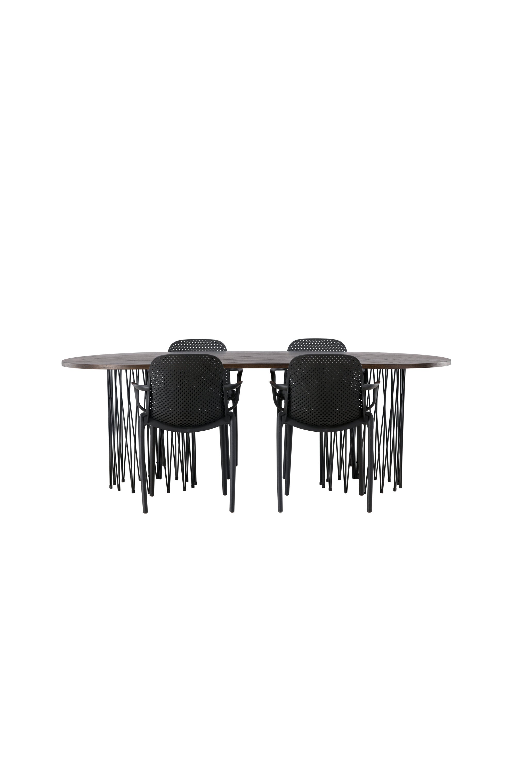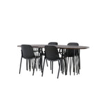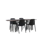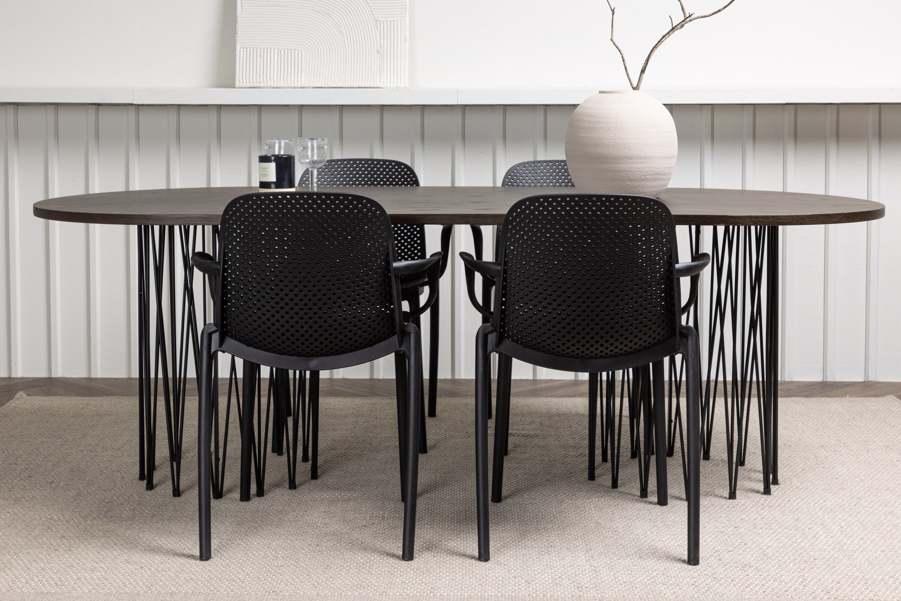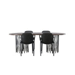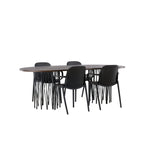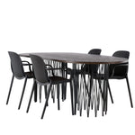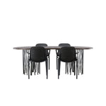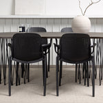 Jídelní skupina v industriálním vzhledu! Náš oválný jídelní stůl Stone zaujme svým módním designem. Stůl má krásnou hnědou desku z MDF s dýhou a dva ozdobné válcové rámy v černém kovu. Zde společně s našimi chytrými jídelními židlemi ze série Baltimore. Židle je vyrobena z černého plastu a design je trendy s rovnými severskými tvary a integrovanými područkami pro extra pohodlí. Odolná jídelní sestava, která obstojí ve zkoušce času! Rozměry stolu: 220x100cm.