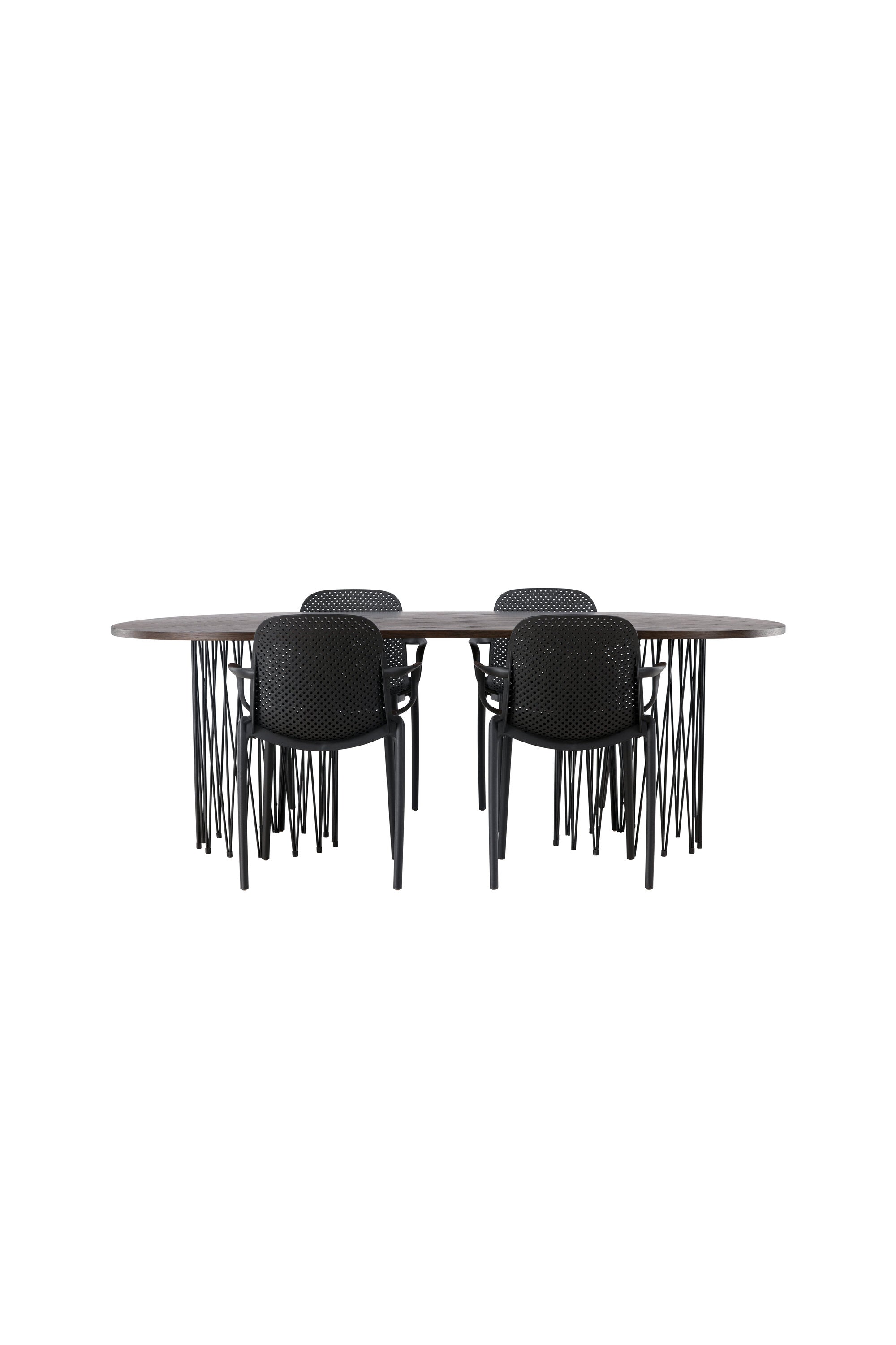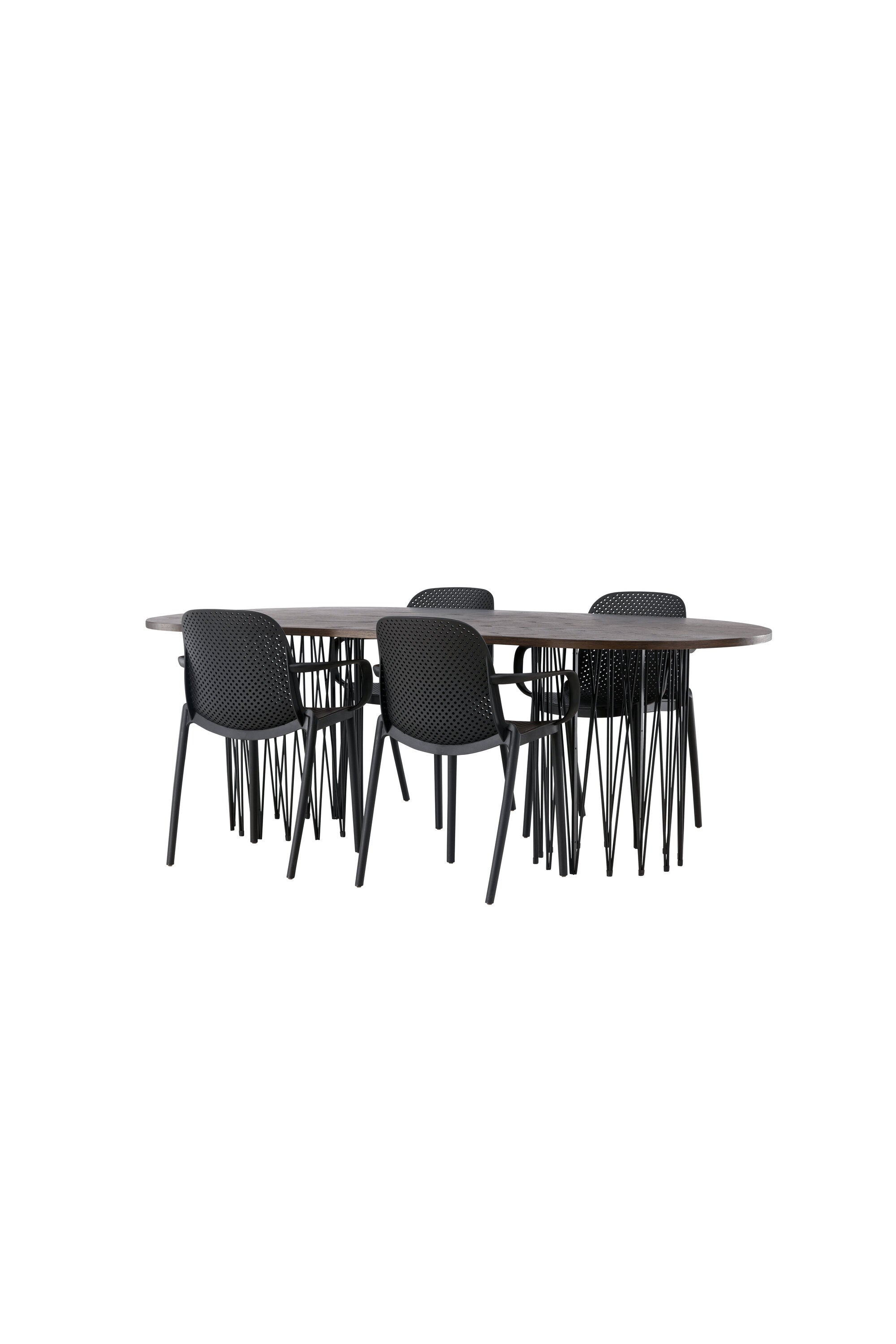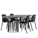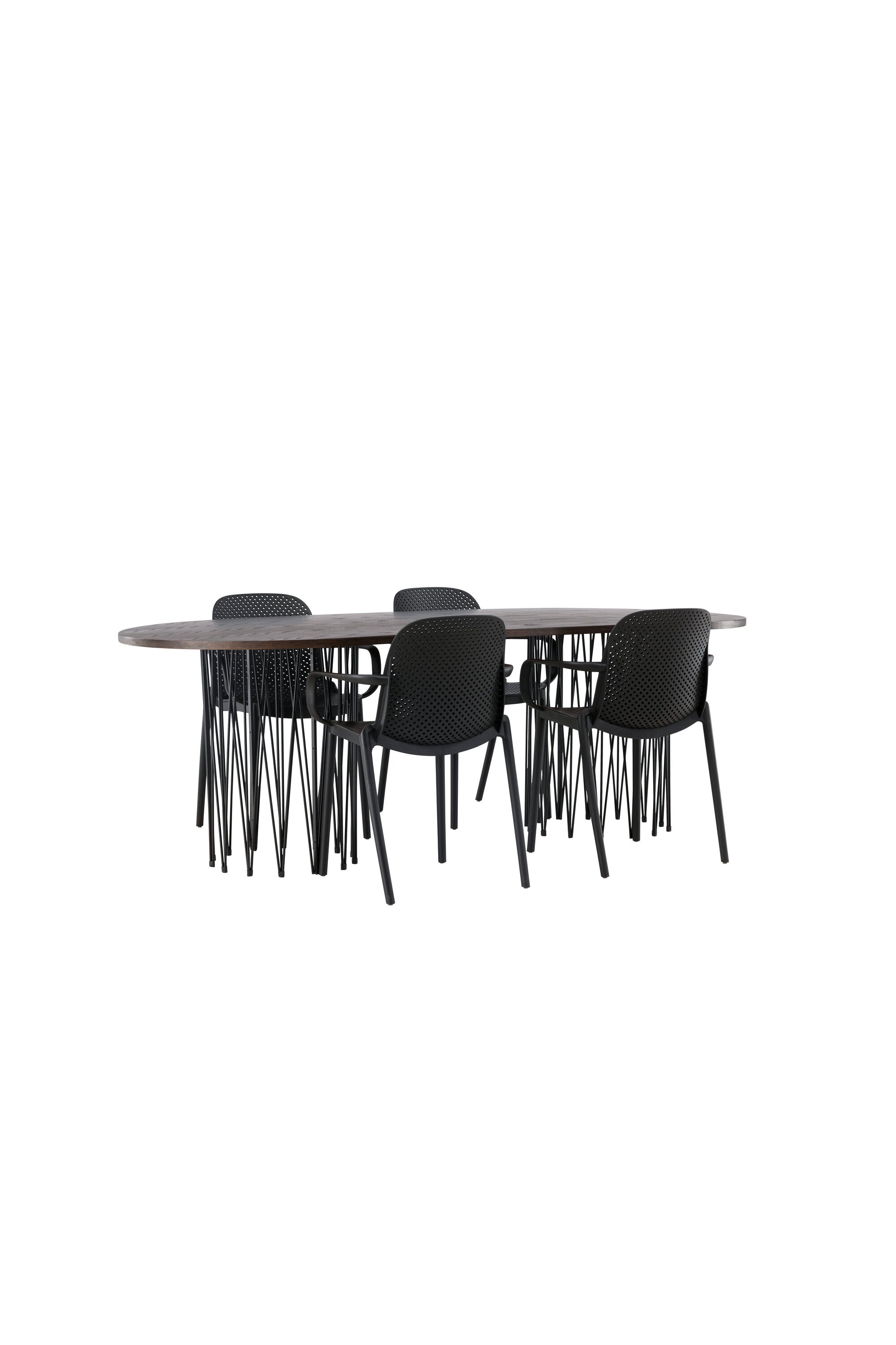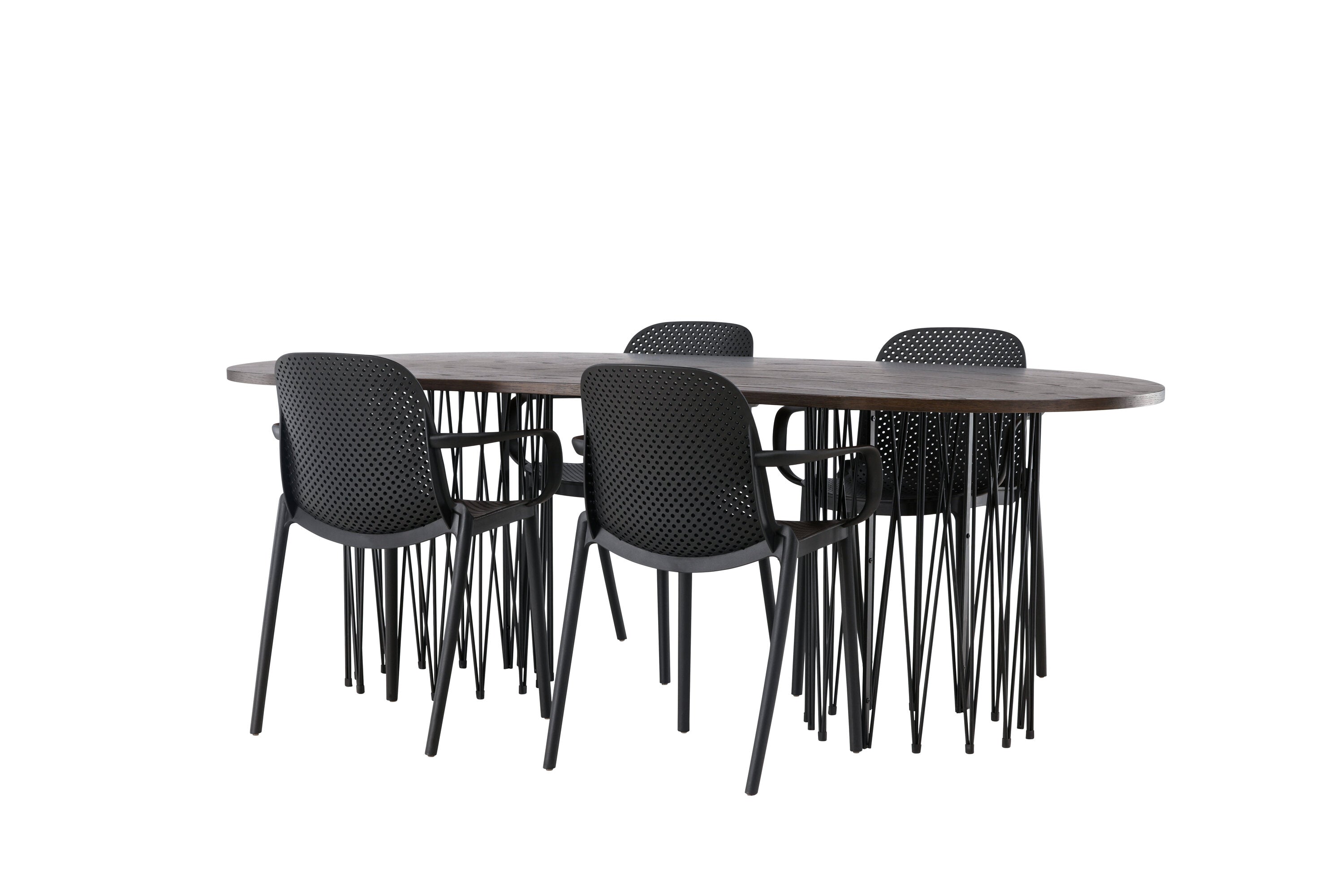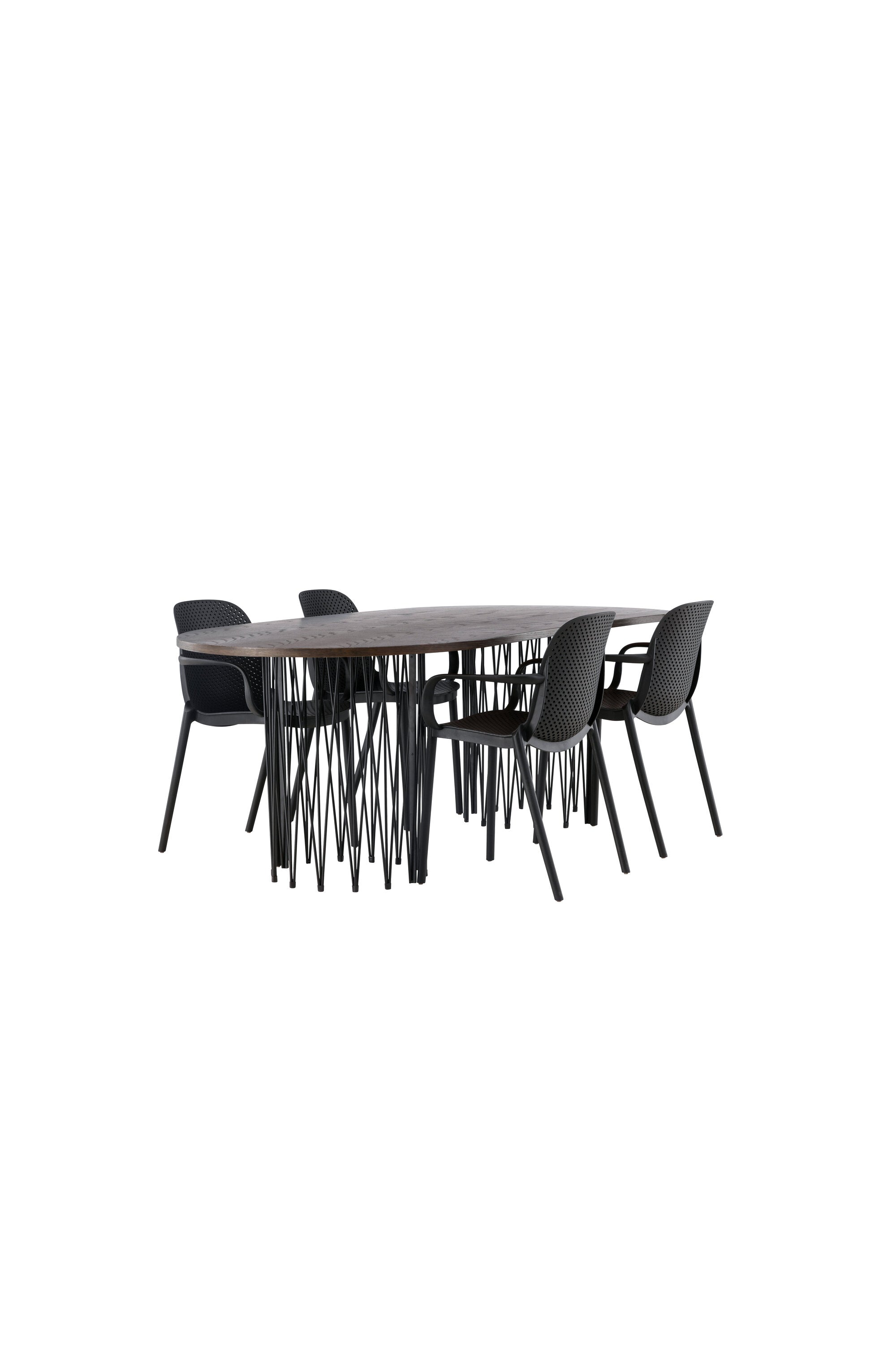 Jídelní skupina v industriálním vzhledu! Náš oválný jídelní stůl Stone zaujme svým módním designem. Stůl má krásnou hnědou desku z MDF s dýhou a dva ozdobné válcové rámy v černém kovu. Zde společně s našimi chytrými jídelními židlemi ze série Baltimore. Židle je vyrobena z černého plastu a design je trendy s rovnými severskými tvary a integrovanými područkami pro extra pohodlí. Odolná jídelní sestava, která obstojí ve zkoušce času! Rozměry stolu: 220x100cm.