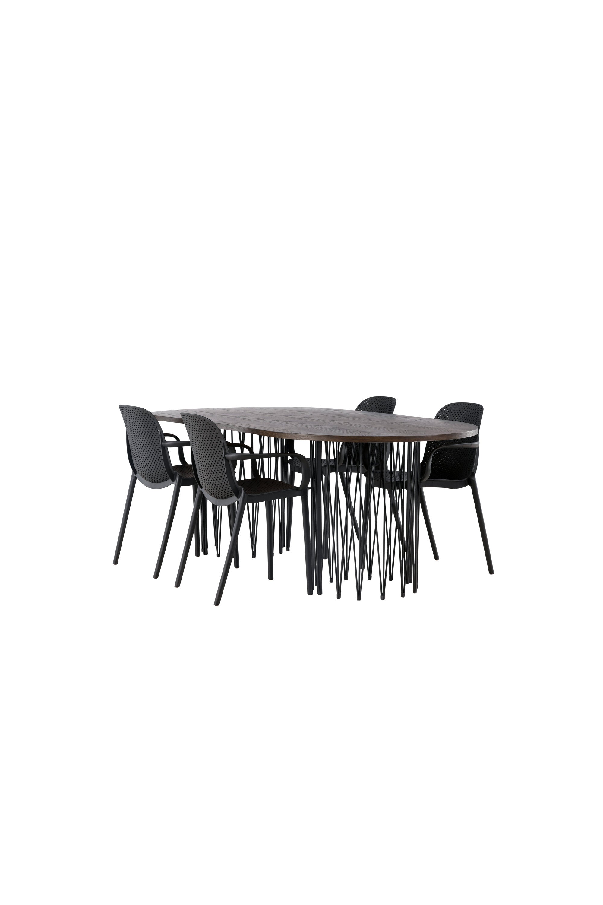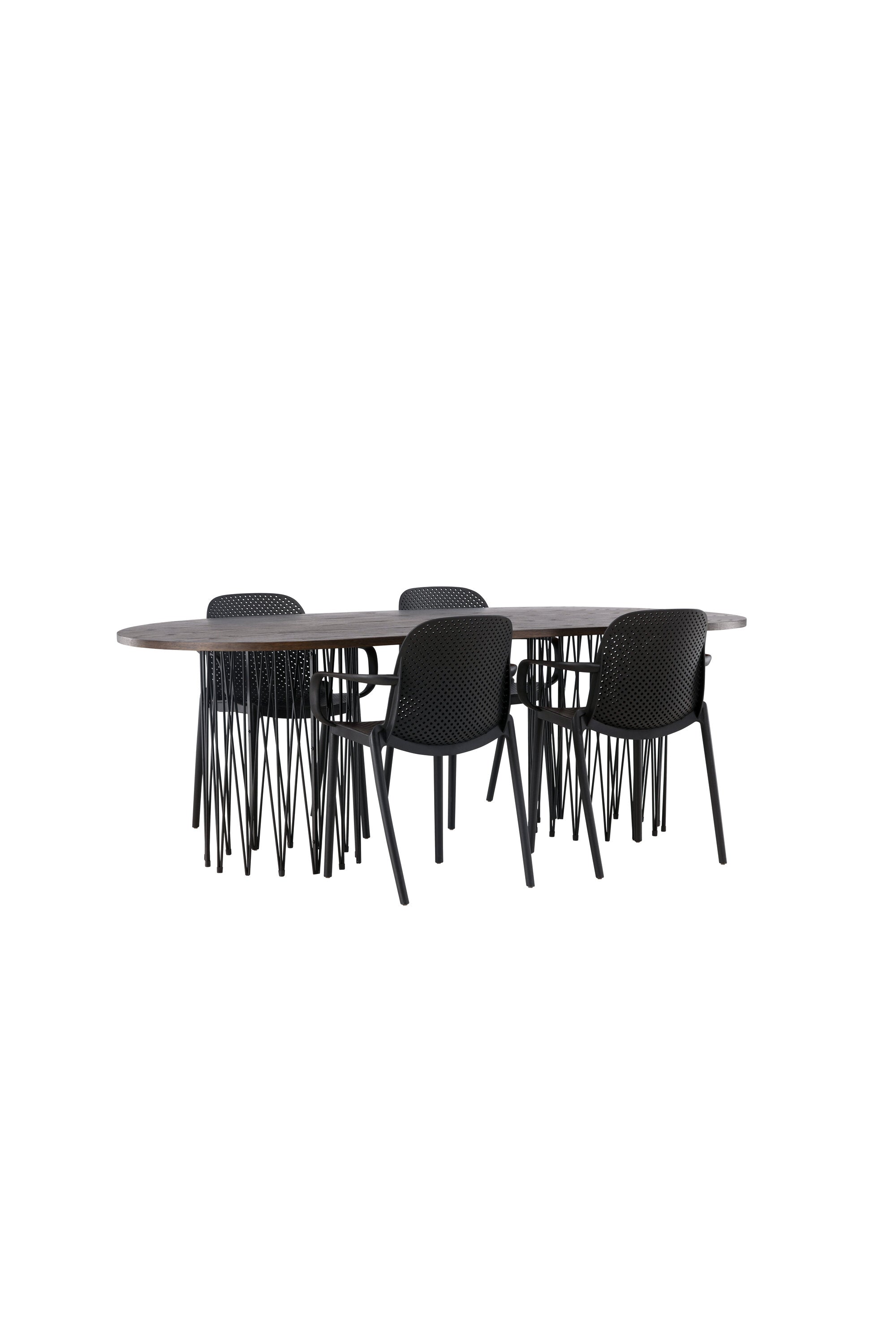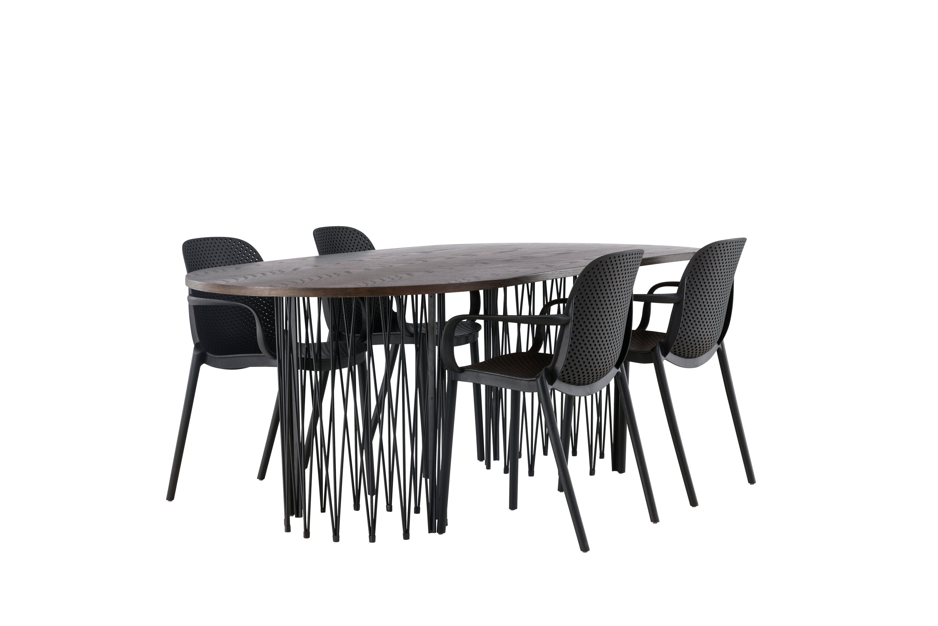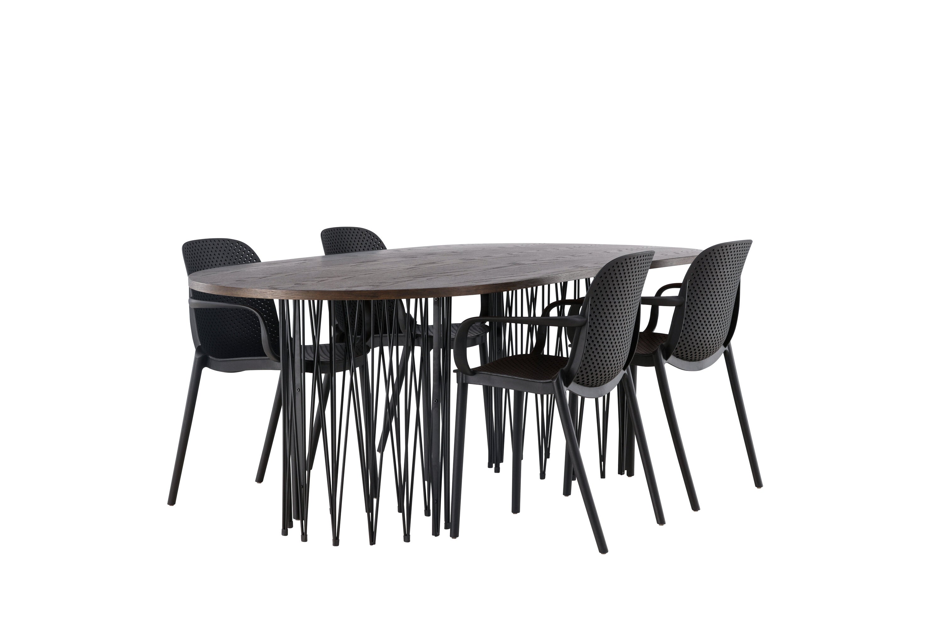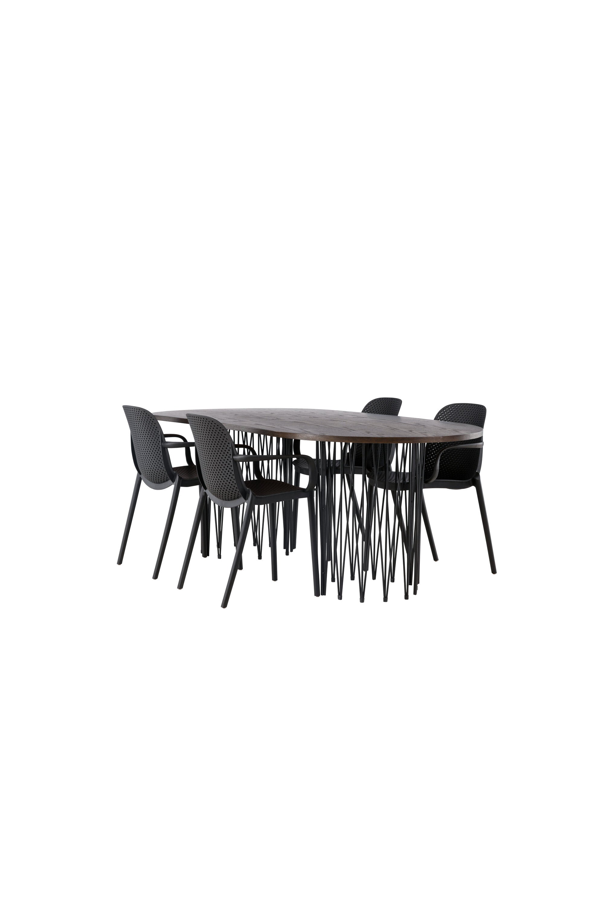 Jídelní skupina v industriálním vzhledu! Náš oválný jídelní stůl Stone zaujme svým módním designem. Stůl má krásnou hnědou desku z MDF s dýhou a dva ozdobné válcové rámy v černém kovu. Zde společně s našimi chytrými jídelními židlemi ze série Baltimore. Židle je vyrobena z černého plastu a design je trendy s rovnými severskými tvary a integrovanými područkami pro extra pohodlí. Odolná jídelní sestava, která obstojí ve zkoušce času! Rozměry stolu: 220x100cm.
