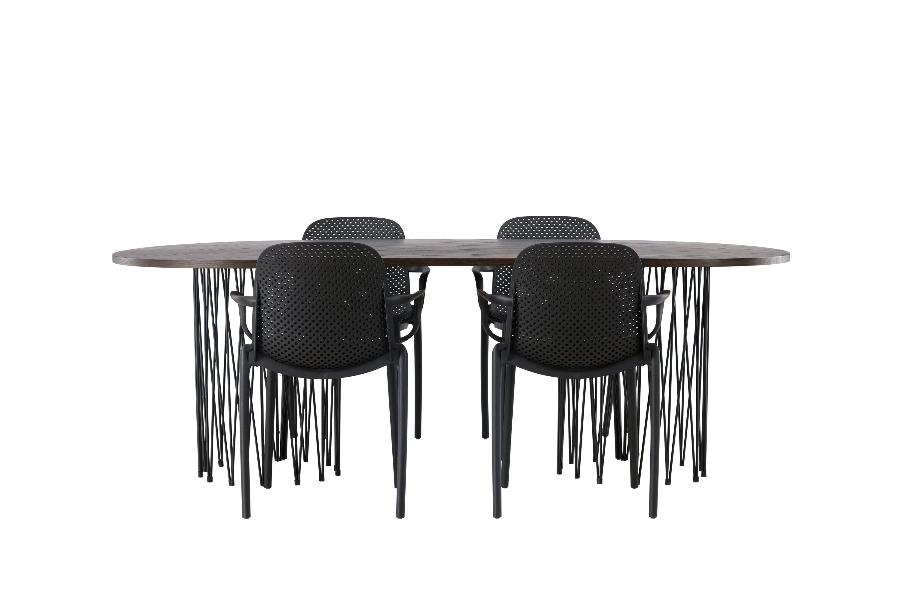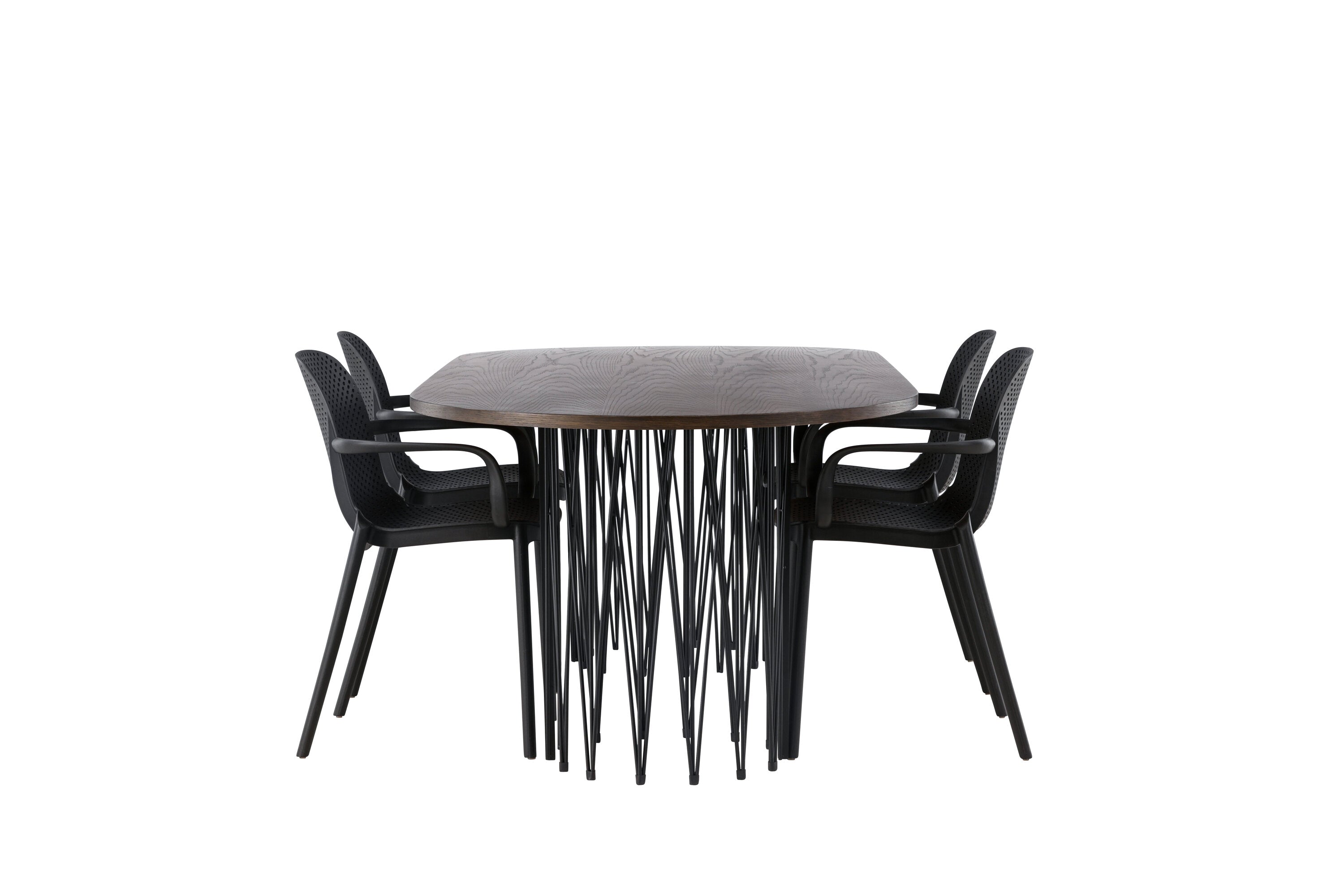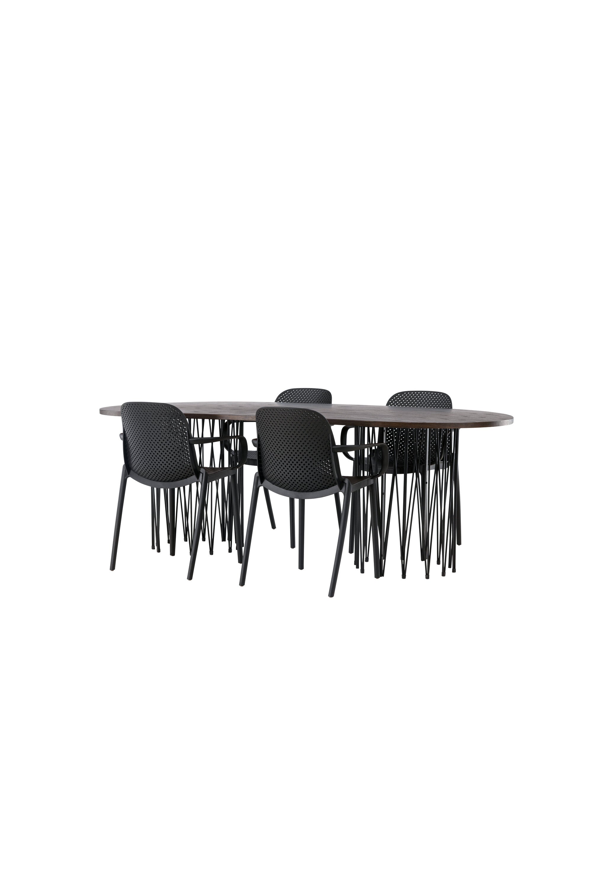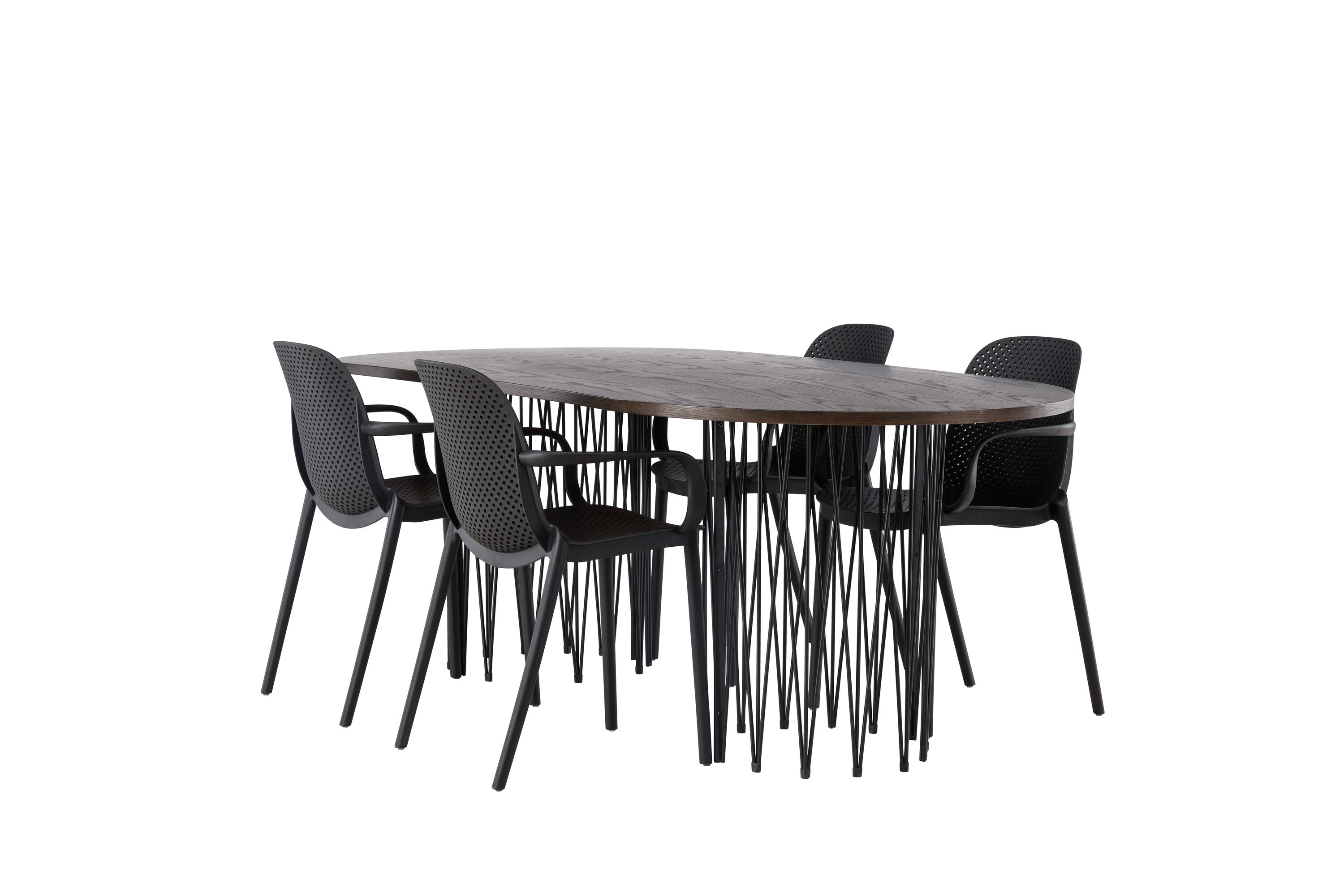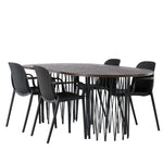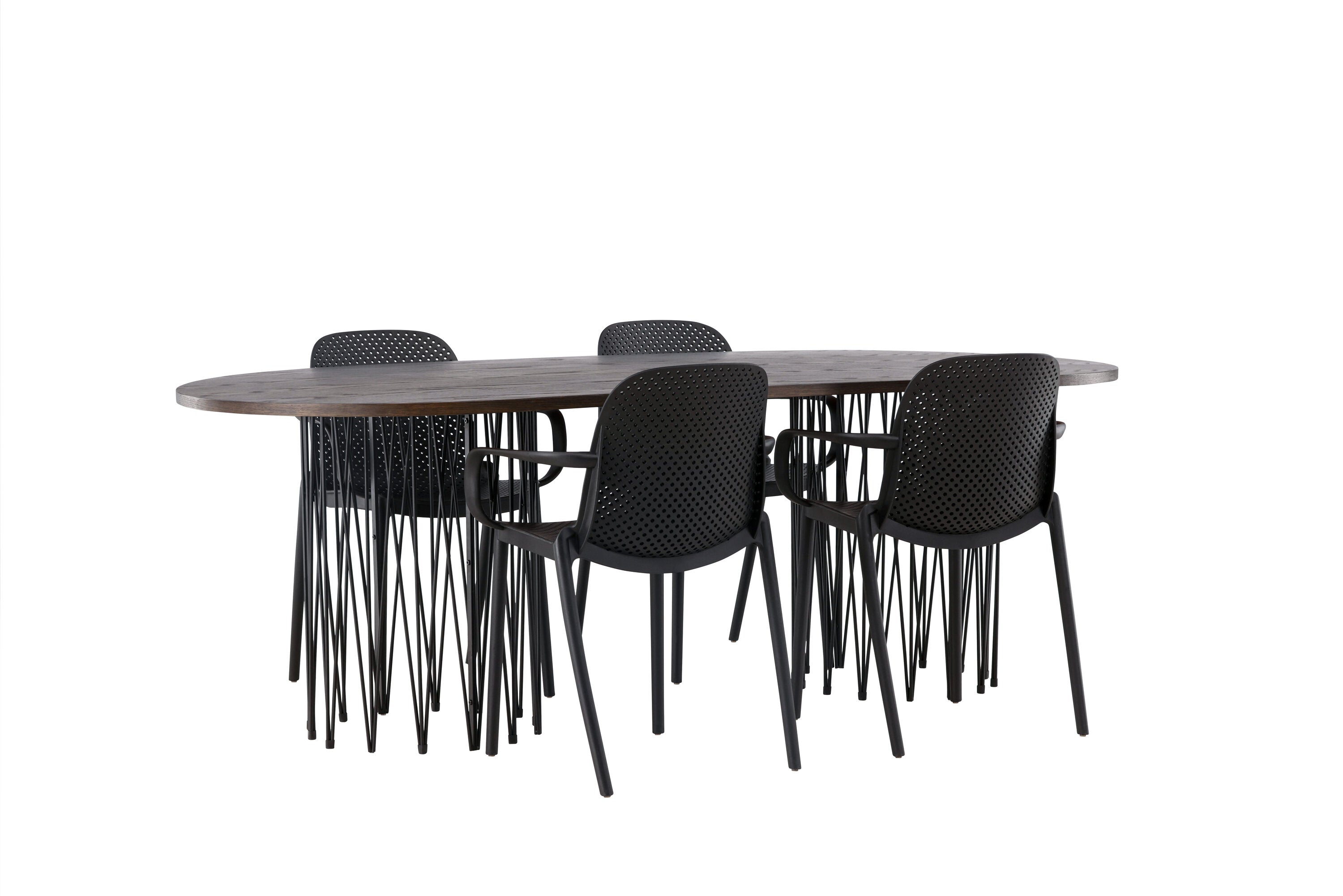 Jídelní skupina v industriálním vzhledu! Náš oválný jídelní stůl Stone zaujme svým módním designem. Stůl má krásnou hnědou desku z MDF s dýhou a dva ozdobné válcové rámy v černém kovu. Zde společně s našimi chytrými jídelními židlemi ze série Baltimore. Židle je vyrobena z černého plastu a design je trendy s rovnými severskými tvary a integrovanými područkami pro extra pohodlí. Odolná jídelní sestava, která obstojí ve zkoušce času! Rozměry stolu: 220x100cm.