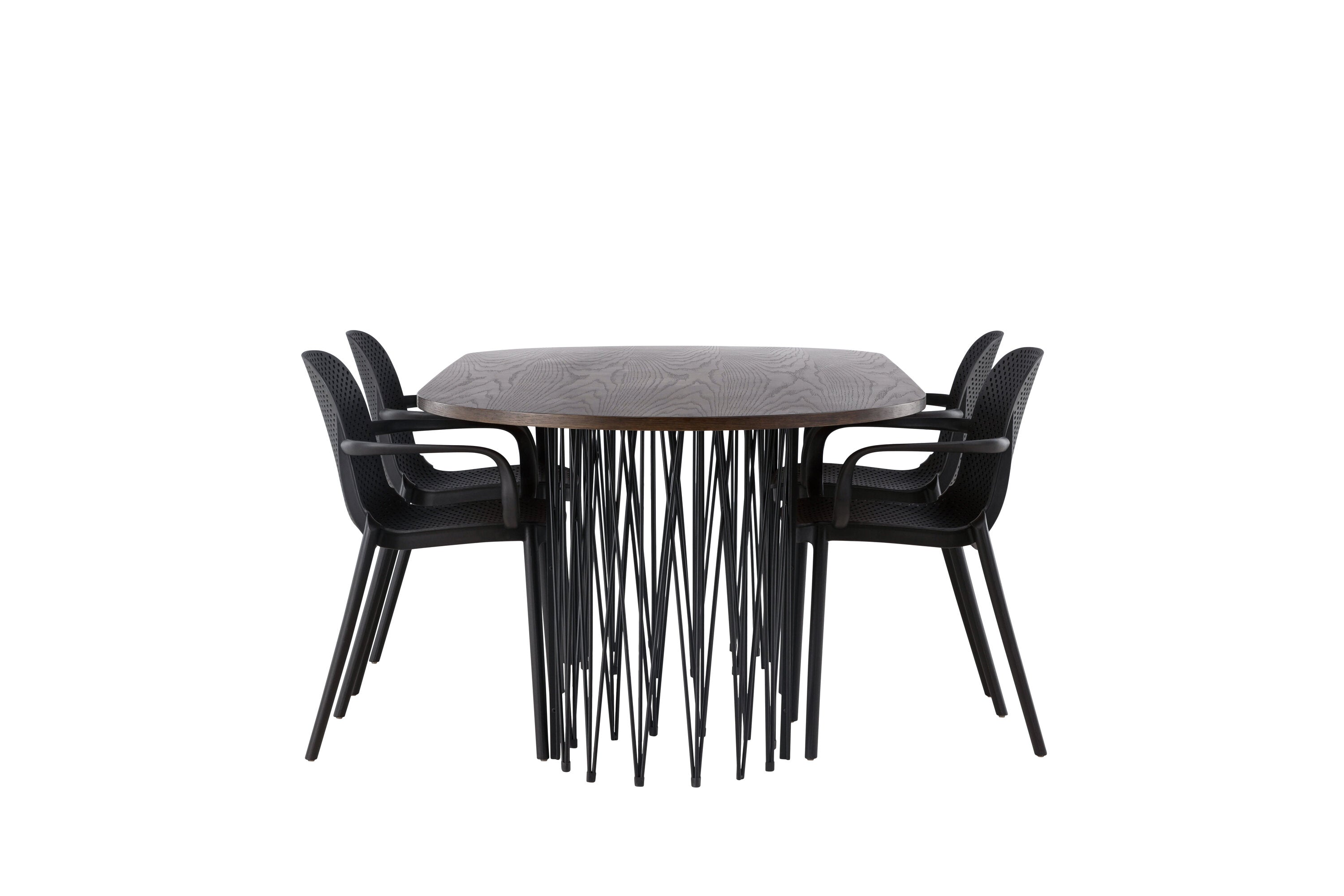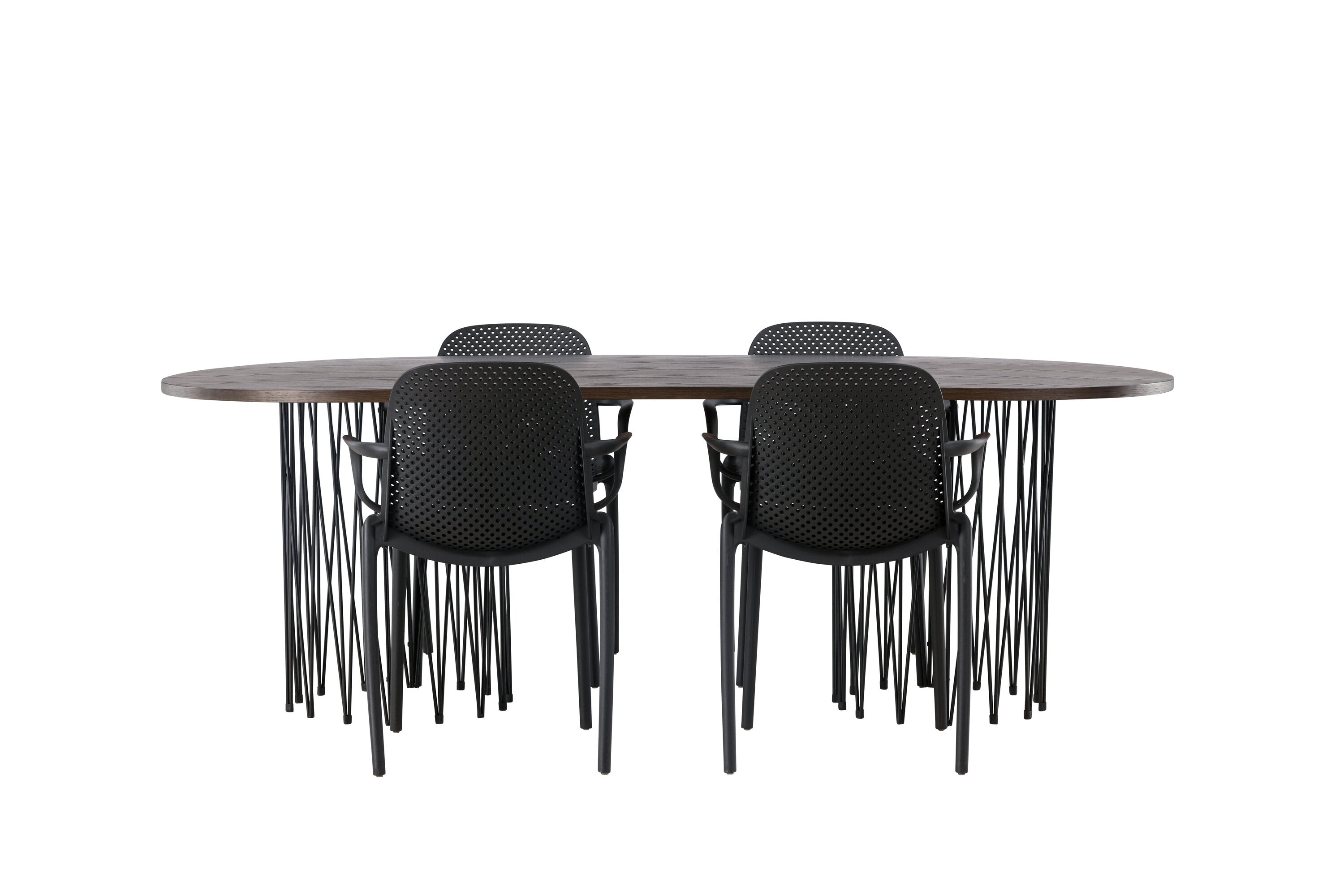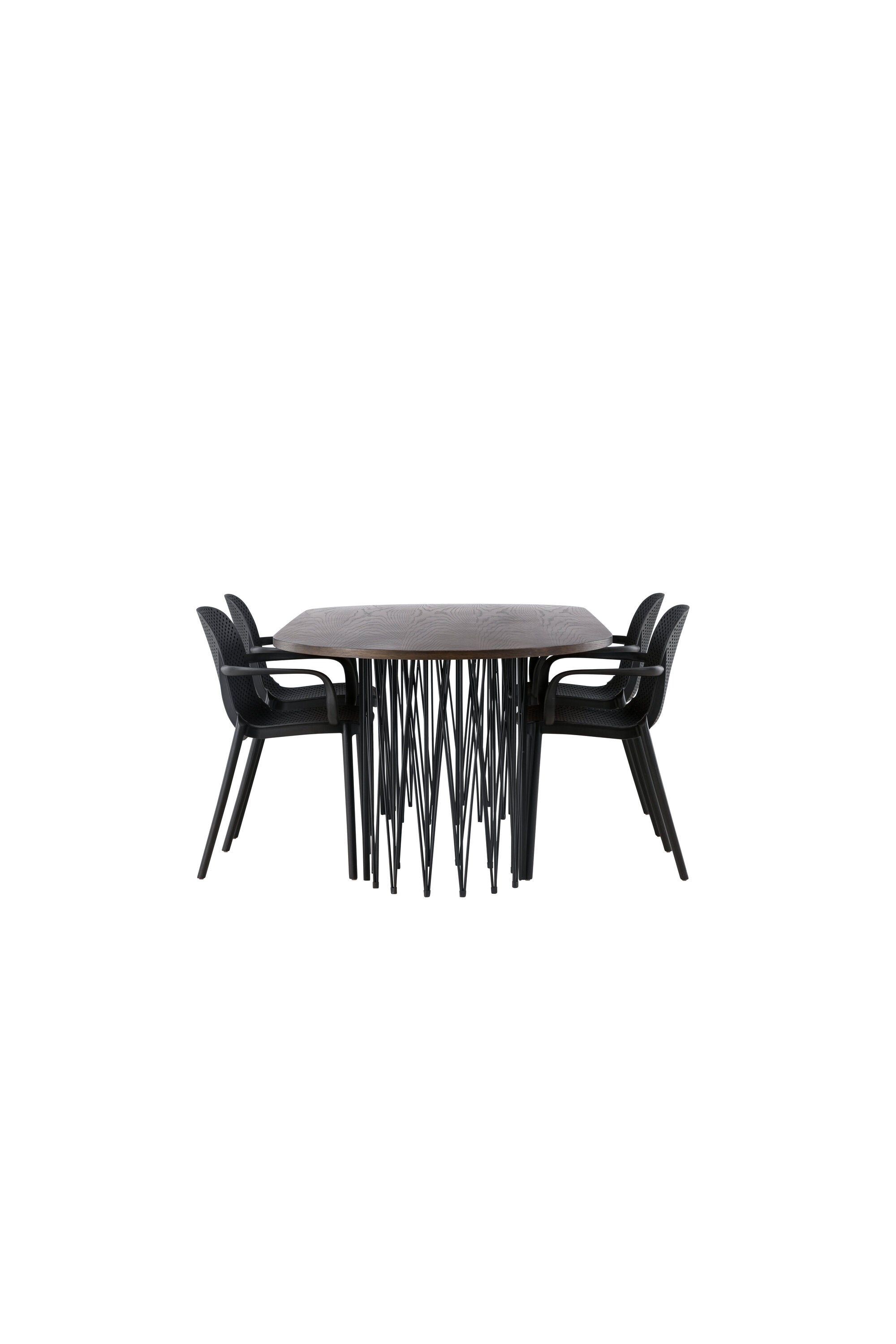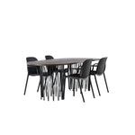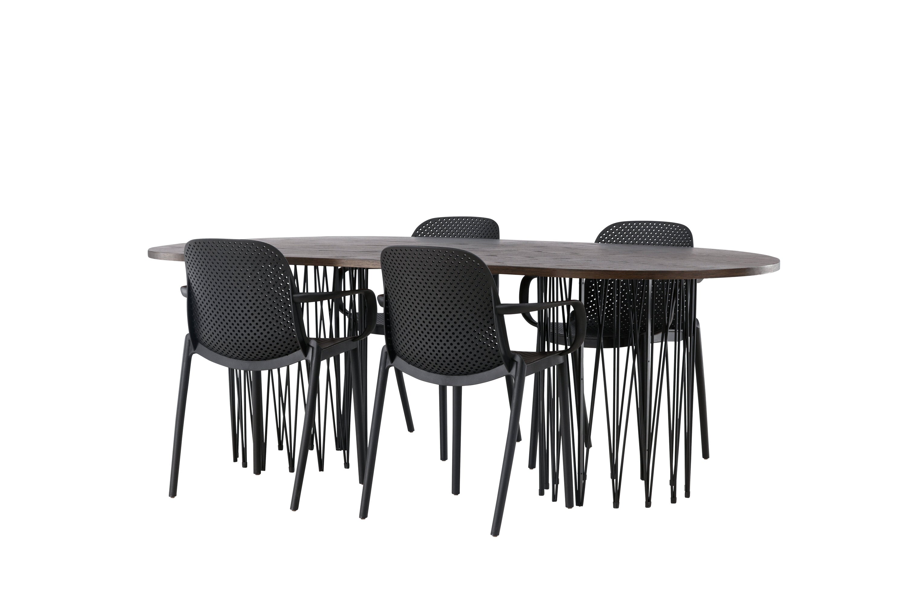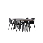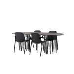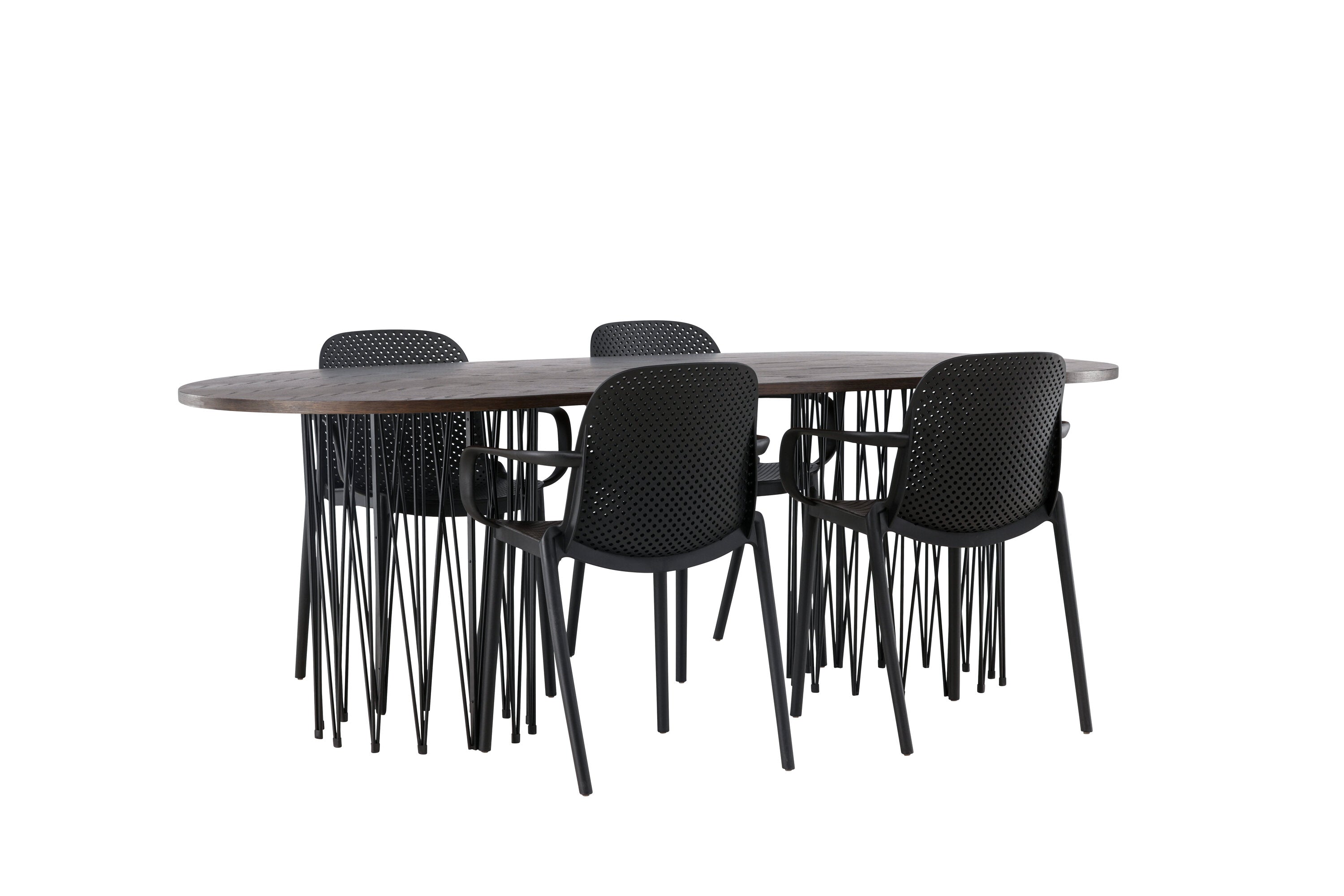 Jídelní skupina v industriálním vzhledu! Náš oválný jídelní stůl Stone zaujme svým módním designem. Stůl má krásnou hnědou desku z MDF s dýhou a dva ozdobné válcové rámy v černém kovu. Zde společně s našimi chytrými jídelními židlemi ze série Baltimore. Židle je vyrobena z černého plastu a design je trendy s rovnými severskými tvary a integrovanými područkami pro extra pohodlí. Odolná jídelní sestava, která obstojí ve zkoušce času! Rozměry stolu: 220x100cm.