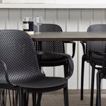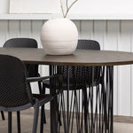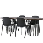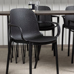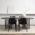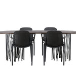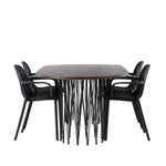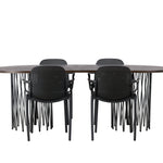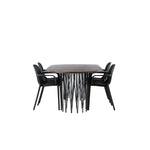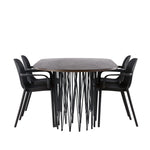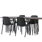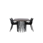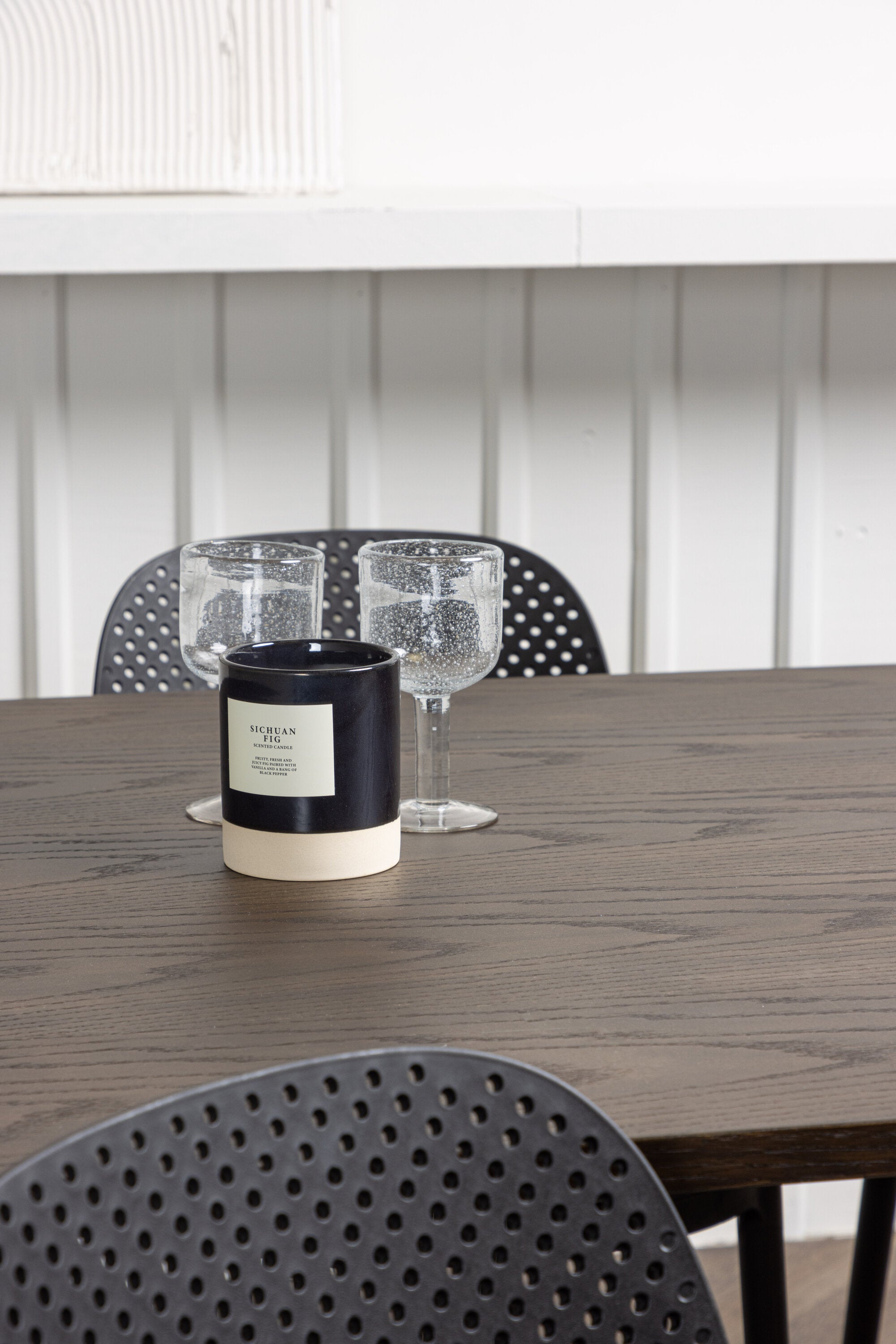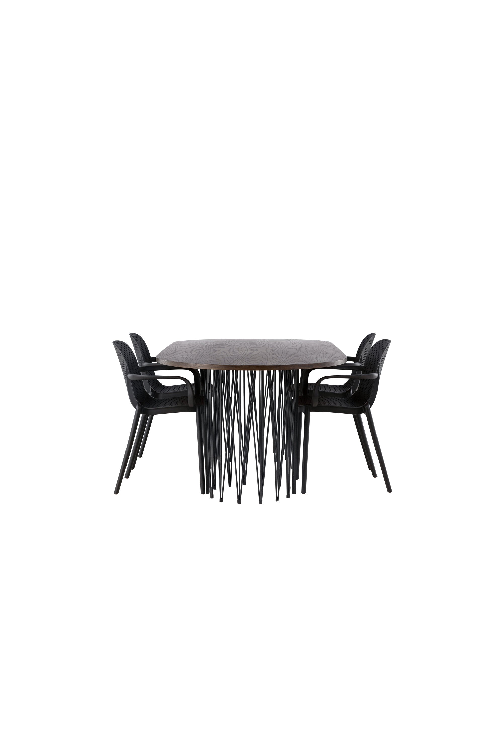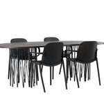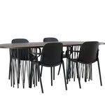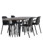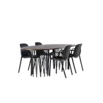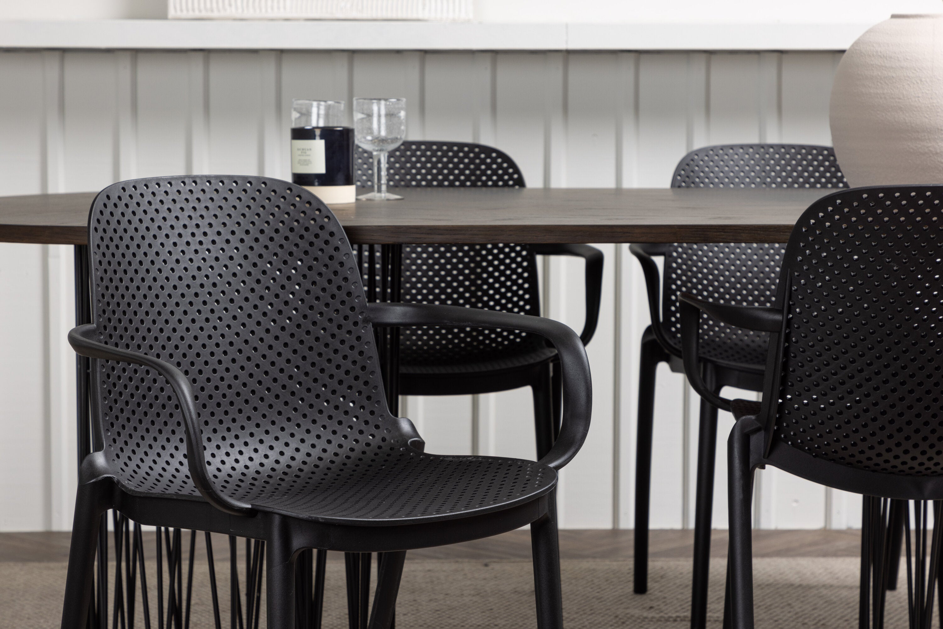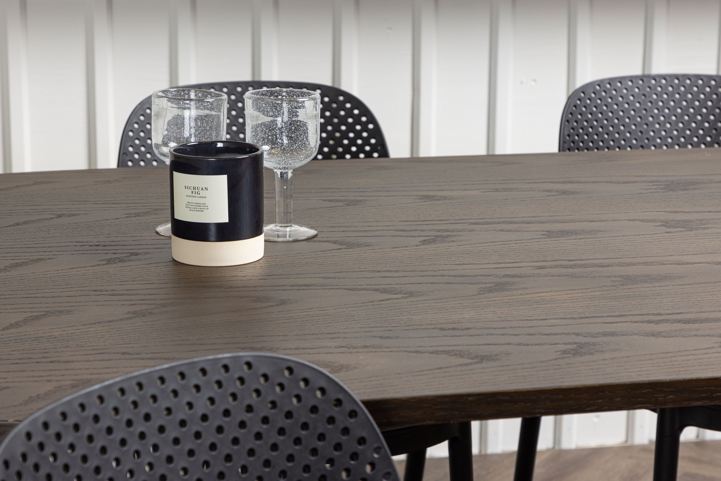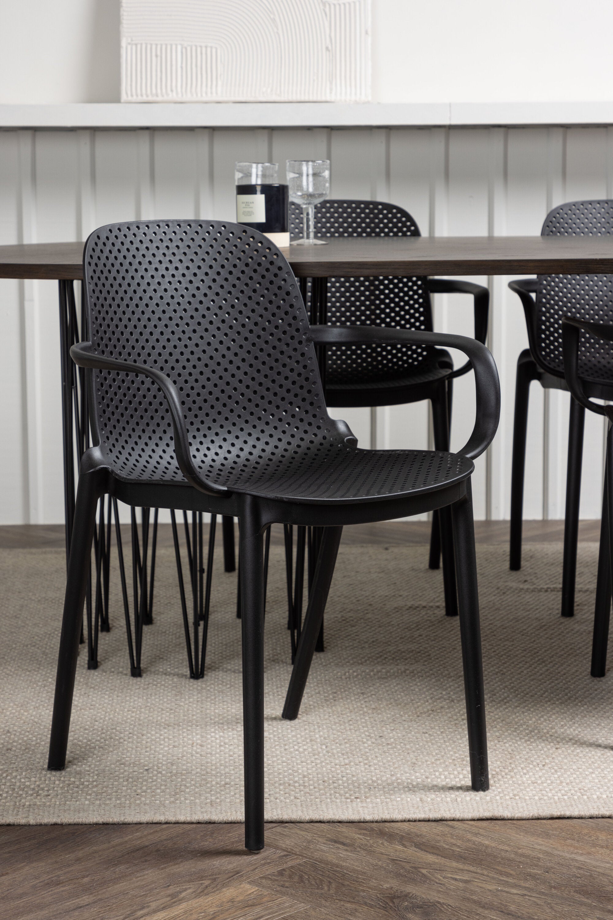 Jídelní skupina v industriálním vzhledu! Náš oválný jídelní stůl Stone zaujme svým módním designem. Stůl má krásnou hnědou desku z MDF s dýhou a dva ozdobné válcové rámy v černém kovu. Zde společně s našimi chytrými jídelními židlemi ze série Baltimore. Židle je vyrobena z černého plastu a design je trendy s rovnými severskými tvary a integrovanými područkami pro extra pohodlí. Odolná jídelní sestava, která obstojí ve zkoušce času! Rozměry stolu: 220x100cm.