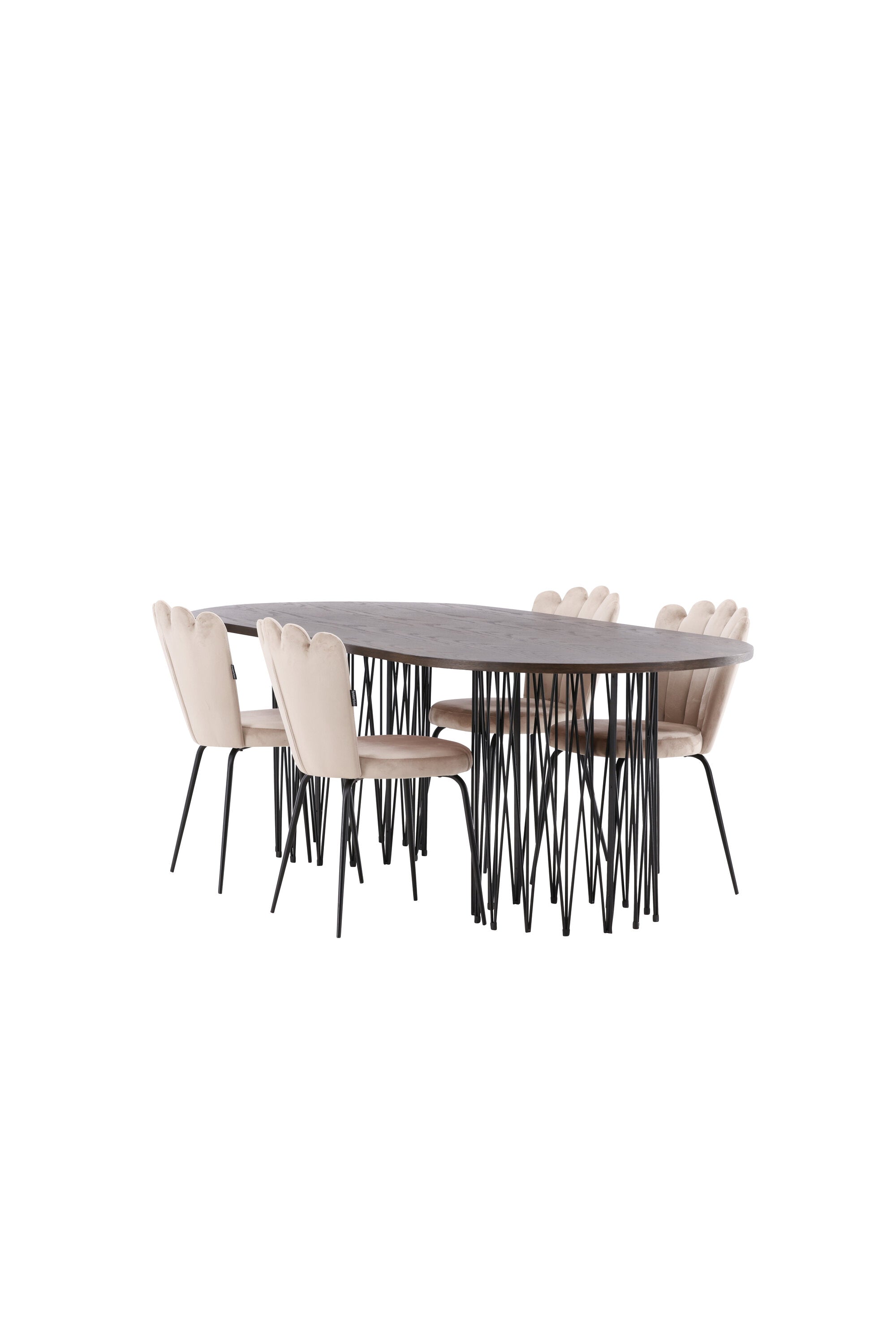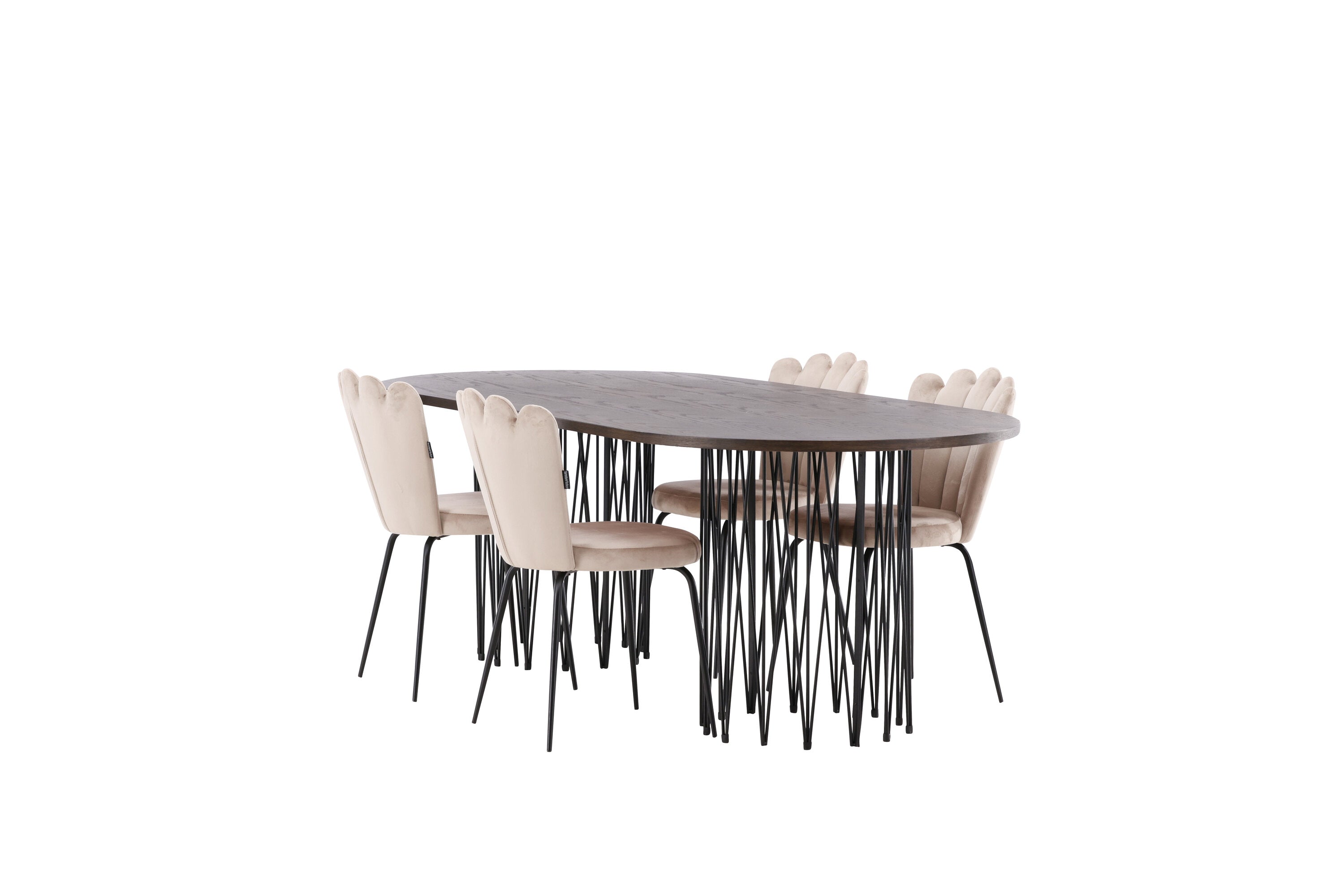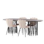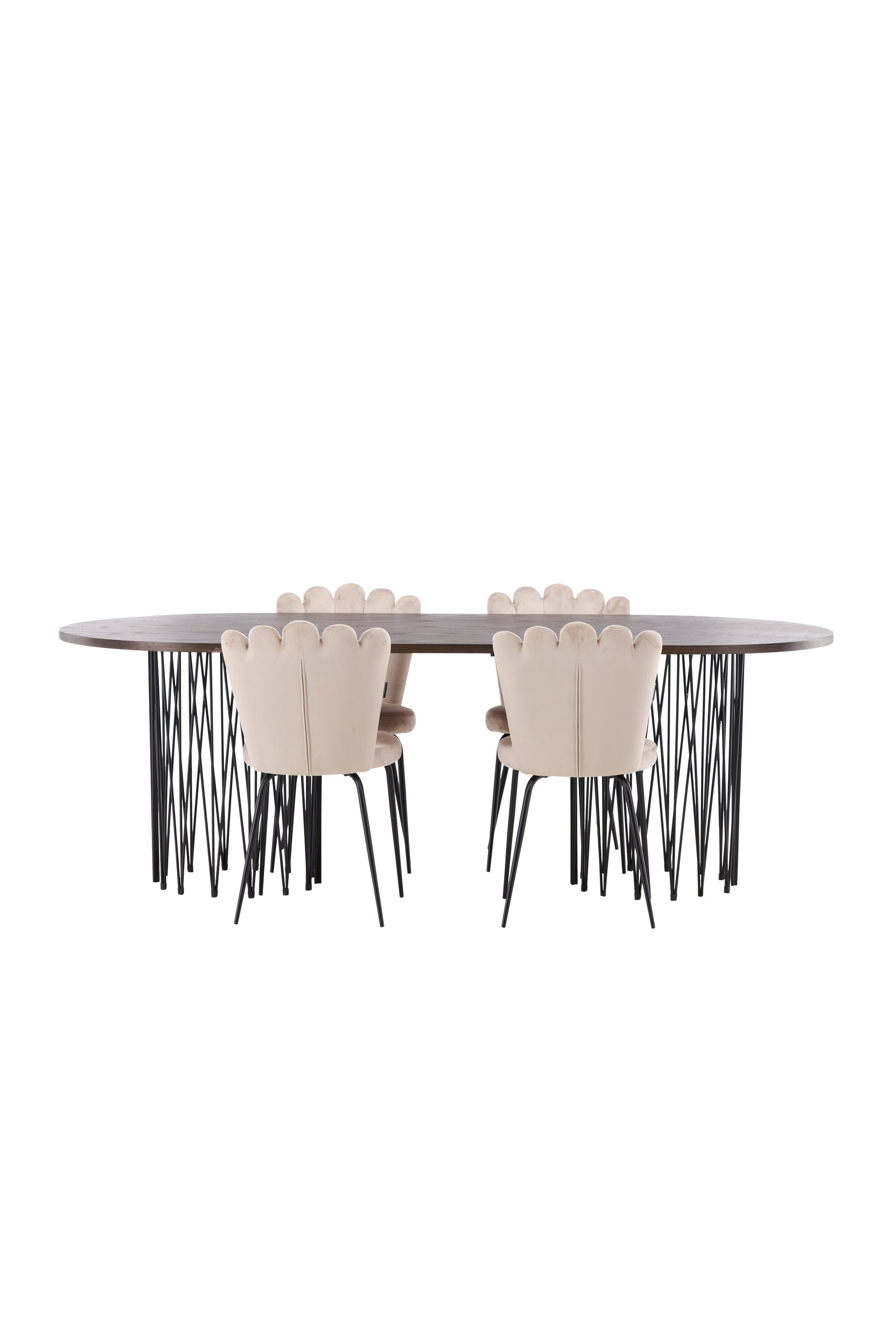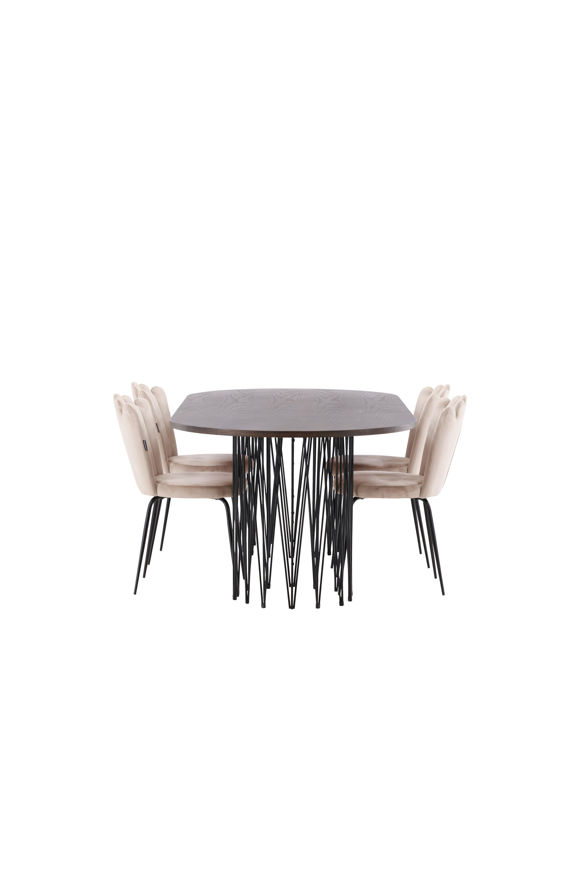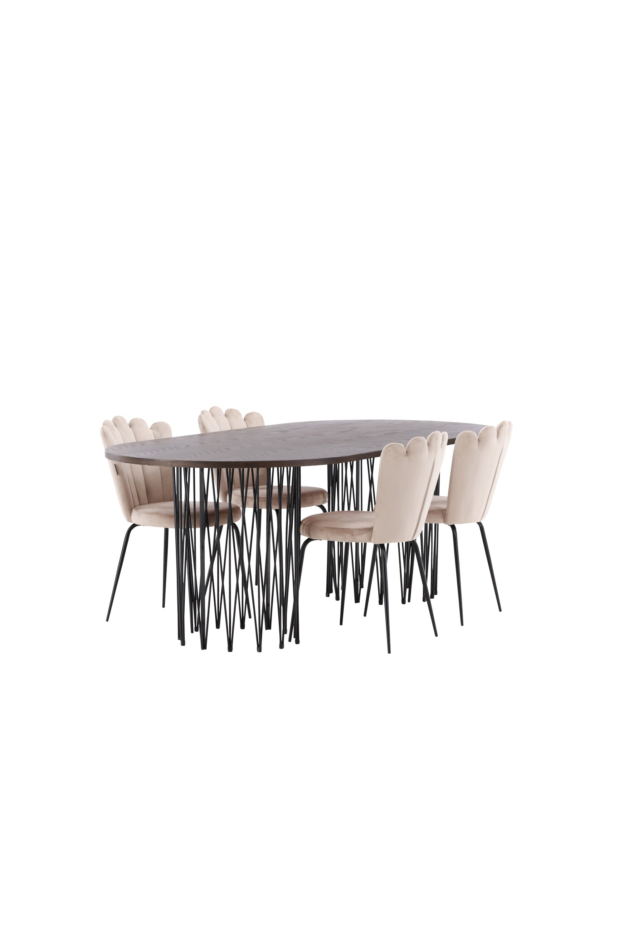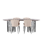 Vybavte srdce svého domova jídelním koutem, který vyzařuje luxus a pohodlí! Náš oválný jídelní stůl Stone má fantastický skandinávský design, který se hodí k davu. Stůl má krásnou hnědou desku z MDF s dýhou a dva ozdobné rámy ve tvaru válce v černém kovu. Zde v dokonalé kombinaci s našimi krásnými židlemi ze série Limhamn. Židle je moderním favoritem mnoha domácností se svým lákavým designem, ozdobným opěradlem ve tvaru mušle s ozdobným prošíváním a kulatým sedákem z vkusné béžové sametové látky. Nohy jsou z kovu s černou práškovou barvou. Pohodlně a velkolepě se usaďte!