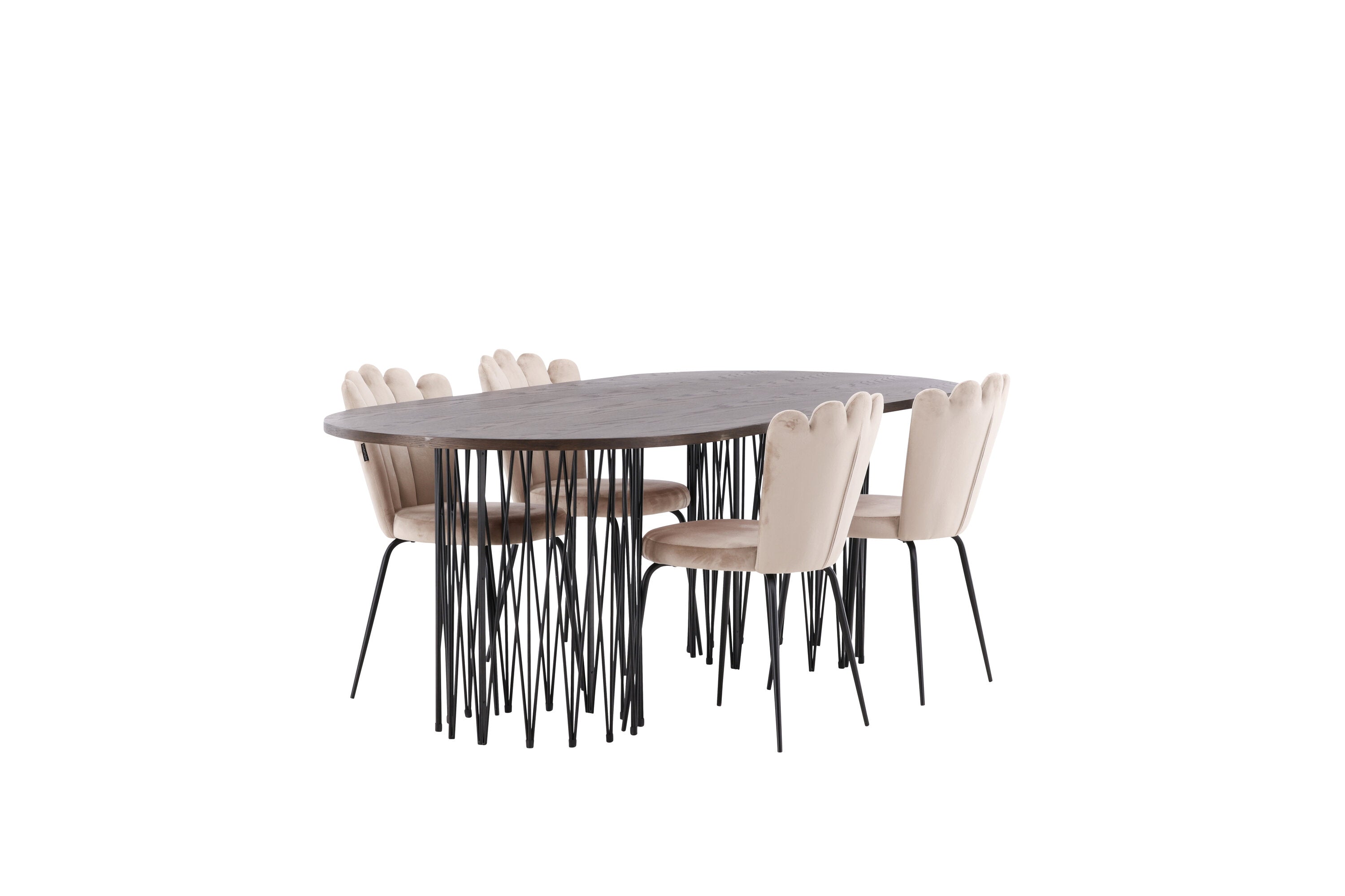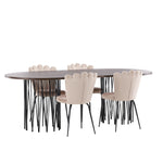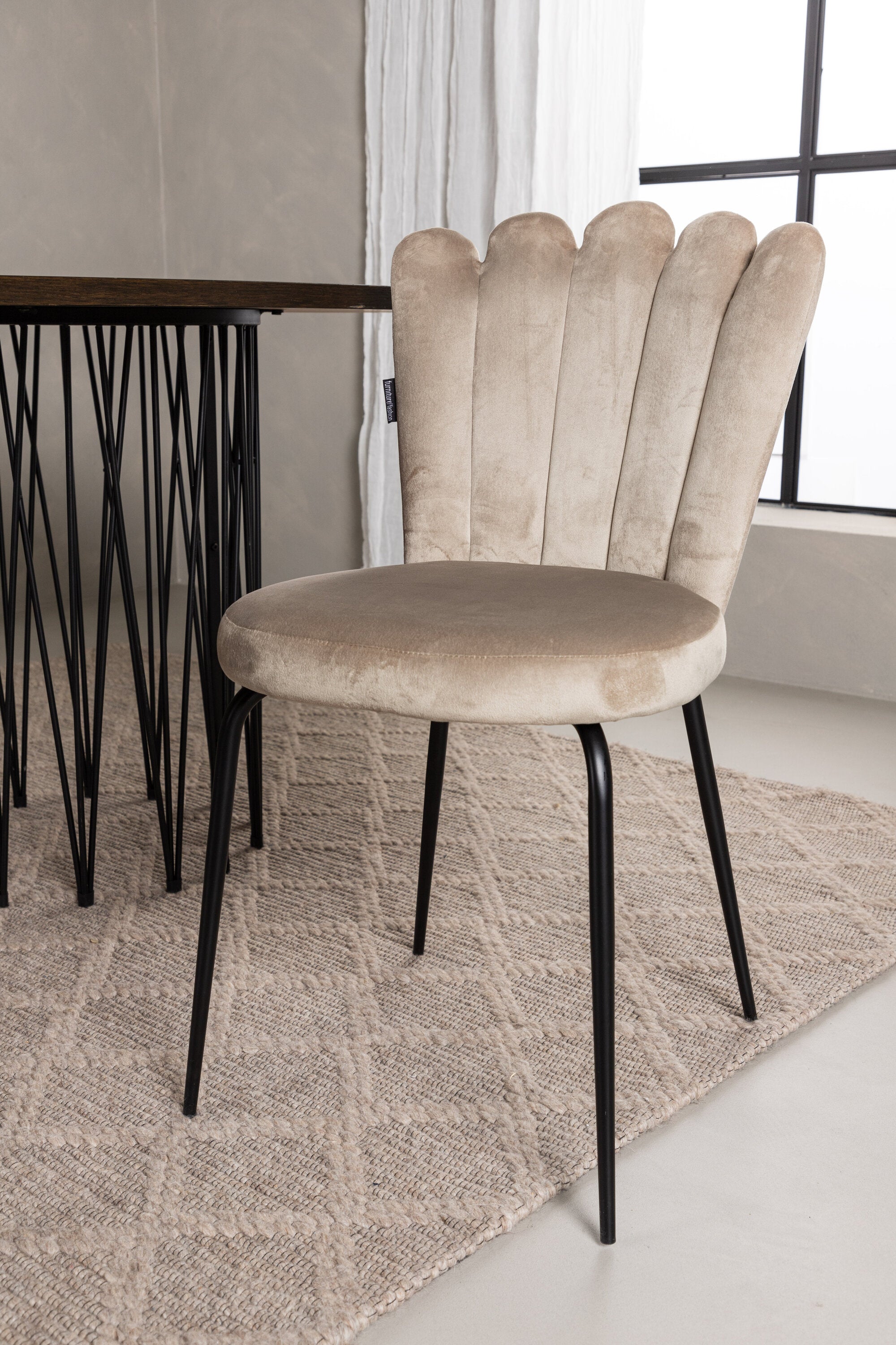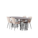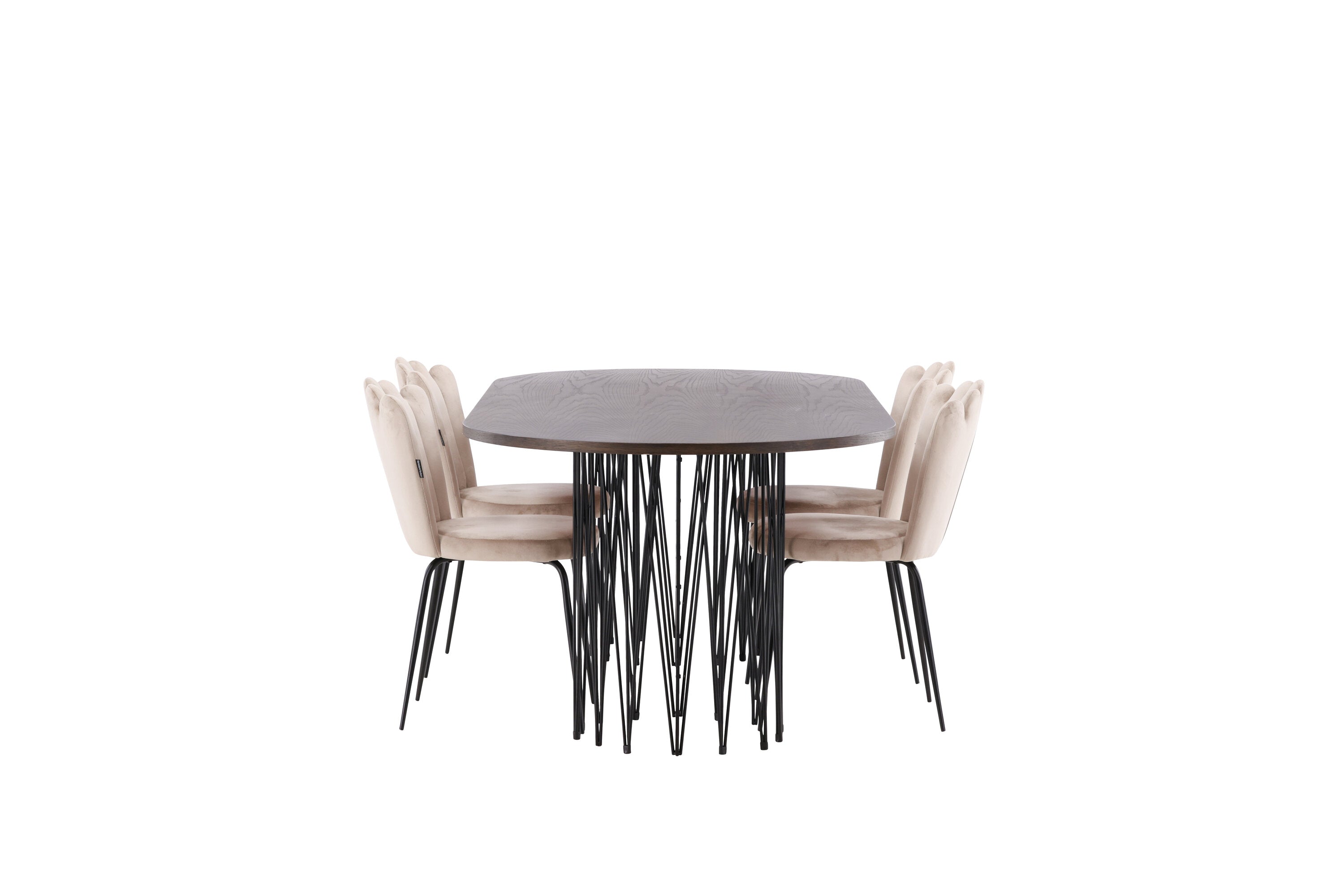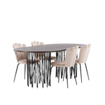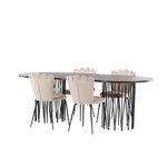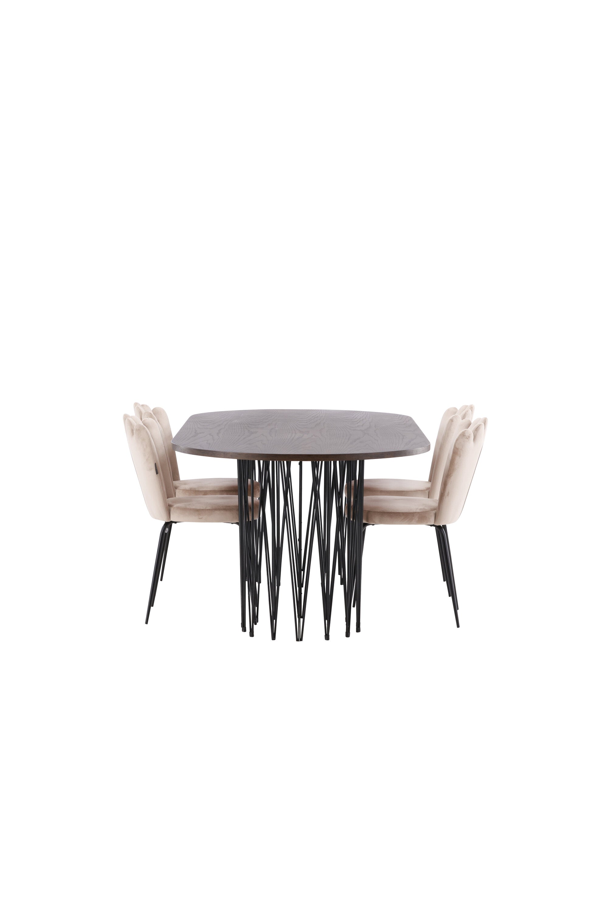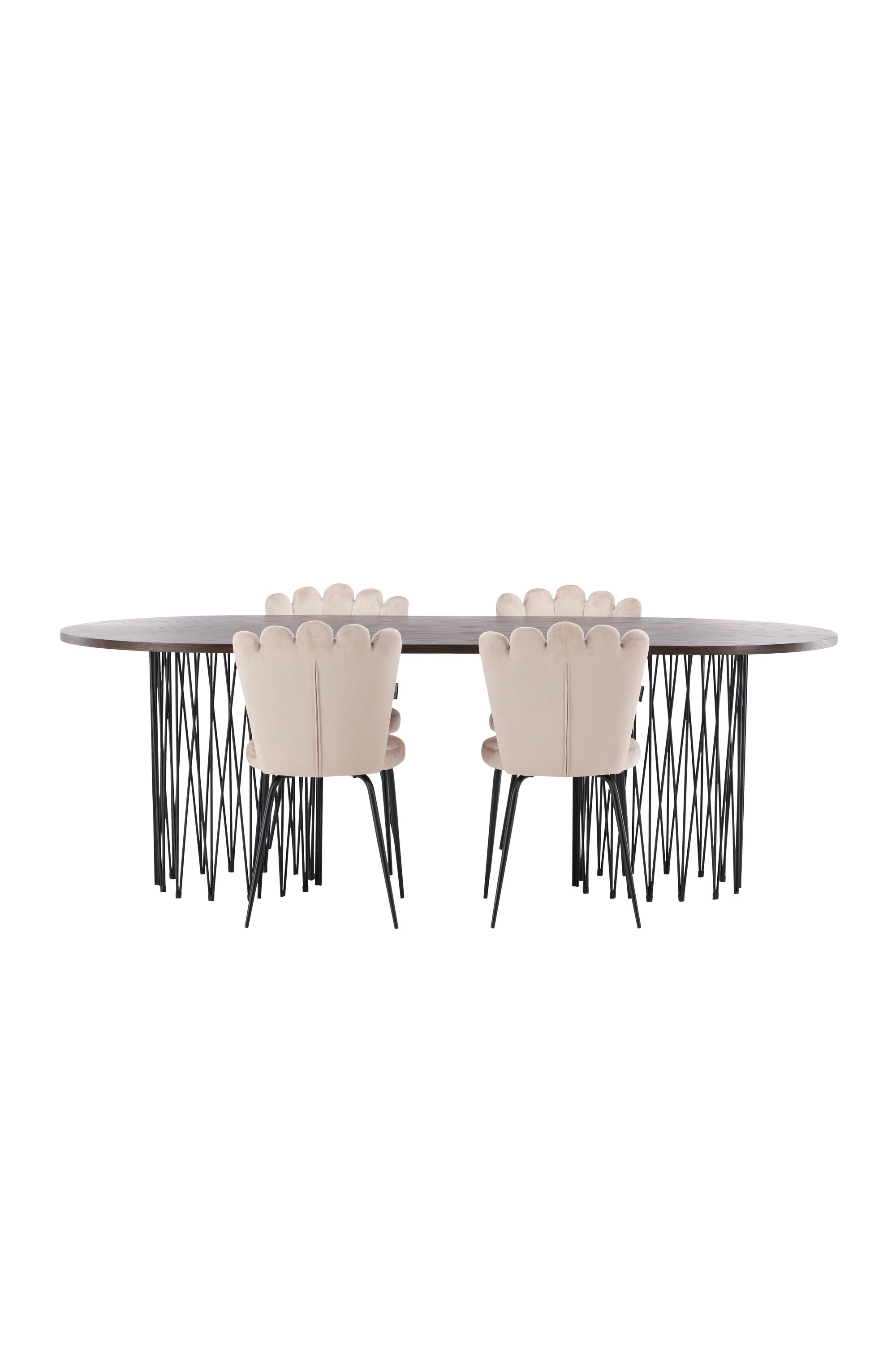 Vybavte srdce svého domova jídelním koutem, který vyzařuje luxus a pohodlí! Náš oválný jídelní stůl Stone má fantastický skandinávský design, který se hodí k davu. Stůl má krásnou hnědou desku z MDF s dýhou a dva ozdobné rámy ve tvaru válce v černém kovu. Zde v dokonalé kombinaci s našimi krásnými židlemi ze série Limhamn. Židle je moderním favoritem mnoha domácností se svým lákavým designem, ozdobným opěradlem ve tvaru mušle s ozdobným prošíváním a kulatým sedákem z vkusné béžové sametové látky. Nohy jsou z kovu s černou práškovou barvou. Pohodlně a velkolepě se usaďte!