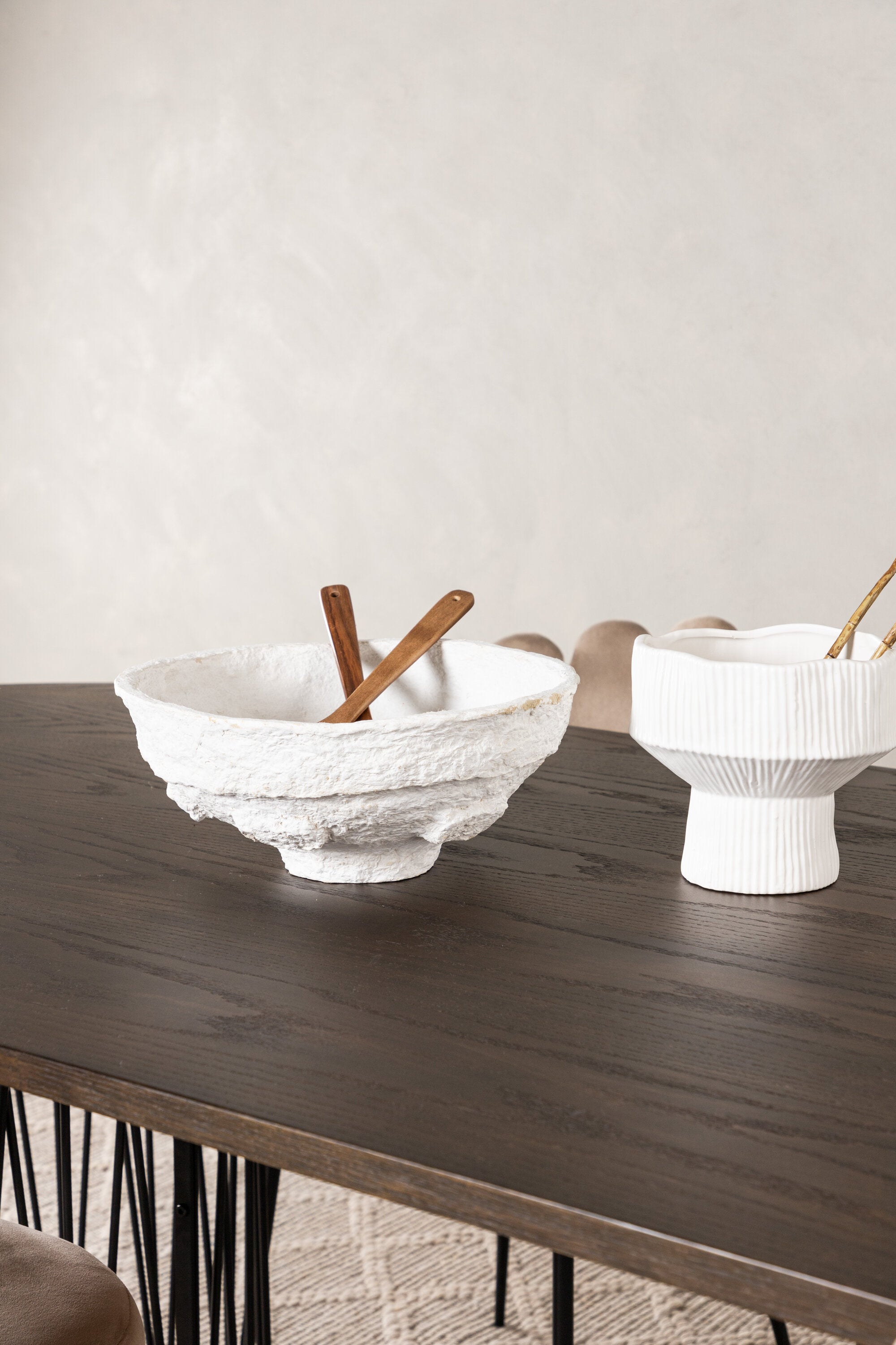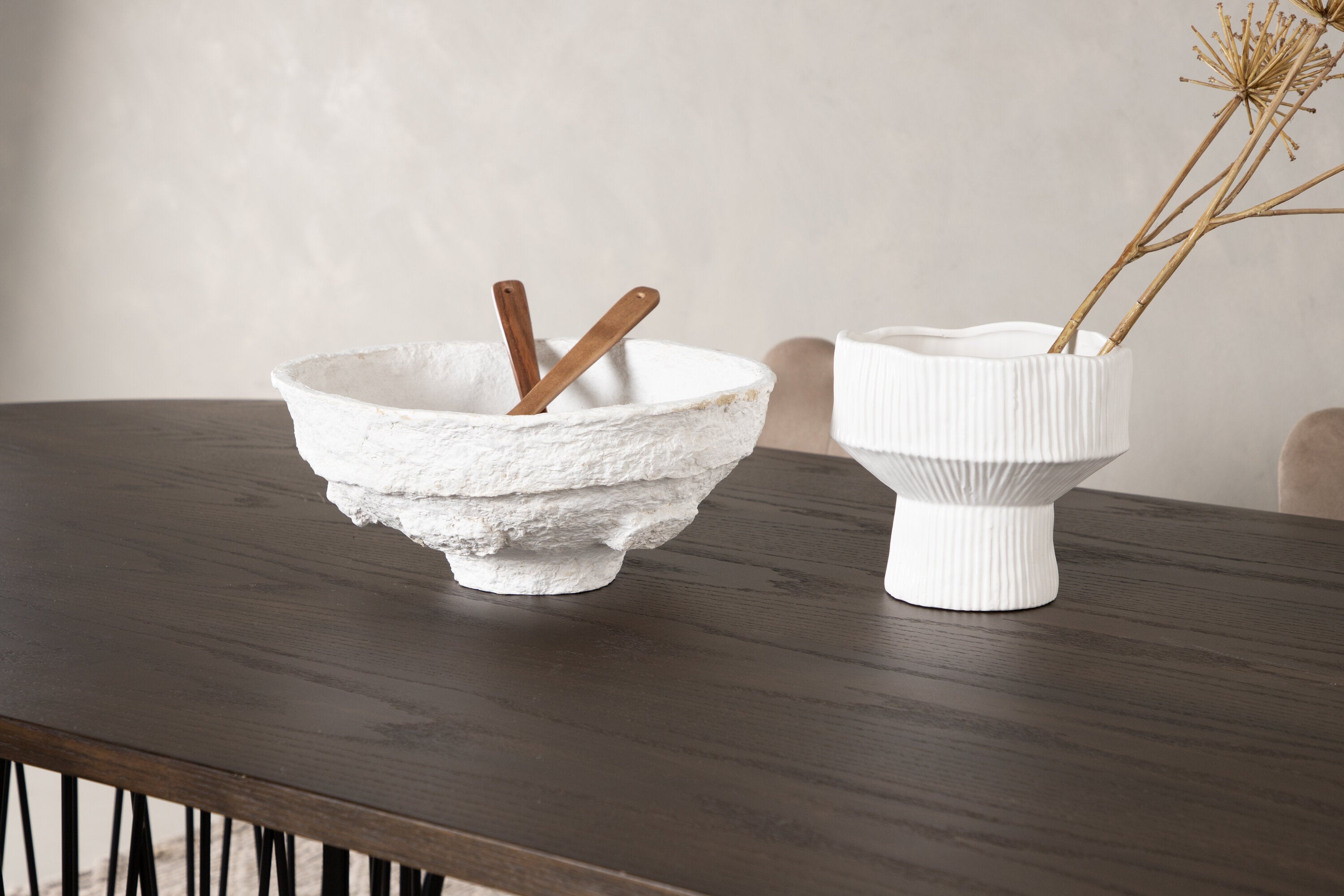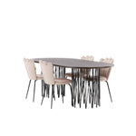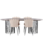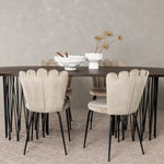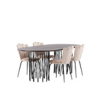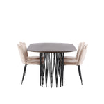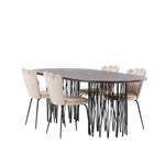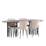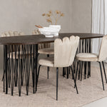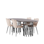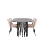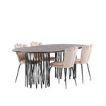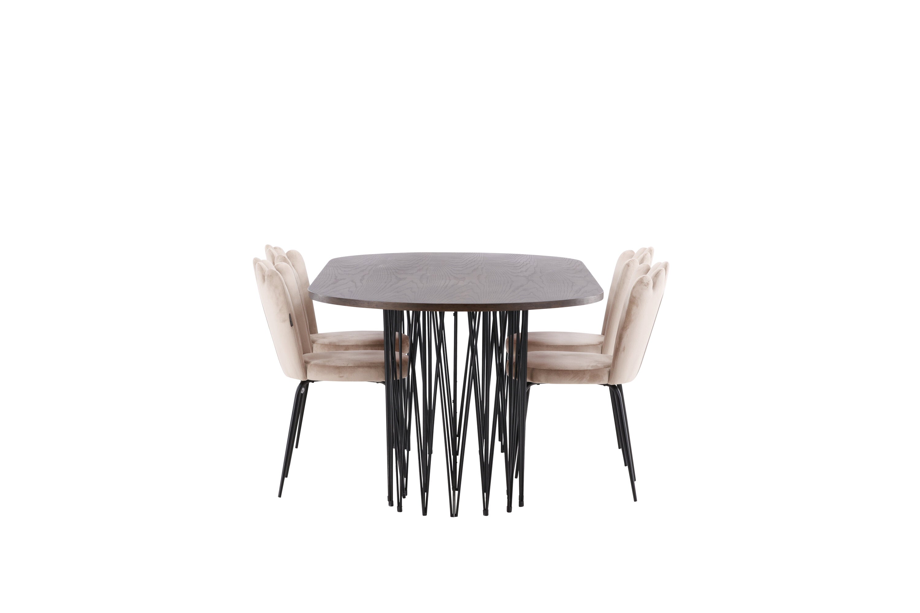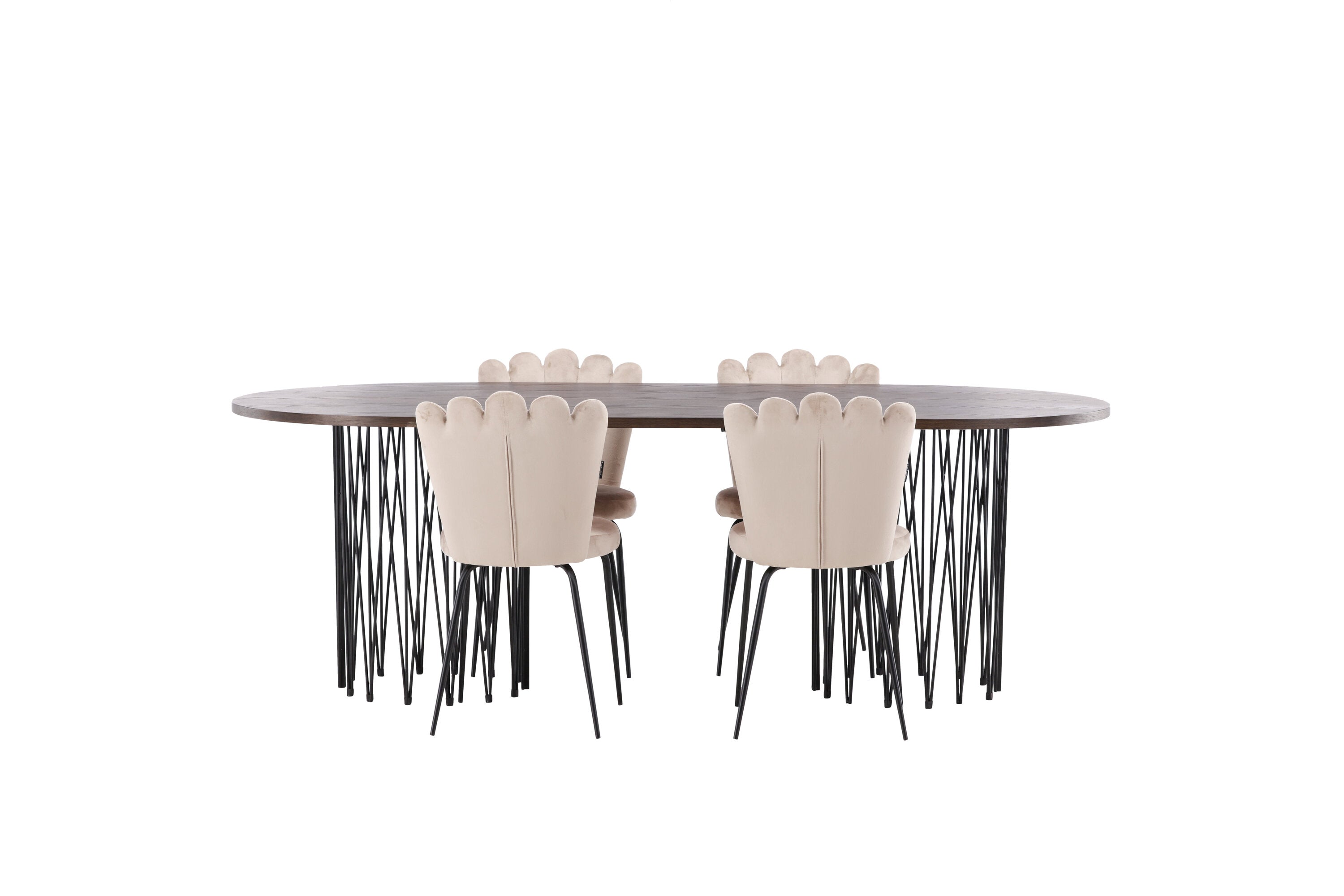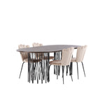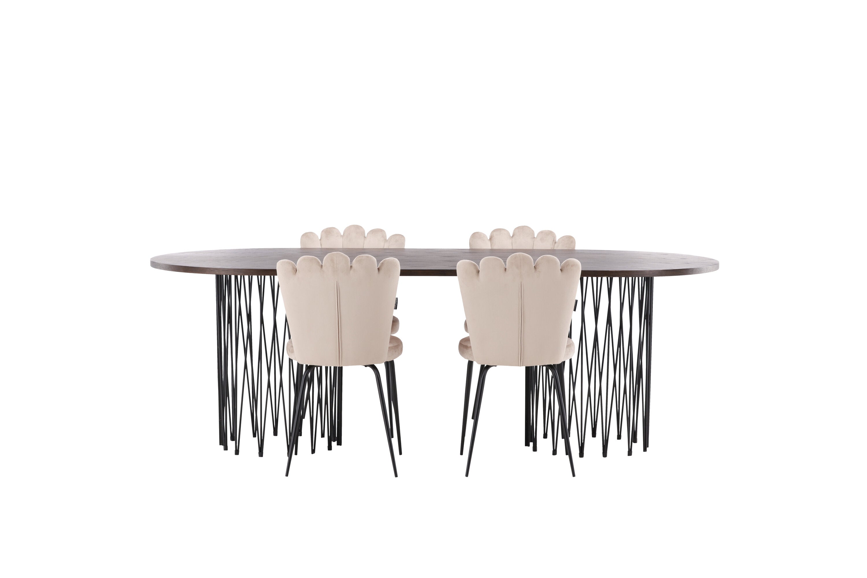 Vybavte srdce svého domova jídelním koutem, který vyzařuje luxus a pohodlí! Náš oválný jídelní stůl Stone má fantastický skandinávský design, který se hodí k davu. Stůl má krásnou hnědou desku z MDF s dýhou a dva ozdobné rámy ve tvaru válce v černém kovu. Zde v dokonalé kombinaci s našimi krásnými židlemi ze série Limhamn. Židle je moderním favoritem mnoha domácností se svým lákavým designem, ozdobným opěradlem ve tvaru mušle s ozdobným prošíváním a kulatým sedákem z vkusné béžové sametové látky. Nohy jsou z kovu s černou práškovou barvou. Pohodlně a velkolepě se usaďte!