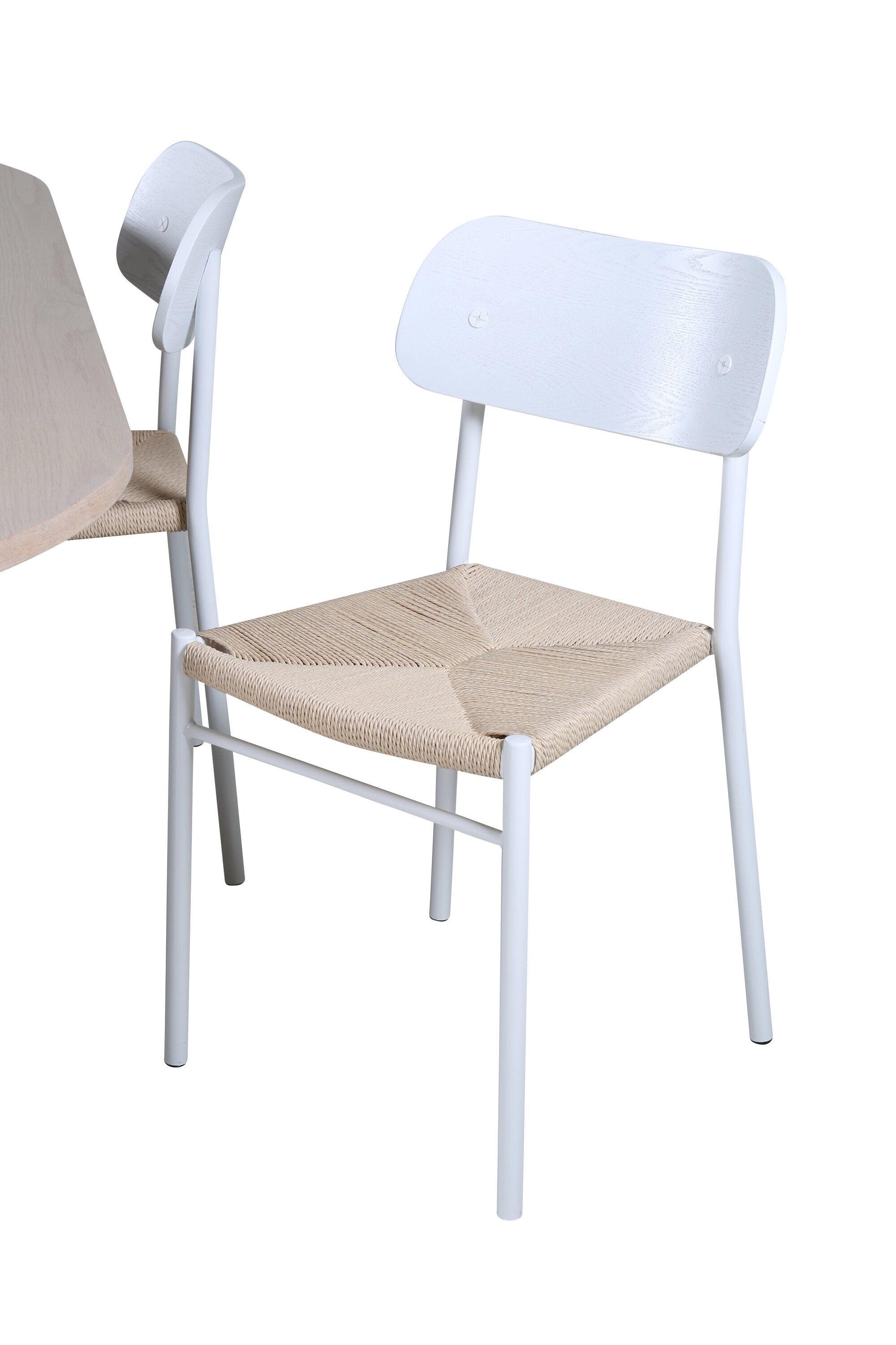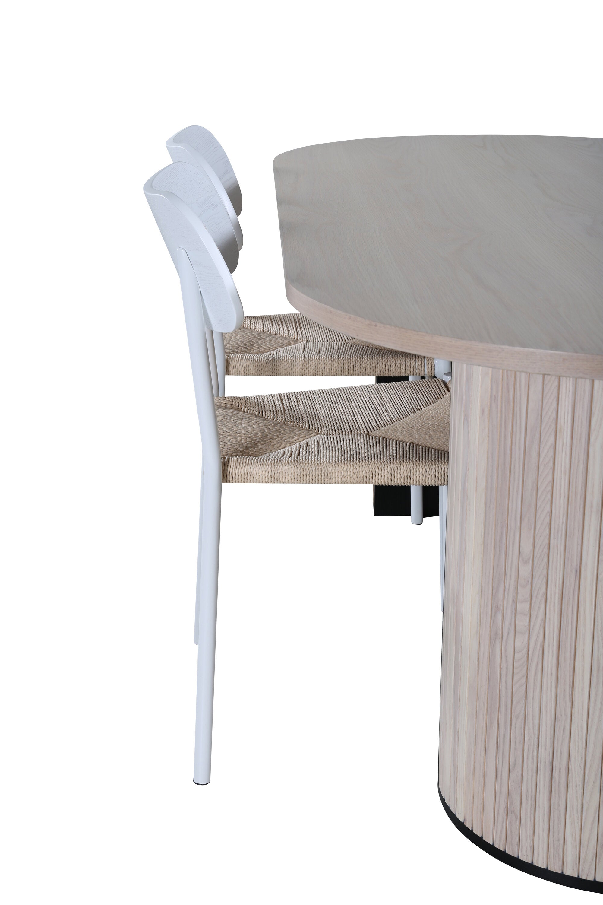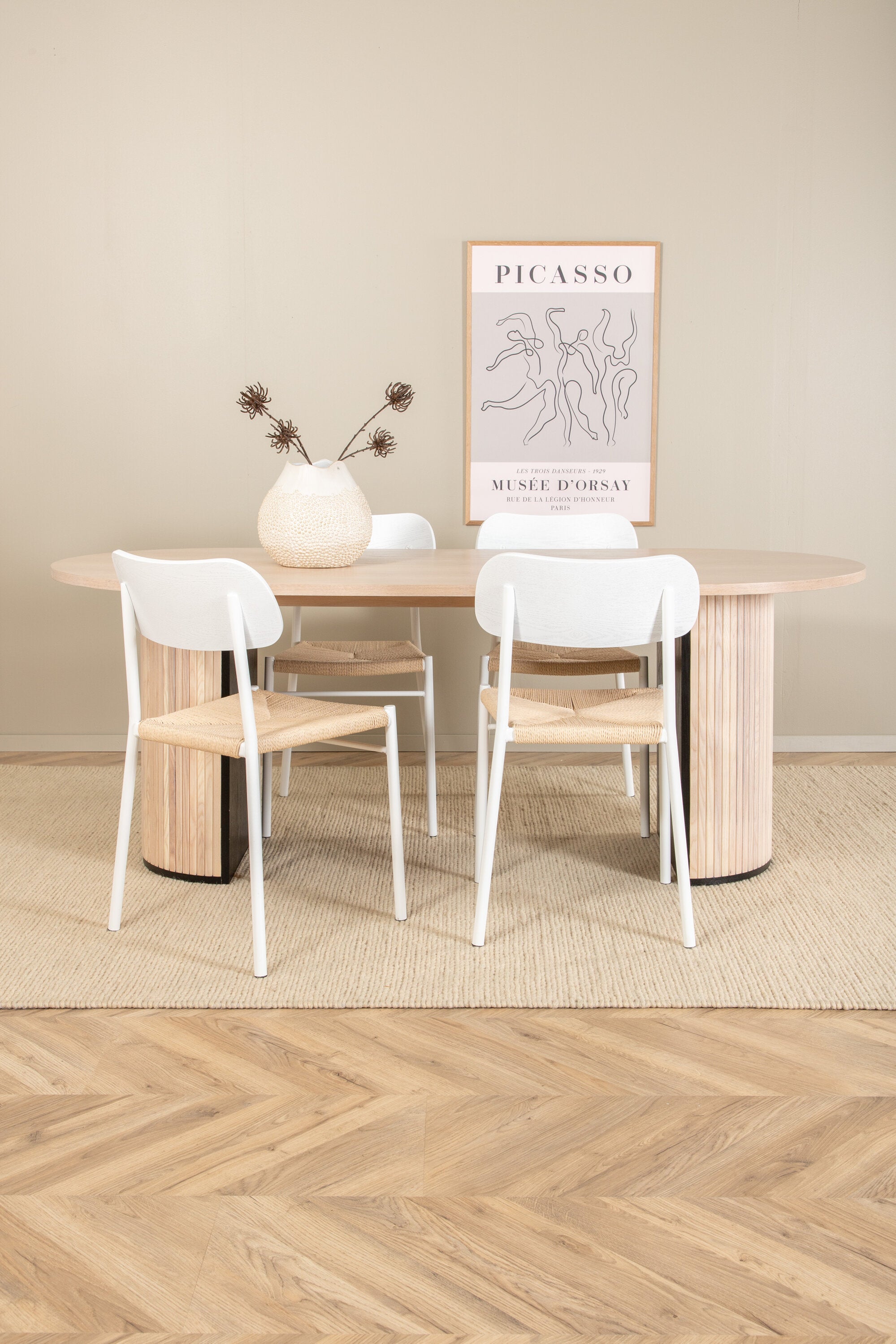 Dokonalá kombinace jak v barevné škále, tak v designu! Oválný jídelní stůl Bianca v omítnuté bílé barvě má ​​lahodný design se stolní deskou z kostěné bílé MDF s dýhou a robustním rámem ze dřeva a MDF v žebrovaném provedení, který působí stabilním dojmem. Rozměry stolu: Délka: 200 cm, Šířka: 90 cm, Výška: 75 cm. Zde společně se 4 jídelními židlemi Polly v bílé barvě, sedákem z přírodního lana a kovovými nohami židle. Rozměry židle: výška: 88 cm, výška sedáku: 47 cm, šířka: 42 cm, hloubka: 55 cm. Nechte srdce domova charakterizovat vaši novou, poutavou skupinu potravin.