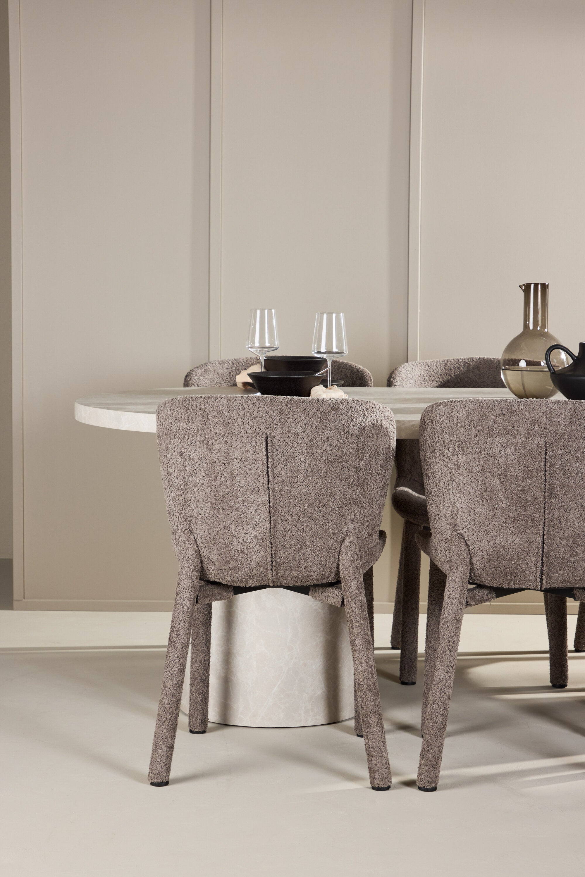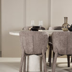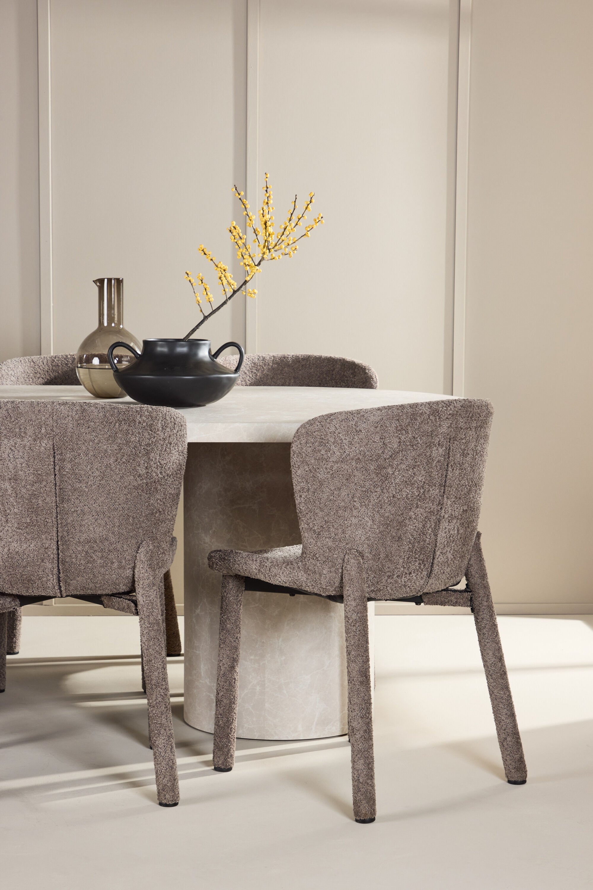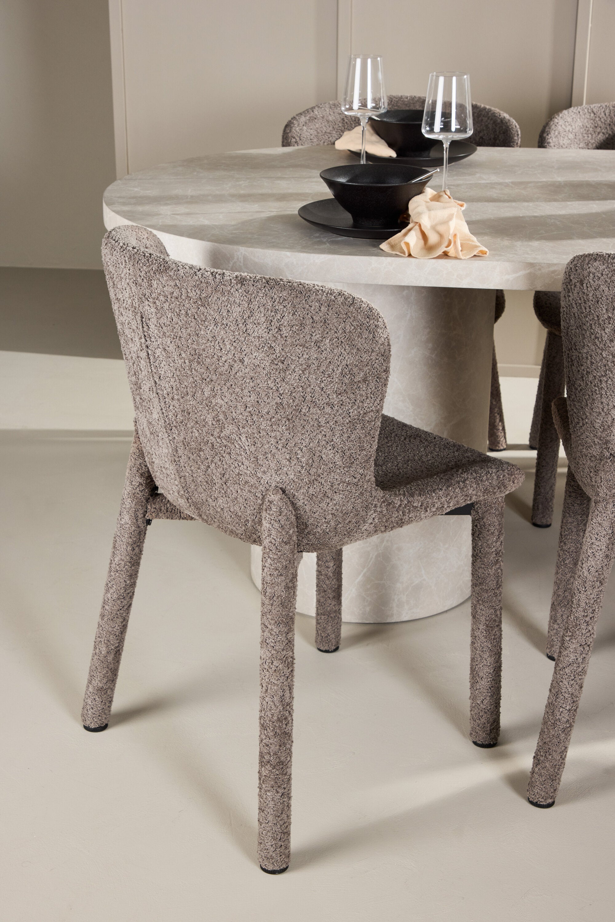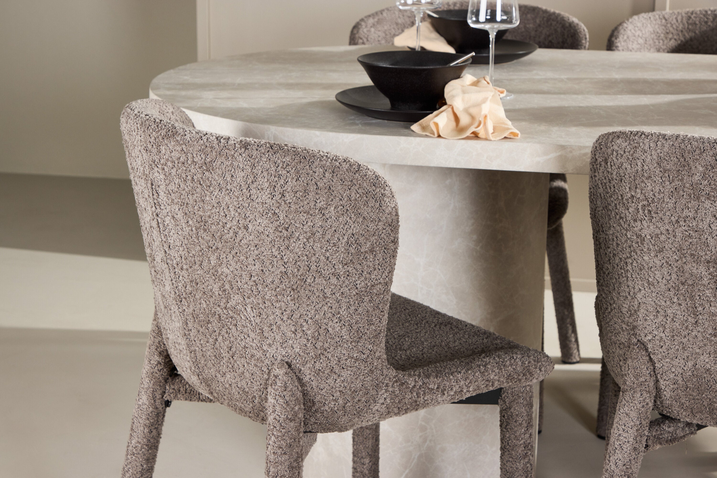 Ke stolu se hodí jídelní židle Astoria, čalouněná luxusním hnědým buclé. Sytá, teplá barva a měkká textura dělají ze židle výrazný prvek ve vaší jídelně. Astoria je stejně příjemná na pohled jako na sezení a nabízí pohodlný a relaxační zážitek ze stolování díky svému ergonomickému opěradlu a velkoryse polstrovanému sedadlu. Nadčasový design židle hladce zapadne do moderního i klasického interiéru a dodá vašemu jídelnímu koutu sofistikovaný nádech.