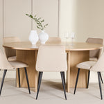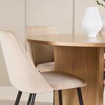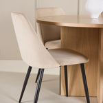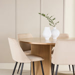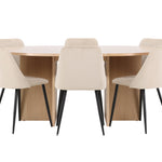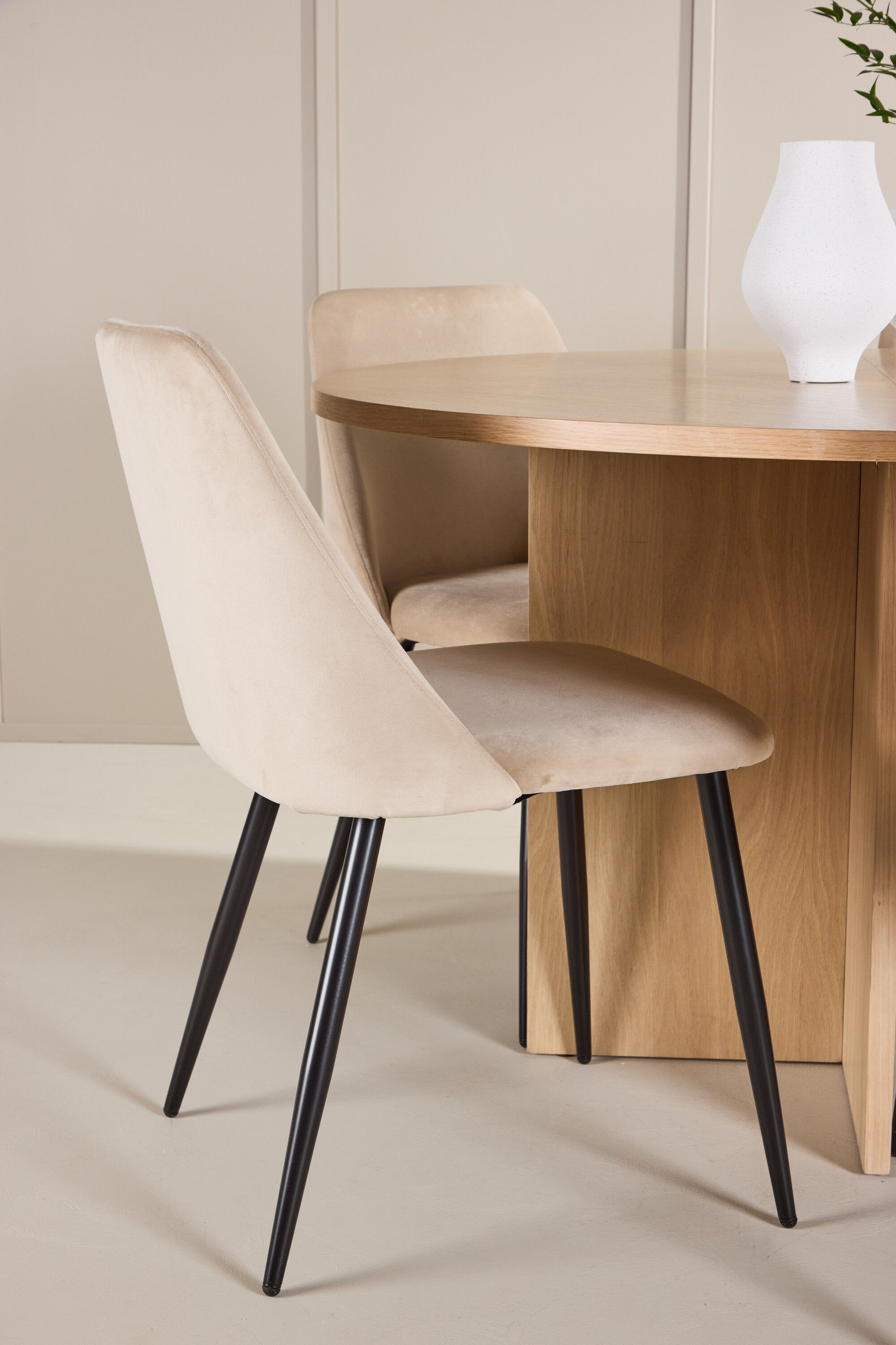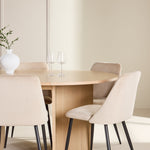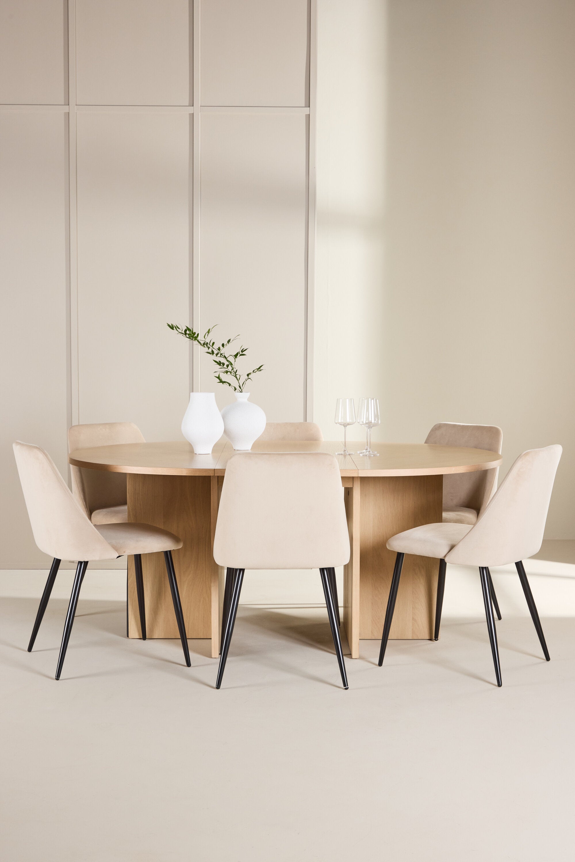 Jídelní židle Night a jídelní stůl Strada společně vytvářejí jídelní kout, který kombinuje pohodlí, styl a funkčnost. Luxusní sametové čalounění a elegantní černé nohy židle Night dokonale doplňují flexibilní, nabílený design stolu Strada, díky čemuž je tato kombinace elegantním a praktickým středobodem vašeho domova.