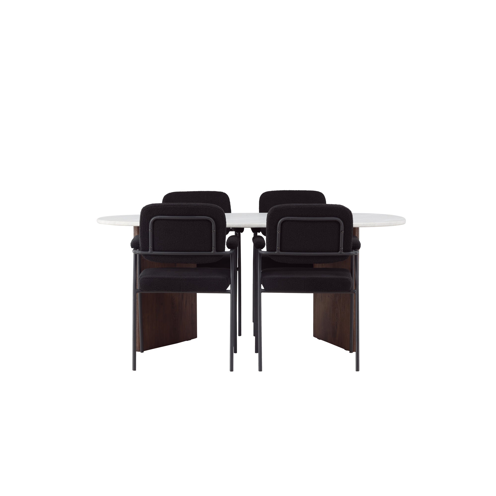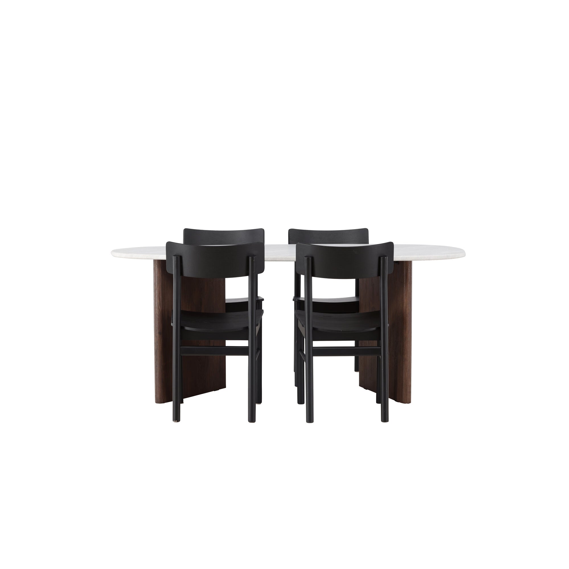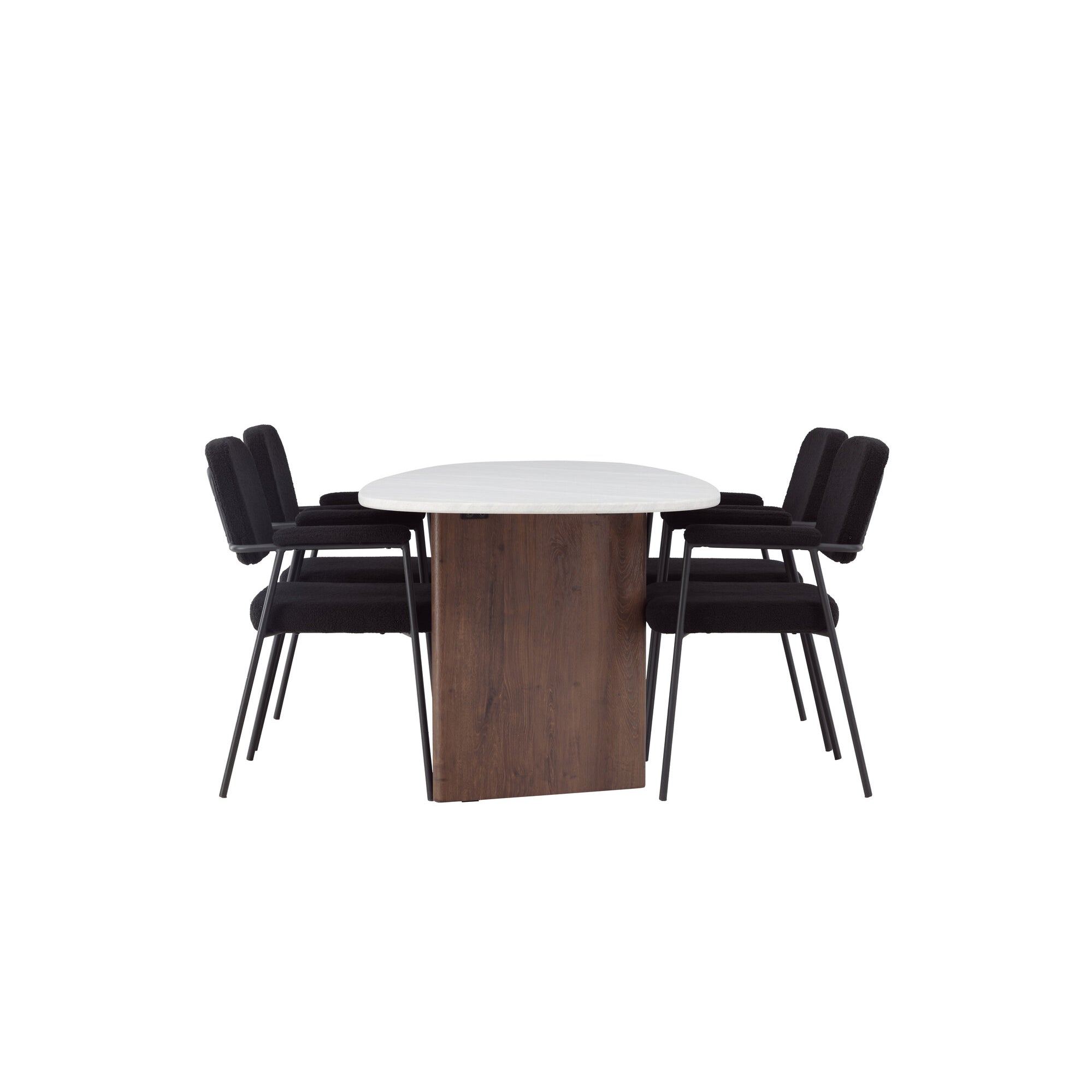 Kamenný oválný jídelní stůl – černá / mocca dýha + jídelní židle Polar – černé nohy – černá látka _6