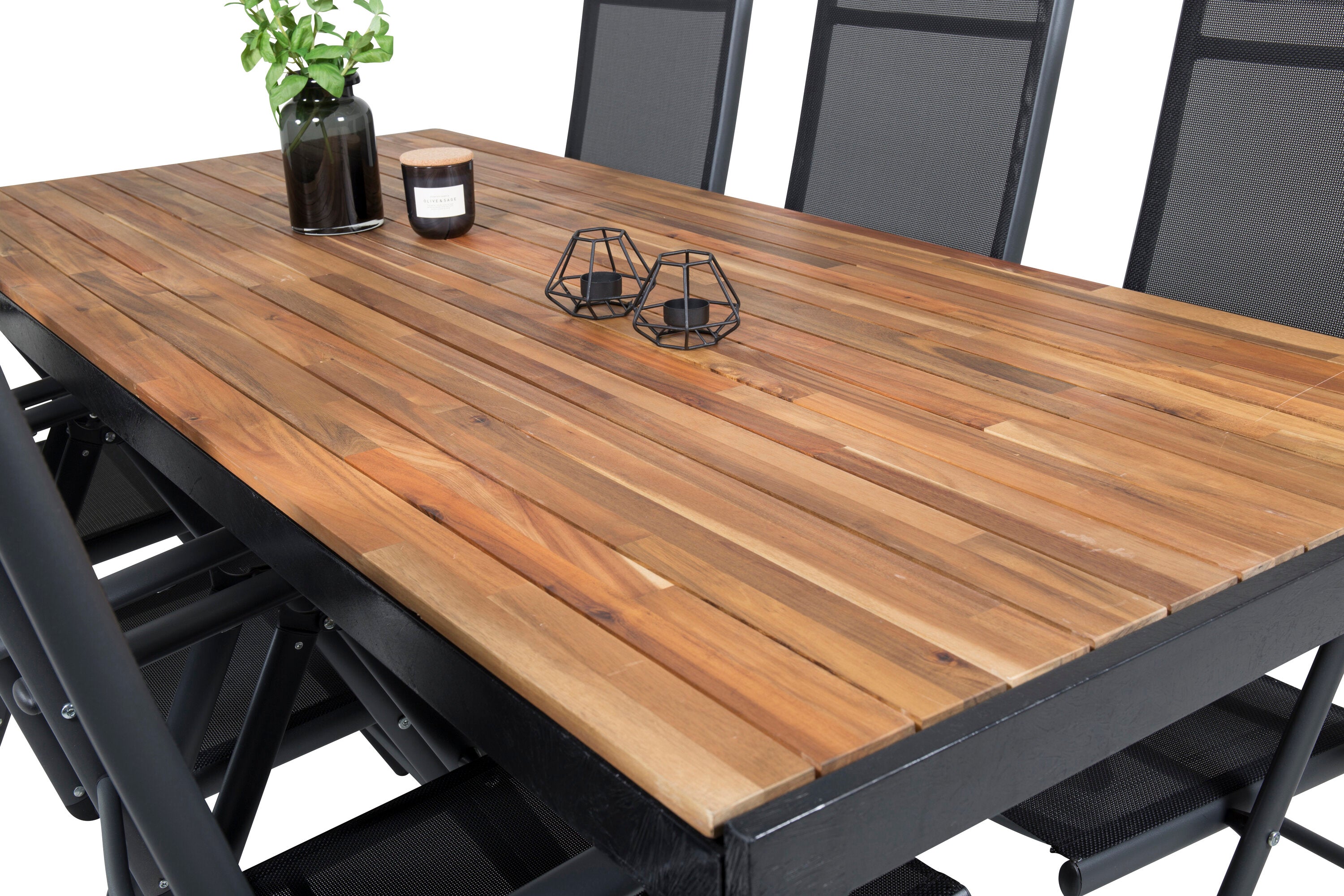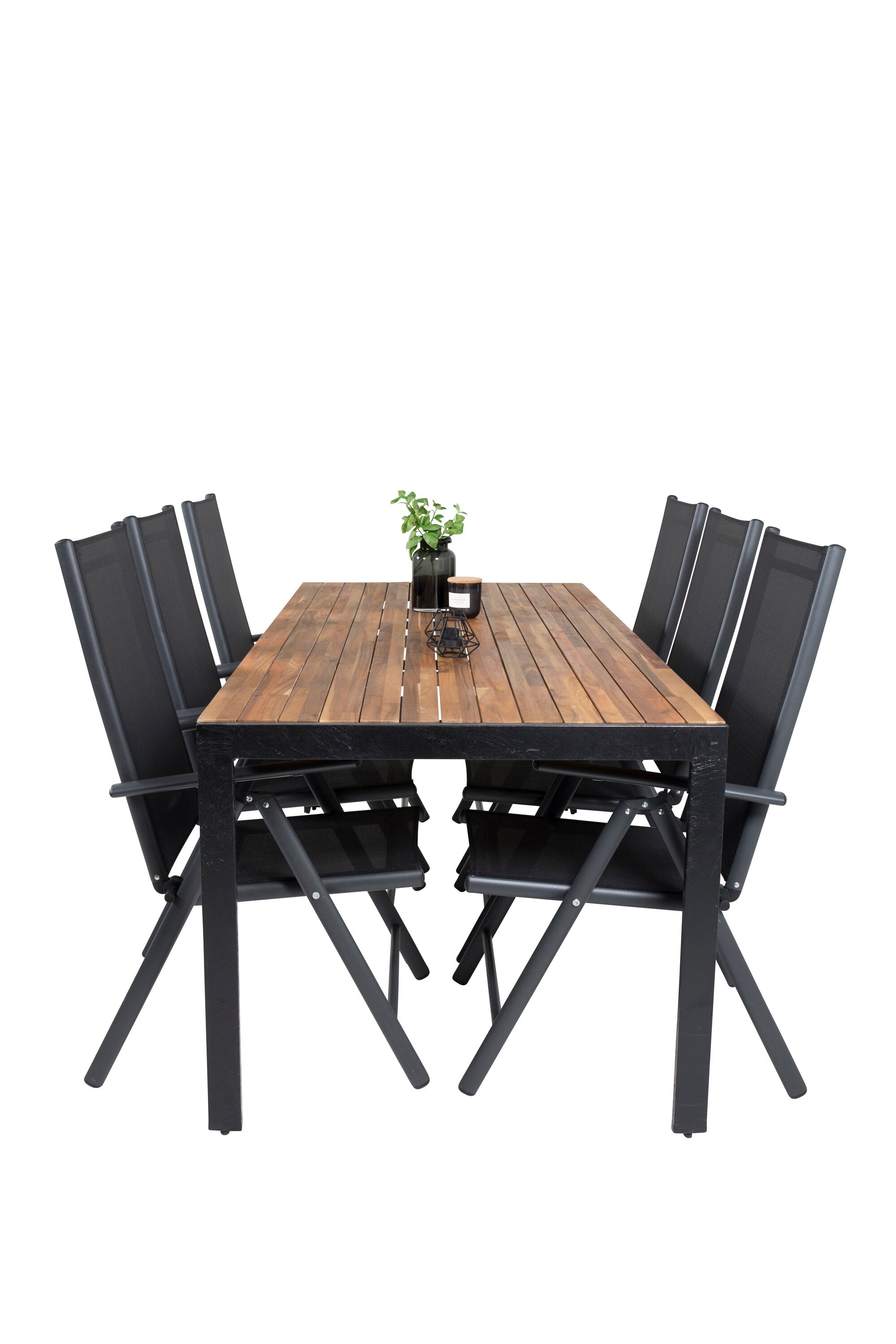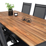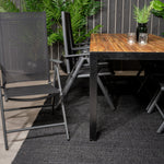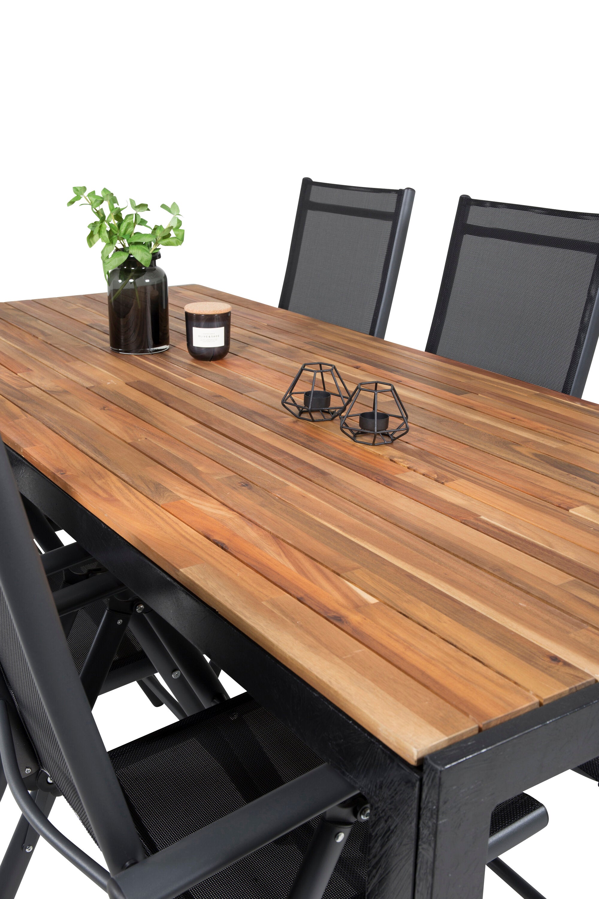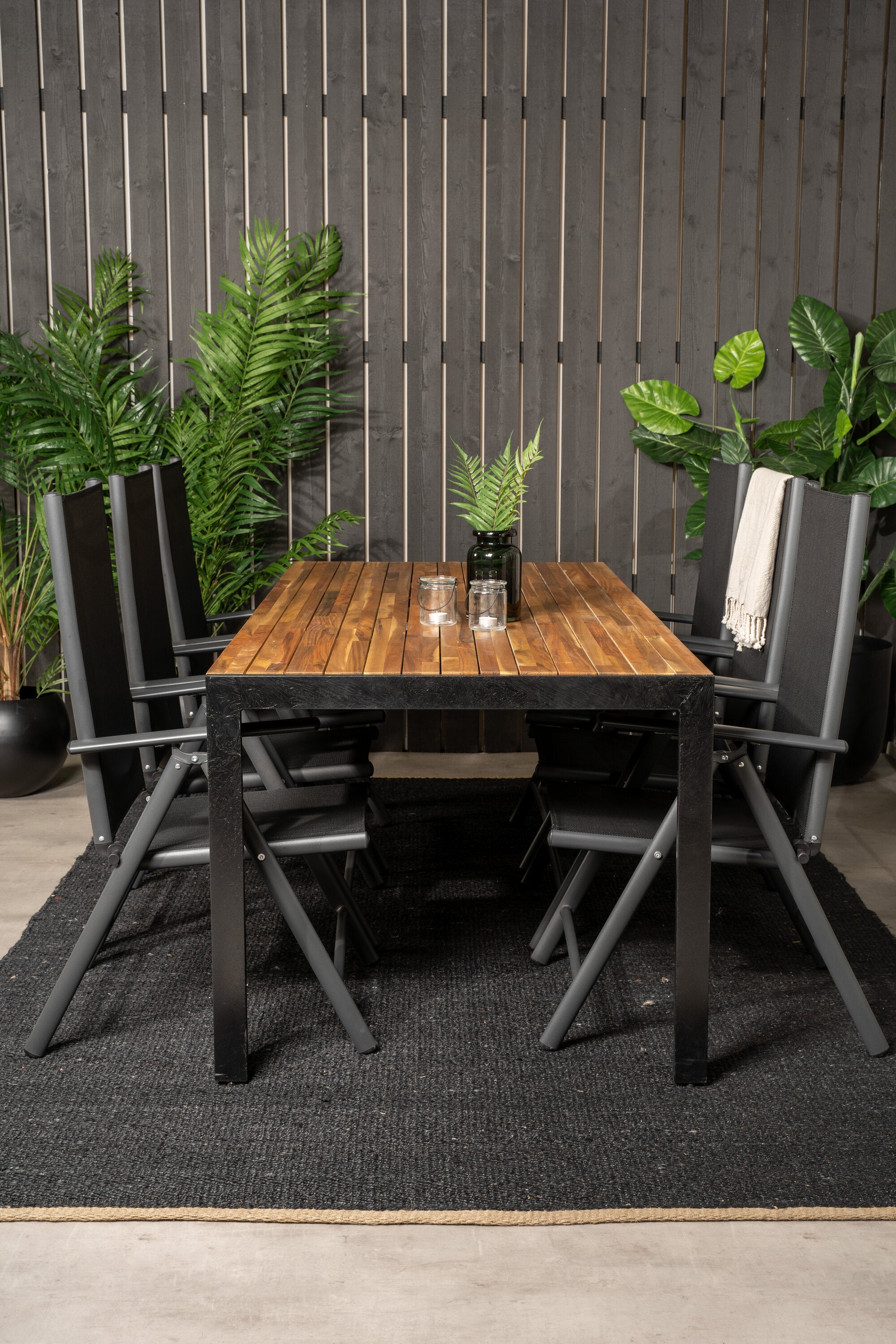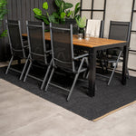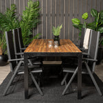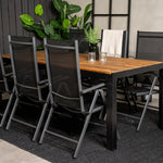 Jídelní stůl Boi v černé hliníkové konstrukci s pěknou stolní deskou z akácie. Zde společně s našimi 5-ti polohovými židlemi Break. Udělejte si místo pro dlouhé a pohodlné letní večeře!