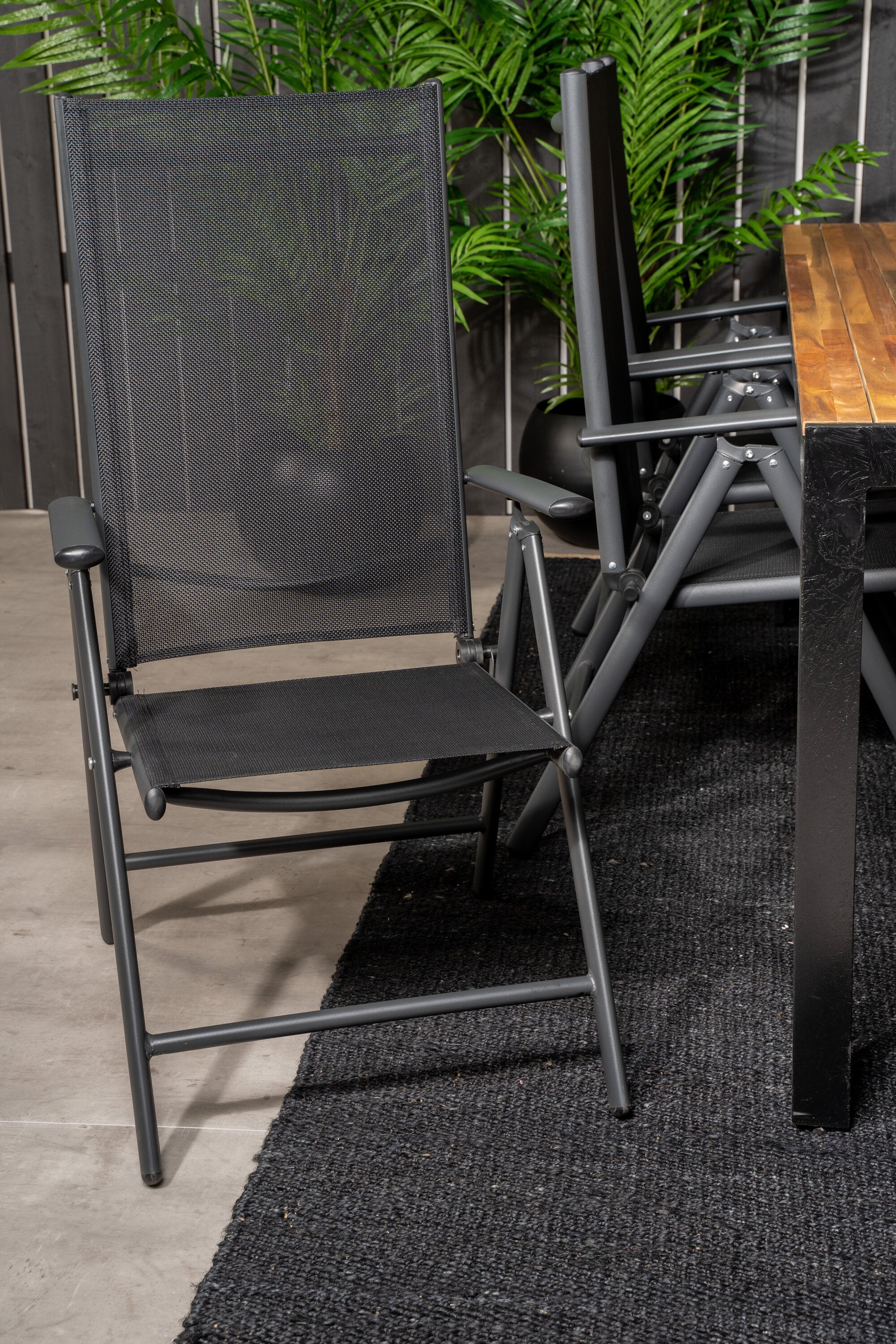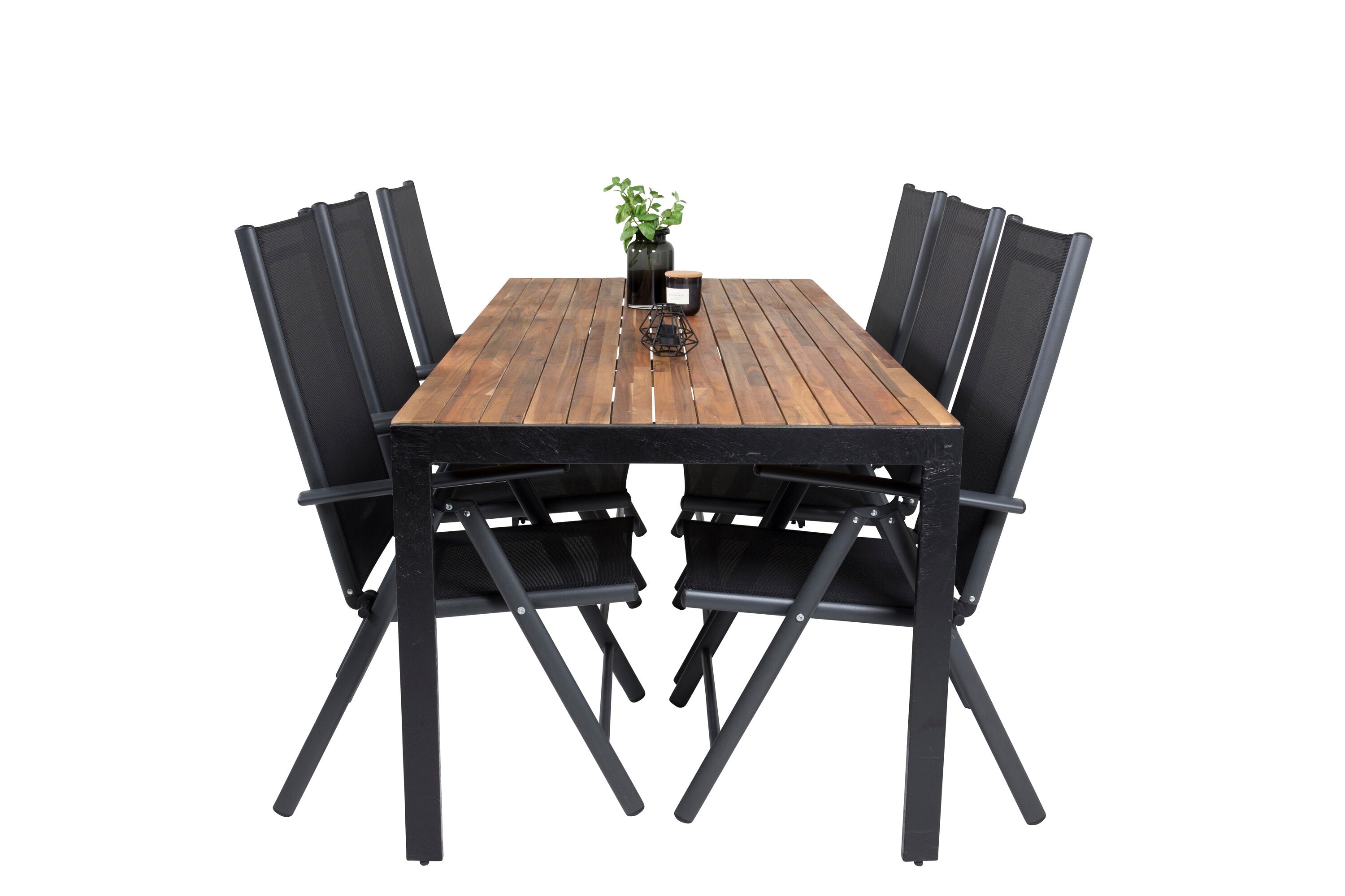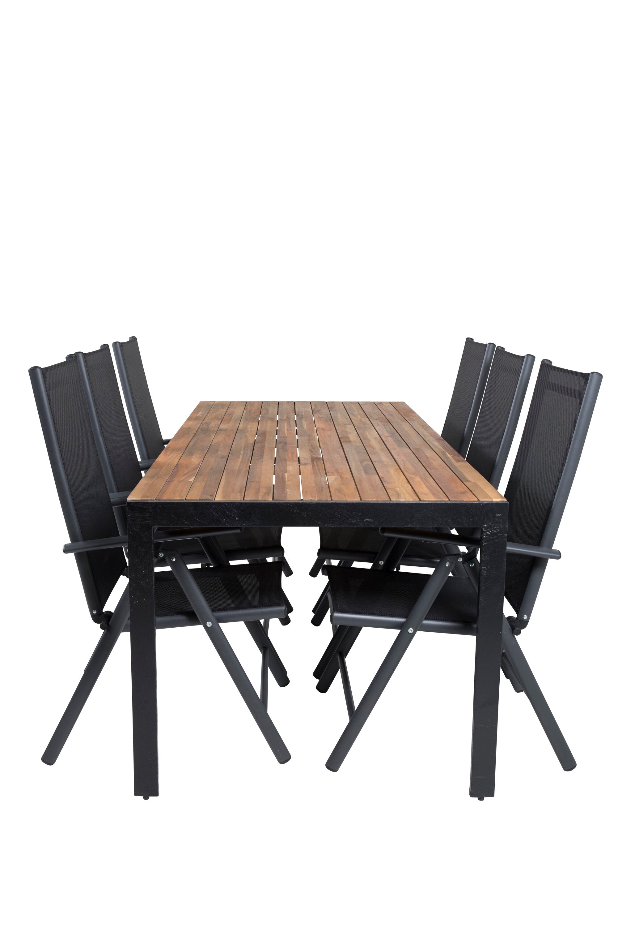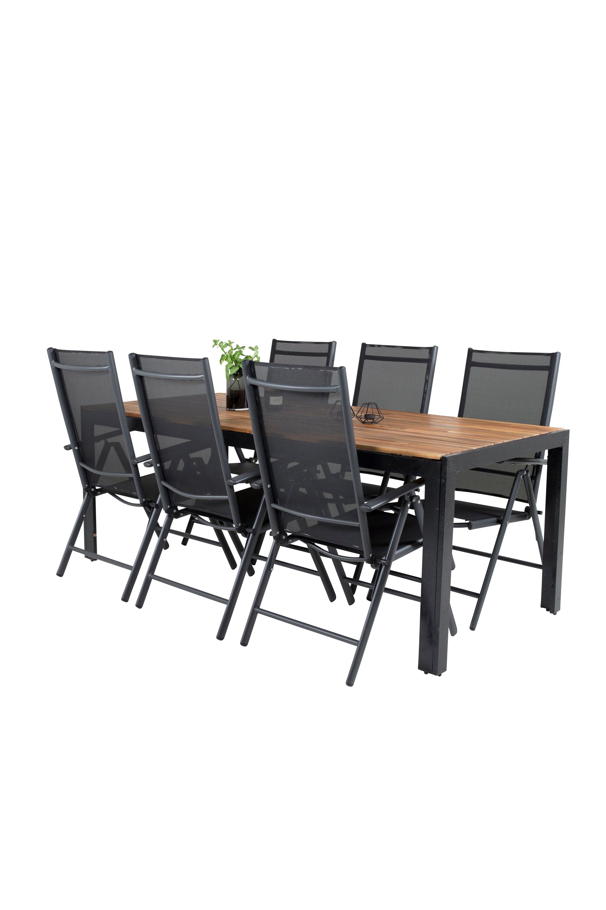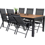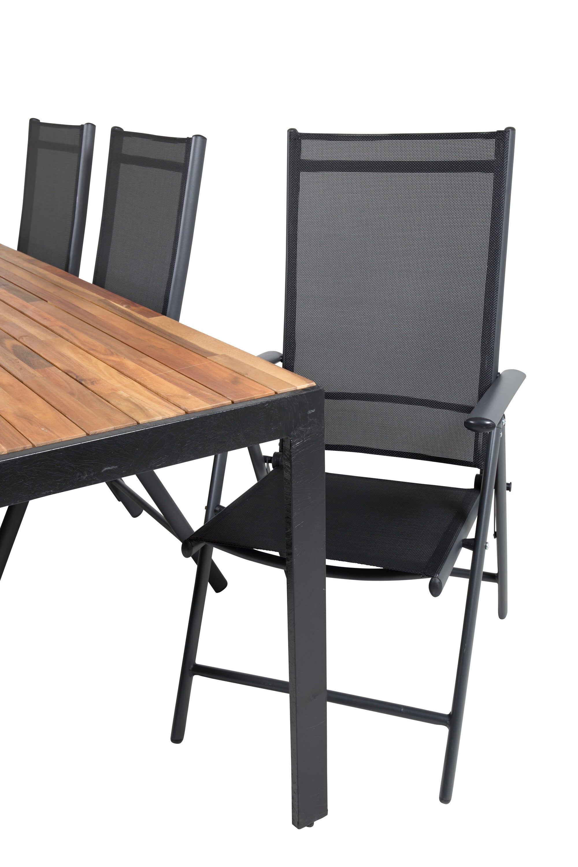 Jídelní stůl Boi v černé hliníkové konstrukci s pěknou stolní deskou z akácie. Zde společně s našimi 5-ti polohovými židlemi Break. Udělejte si místo pro dlouhé a pohodlné letní večeře!