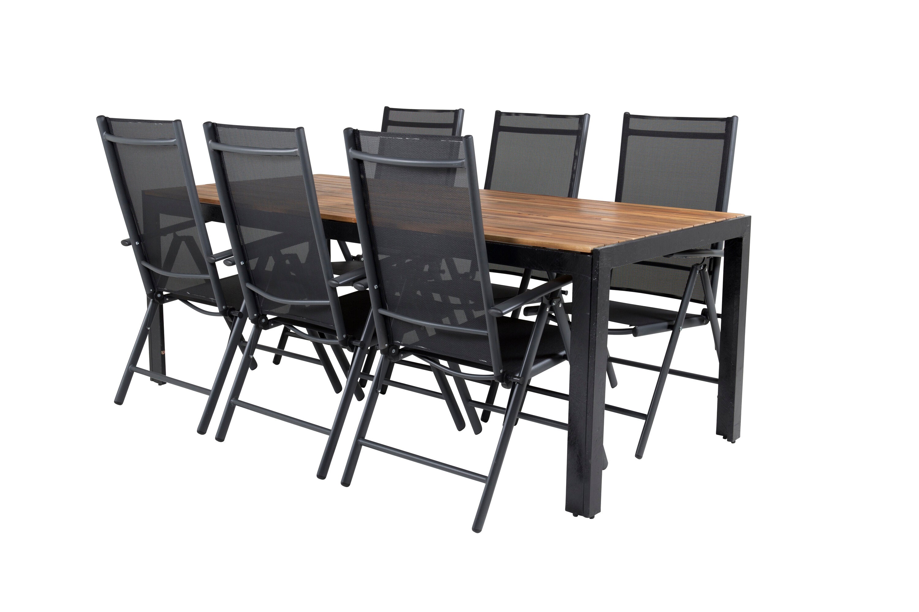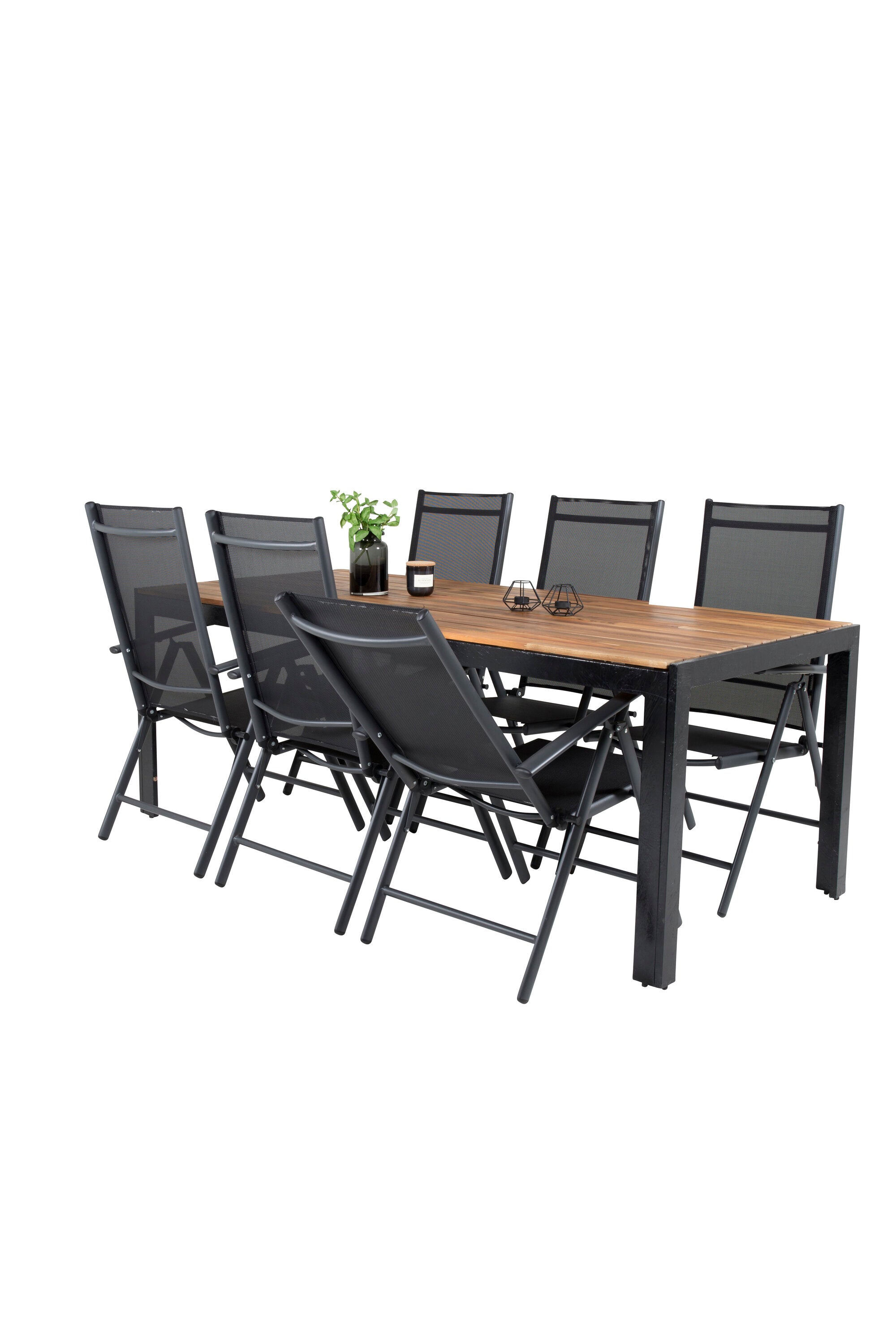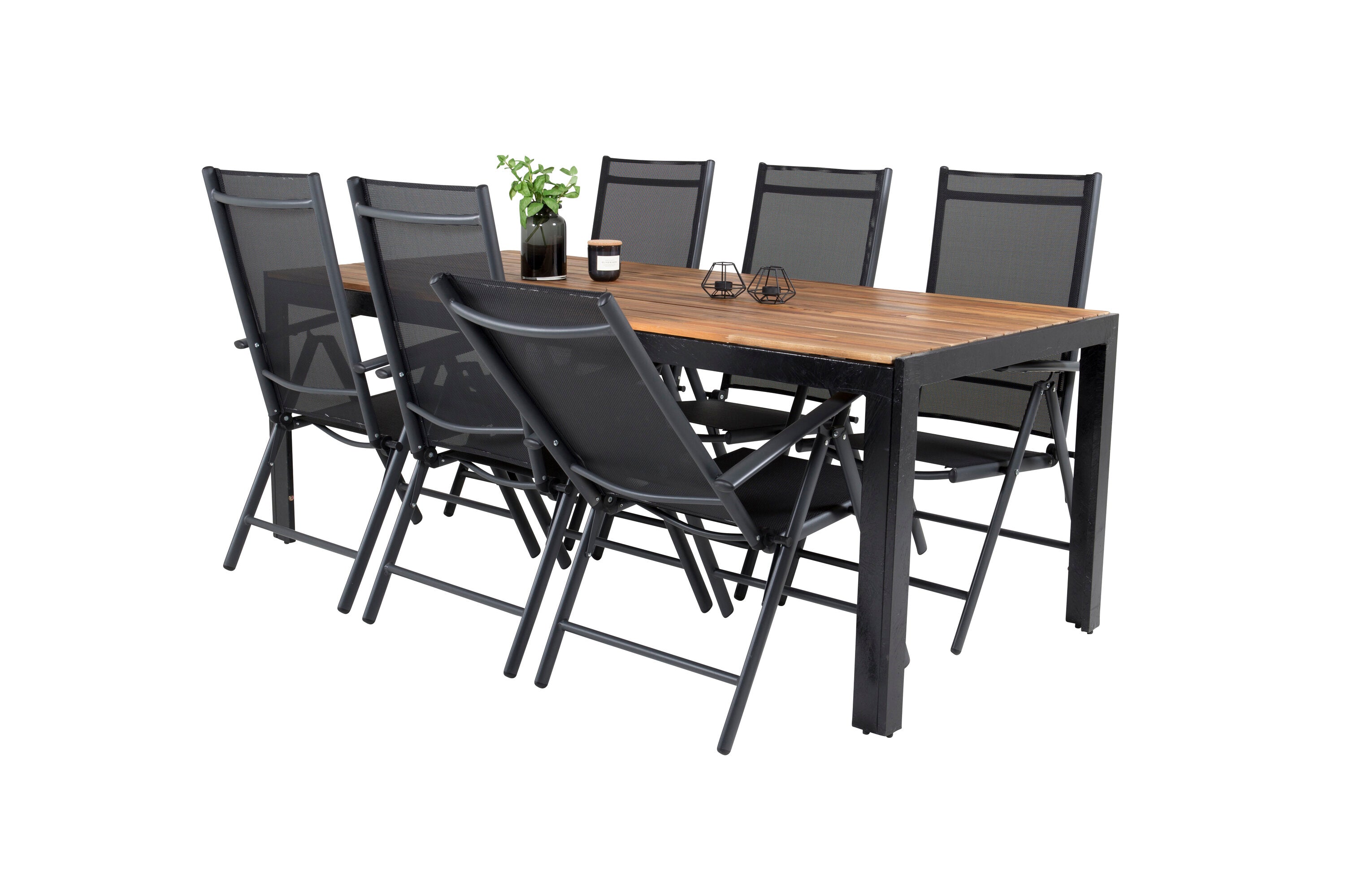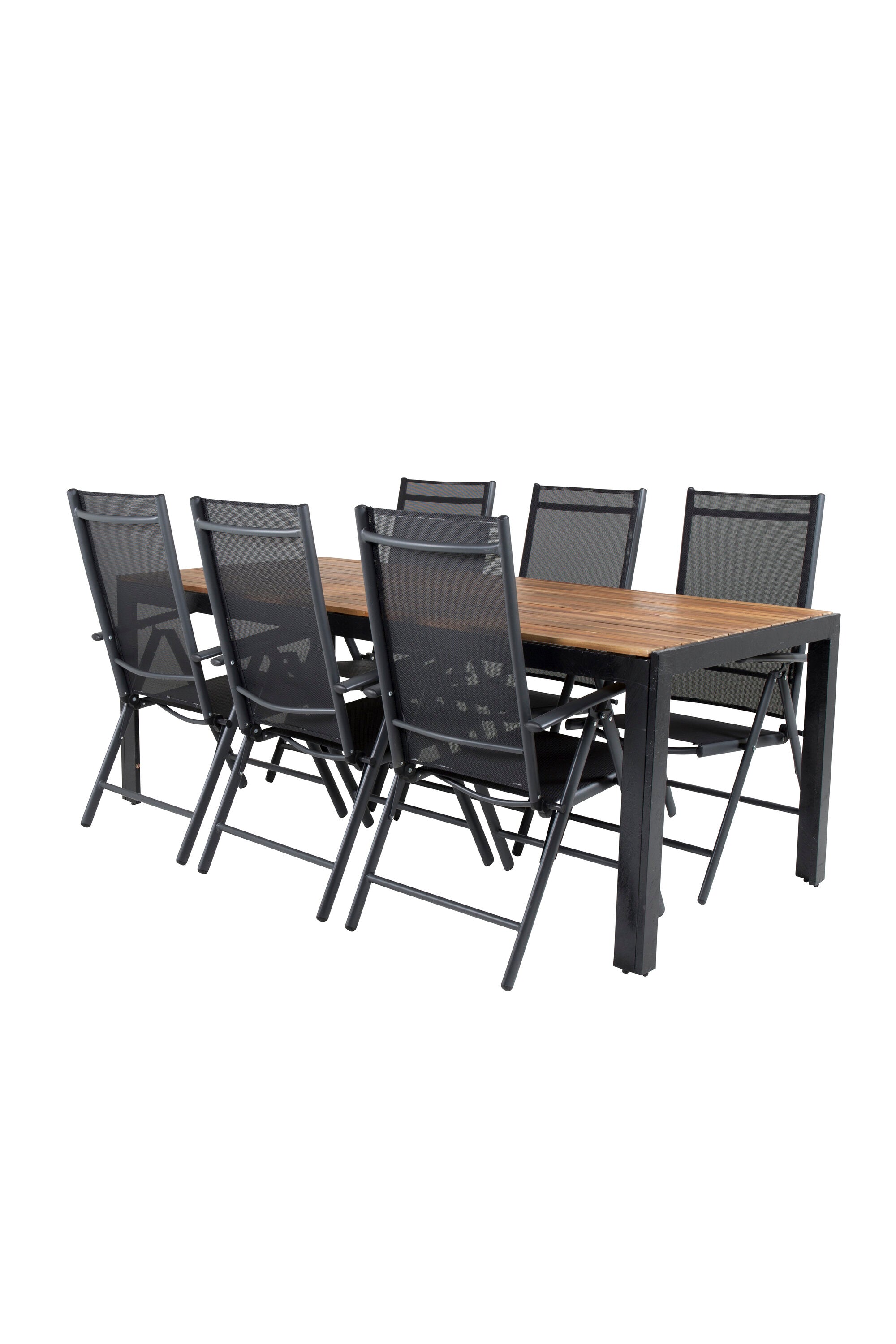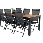 Jídelní stůl Boi v černé hliníkové konstrukci s pěknou stolní deskou z akácie. Zde společně s našimi 5-ti polohovými židlemi Break. Udělejte si místo pro dlouhé a pohodlné letní večeře!