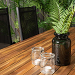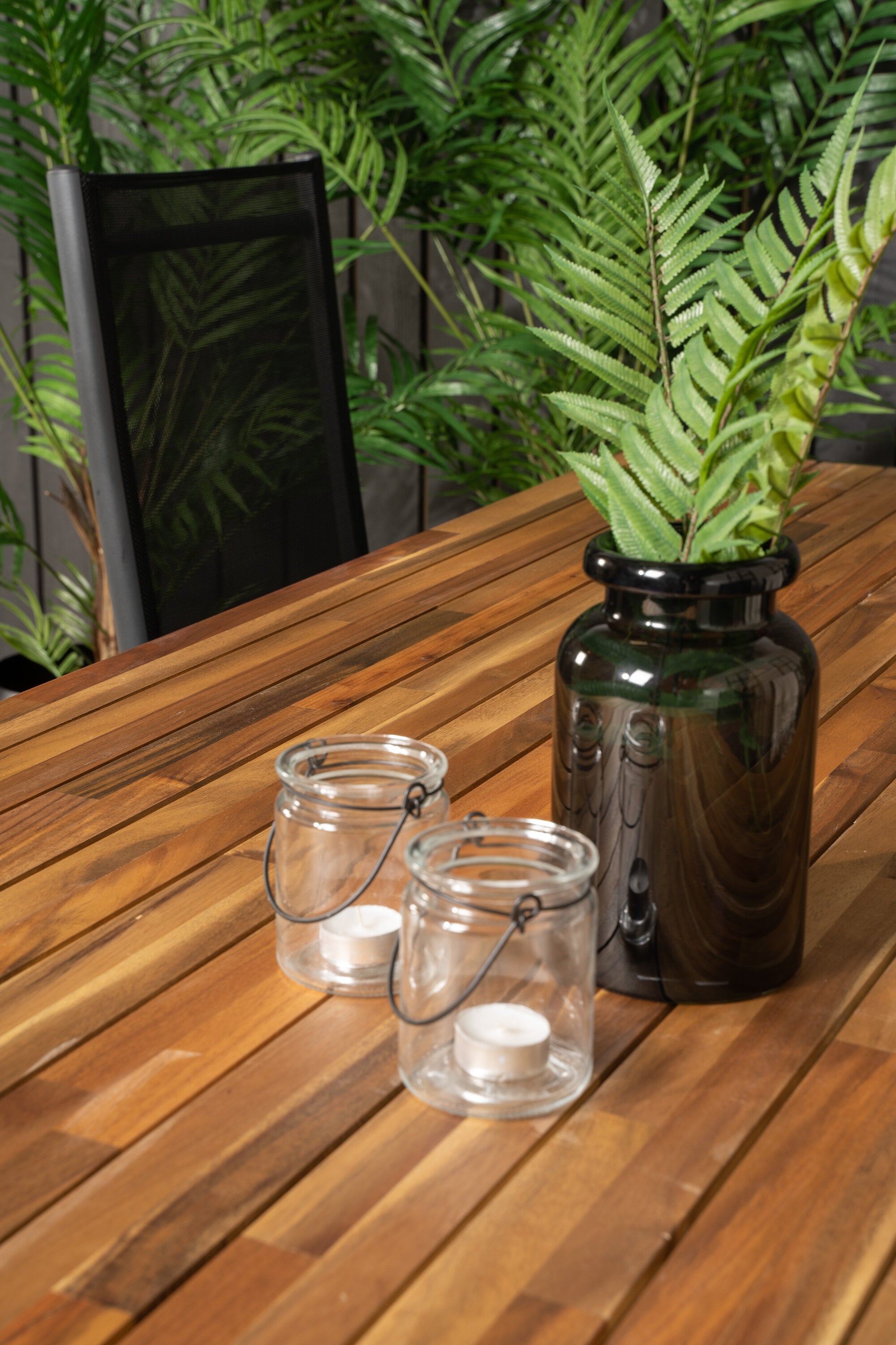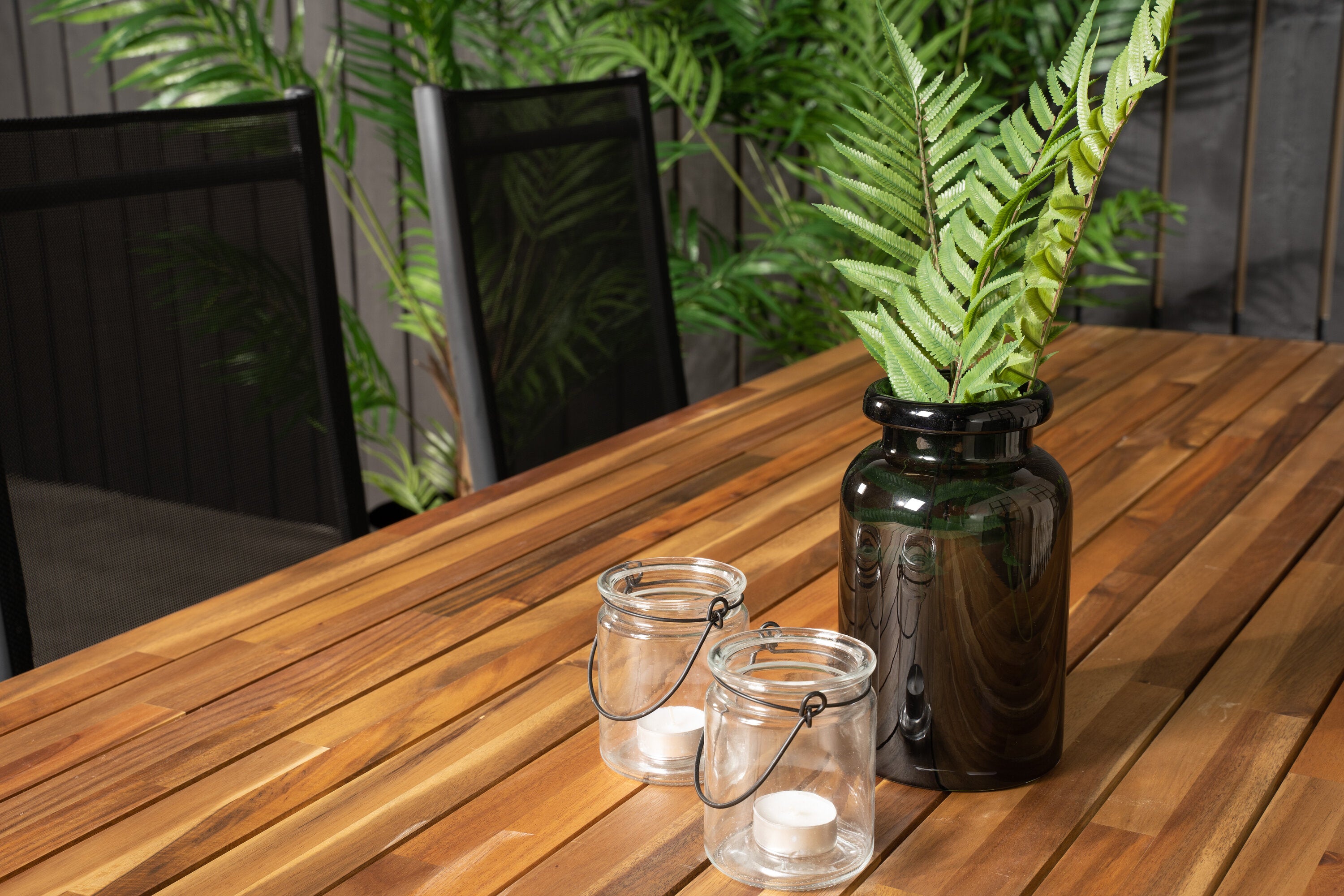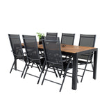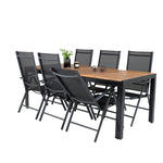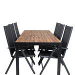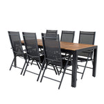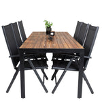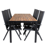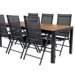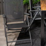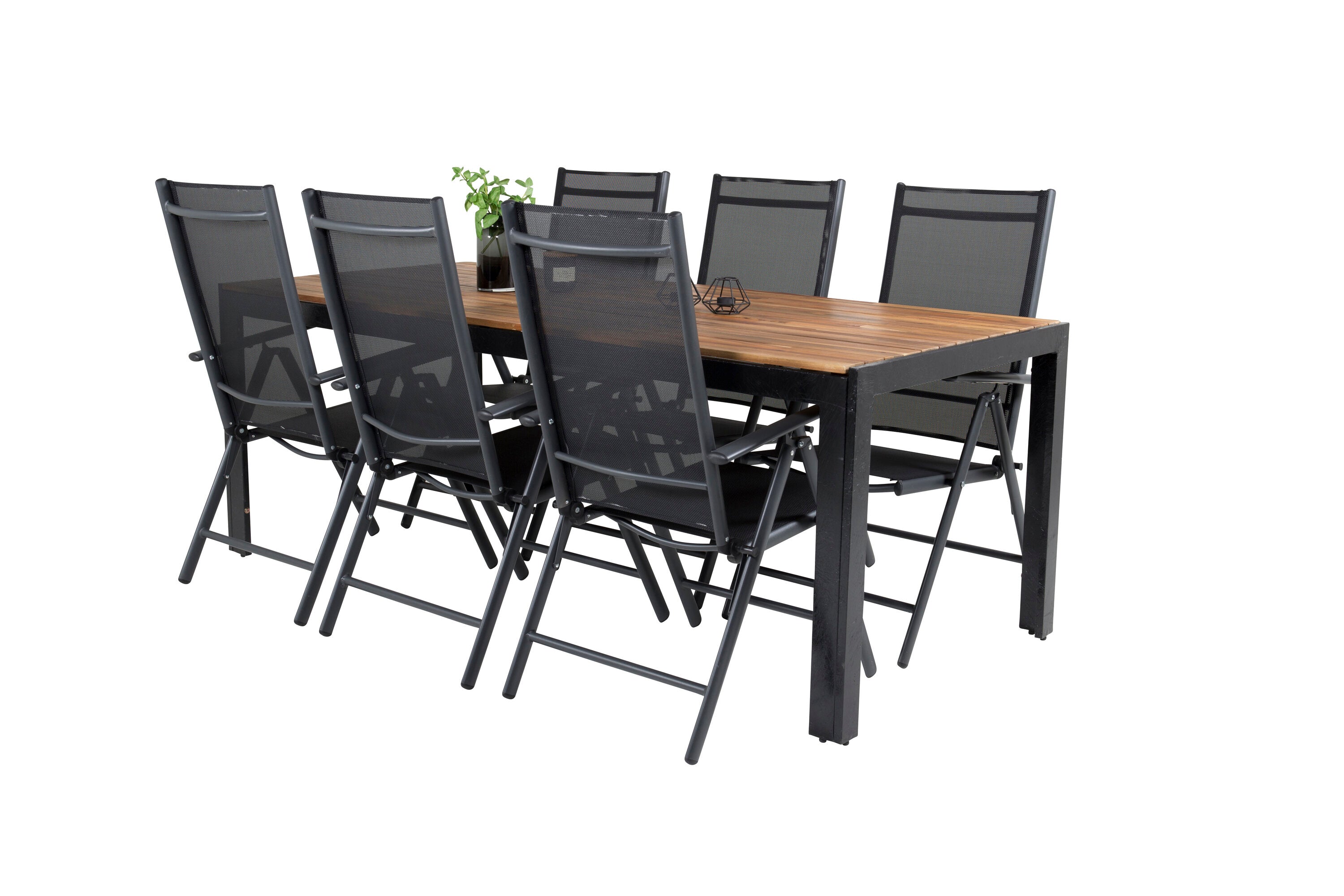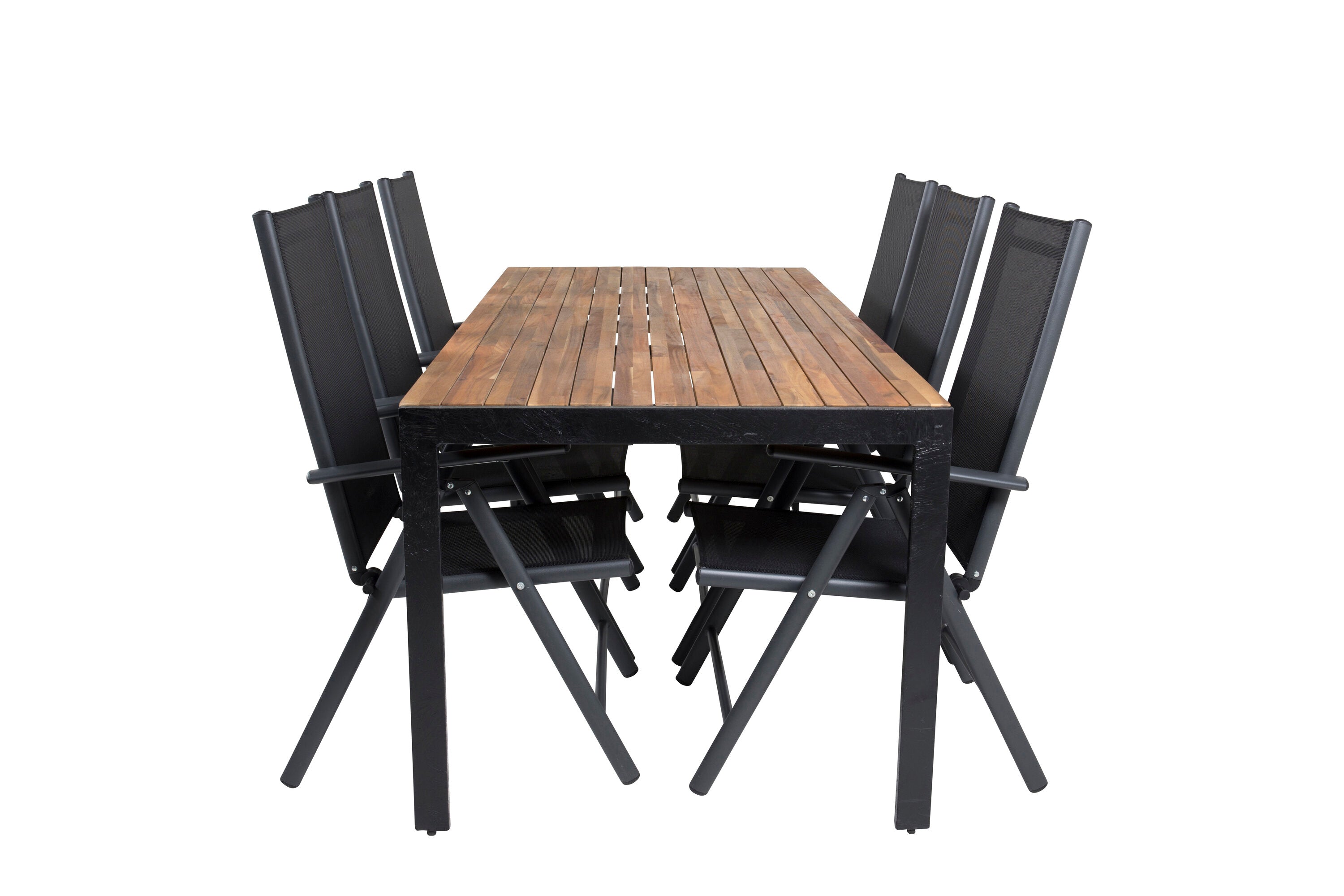 Jídelní stůl Boi v černé hliníkové konstrukci s pěknou stolní deskou z akácie. Zde společně s našimi 5-ti polohovými židlemi Break. Udělejte si místo pro dlouhé a pohodlné letní večeře!