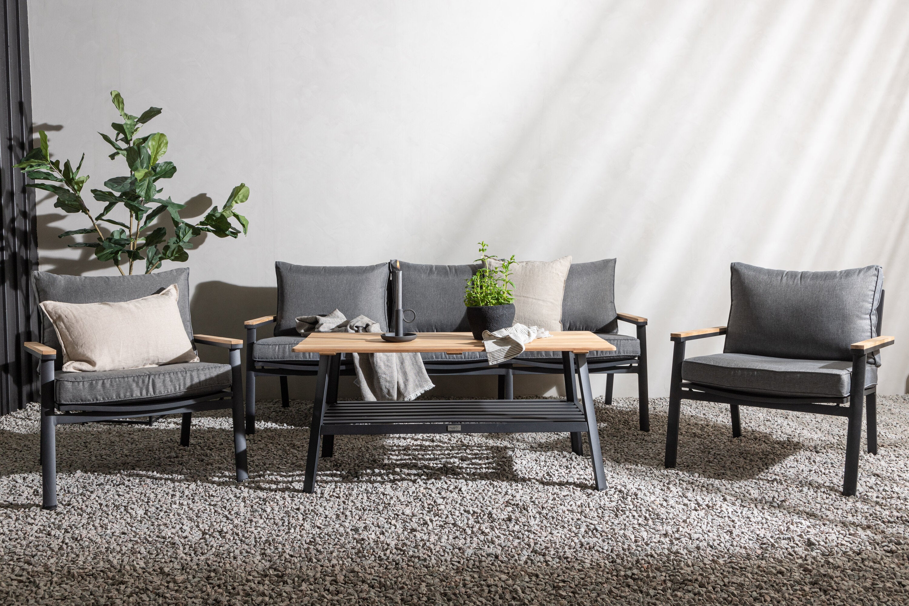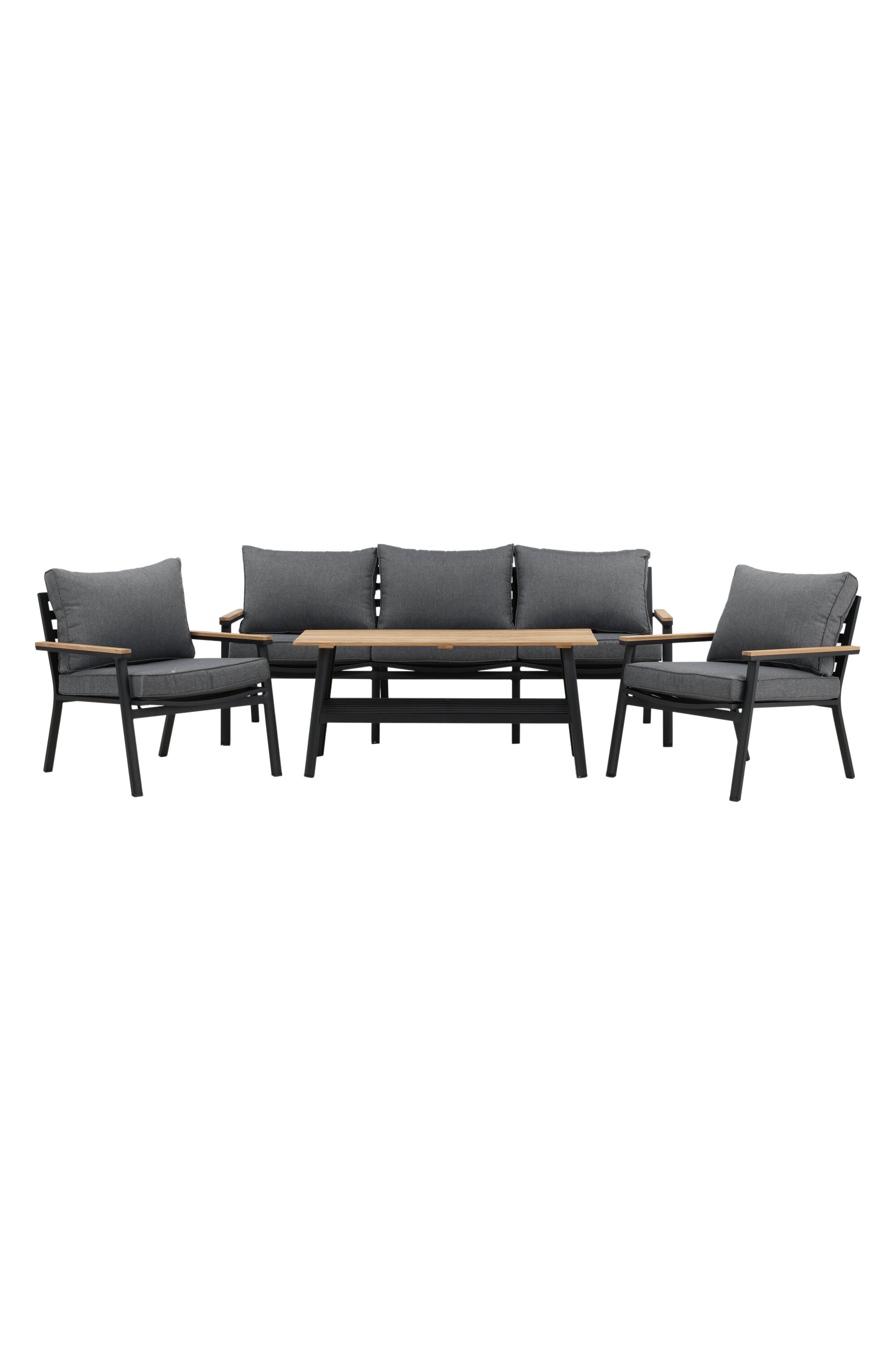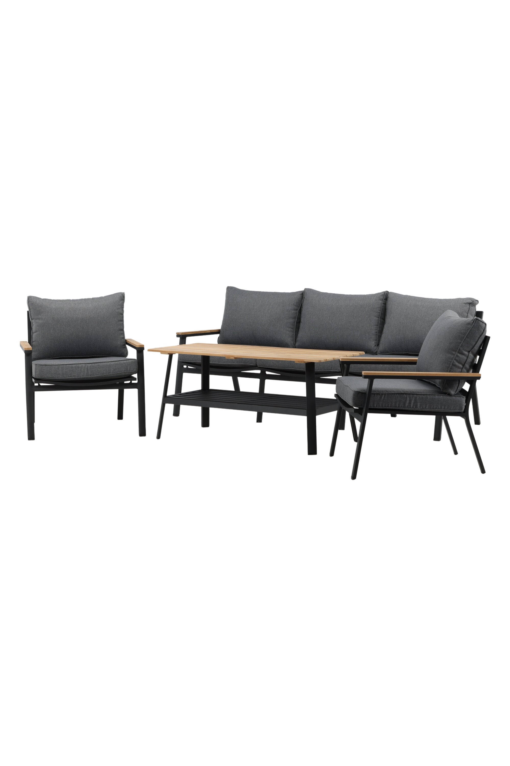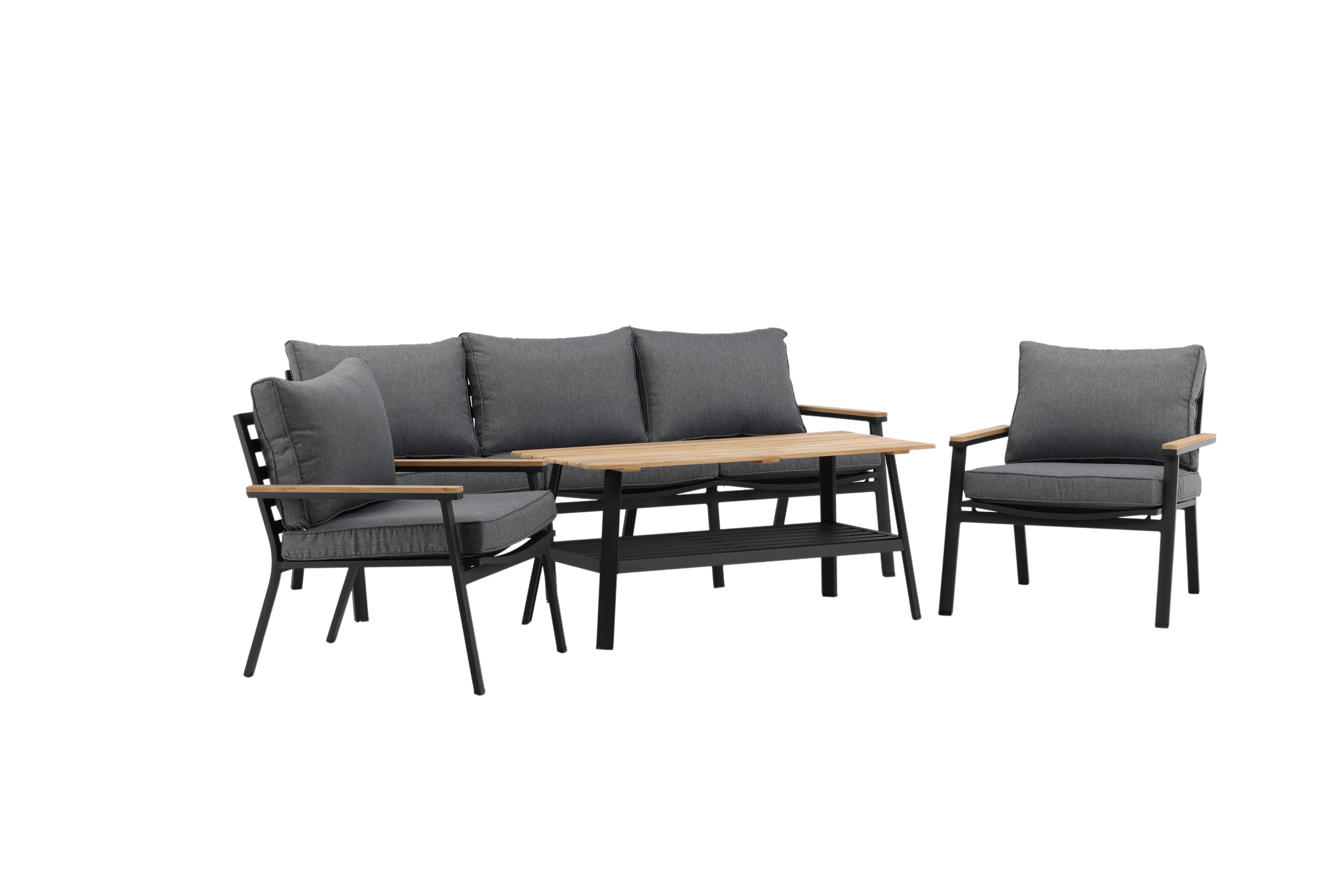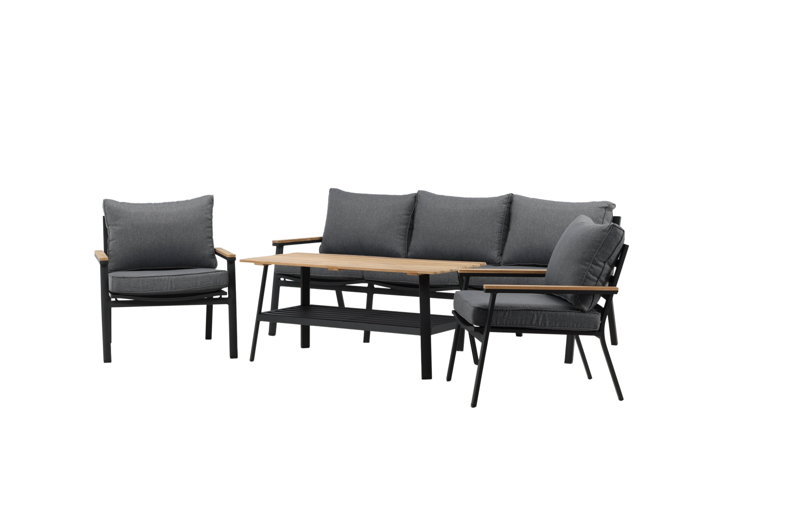 Moderní stylová sedací souprava s třímístnou pohovkou, 2 rámovými křesly a konferenčním stolkem včetně šedých polštářů. Pohovka a křesla mají rám z černého práškově lakovaného kovu s integrovanými područkami s teakovými detaily. Konferenční stolek má rám vyrobený z kovu s černou práškovou barvou s teakovou deskou. Je vyžadována lehčí montáž.
