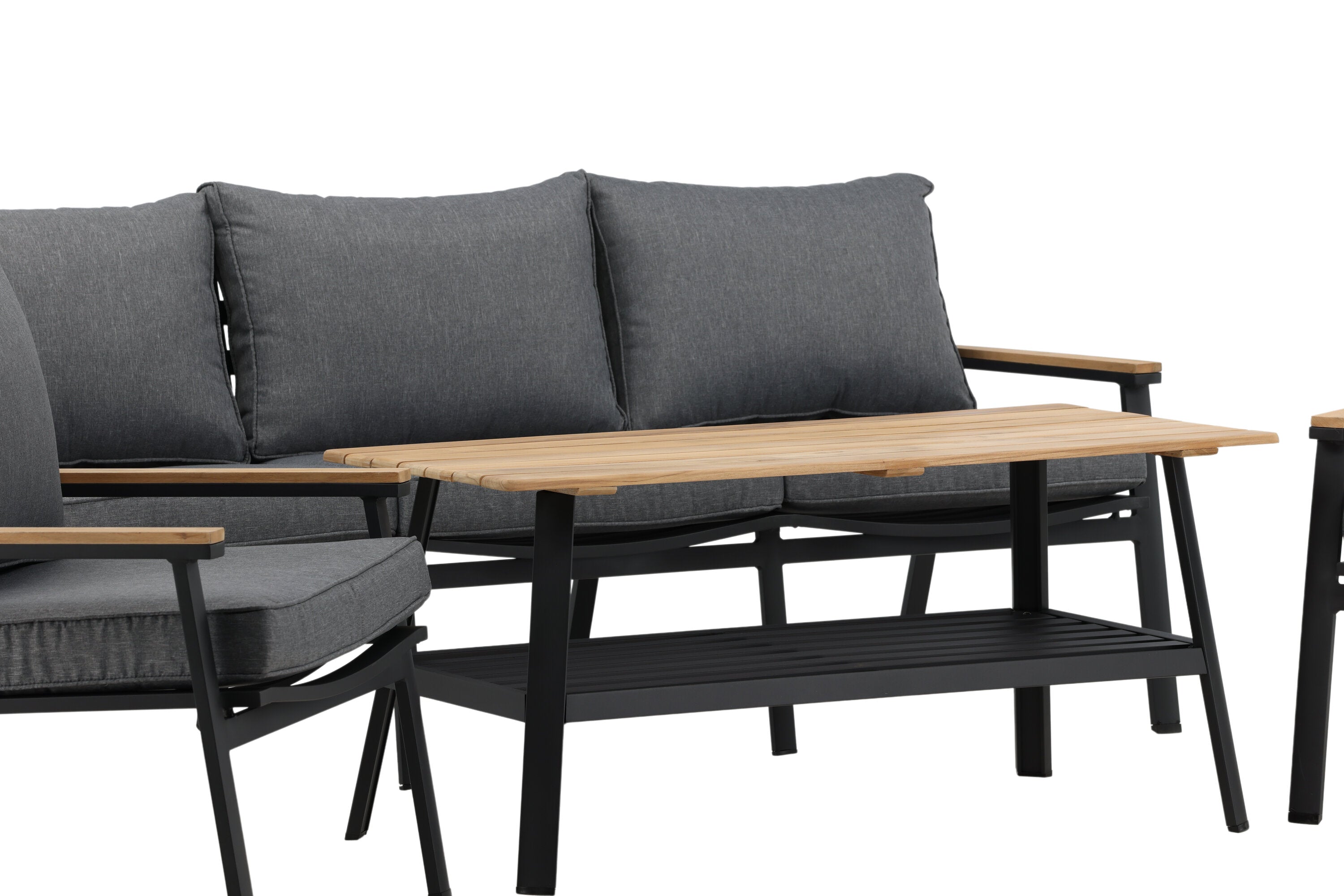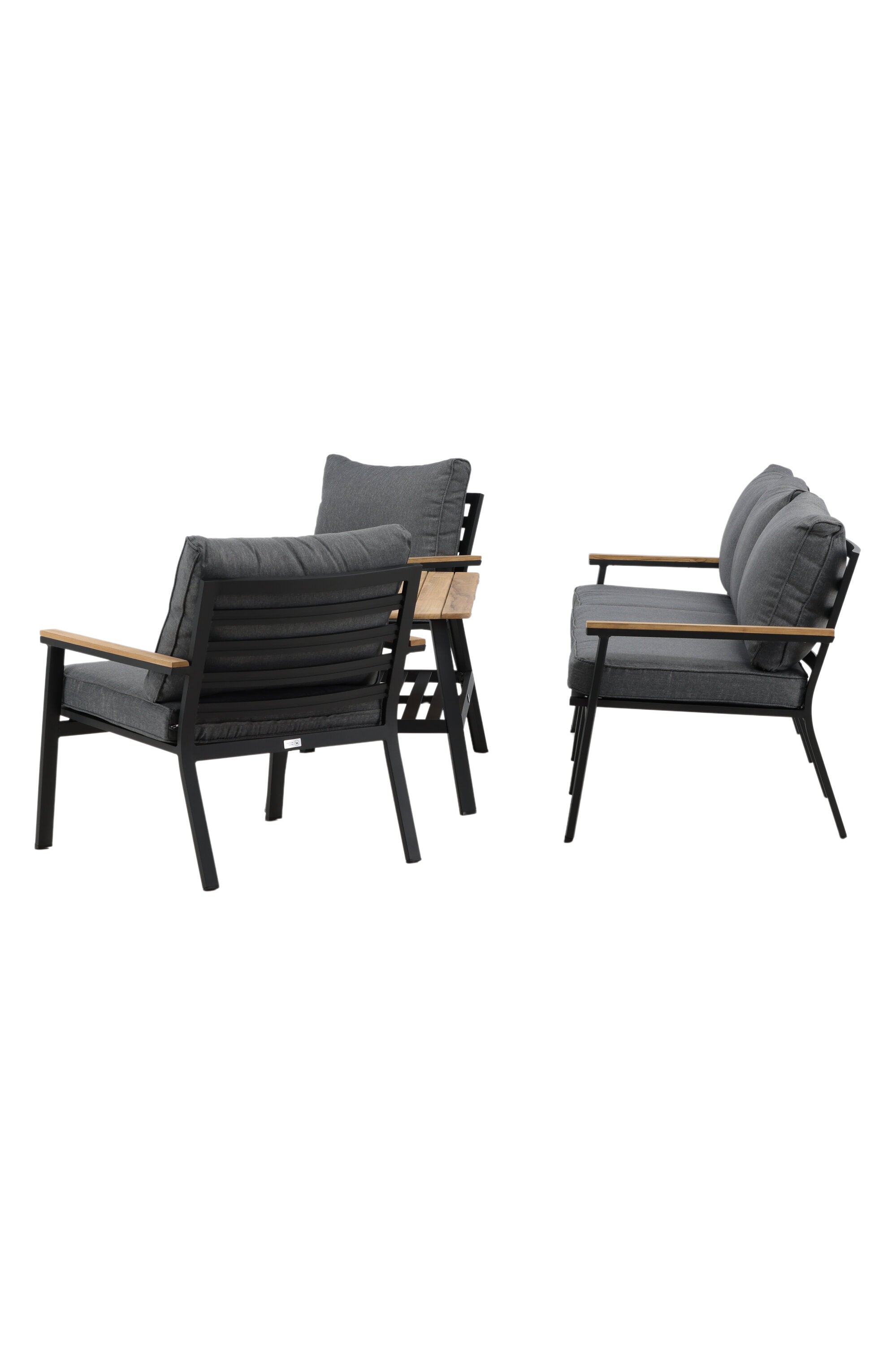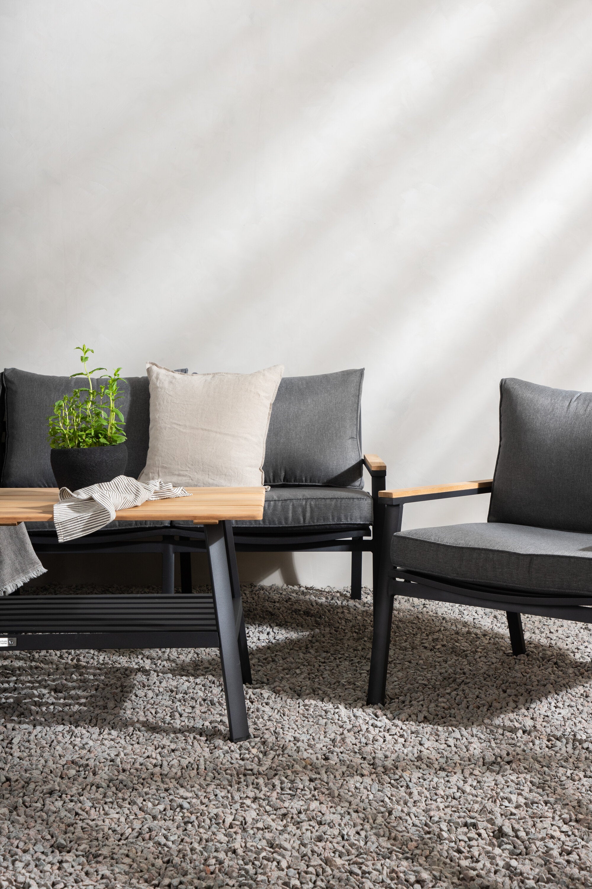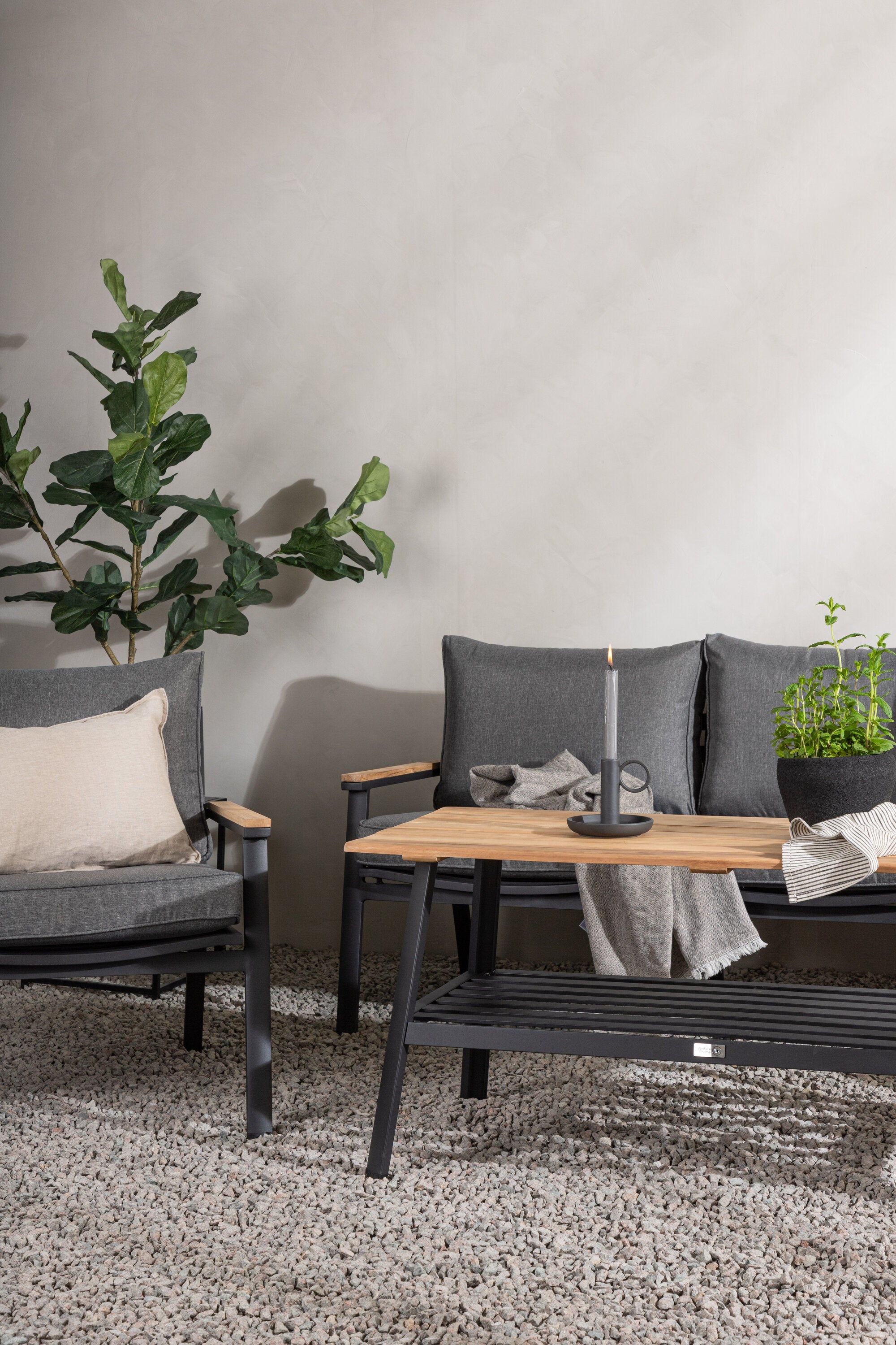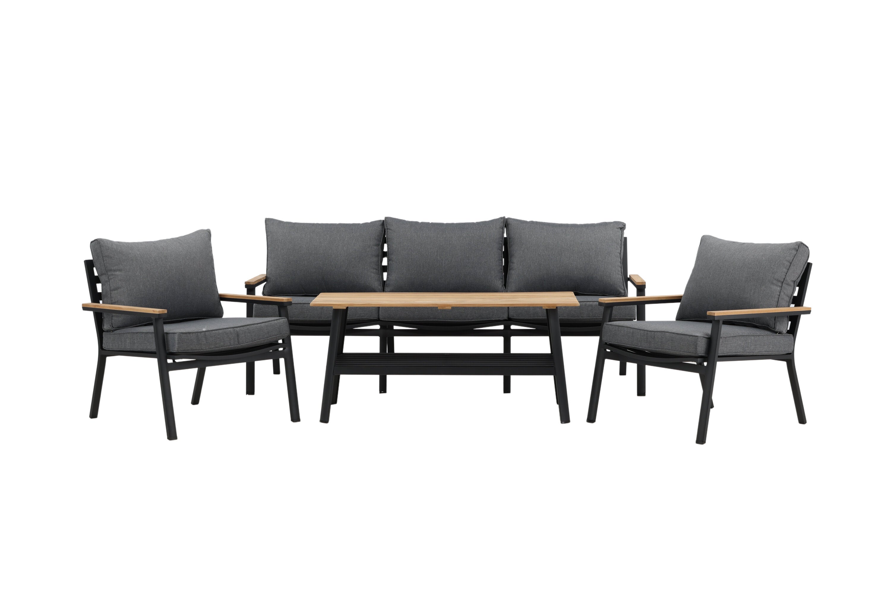 Moderní stylová sedací souprava s třímístnou pohovkou, 2 rámovými křesly a konferenčním stolkem včetně šedých polštářů. Pohovka a křesla mají rám z černého práškově lakovaného kovu s integrovanými područkami s teakovými detaily. Konferenční stolek má rám vyrobený z kovu s černou práškovou barvou s teakovou deskou. Je vyžadována lehčí montáž.