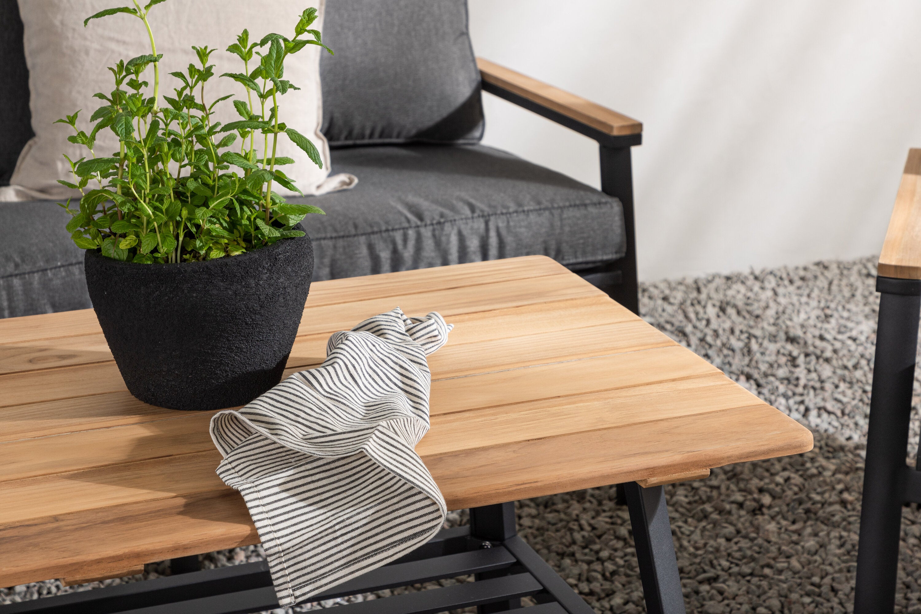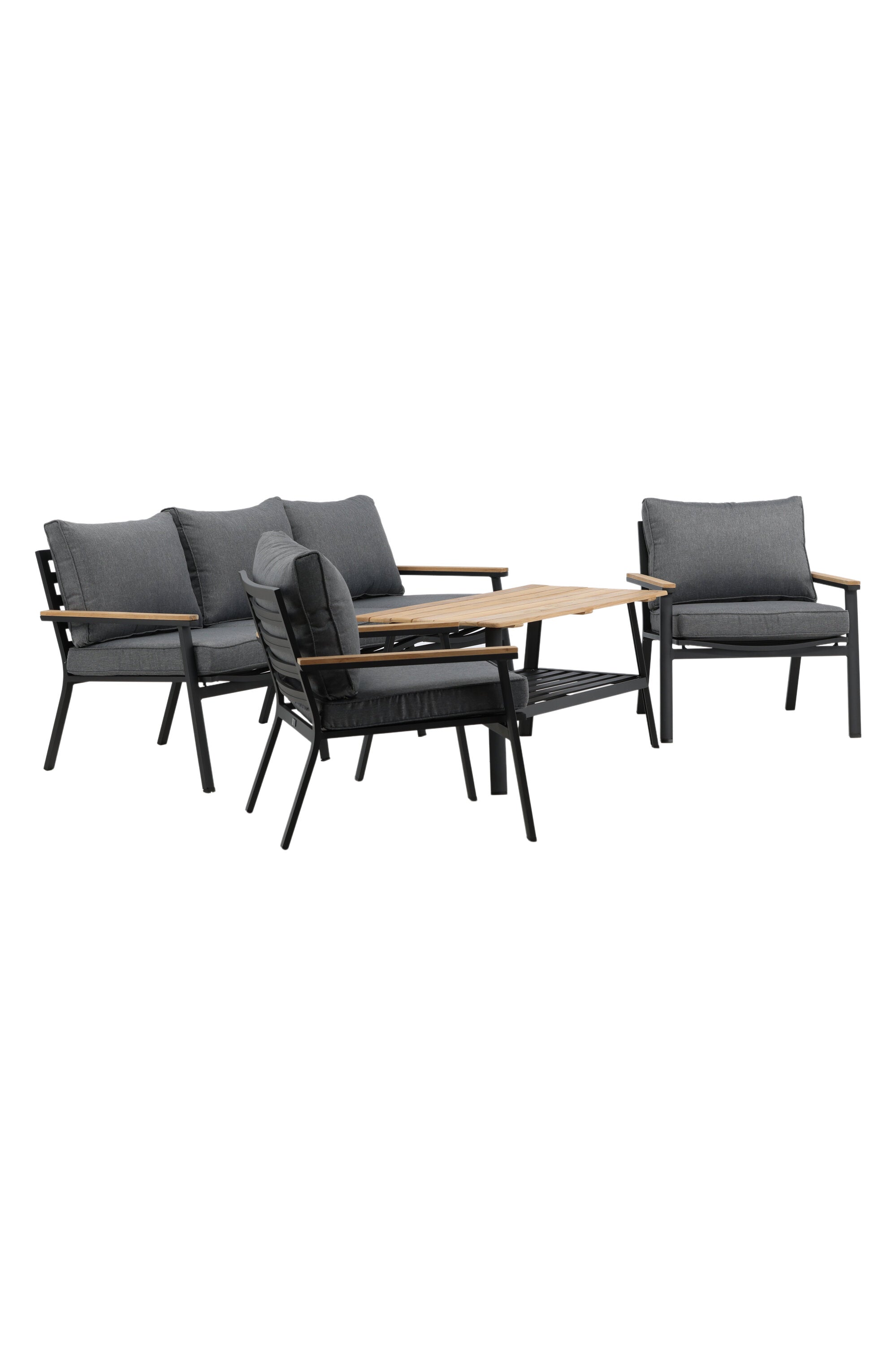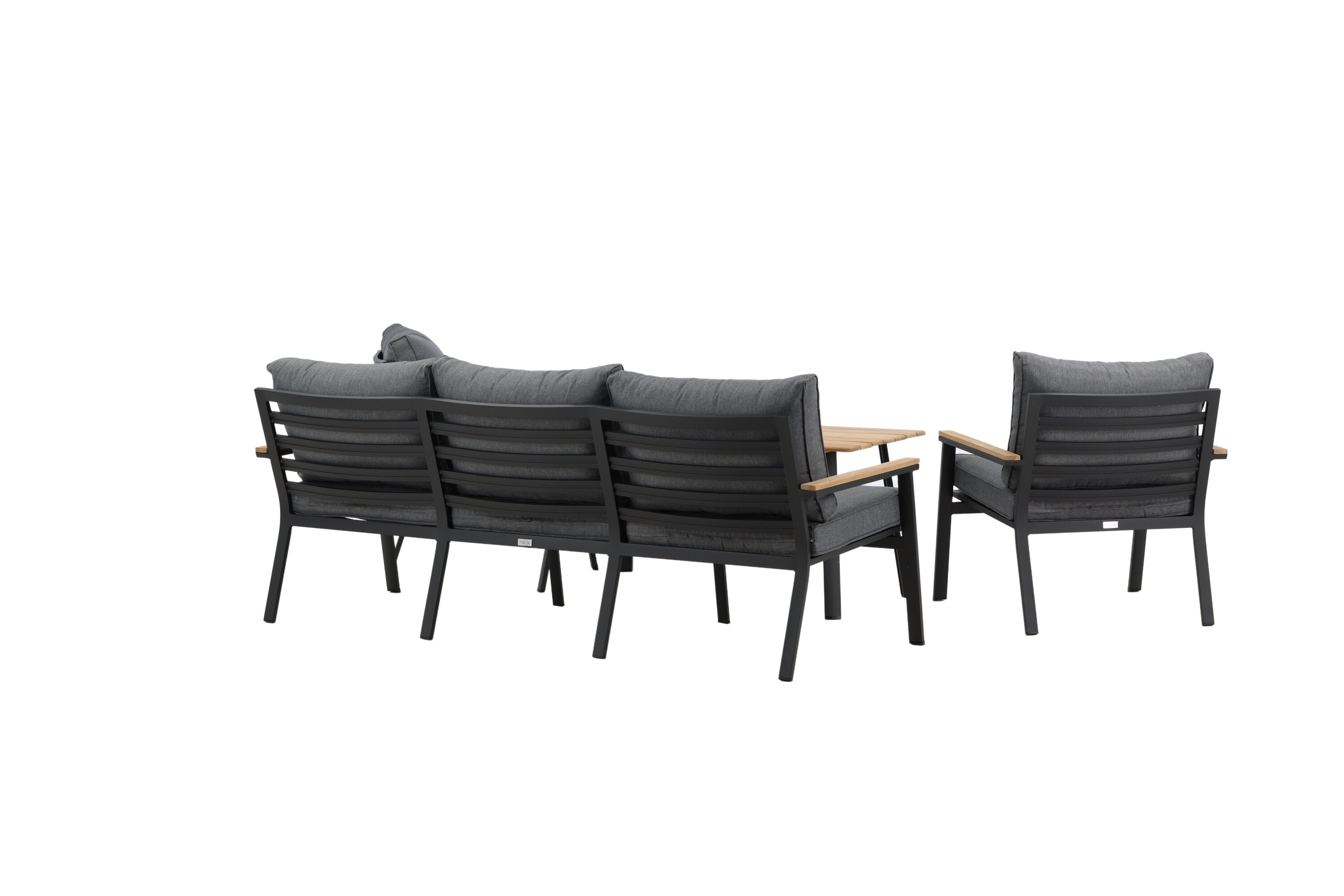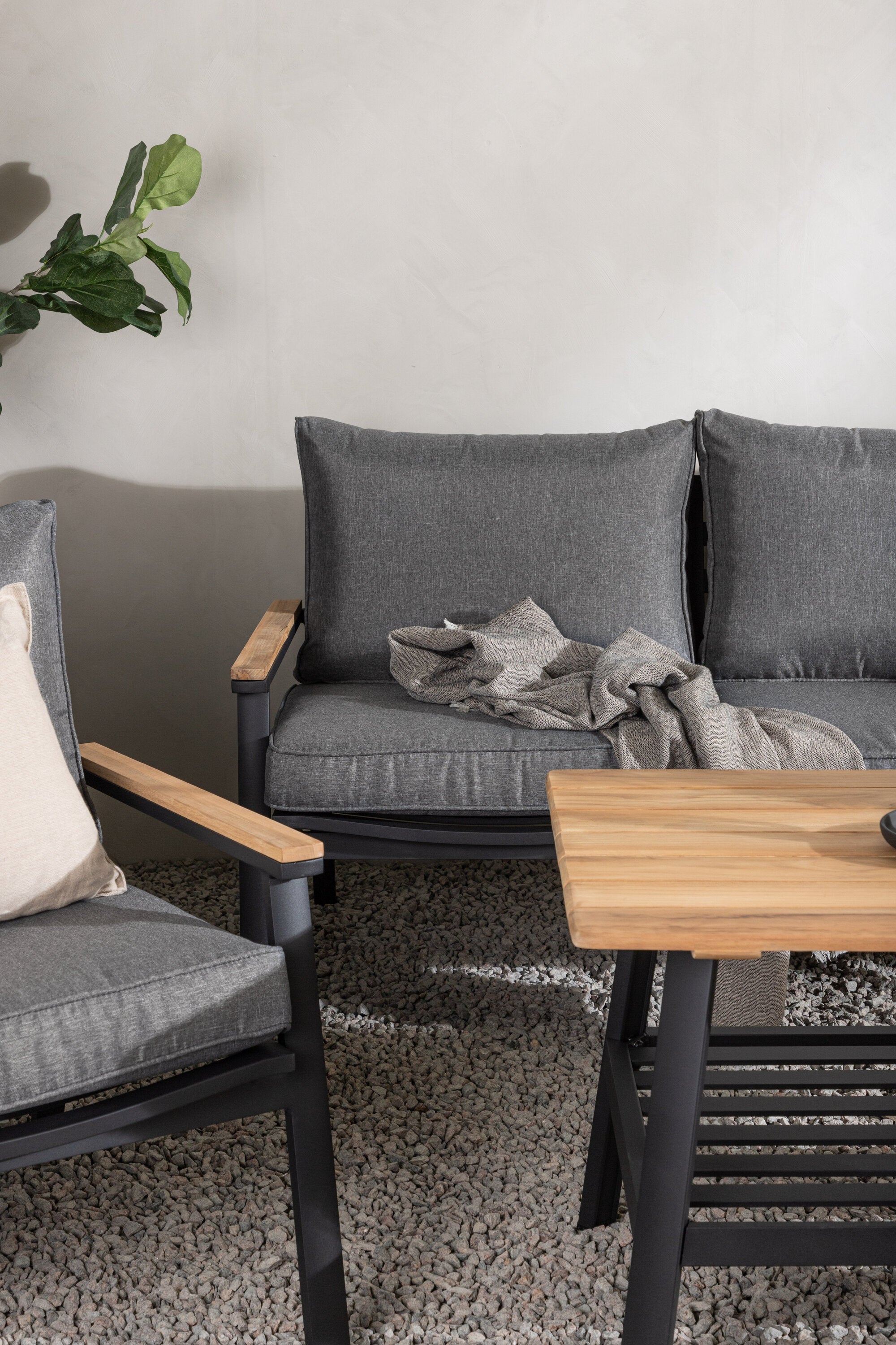 Moderní stylová sedací souprava s třímístnou pohovkou, 2 rámovými křesly a konferenčním stolkem včetně šedých polštářů. Pohovka a křesla mají rám z černého práškově lakovaného kovu s integrovanými područkami s teakovými detaily. Konferenční stolek má rám vyrobený z kovu s černou práškovou barvou s teakovou deskou. Je vyžadována lehčí montáž.