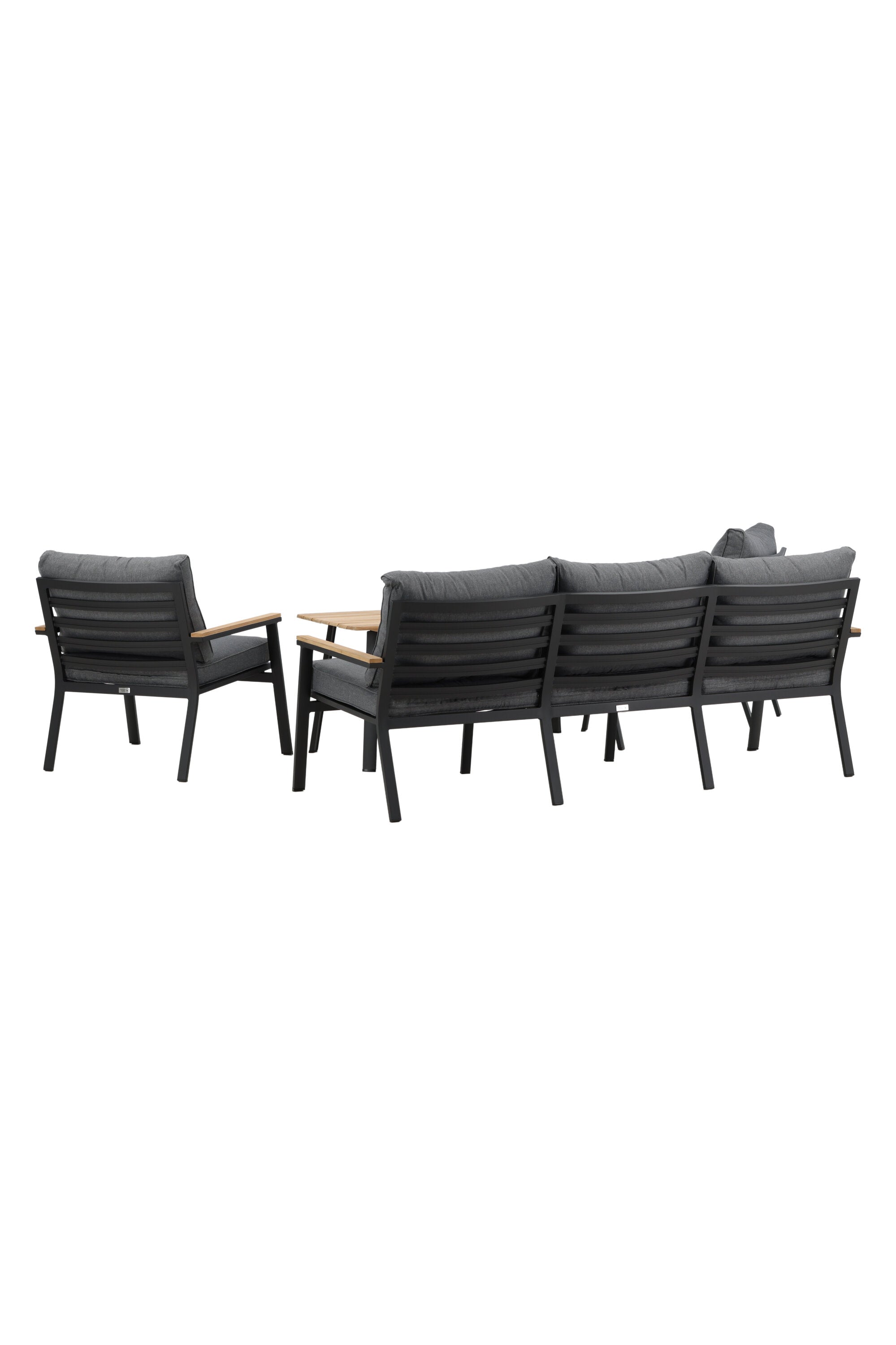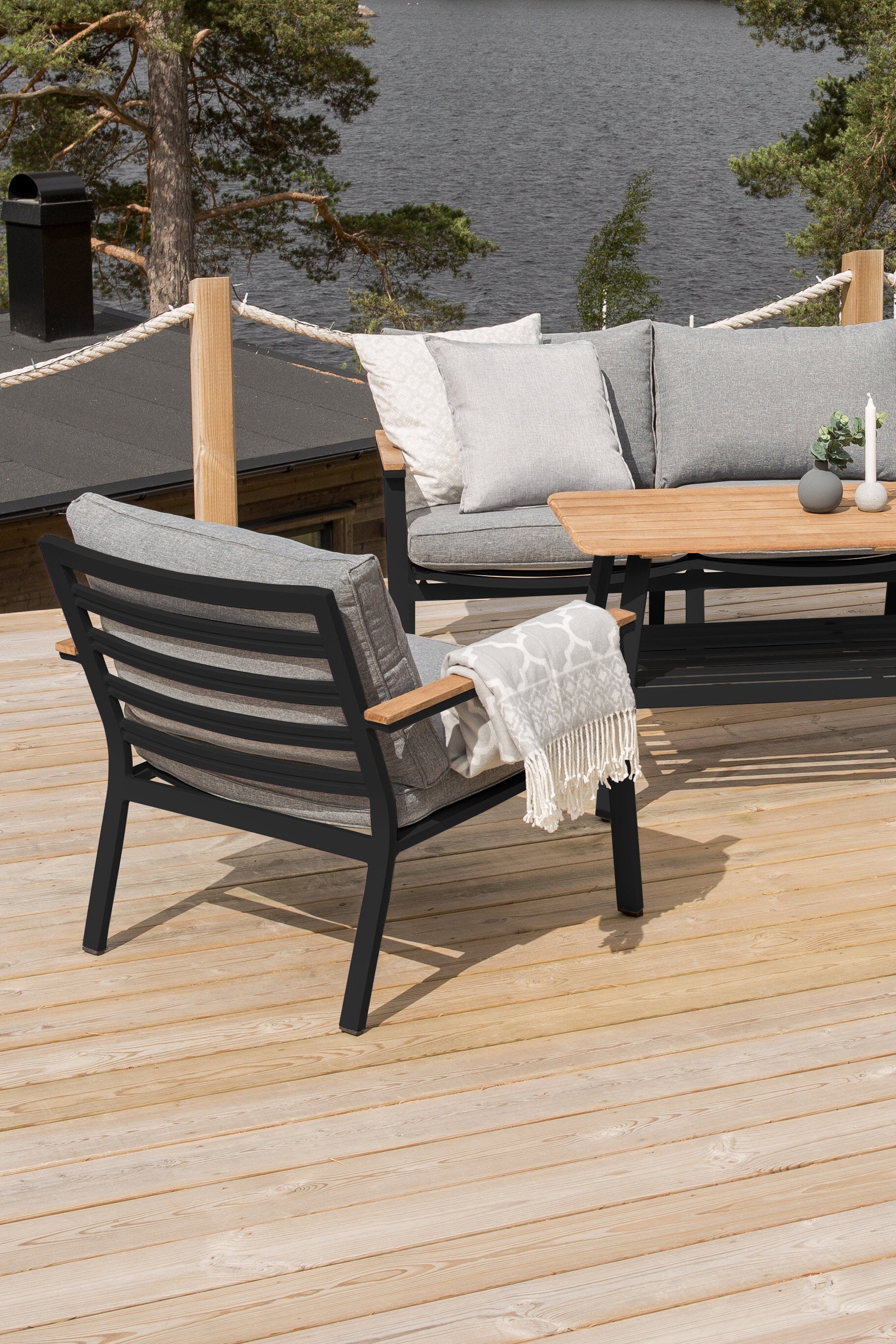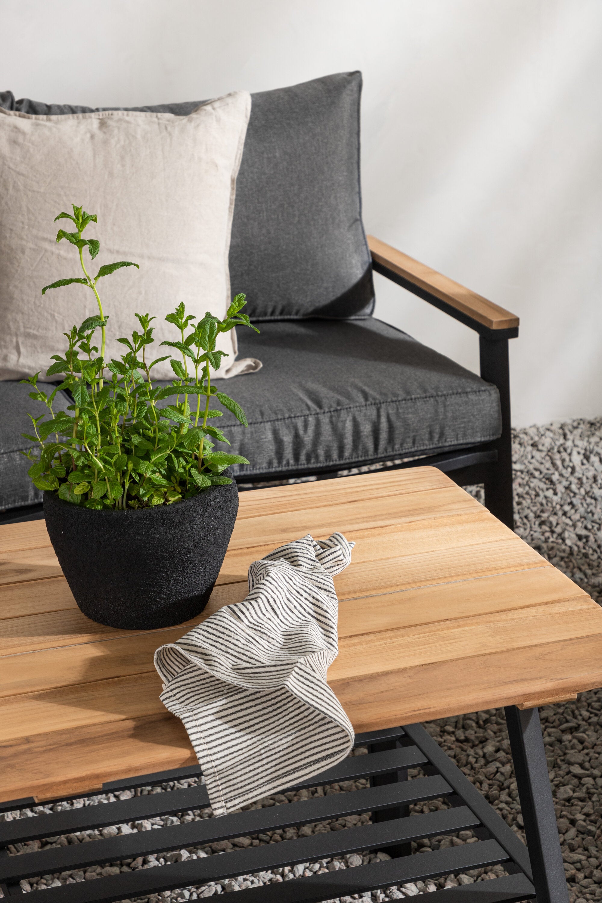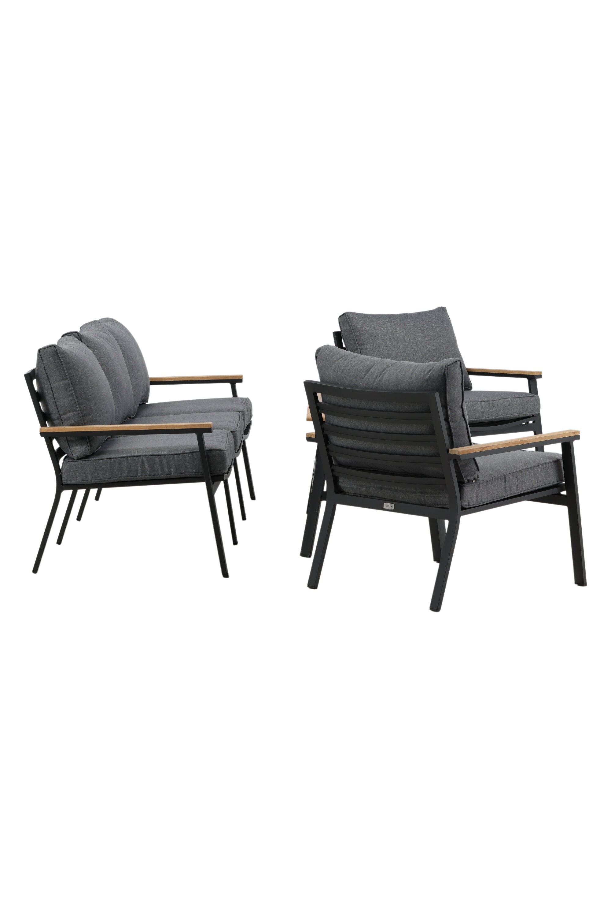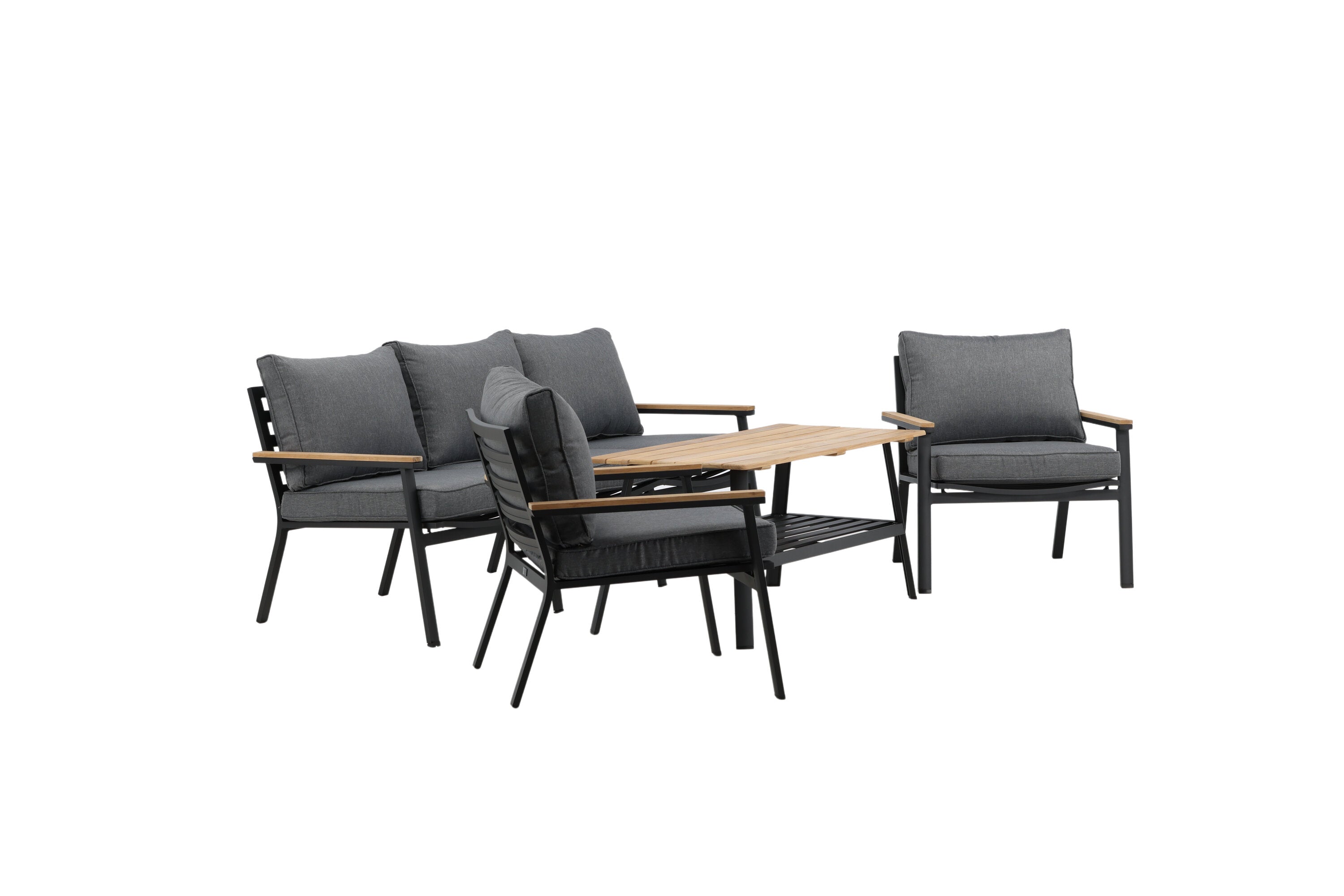 Moderní stylová sedací souprava s třímístnou pohovkou, 2 rámovými křesly a konferenčním stolkem včetně šedých polštářů. Pohovka a křesla mají rám z černého práškově lakovaného kovu s integrovanými područkami s teakovými detaily. Konferenční stolek má rám vyrobený z kovu s černou práškovou barvou s teakovou deskou. Je vyžadována lehčí montáž.