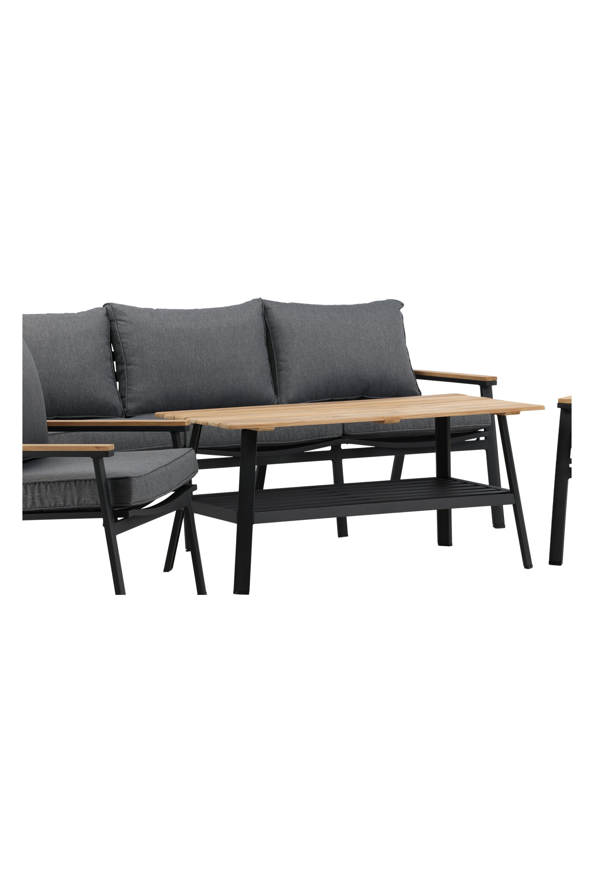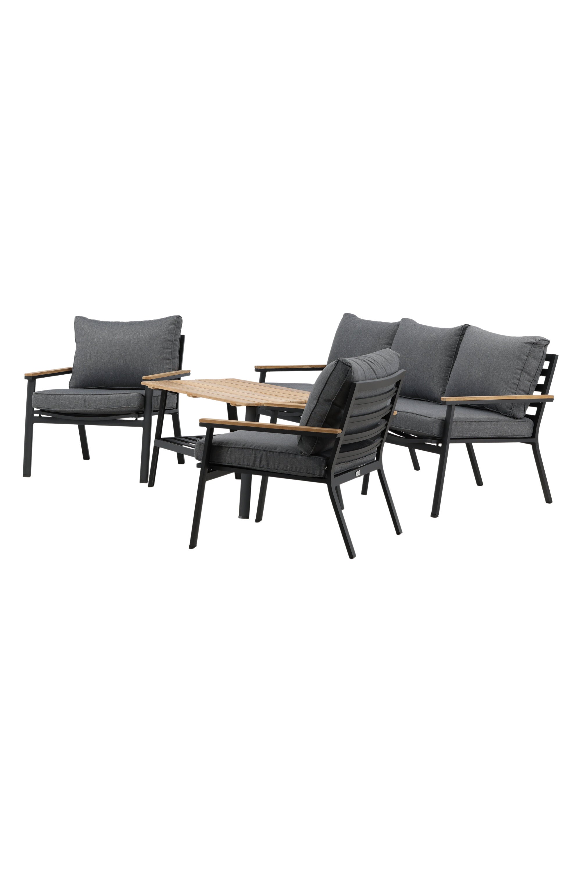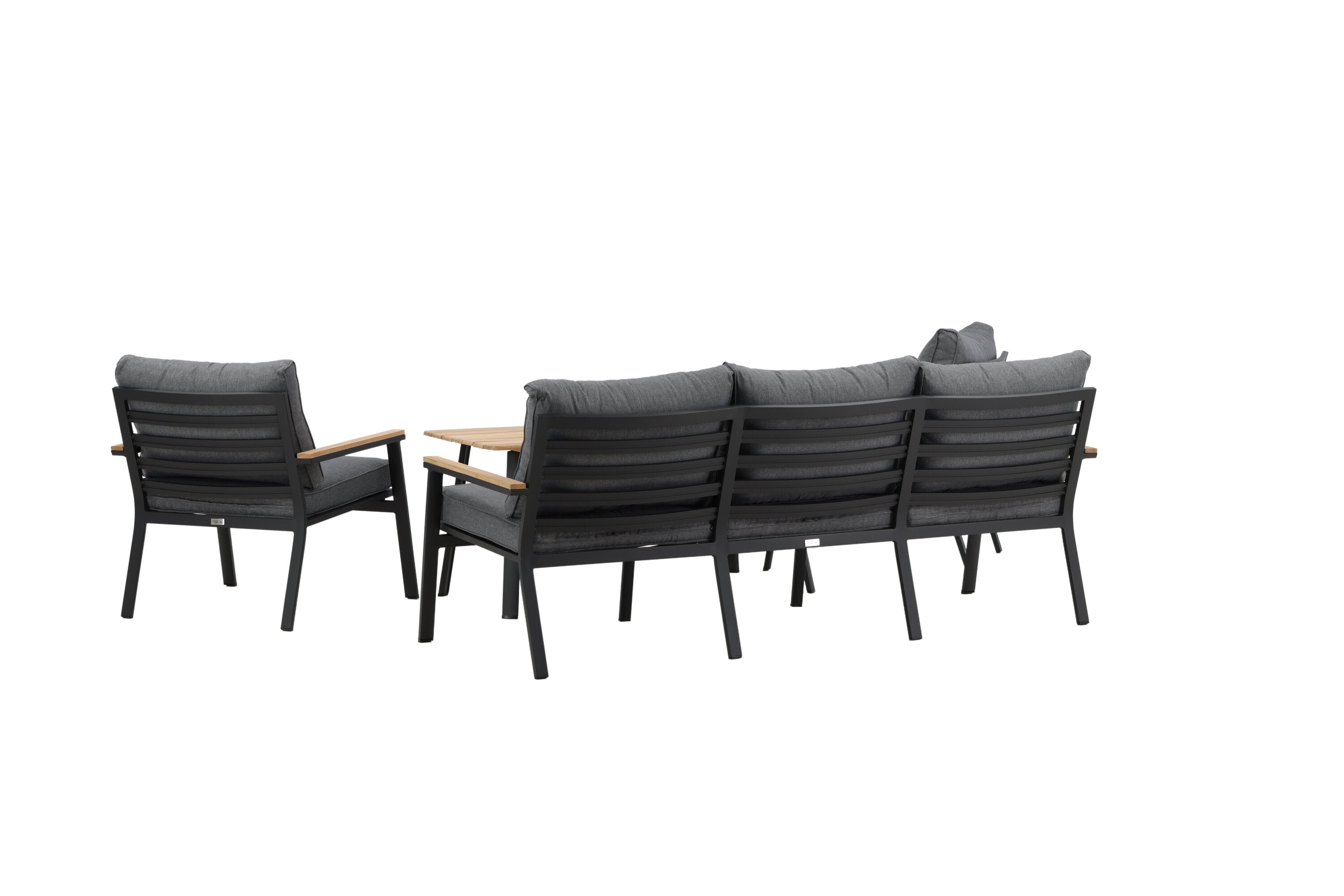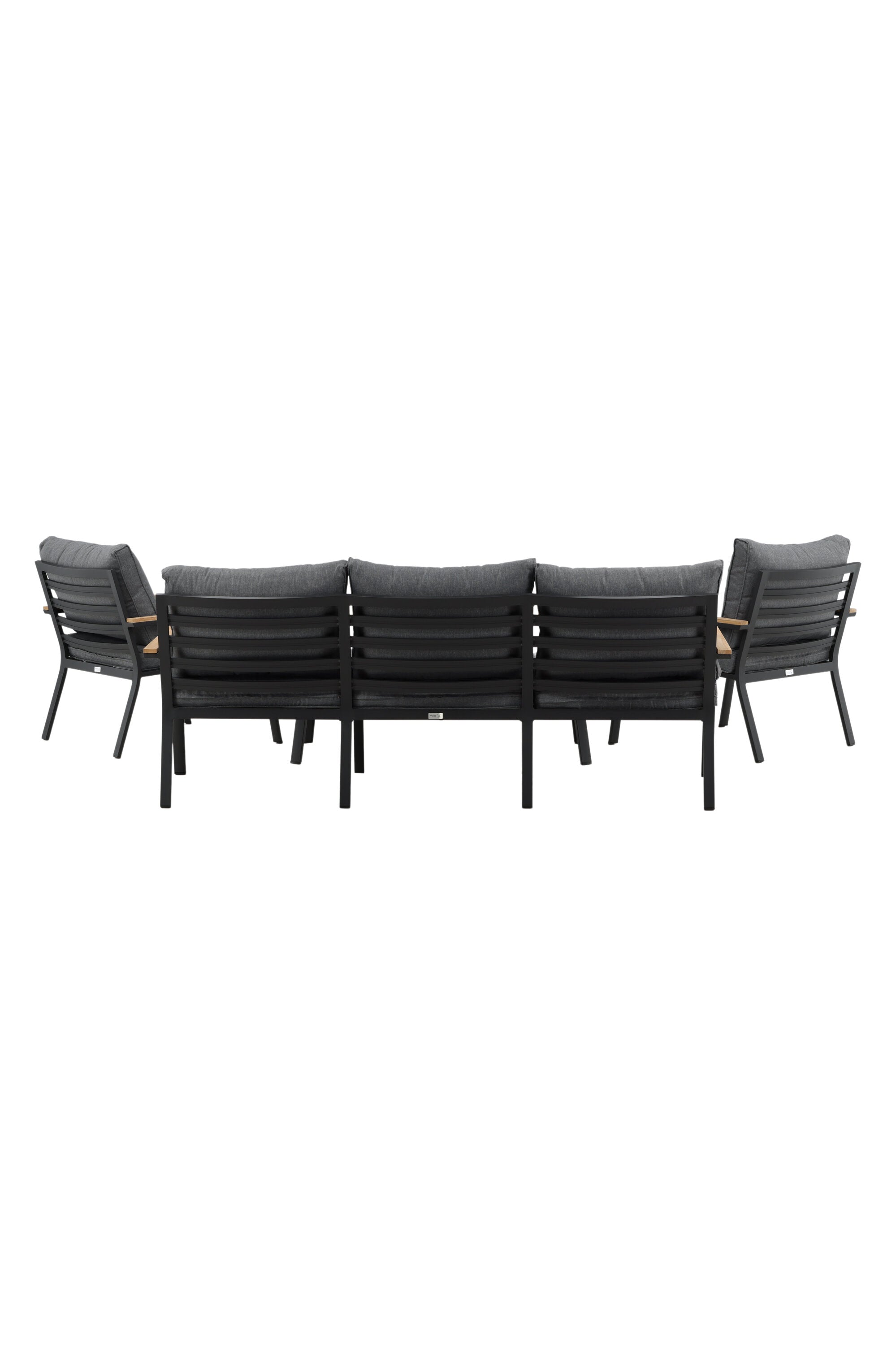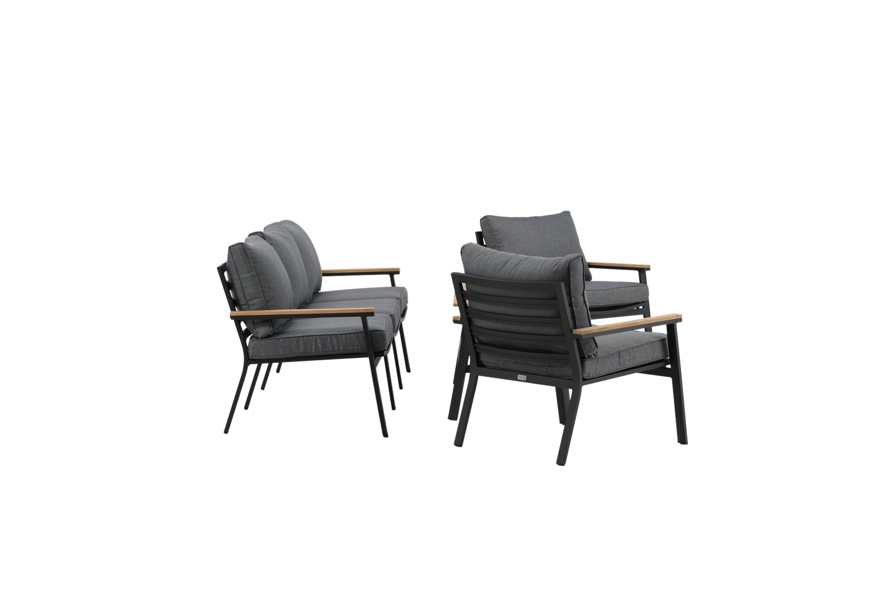 Moderní stylová sedací souprava s třímístnou pohovkou, 2 rámovými křesly a konferenčním stolkem včetně šedých polštářů. Pohovka a křesla mají rám z černého práškově lakovaného kovu s integrovanými područkami s teakovými detaily. Konferenční stolek má rám vyrobený z kovu s černou práškovou barvou s teakovou deskou. Je vyžadována lehčí montáž.