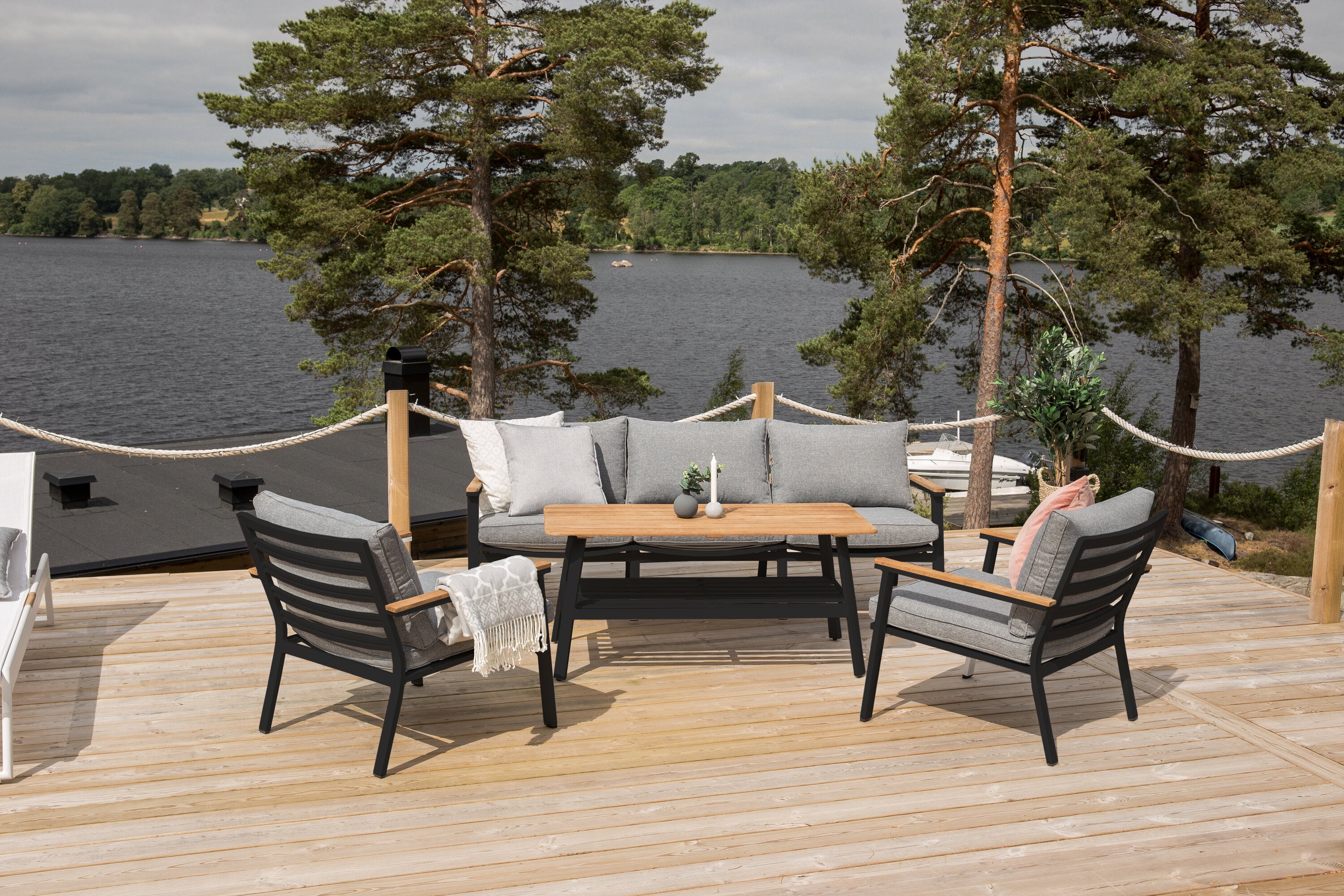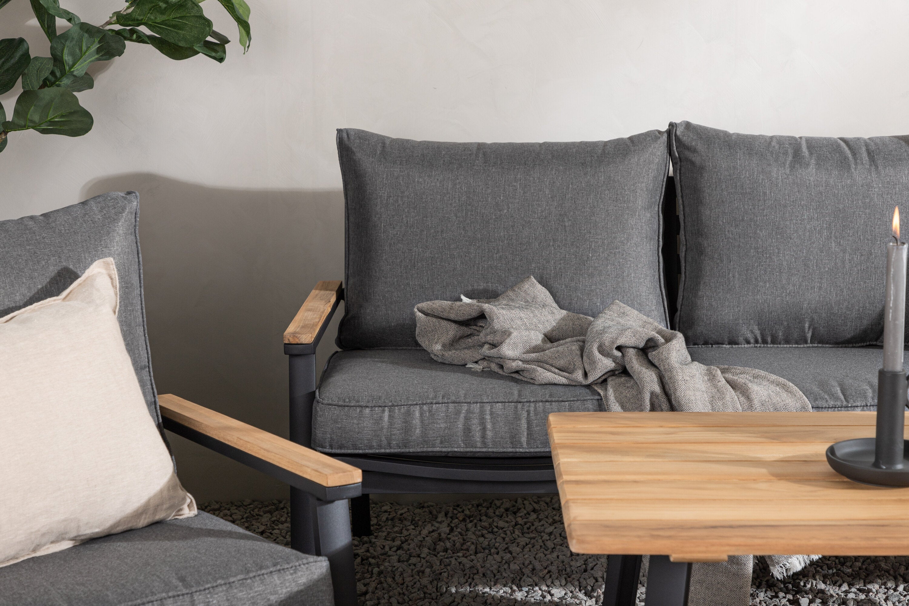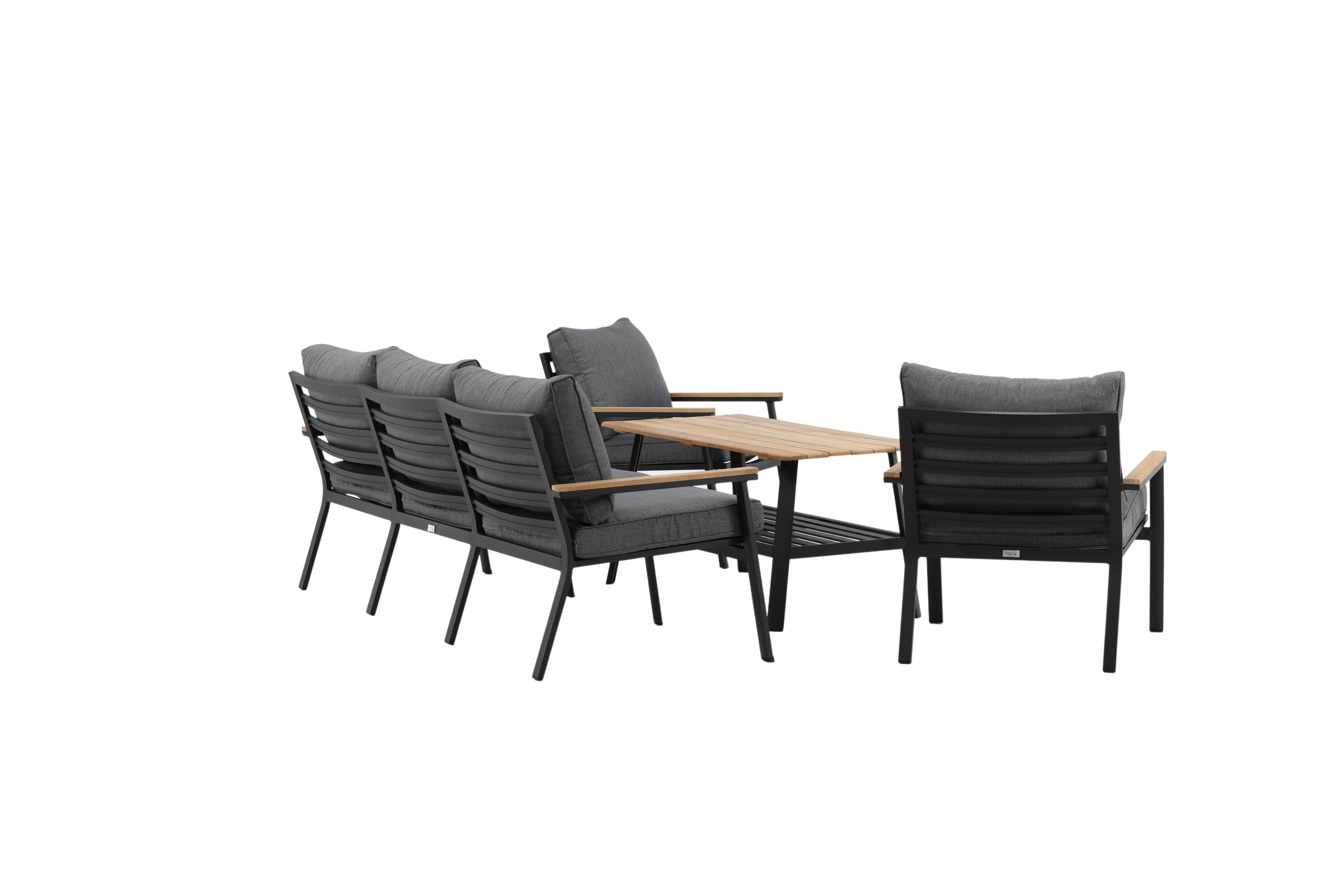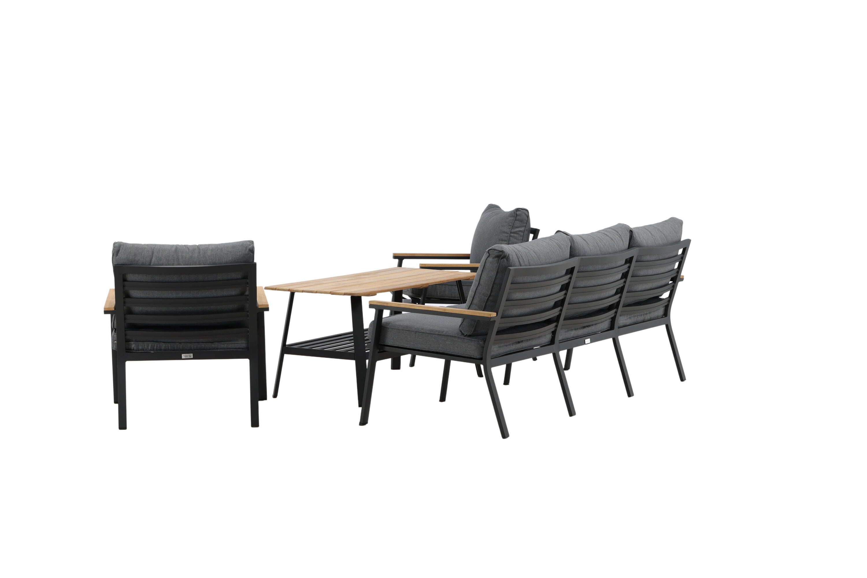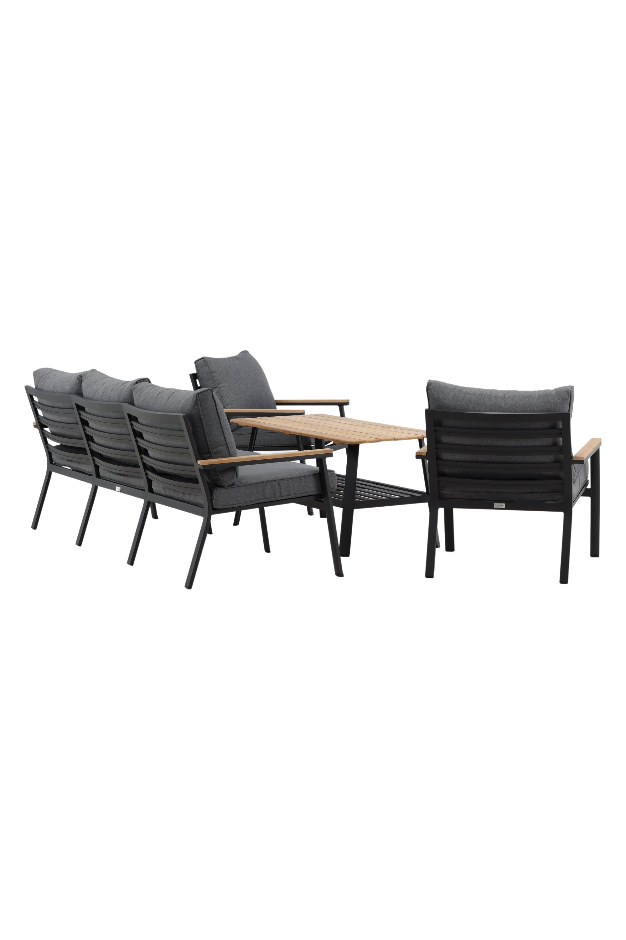 Moderní stylová sedací souprava s třímístnou pohovkou, 2 rámovými křesly a konferenčním stolkem včetně šedých polštářů. Pohovka a křesla mají rám z černého práškově lakovaného kovu s integrovanými područkami s teakovými detaily. Konferenční stolek má rám vyrobený z kovu s černou práškovou barvou s teakovou deskou. Je vyžadována lehčí montáž.