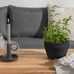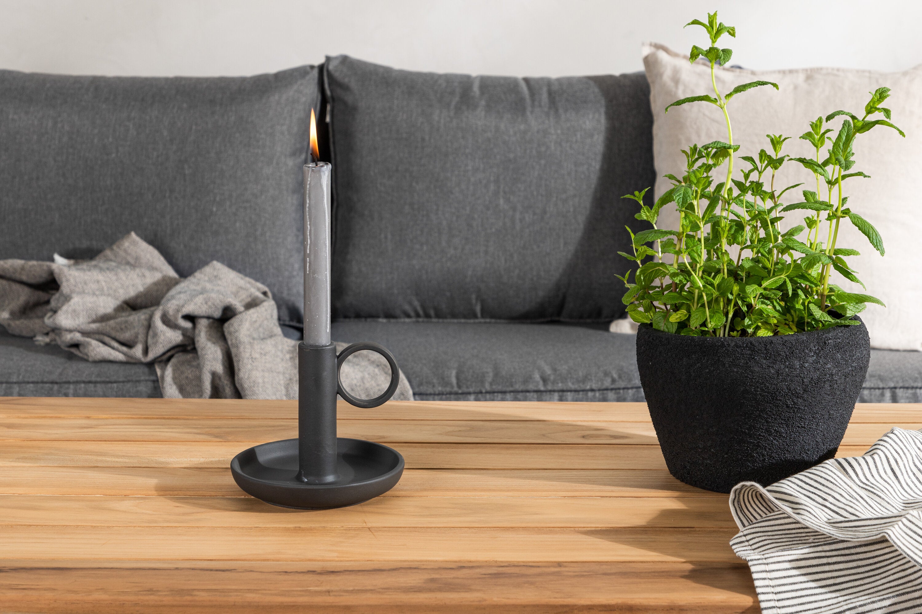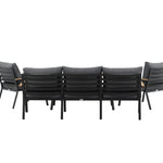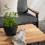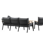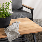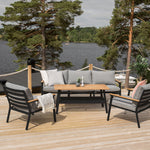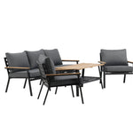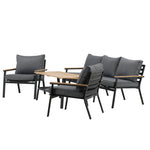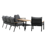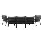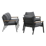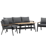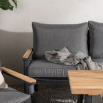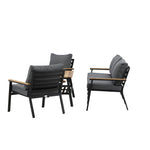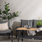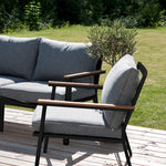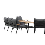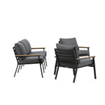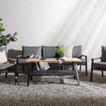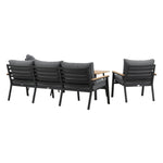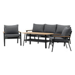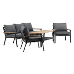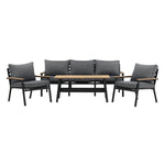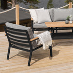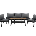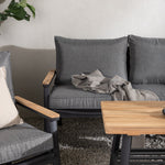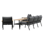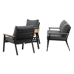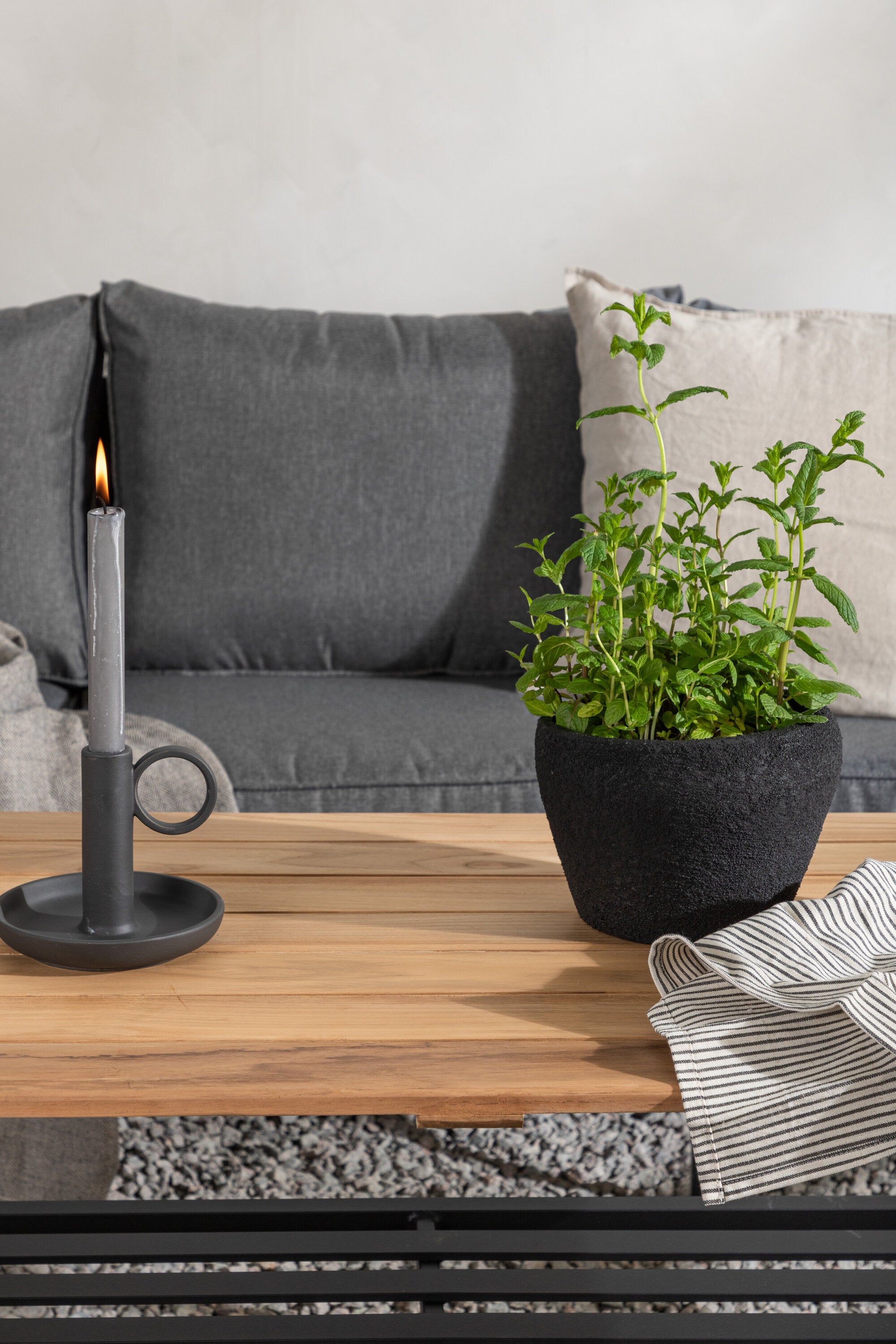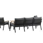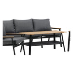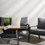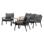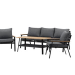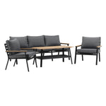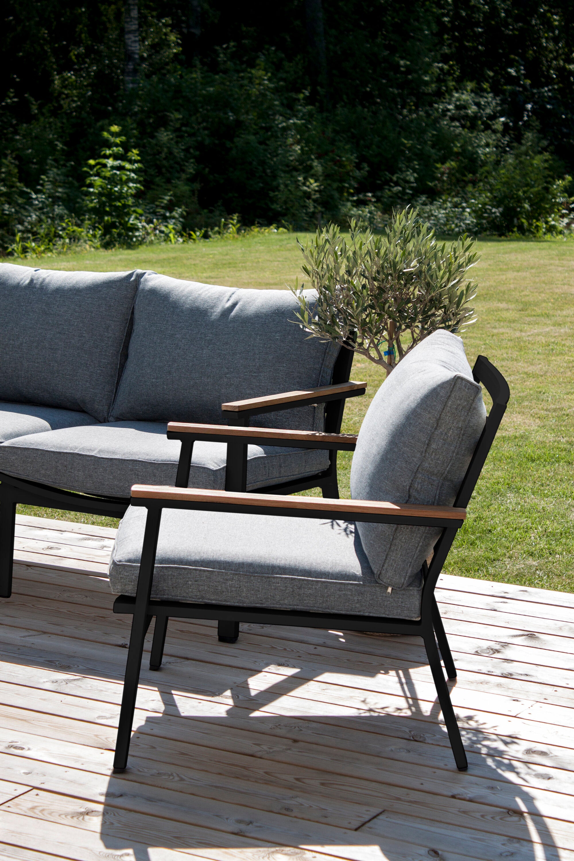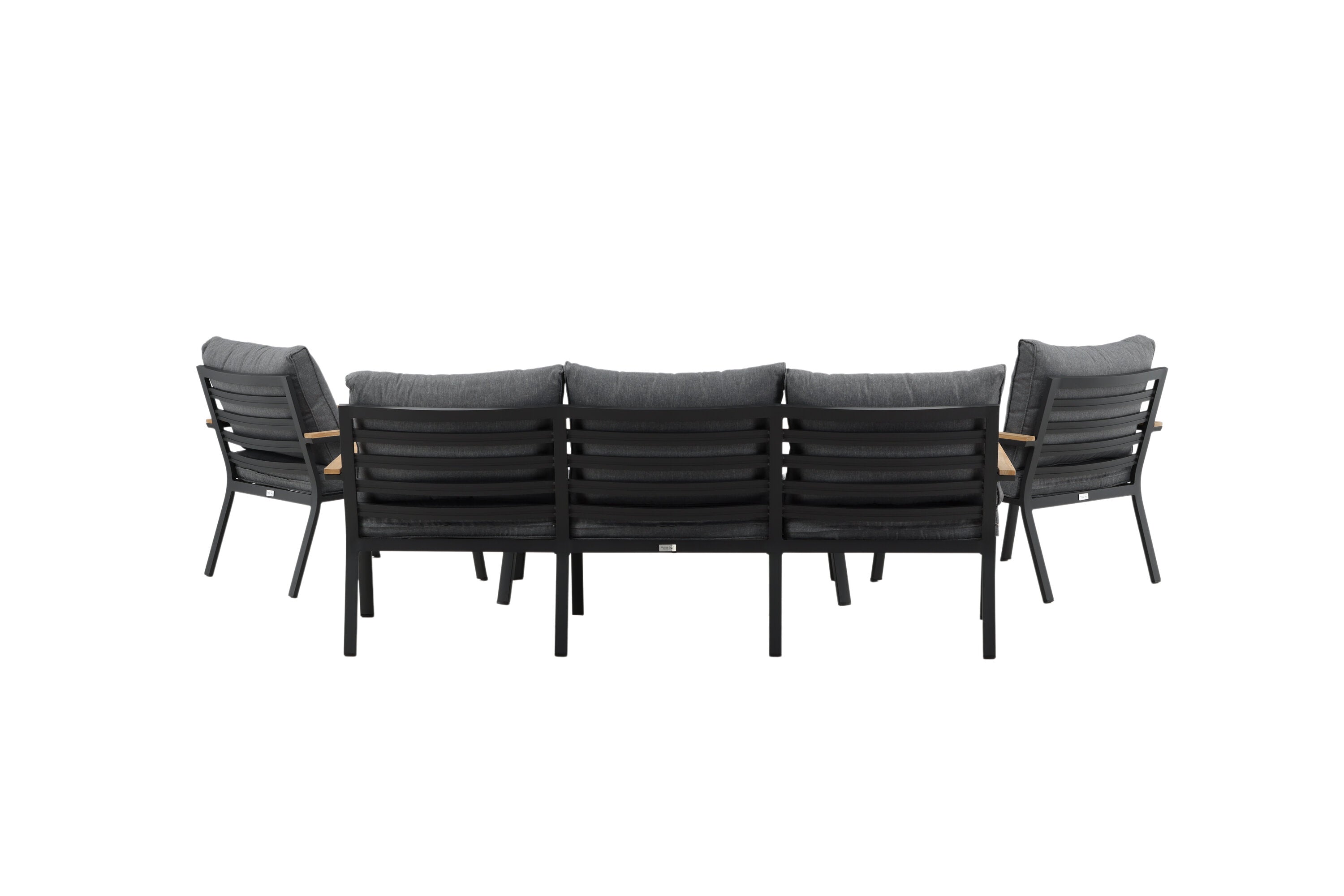 Moderní stylová sedací souprava s třímístnou pohovkou, 2 rámovými křesly a konferenčním stolkem včetně šedých polštářů. Pohovka a křesla mají rám z černého práškově lakovaného kovu s integrovanými područkami s teakovými detaily. Konferenční stolek má rám vyrobený z kovu s černou práškovou barvou s teakovou deskou. Je vyžadována lehčí montáž.